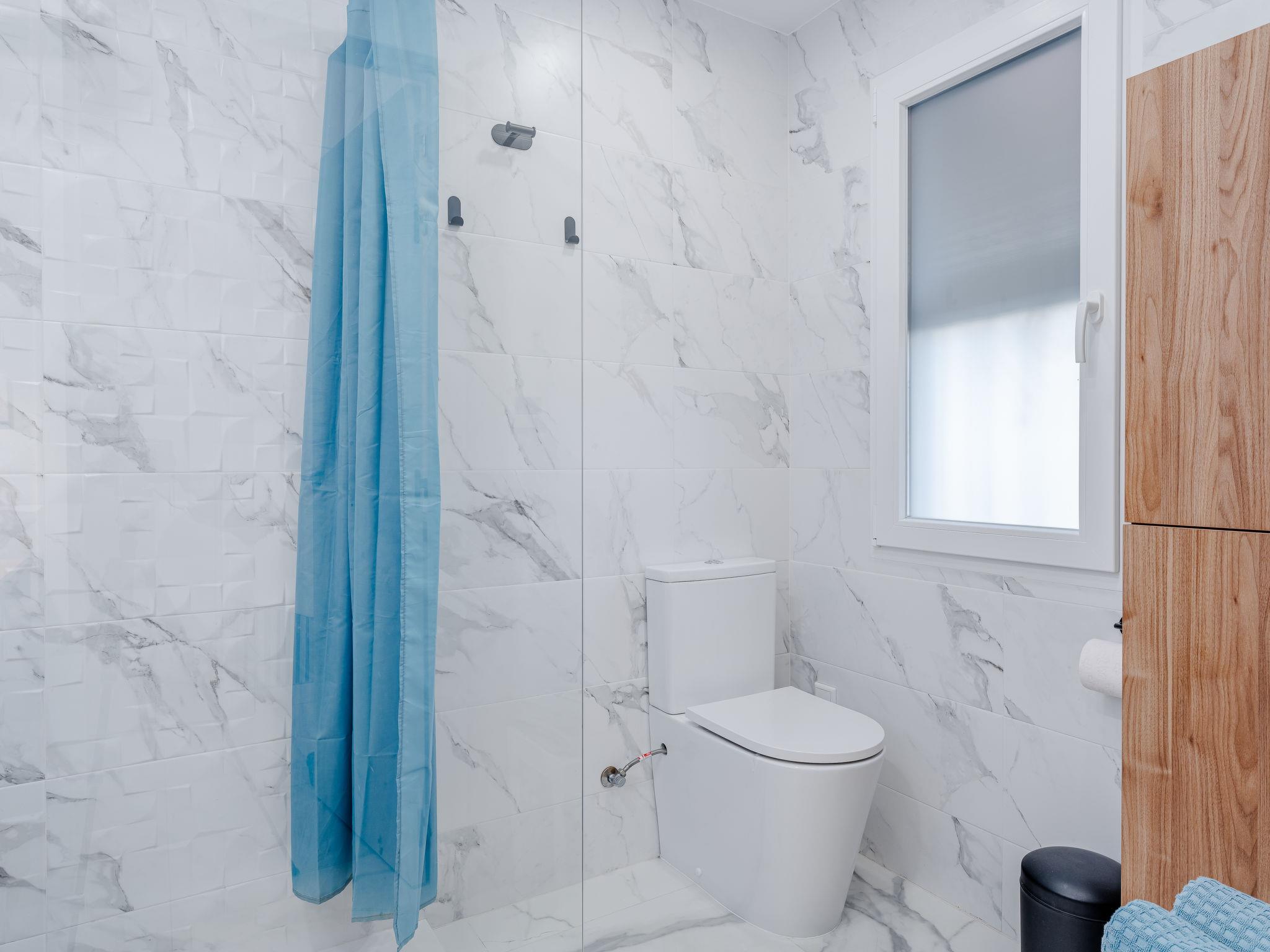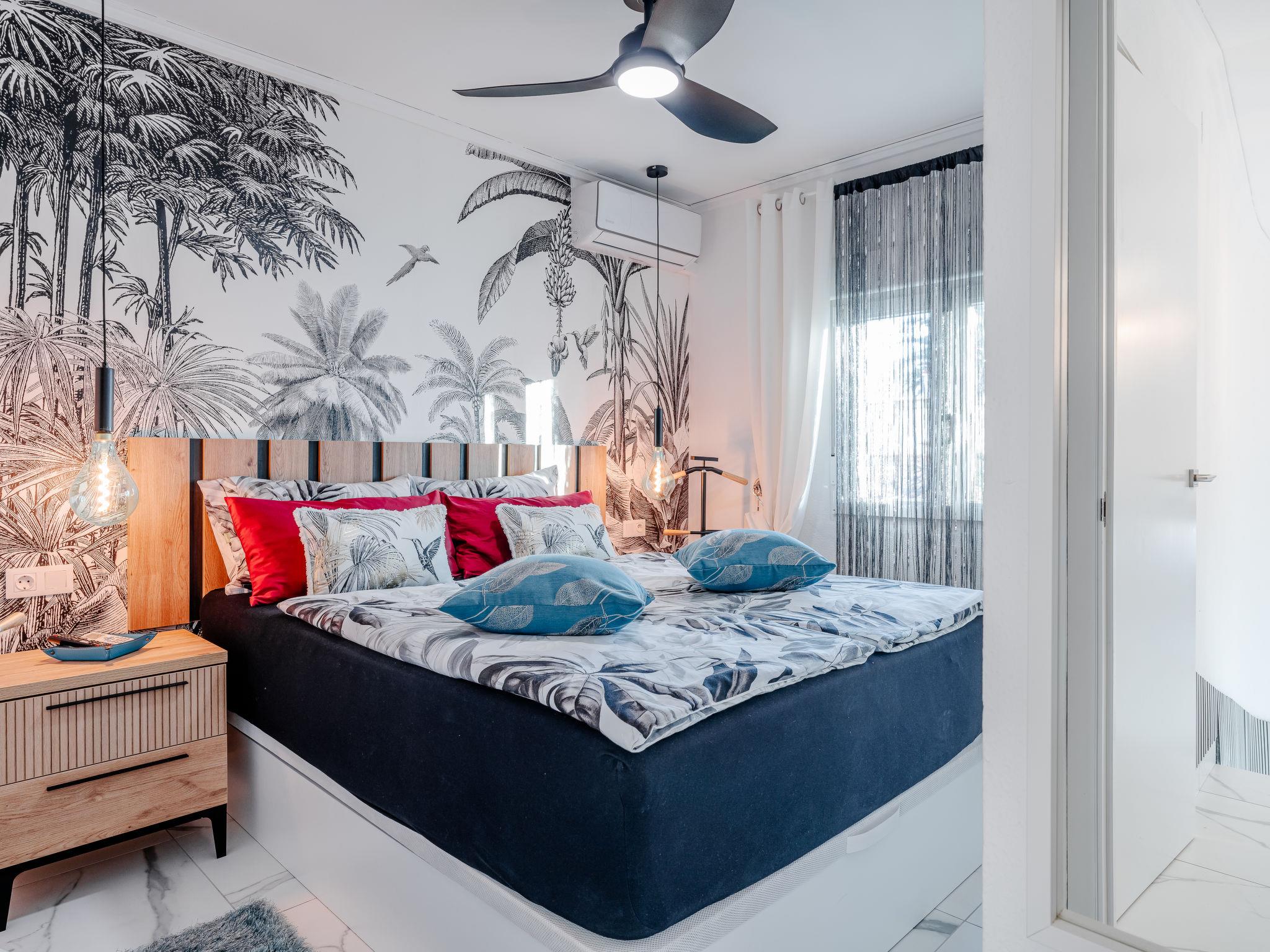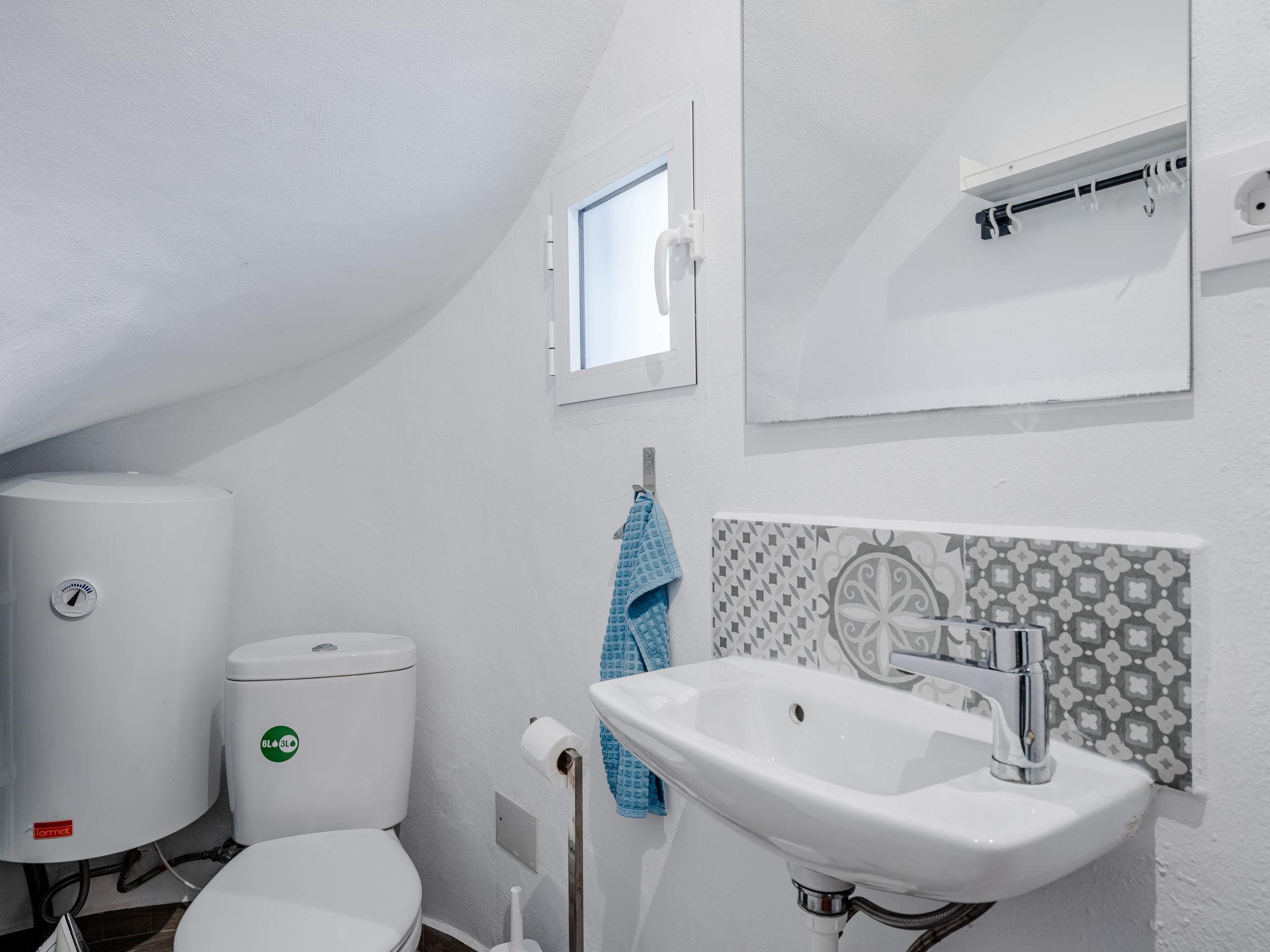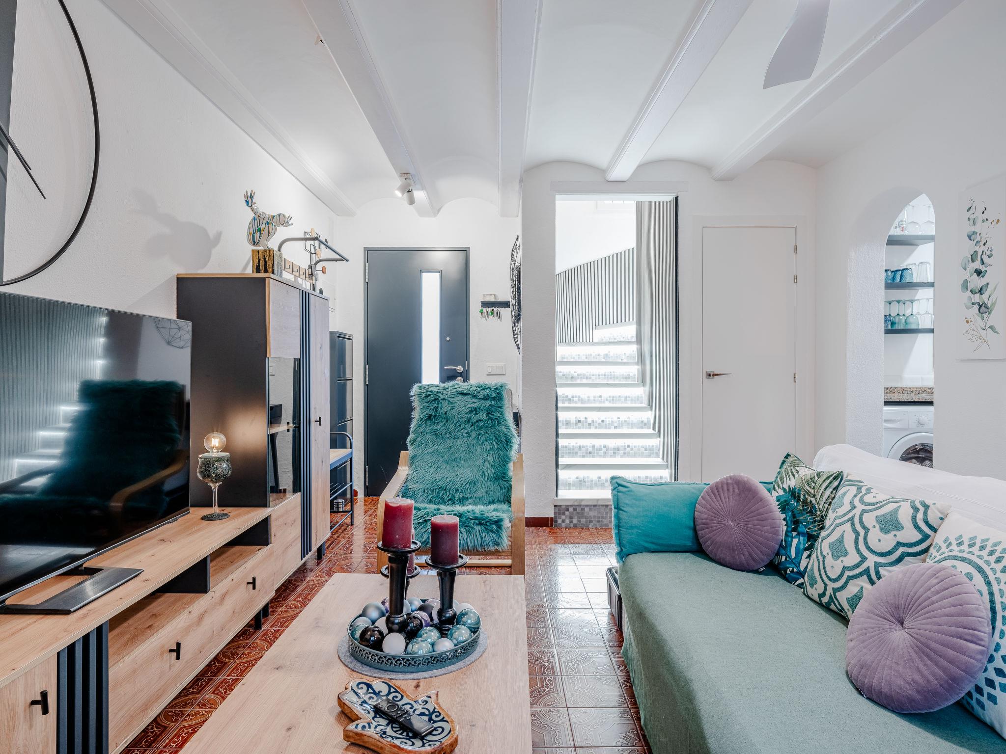 "Residencia La Perla", 4-room terraced house 80 m2 on 2 levels. Object suitable for 4 adults + 2 children. Spacious and bright, very beautiful and stylish furnishings: living/dining room with satellite TV, air conditioning, fan and forced-air heating. Exit to the terrace. Open kitchen (oven, 4 ceramic glass hob hotplates, toaster, kettle, microwave, freezer, electric coffee machine). Sep. WC. Upper floor: 1 room with 1 french bed (150 cm, length 200 cm), satellite TV, air conditioning, fan and forced-air heating. 1 room with 1 double bed (2 x 90 cm, length 190 cm), air conditioning, fan and forced-air heating. 1 room with 1 x 2 bunk beds (80 cm, length 190 cm), fan. Shower/WC. 2 large terraces. Terrace furniture, sitting area. Facilities: washing machine, iron, hair dryer. Internet (WiFi, free). VT-501040-A // Reg. Nr.: ESFCTU00000304500031048000000000000000000VT-501040-A1