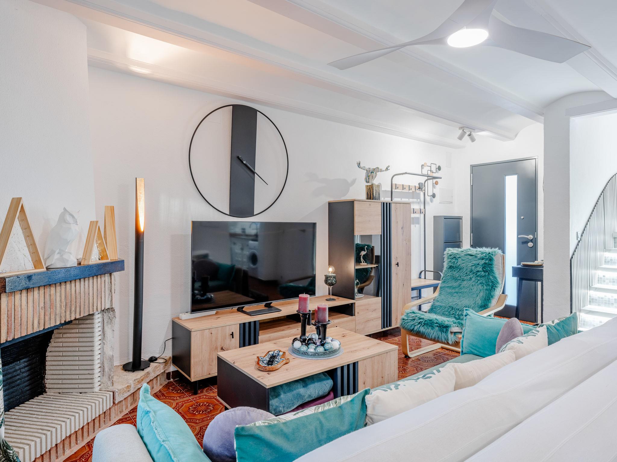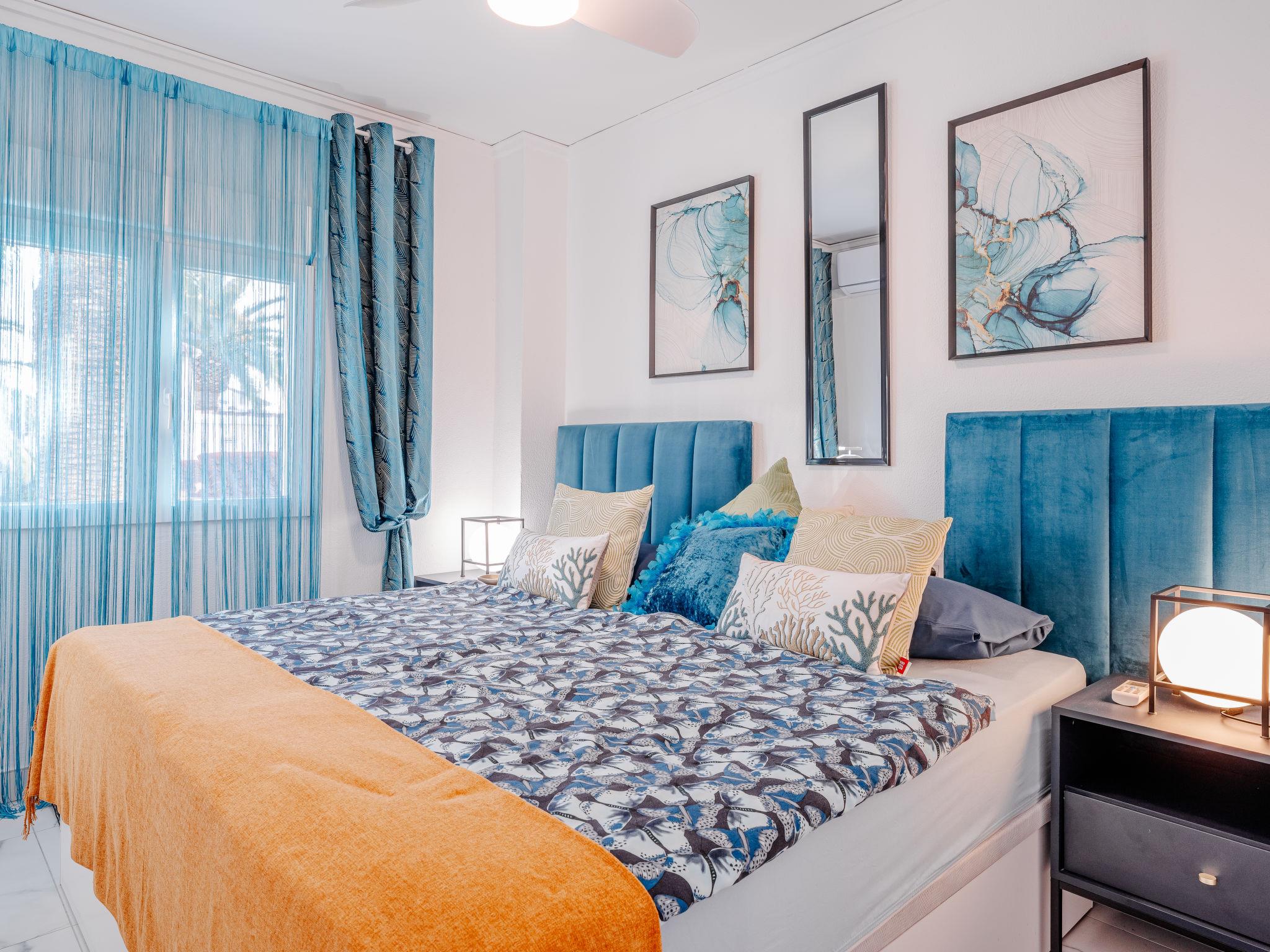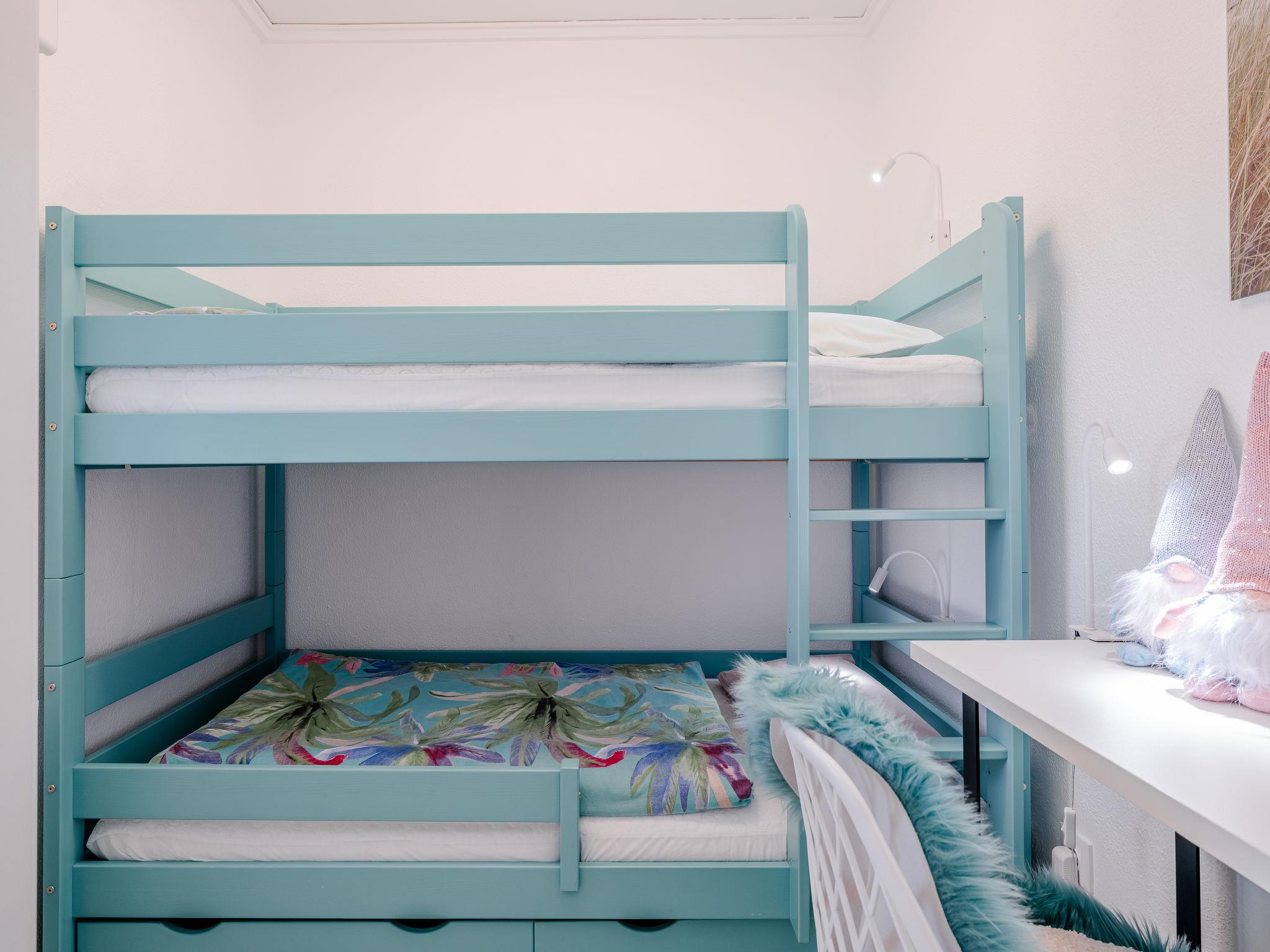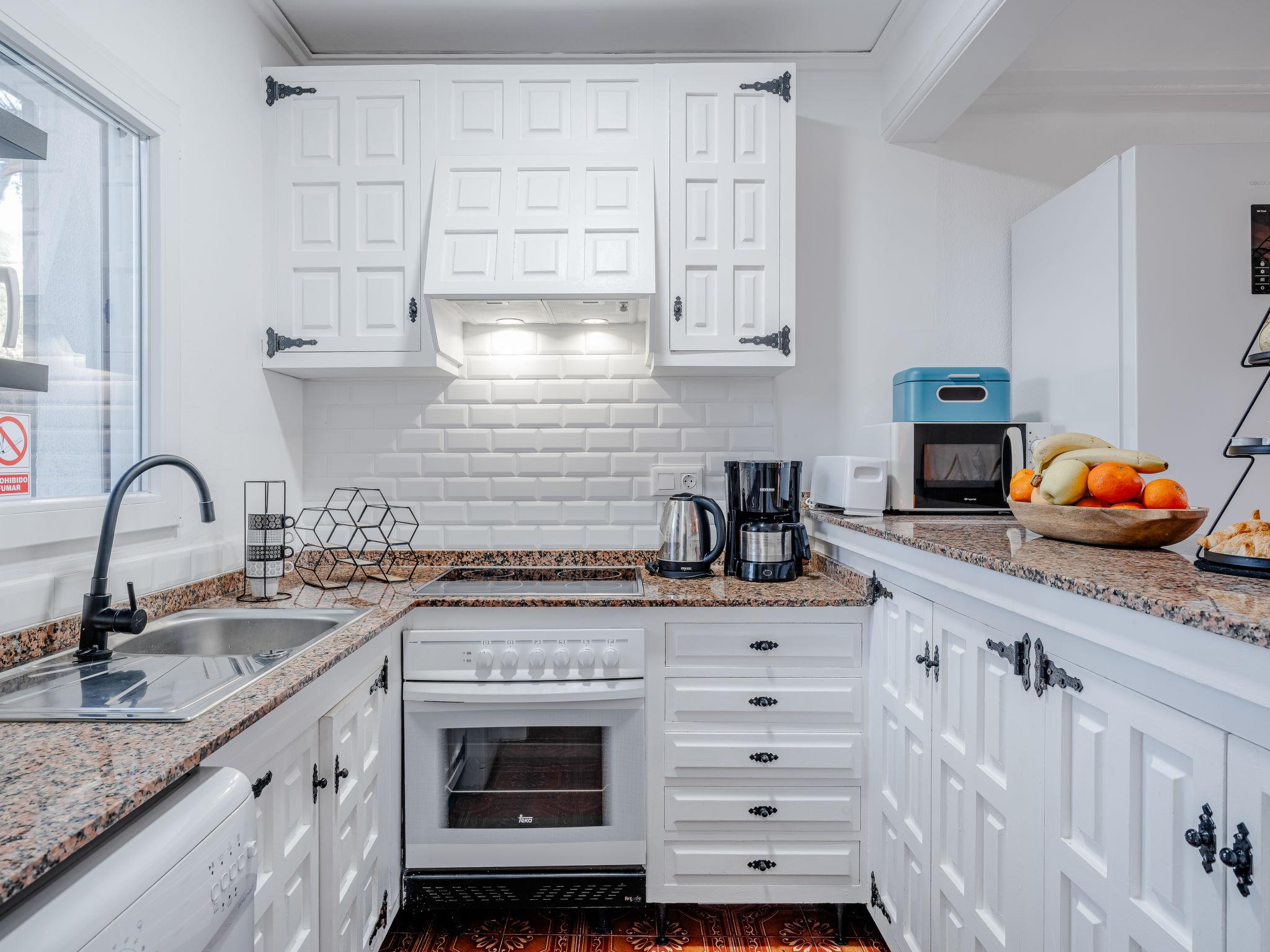 "Residencia La Perla", 4-room terraced house 80 m2 on 2 levels. Object suitable for 4 adults + 2 children. Spacious and bright, very beautiful and stylish furnishings: living/dining room with satellite TV, air conditioning, fan and forced-air heating. Exit to the terrace. Open kitchen (oven, 4 ceramic glass hob hotplates, toaster, kettle, microwave, freezer, electric coffee machine). Sep. WC. Upper floor: 1 room with 1 french bed (150 cm, length 200 cm), satellite TV, air conditioning, fan and forced-air heating. 1 room with 1 double bed (2 x 90 cm, length 190 cm), air conditioning, fan and forced-air heating. 1 room with 1 x 2 bunk beds (80 cm, length 190 cm), fan. Shower/WC. 2 large terraces. Terrace furniture, sitting area. Facilities: washing machine, iron, hair dryer. Internet (WiFi, free). VT-501040-A // Reg. Nr.: ESFCTU00000304500031048000000000000000000VT-501040-A1