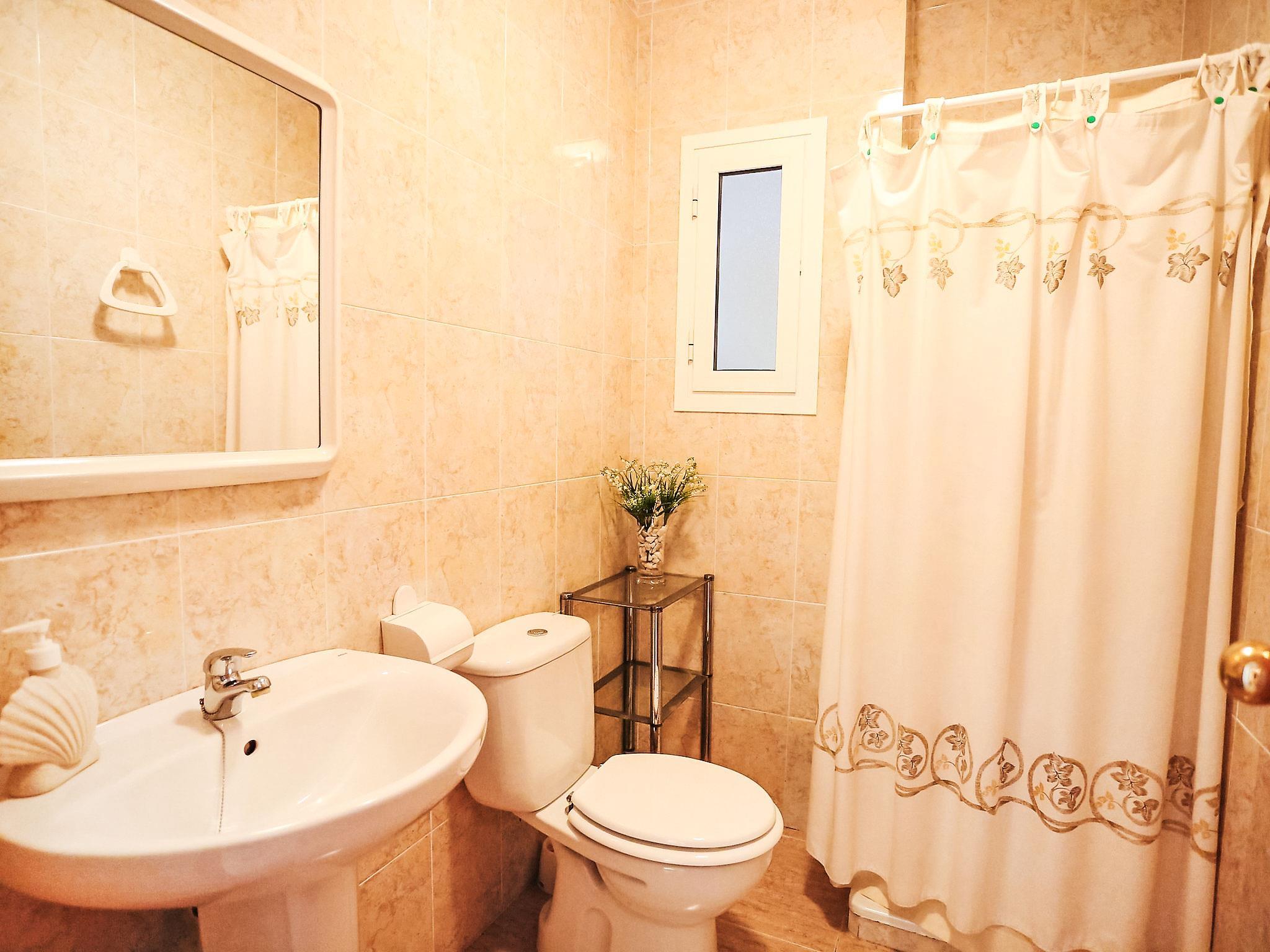 "Vicky", 4-room house 89 m2, on the ground floor. Comfortable and cosy furnishings: living/dining room with dining table, digital TV, international TV channels, air conditioning and forced-air heating. Exit to the patio. 1 double bedroom with 1 french bed (135 cm, length 190 cm). 2 double bedrooms, each room with 2 beds (90 cm, length 190 cm). Open kitchen (oven, 4 ceramic glass hob hotplates, toaster, microwave, freezer, electric coffee machine) with bar. Bath/bidet/WC, shower/WC. Air-conditioning, forced-air heating. Terrace furniture, barbecue, deck chairs, covered balcony. Facilities: washing machine, iron. Internet (WiFi, free). Parking (fenced) at the house. Suitable for families. Maximum 2 pets/ dogs allowed. HUTTE001424 // Reg. Nr.: ESFCTU0000430190005007980000000000000000HUTTE-0014242