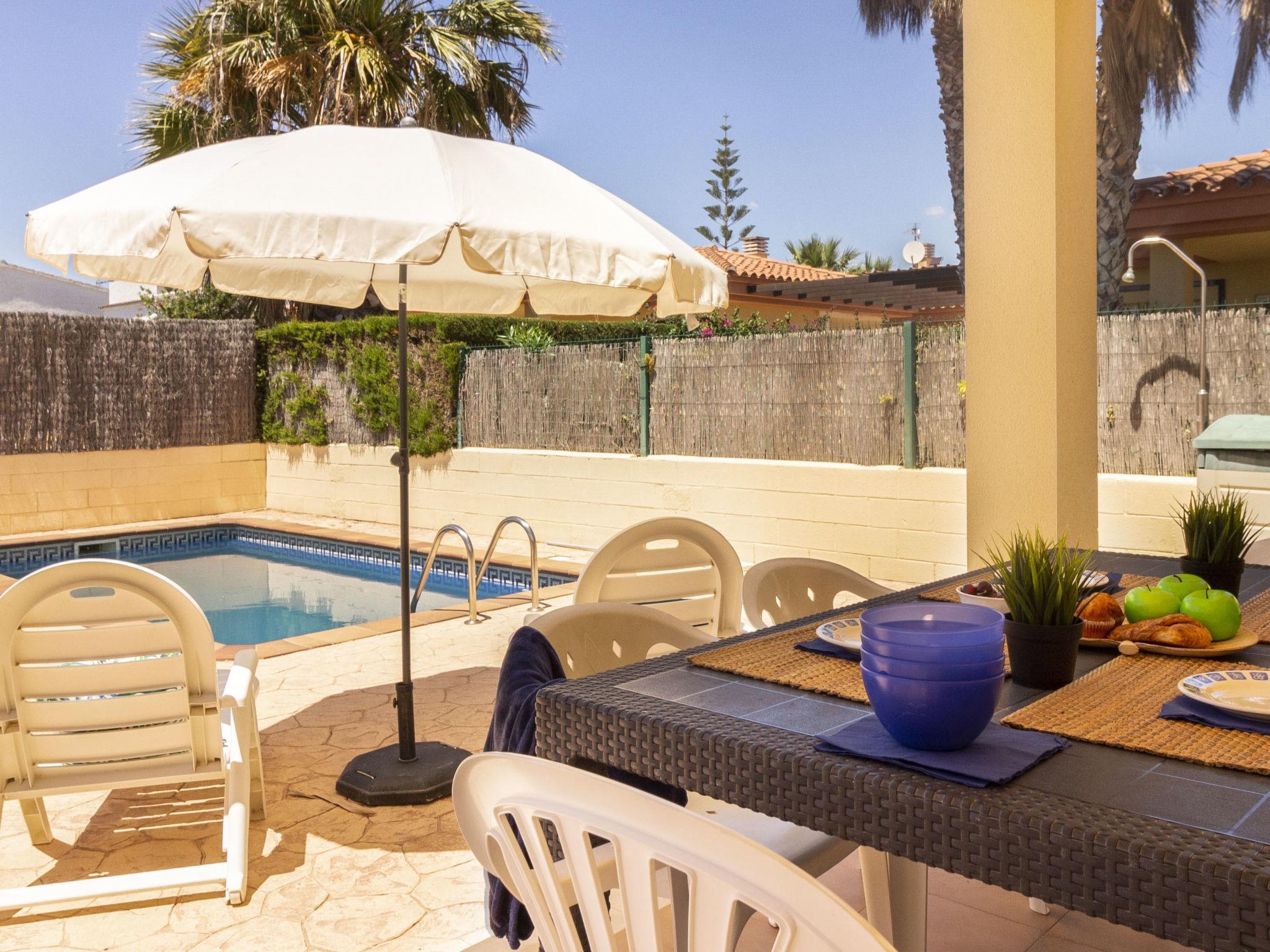 Urb. Riumar 8 km from Deltebre: Cosy, comfortable house "Flamenc 3", built in 2007. In a quiet, sunny position, 1 km from the sea, 1 km from the beach. Private: property (fenced), swimming pool angular (6 x 3 m, depth 170 cm, seasonal availability: 01.Jan. - 31.Dec.). Outdoor shower, pergola, terrace, garden furniture, barbecue. In the house: WiFi, air conditioning, washing machine. Parking on the premises. Supermarket 300 m, restaurant, bar, bakery 100 m, bus stop "Riumar" 100 m, railway station "Aldea- Amposta" 25 km, sandy beach "Riumar" 1 km. Nearby attractions: Parque natural Delta del Ebro 1 km, Tortosa 35 km, Playa el Trabucador 29 km, Barcelona 190 km, Port Aventura 70 km. Hiking paths: Parque natural Puerto Tortosa Beseit 52 km, GR 92 15 km. Please note: car recommended. Suitable for families. Groups of teenagers on request only.