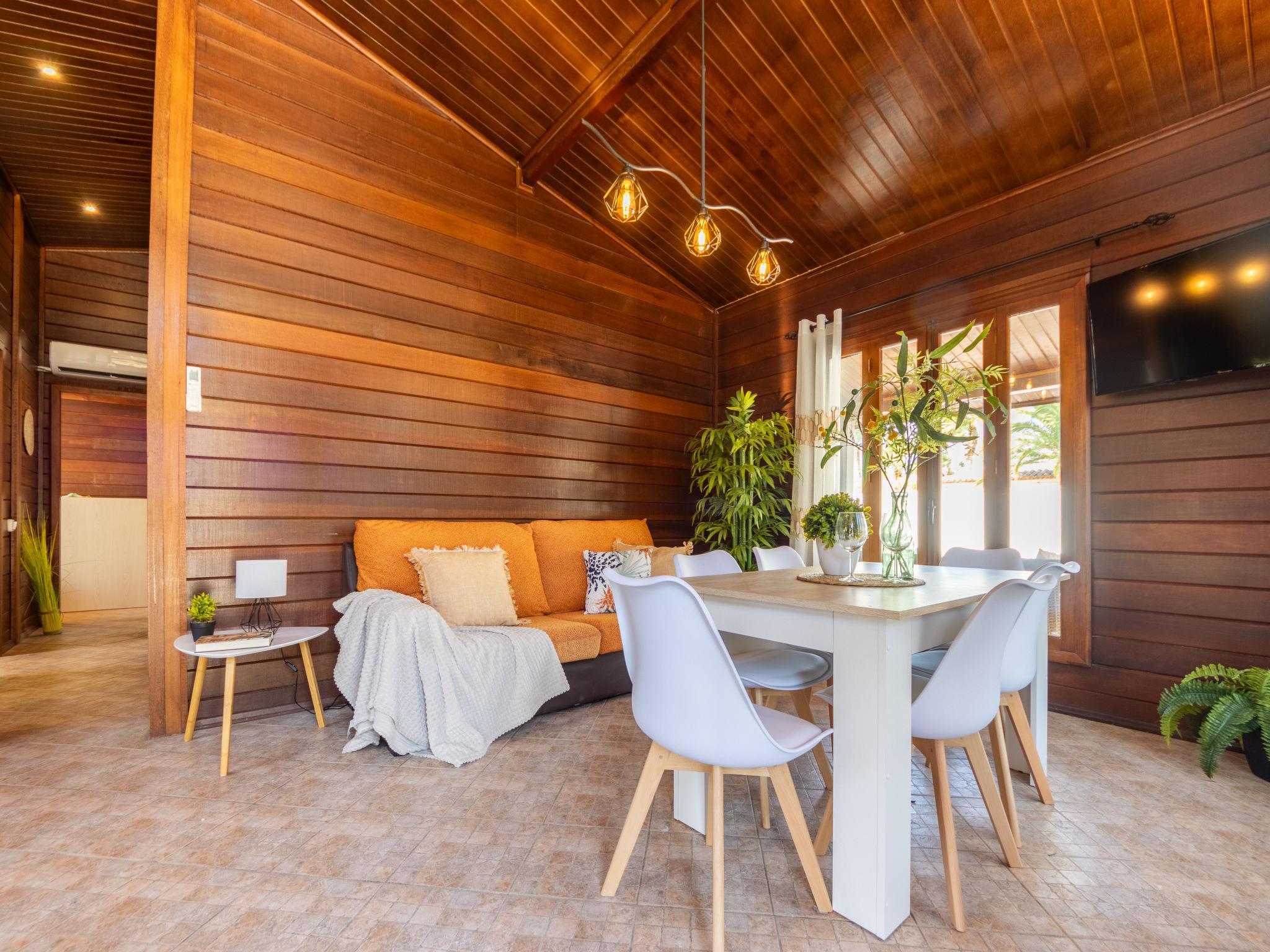 "Tropical 3", 4-room chalet 82 m2, on the ground floor. Bright, beautiful and cosy furnishings: living/dining room with dining table and digital TV. Exit to the garden, to the terrace, to the swimming pool. 2 double bedrooms, each room with 1 french bed (135 cm, length 190 cm). 1 double bedroom with 2 beds (90 cm, length 190 cm). Open kitchen in the entrance (4 hot plates, oven, toaster, microwave, freezer, electric coffee machine, pizza oven). Exit to the terrace, to the swimming pool. Shower/WC, hip bath/WC. Air-conditioning, forced-air heating. Terrace furniture, barbecue, deck chairs, covered balcony. Facilities: washing machine, iron, mosquito net, hair dryer. Internet (WiFi, free). Parking at the house. Suitable for families. Maximum 2 pets/ dogs allowed. HUTTE-038554 // Reg. Nr.: ESFCTU0000430190001019260000000000000000HUTTE-0000160