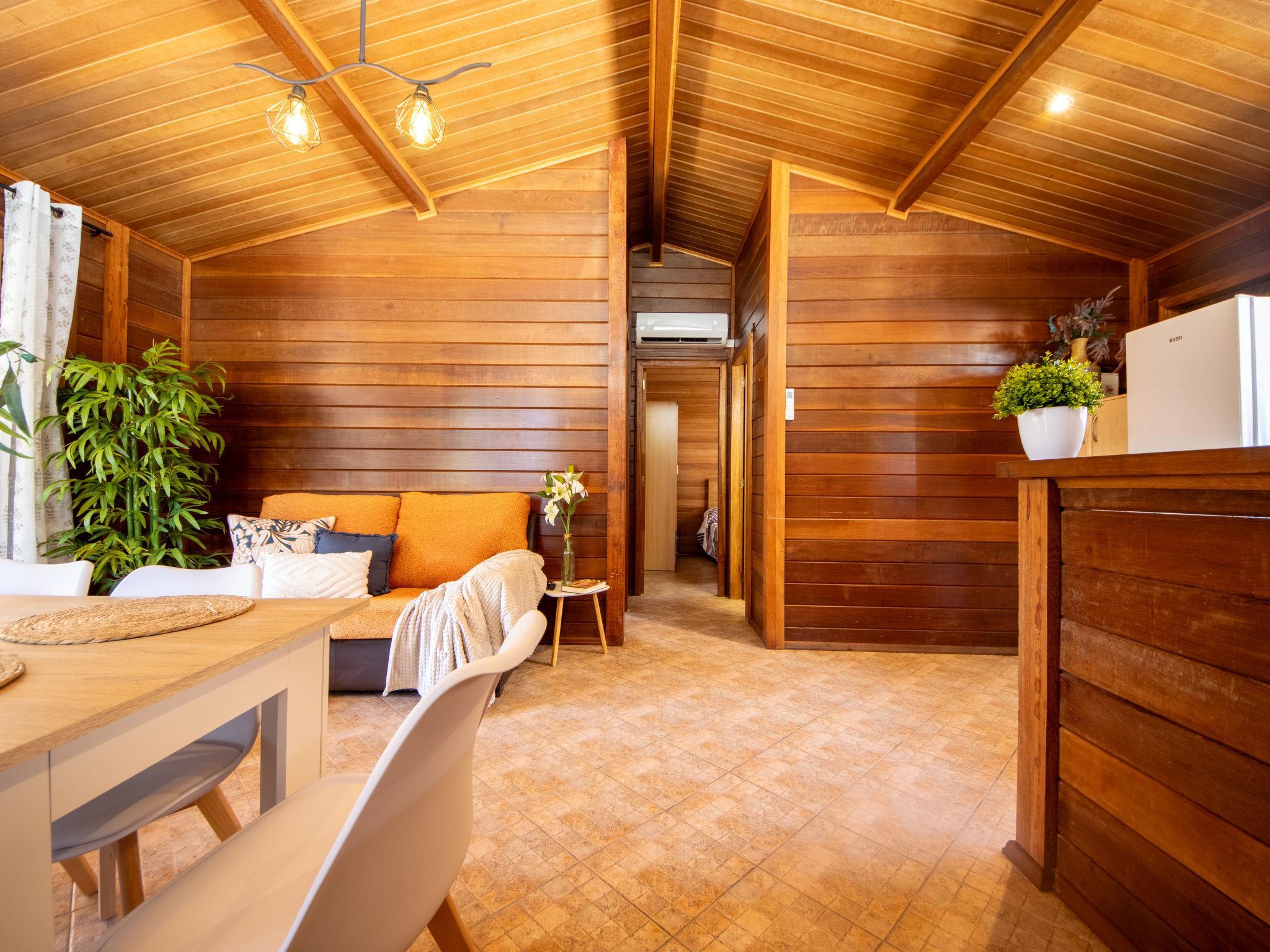 "Tropical 1", 3-room chalet 62 m2, on the ground floor. Beautiful and cosy furnishings: living/dining room with dining table, digital TV, air conditioning and forced-air heating. Exit to the patio. 1 double bedroom with 1 french bed (150 cm, length 190 cm), 1 pull-out bed (2 pers. 2 x 90 cm, length 190 cm). 1 double bedroom with 1 french bed (150 cm, length 190 cm). Open kitchen in the entrance (4 hot plates, oven, toaster, microwave, freezer, electric coffee machine, pizza oven) with bar. Hip bath/WC. Air-conditioning, forced-air heating. Terrace furniture, barbecue, deck chairs, covered balcony. Facilities: washing machine, iron, mosquito net, hair dryer. Internet (WiFi, free). Parking at the house. Suitable for families. Maximum 2 pets/ dogs allowed. HUTTE-000439