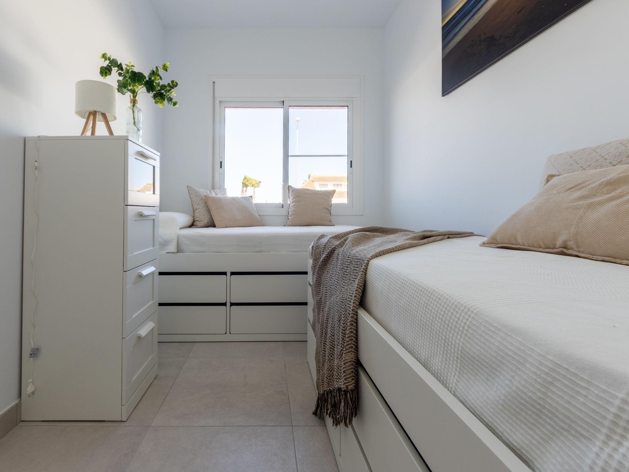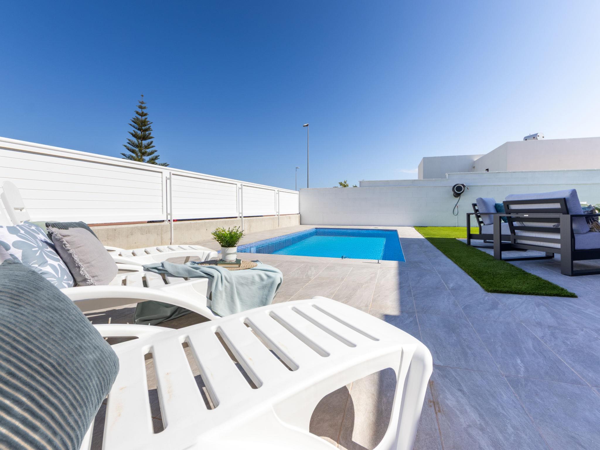 Riumar 10 km from Deltebre: Modern, cosy house "Grobro II". In a quiet, sunny position, 700 m from the sea, 700 m from the beach. Private: property (fenced), swimming pool angular (8 x 3 m, depth 160 cm, seasonal availability: 01.Apr. - 30.Nov.) with internal staircase. Outdoor shower, pergola, terrace, garden furniture, barbecue. In the house: WiFi, air conditioning, washing machine. Parking at the house. Supermarket 500 m, restaurant, bar 300 m, bakery 600 m, bus stop "Riumar" 400 m, railway station "Aldea- Amposta" 25 km. Nearby attractions: Parc Natural del Delta 800 m, Tortosa 35 km, Playa el Trabucador 29 km, Barcelona 190 km, Port Aventura 70 km. Hiking paths: Ports Tortosa Beseit 52 km, GR 92 20 km. Please note: car recommended. Groups of teenagers on request only.