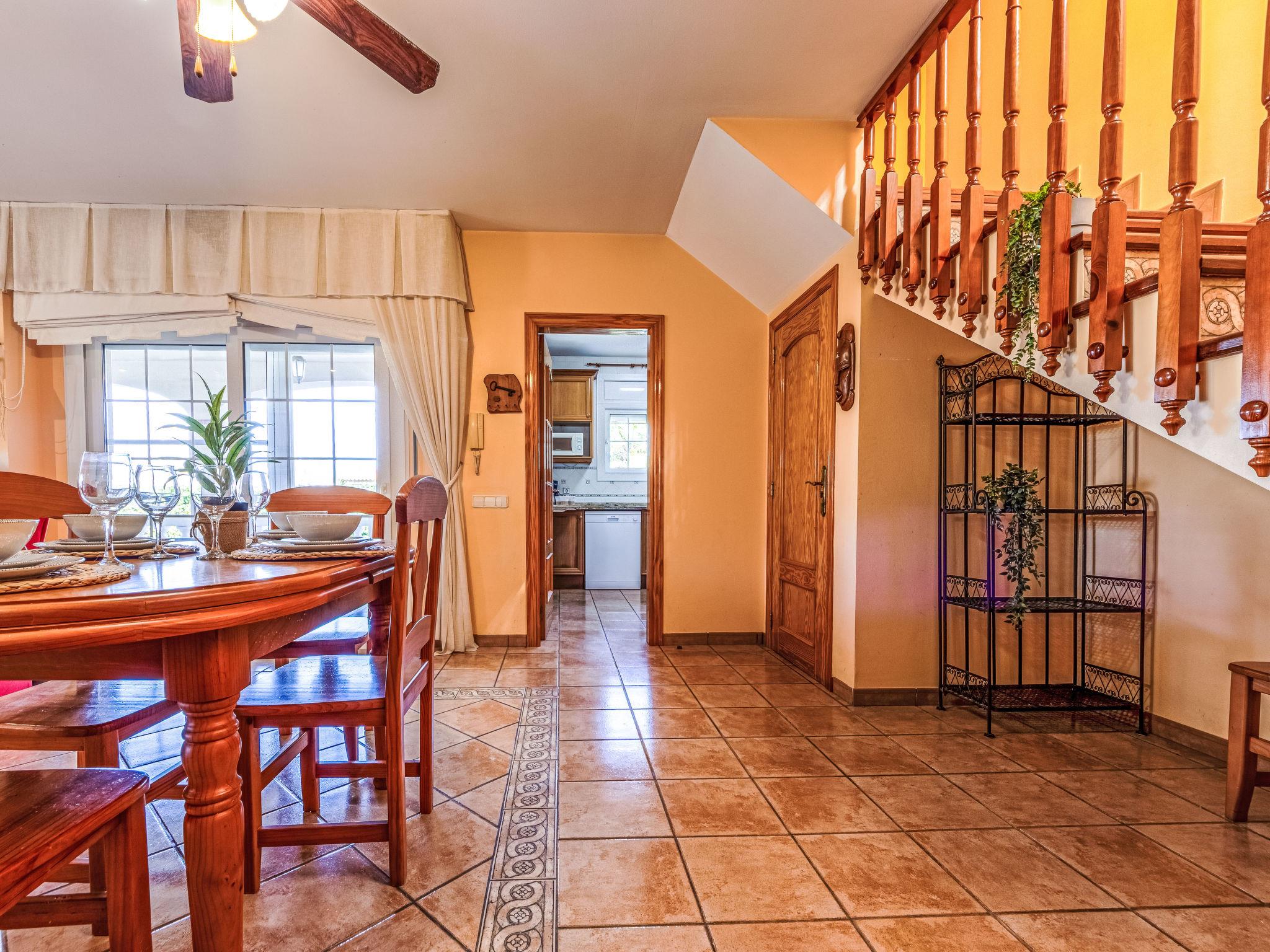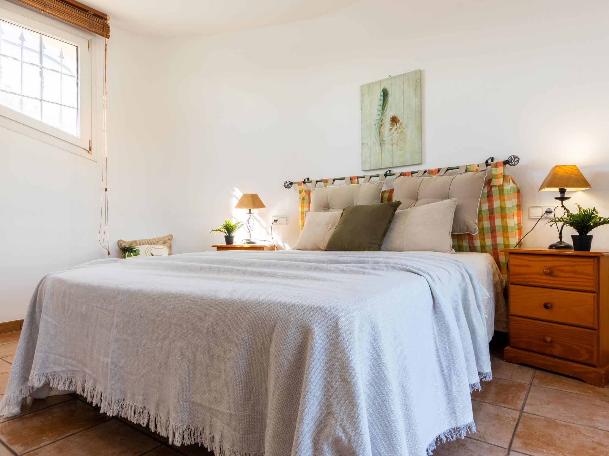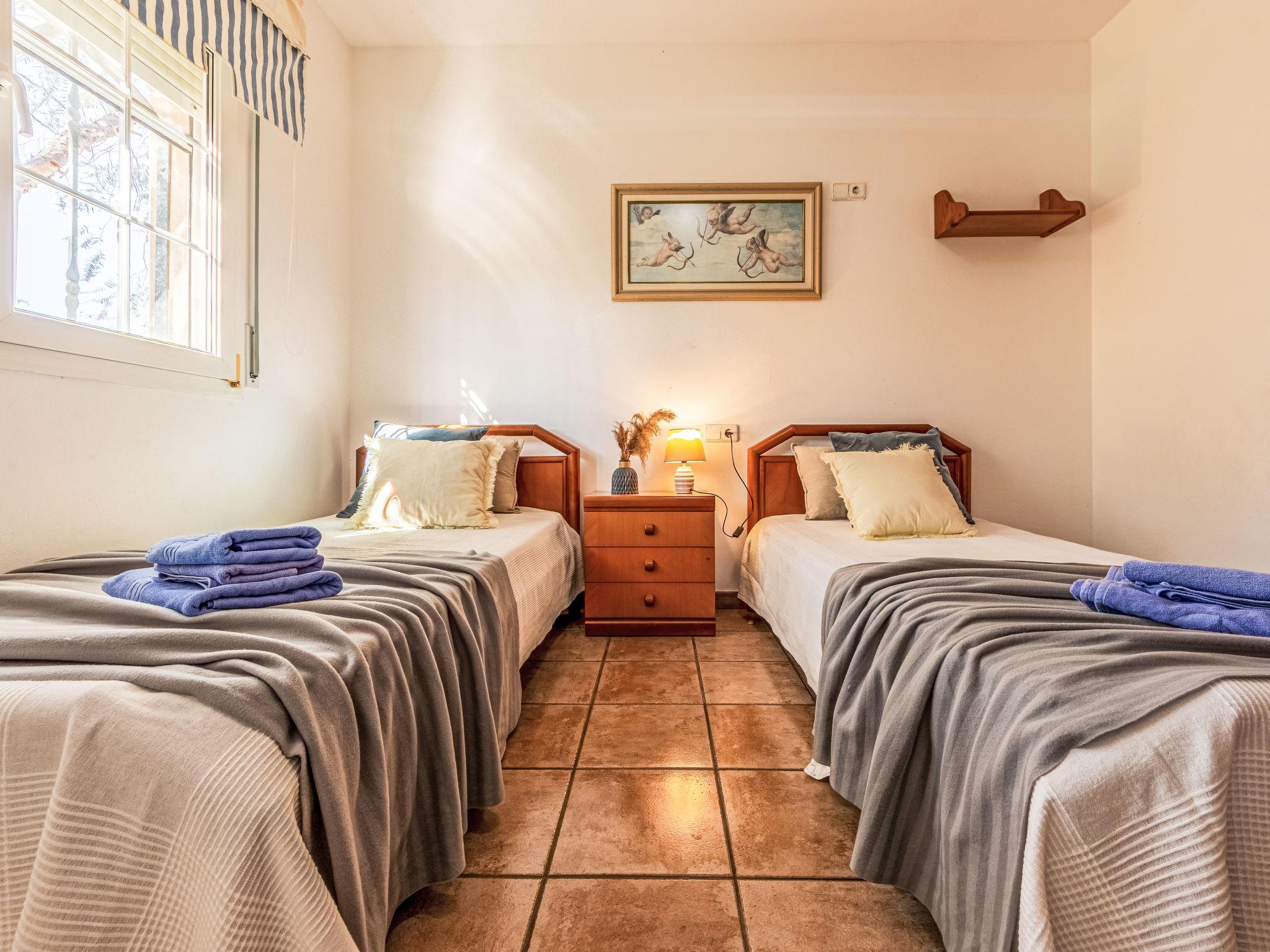 "Primavera", 4-room house 120 m2 on 2 levels. Comfortable and cosy furnishings: living/dining room with open-hearth fireplace (only for decoration), dining table and digital TV. Exit to the patio, to the swimming pool. 1 double bedroom with 2 beds (90 cm, length 190 cm). 1 double bedroom with 2 beds (90 cm, length 190 cm). Open kitchen (oven, dishwasher, 4 ceramic glass hob hotplates, toaster, microwave, freezer, electric coffee machine) with bar. Shower/WC. Air-conditioning, forced-air heating. Heating not available in all rooms. Upper floor: 1 double bedroom with 1 french bed (135 cm, length 190 cm), air conditioning and forced-air heating. Shower/WC. Patio. Terrace furniture, barbecue, deck chairs, covered balcony. View of the swimming pool and the garden. Facilities: washing machine, iron, mosquito net, hair dryer. Internet (WiFi, free). Parking (fenced). Suitable for families. Maximum 2 pets/ dogs allowed. HUTTE-001751 // Reg. Nr.: ESFCTU0000430190000918690000000000000000HUTTE-0017513