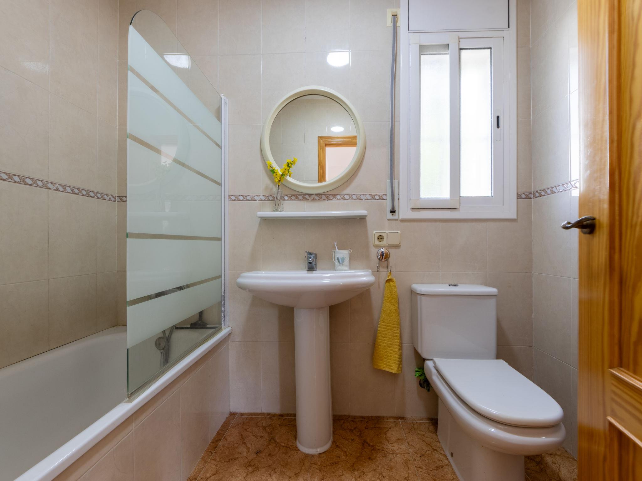 "Juana", 4-room house 80 m2, on the ground floor. Comfortable and cosy furnishings: living/dining room with open-hearth fireplace, dining table, digital TV, air conditioning and forced-air heating. Exit to the terrace, to the swimming pool. 2 double bedrooms, each room with 1 french bed (135 cm, length 190 cm). 1 double bedroom with 1 french bed (135 cm, length 190 cm), bath/WC. Open kitchen (oven, 4 ceramic glass hob hotplates, toaster, microwave, freezer, electric coffee machine). Exit to the terrace, to the swimming pool. Hip bath/bidet/WC. Air-conditioning, forced-air heating. Patio. Terrace furniture, barbecue, deck chairs, covered balcony. Facilities: washing machine, iron, mosquito net, hair dryer. Internet (WiFi, free). Parking (fenced). Suitable for families. Maximum 2 pets/ dogs allowed. HUTTE-002845 // Reg. Nr.: ESFCTU00004301900054976600000000000000000HUTTE0028459
