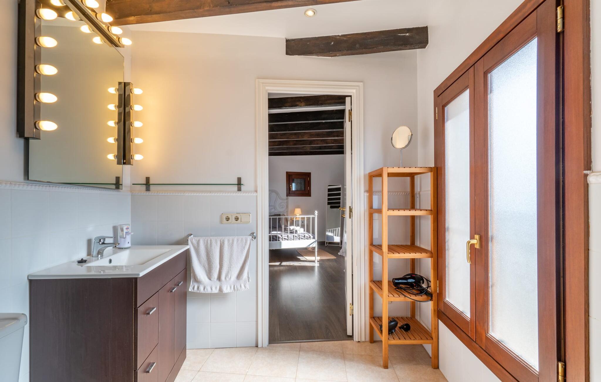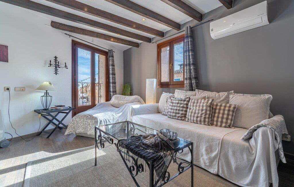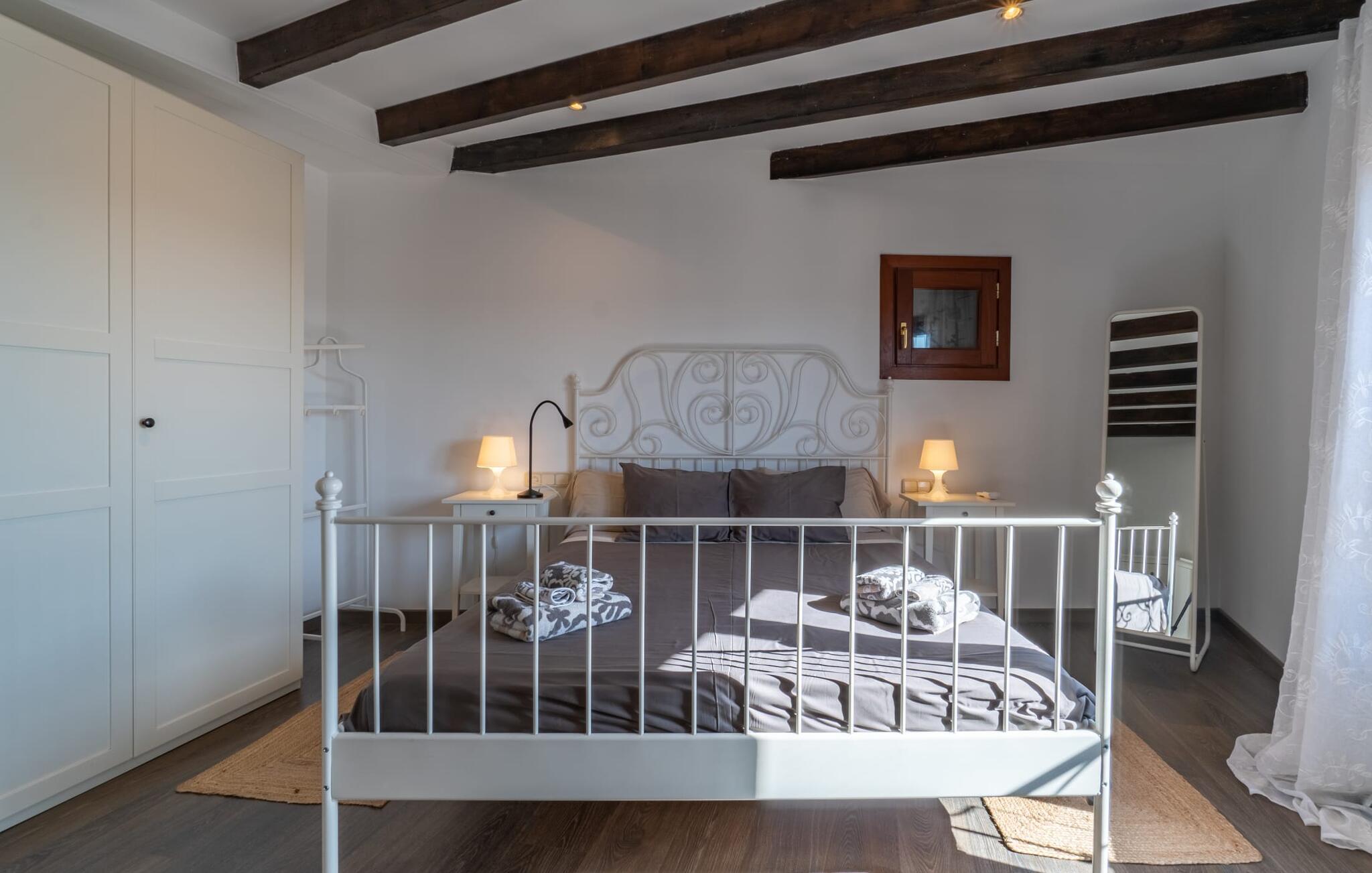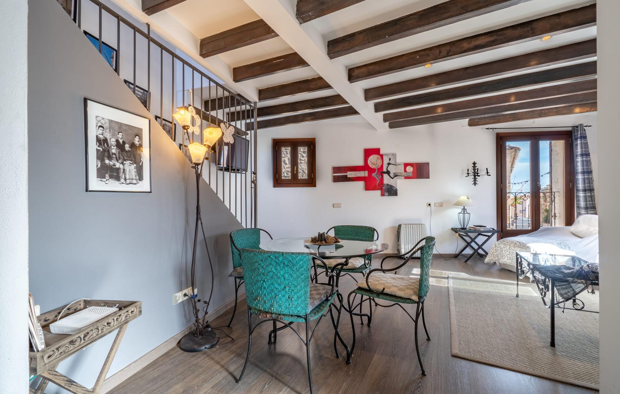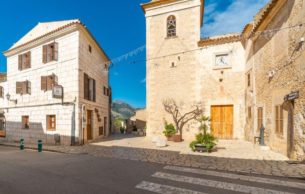 Den komfortabelt indrettede ferielejlighed "Duplex can Roses" imponerer med sin smukke bjergkulisse, især når man står på tagterrassen i dette hus. Det ligger overfor kirken, ved foden af Tramuntana-bjergene. Denne lejlighed er et ideelt udgangspunkt for at udforske det omkringliggende område. Samtidig har I mulighed for at opleve autentisk ø-liv i denne typiske mallorcanske landsby. Hvis I gerne vil bruge tid i boligen, finder I liggestole, stole og et bord på ovennævnte terrasse. Der er ingen grænser for omfattende solbadning, en udendørs morgenmad eller en grillaften. Indenfor byder denne lejlighed på første sal en behagelig, hyggelig atmosfære. Stuen og spisestuen er et hyggeligt område at slappe af. Det lille bord er et godt sted at spise sammen. Et andet opholdsområde er i køkkenet ved siden af. Det er fuldt udstyret og ideelt til selvstændig forplejning på ferie. Der er også et gæstetoilet på denne etage. Soveværelset med dobbeltseng og badeværelset med bruser er et niveau over. Tagterrassen er også heroppe. Tilstedeværelsen af radiatorer og varm-kold aircondition tillader behagelige ophold i denne ferielejlighed på Mallorca hele året rundt. Beliggende på et højt plateau byder byen på enkle indkøbsmuligheder og restauranter. Større indkøb kan foretages i Selva (4 km) eller Campanet (3 km). Populære strande i nord, herunder Platja del Muro, er ca. 21 km væk.