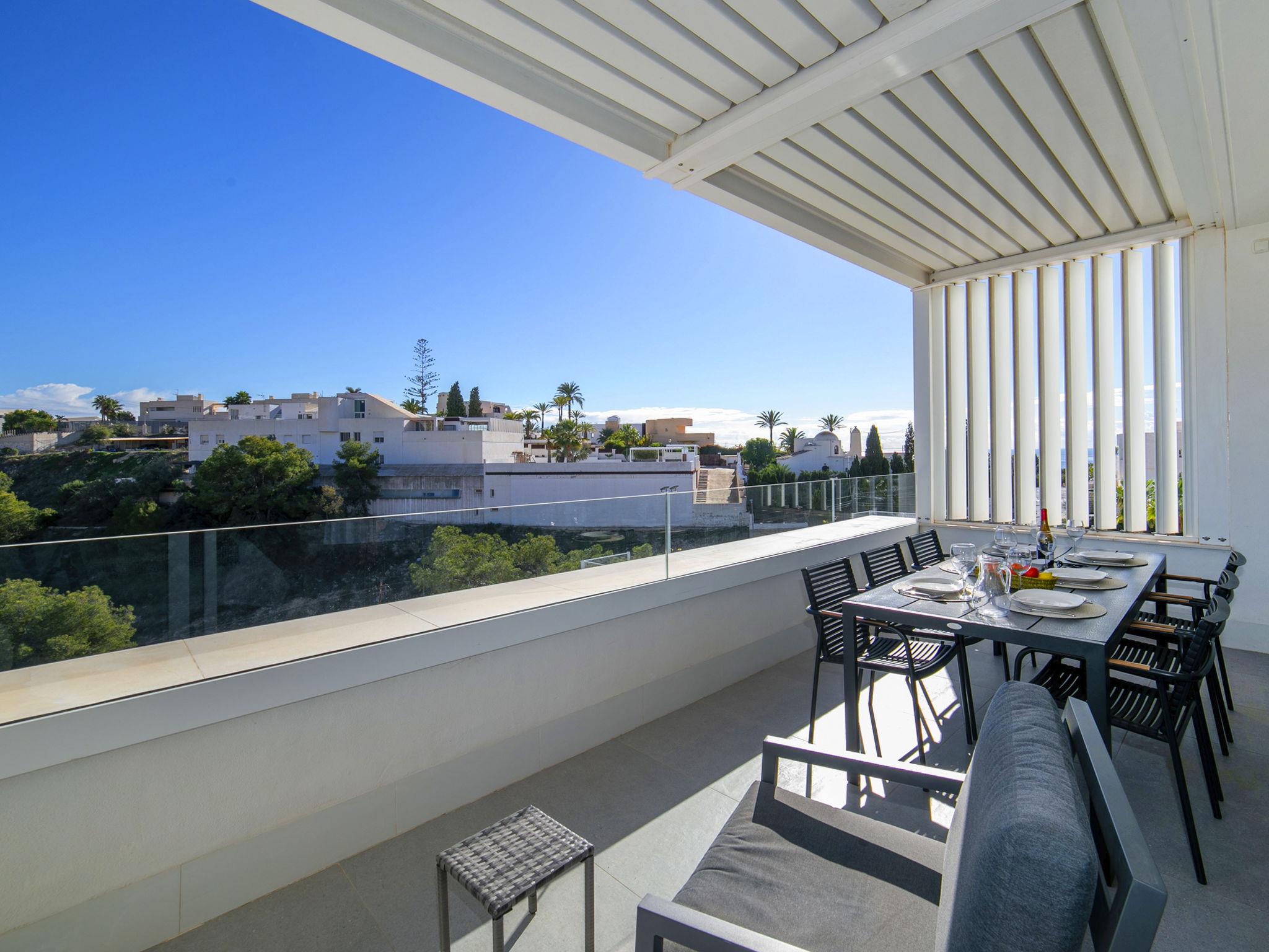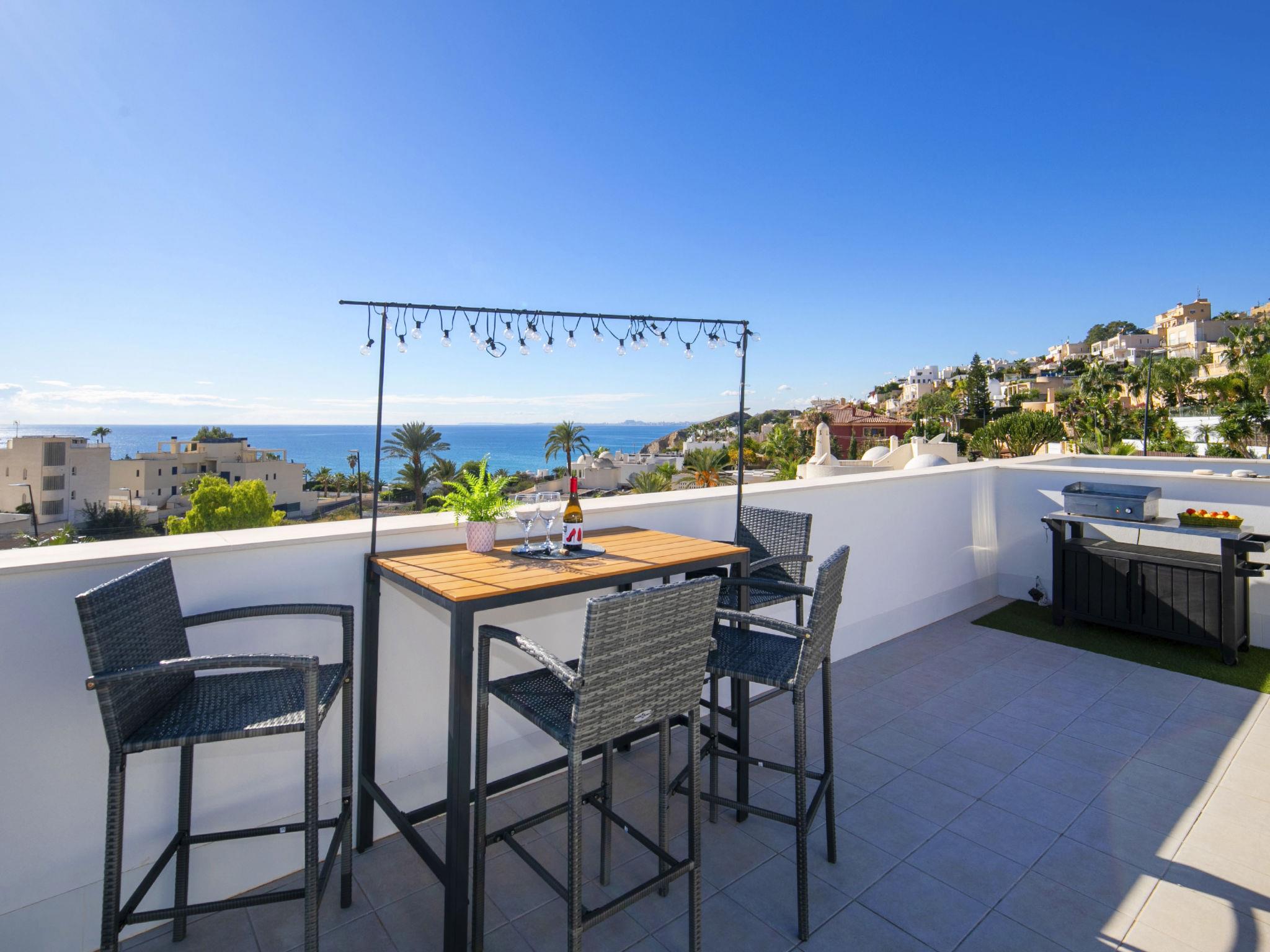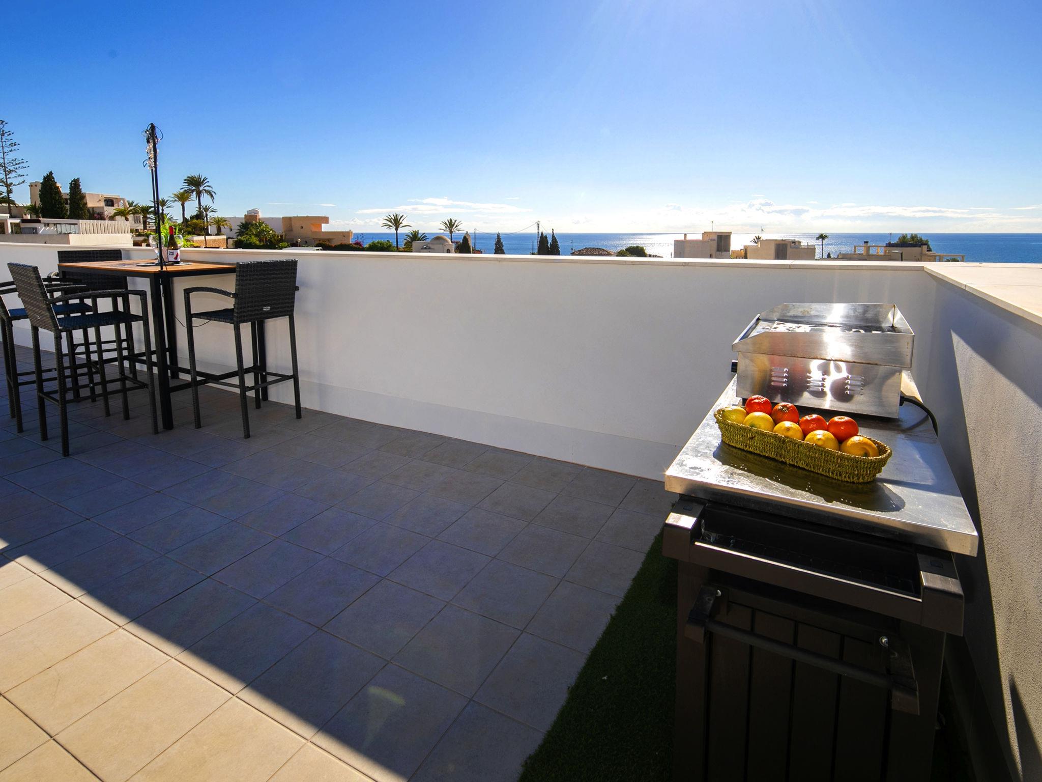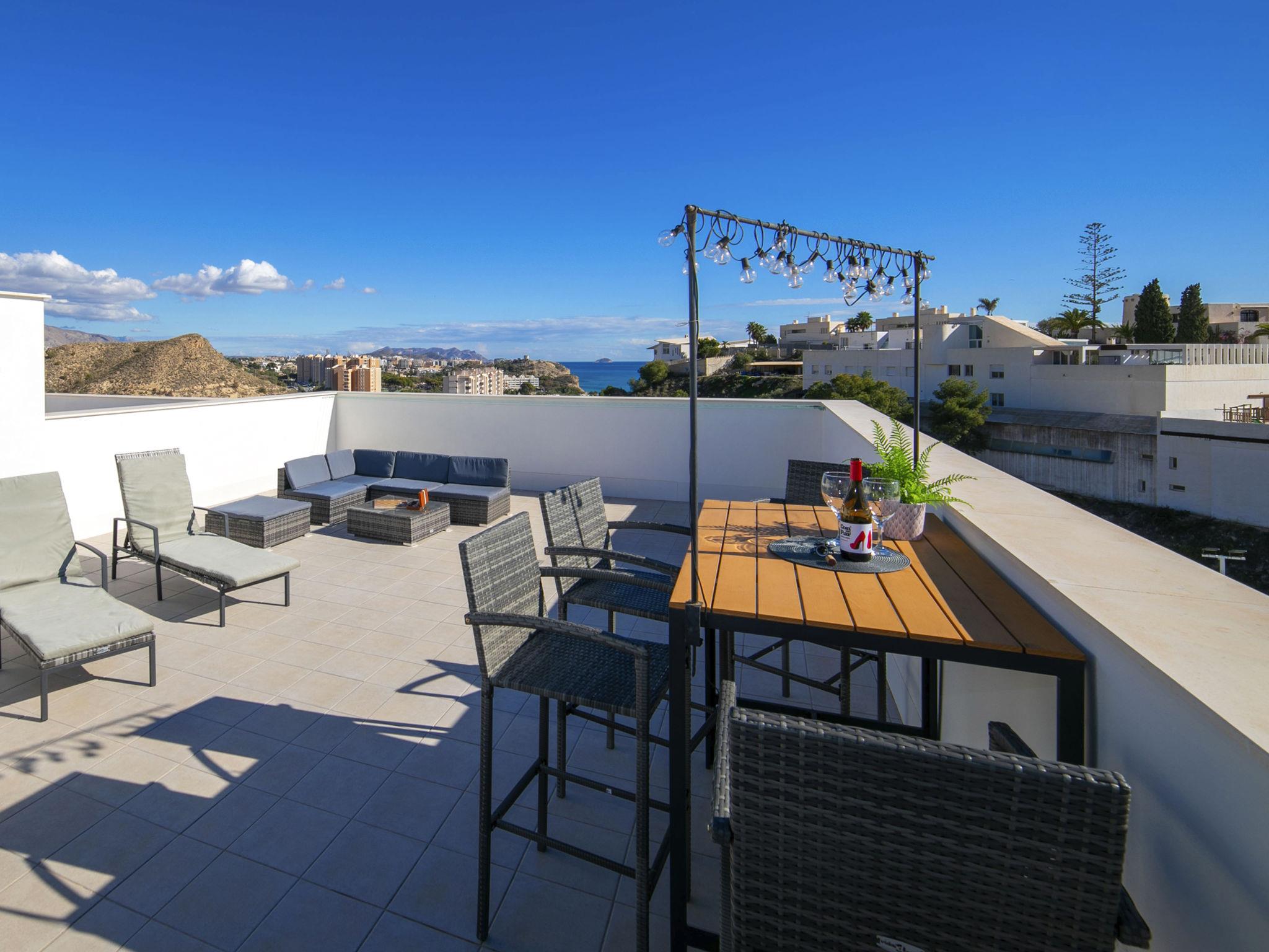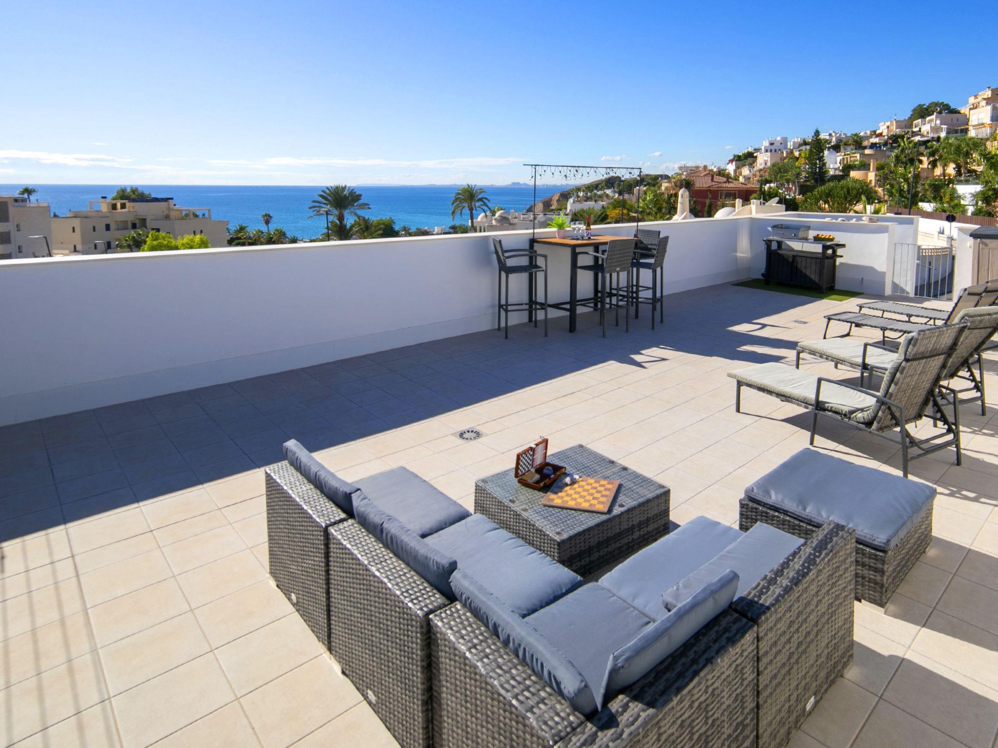 "Urbanizacion Blueviews", 3-room apartment 170 m2 on 2 levels. Object suitable for 4 adults. Spacious and bright, comfortable and tasteful furnishings: living/dining room 27 m2 with digital TV, air conditioning and forced-air heating. Exit to the terrace. 8 m2, 1 room with 1 french bed (150 cm, length 190 cm), shower/WC, air conditioning and forced-air heating. Exit to the terrace. 9 m2, 1 room with 2 beds (90 cm, length 190 cm), air conditioning and forced-air heating. Open kitchen (oven, dishwasher, 3 ceramic glass hob hotplates, toaster, kettle, microwave, freezer, electric coffee machine). Shower/WC. Large terrace 20 m2, large terrace 86 m2. Terrace furniture, barbecue, deck chairs. Distant view of the sea and the mountains. Facilities: washing machine, iron, hair dryer. Internet (WiFi, free). Parking space n 16. Please note: non-smokers only. VT-509203-A // Reg. Nr.: ESFCTU00000307900077281800000000000000000VT-509203-A6