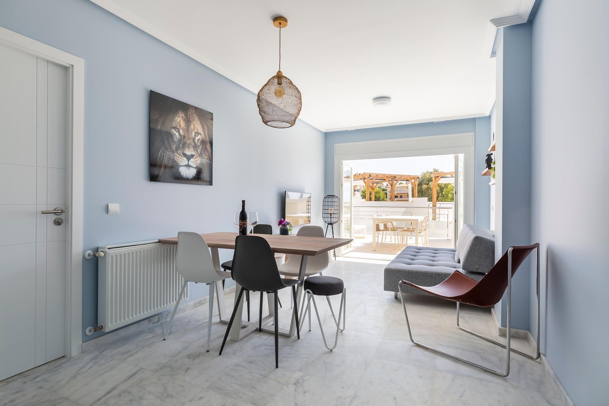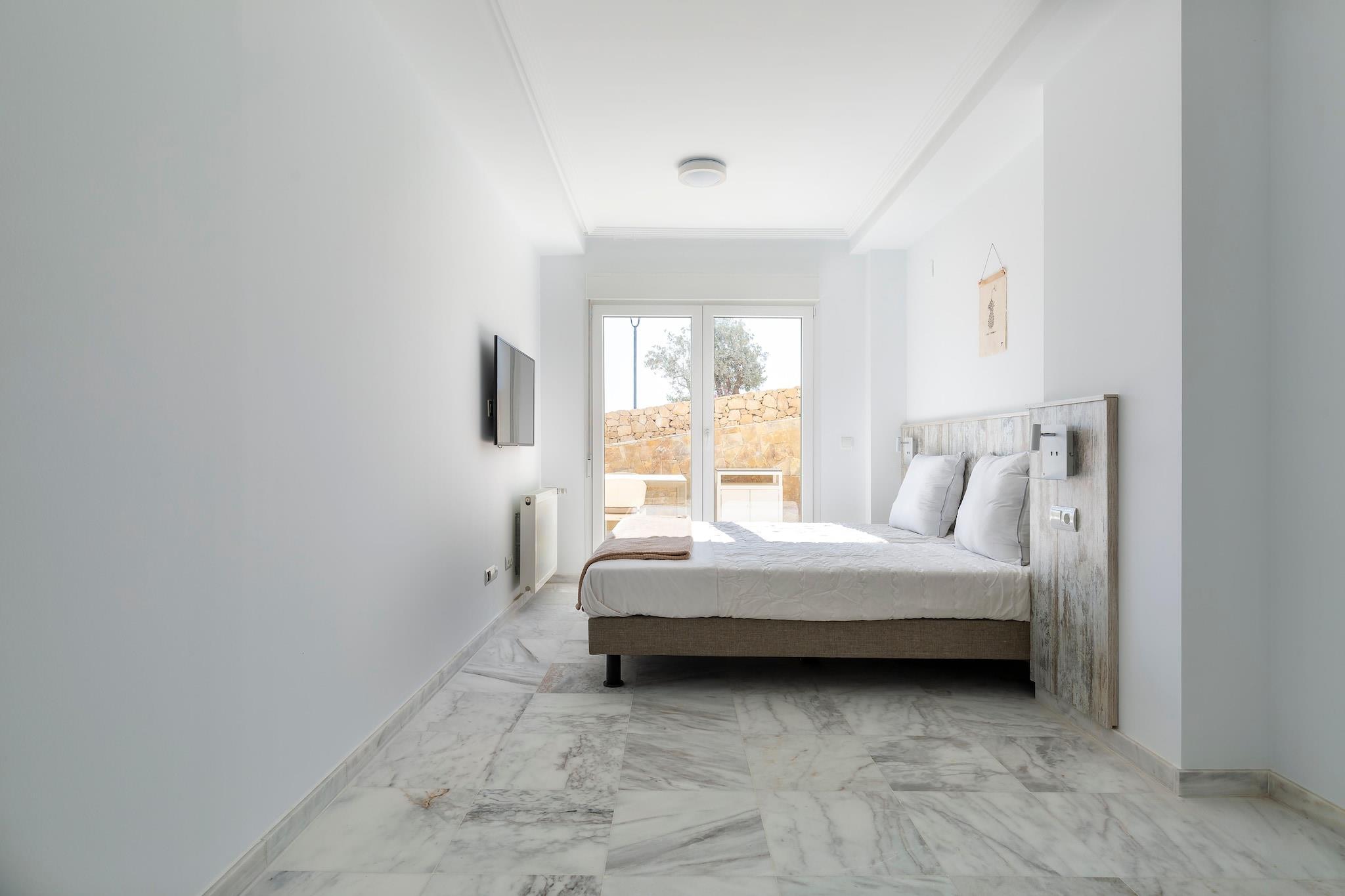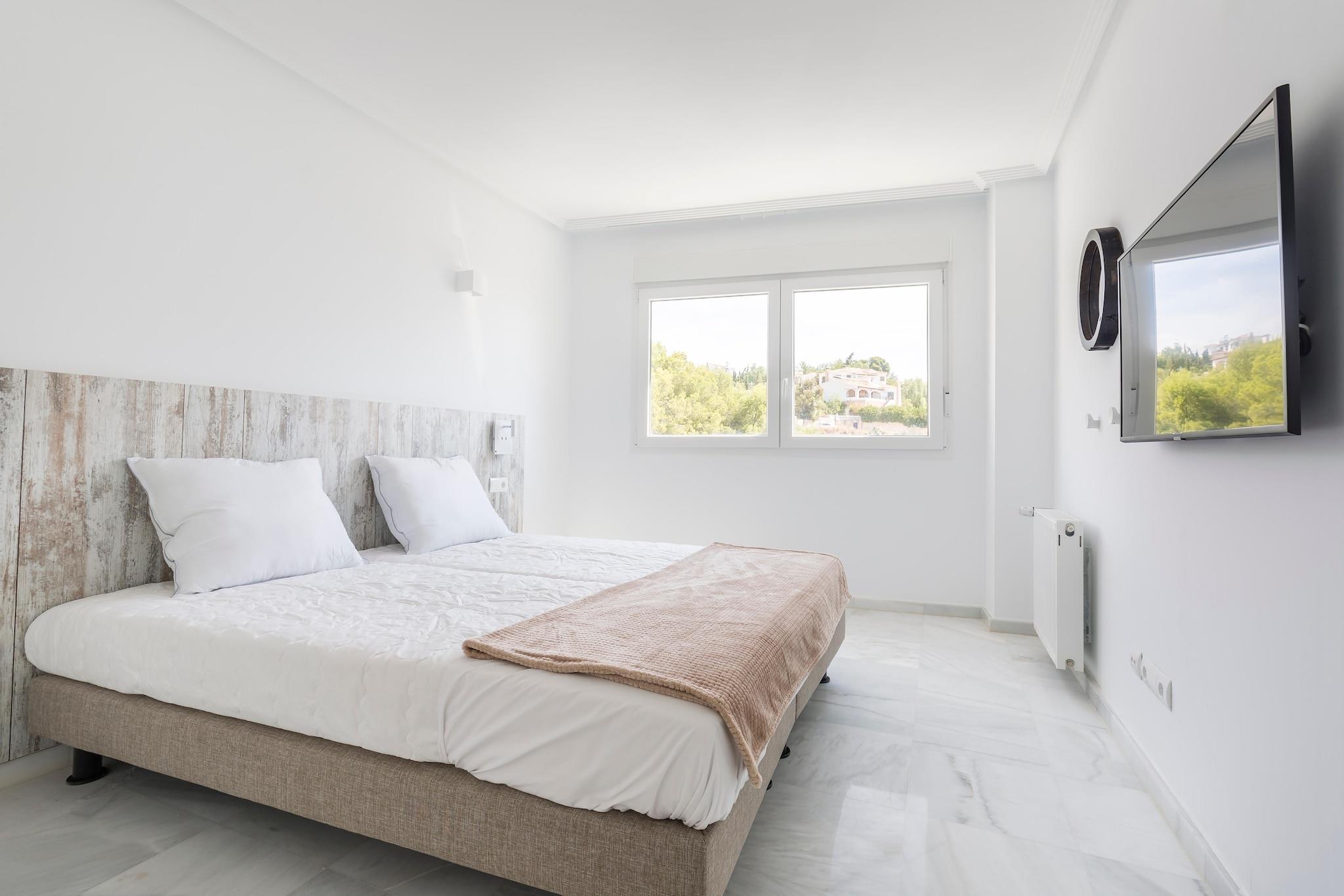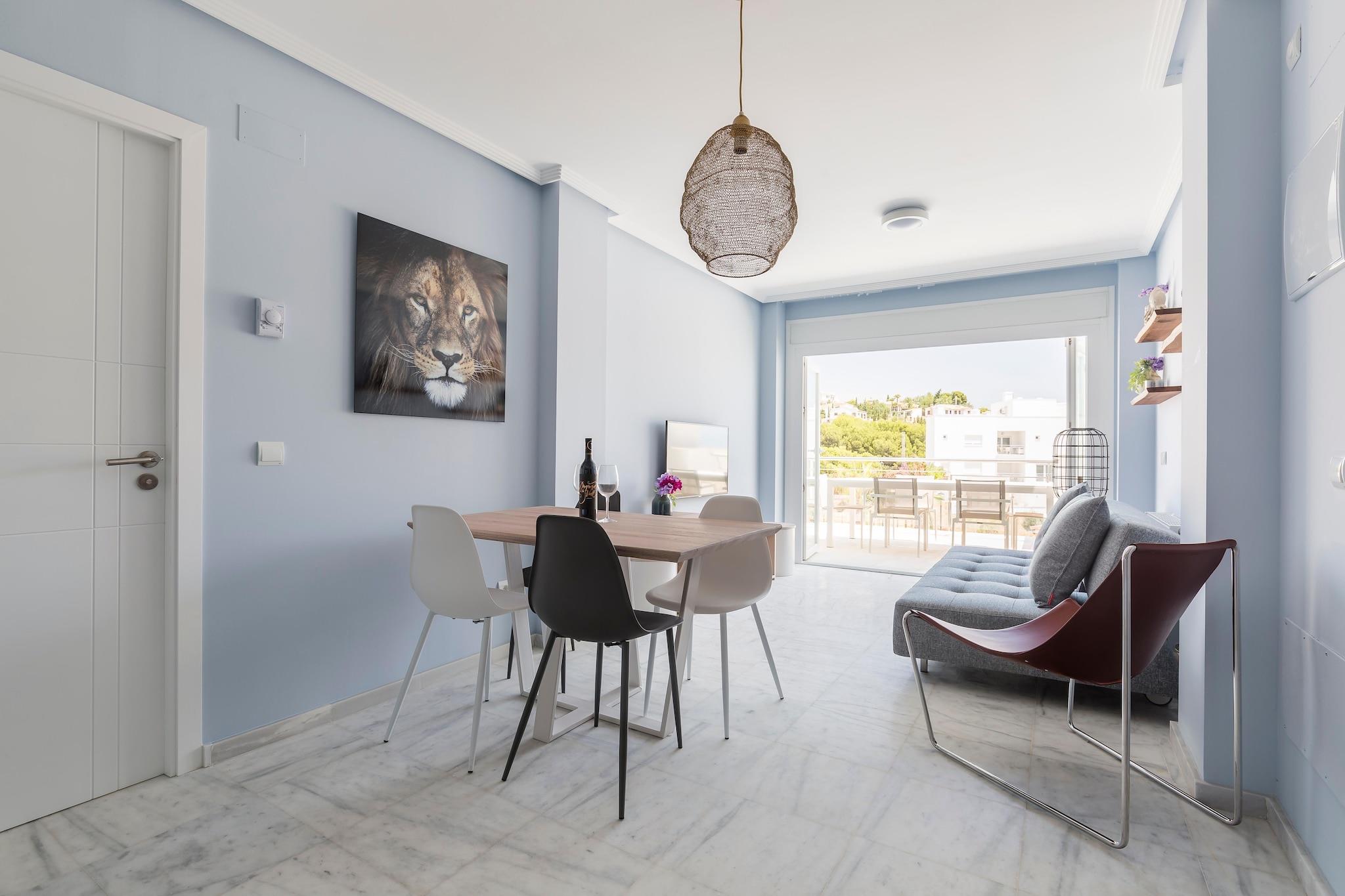 Middelhavskomfort med moderne stil Bo i hjertet af Costa Blancas charme i denne elegante lejlighed i stueetagen i en luksuriøs badeby. Pladsen er designet til op til fire gæster (ideel til to voksne og to børn) og byder på marmorgulve, smagfuld indretning og en frisk middelhavsstemning. Nyd gratis WiFi, aircondition og et fuldt udstyret køkken med ovn, opvaskemaskine og kaffemaskine - perfekt til en afslappende ferie med egen forplejning. Førsteklasses beliggenhed med resortfaciliteter Træd fra din stue eller soveværelse direkte ud på den møblerede terrasse, hvor du kan nyde udsigten over den frodige have, den glitrende pool eller det fredfyldte landskab. Tag en dukkert i den opvarmede fælles pool, slentre til El Campellos sandstrande, eller udforsk charmerende strandpromenader. Sikker underjordisk parkering er tilgængelig for din bekvemmelighed (betalt). Kæledyrsvenligt paradis ved havet Tag dine lodne venner med! Området byder på naturskønne kæledyrsvandringstier, hundevenlige caféer og endda en strandafdeling, hvor kæledyr kan plaske i bølgerne. Efter en dag med sjov ved havet kan du slappe af på terrassen med et glas lokal vin, mens dit kæledyr hviler glad ved din side. I nærheden kan du nyde friske skaldyrs-paella, tapasbarer og restauranter ved vandet, der serverer middelhavssmag, der gør Costa Blanca uforglemmelig.