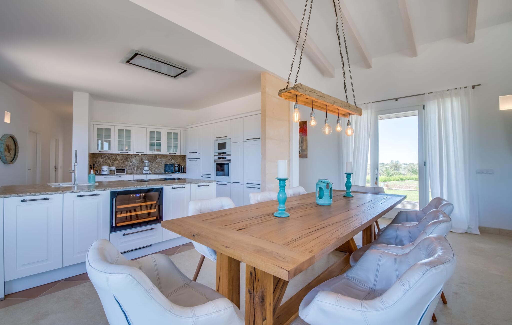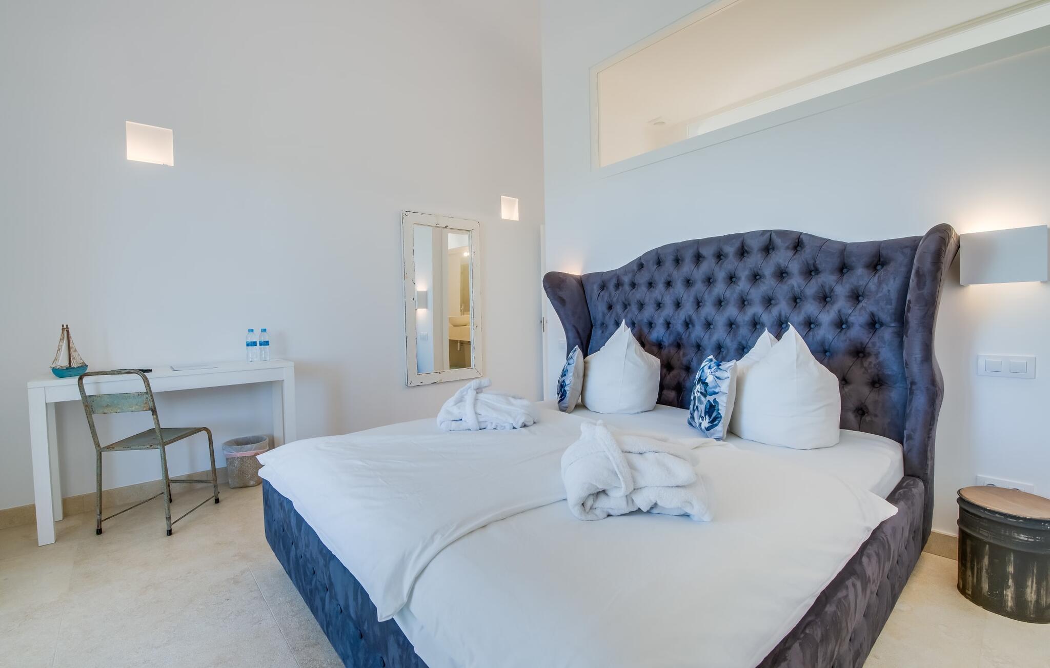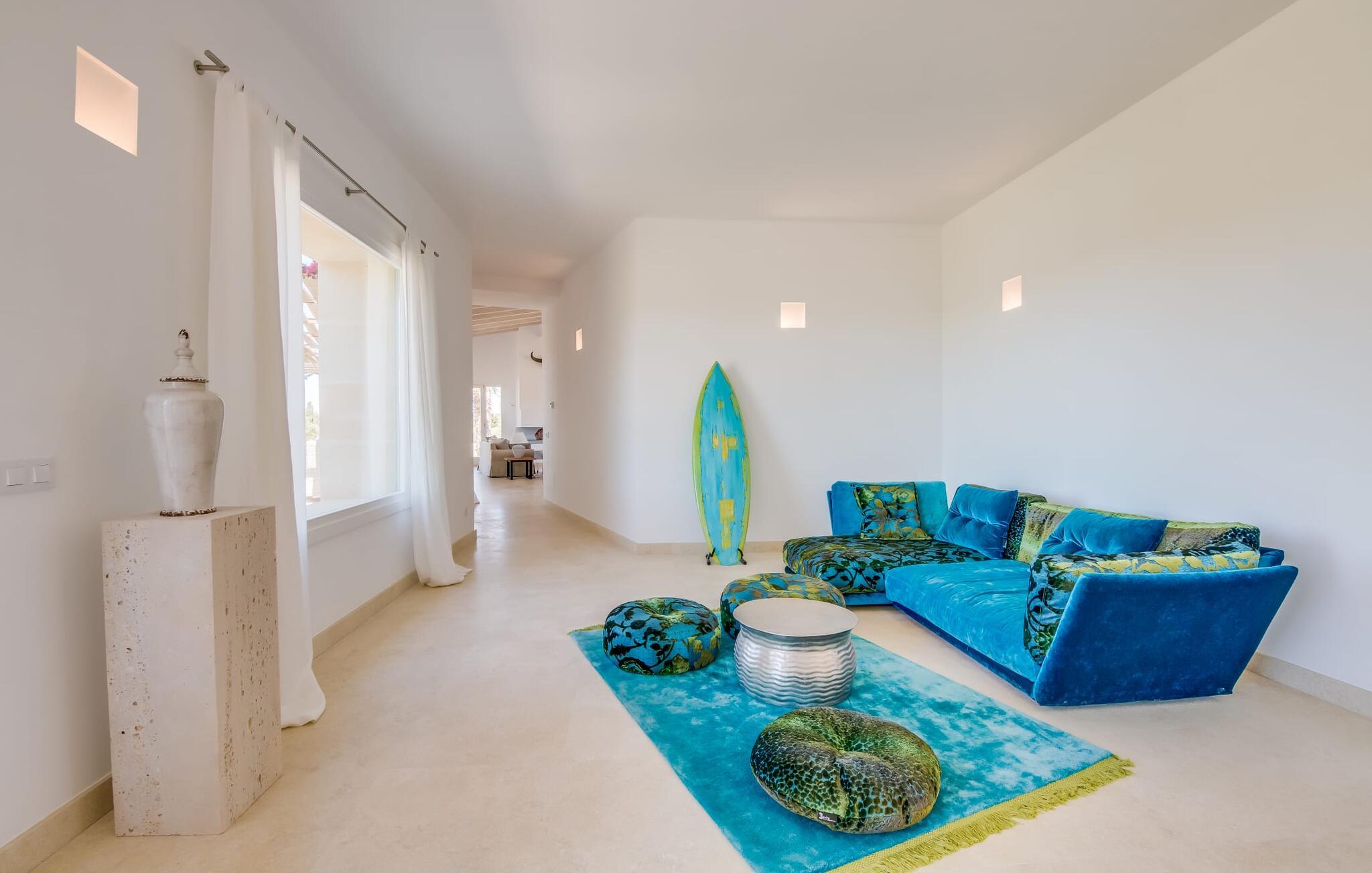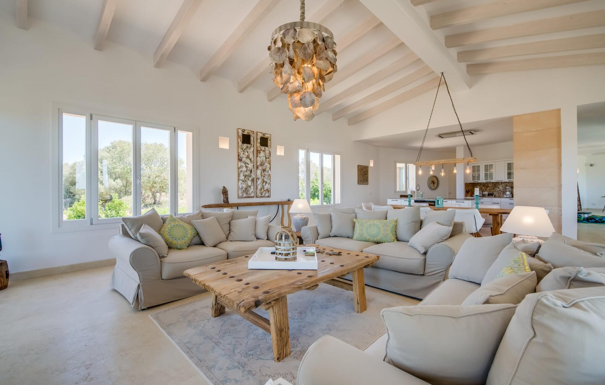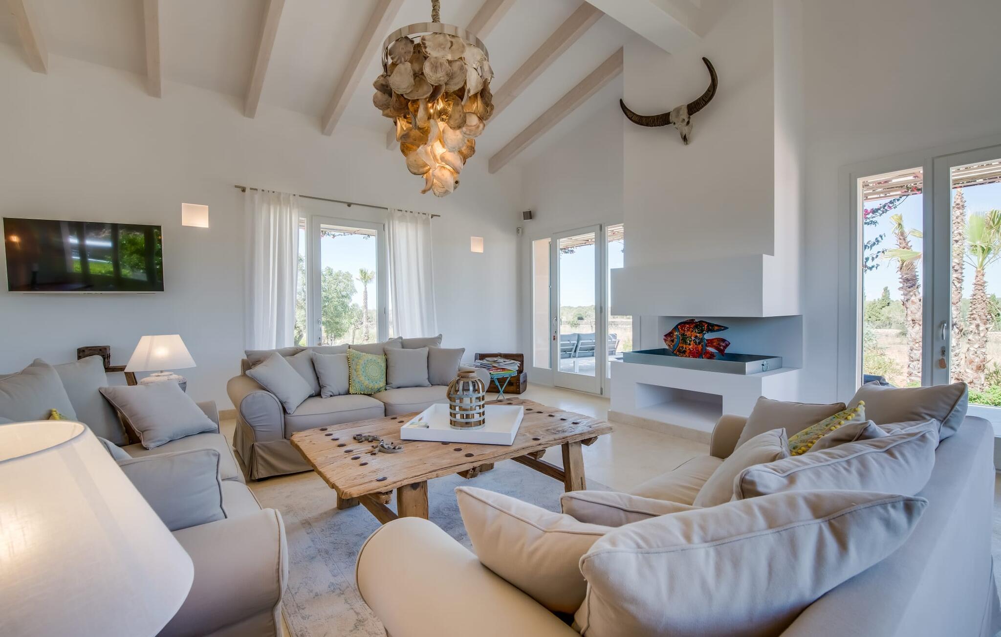"El Idilio" sætter også indvendigt fokus på lys, luft og åbenhed! Med sin stilrene og elegante indretning, unikke møbler og raffinerede detaljer fungerer fincaen både som en eksklusiv ferieoase til at udforske det sydlige Mallorca og som det perfekte sted at genoplade krop og sind eller udvikle kreative idéer i et inspirerende miljø. I stueetagen ligger tre en-suite dobbeltværelser (senge: 1,80 x 2 m) med eget tv og direkte adgang til terrassen. Loftmonterede ventilatorer sørger her ved behov for en behagelig brise, ligesom både aircondition og gulvvarme er tilgængelig i hele huset og på alle værelser. Et gæstetoilet og vaskerum findes ligeledes i stueetagen, sammen med husets centrale, todelte opholdsrum: her en maritim lounge med sofaer, dér en elegant pejsestue med en åben, professionelt udstyret køkkenø. Talrige glaspartier kan åbnes mod haven og poolen, hvilket skaber en perfekt forbindelse mellem inde- og udeliv. På førstesalen – hvor den venlige tjener i livré gerne viser jer vejen – venter endnu et en-suite dobbeltværelse (også med aircondition) og byder fra tagterrassen på en betagende udsigt over havet og øen Cabrera. For den rette stemning ved solnedgang sørger et Sonus-musikanlæg, og en tablet står til jeres rådighed til at planlægge næste udflugt.