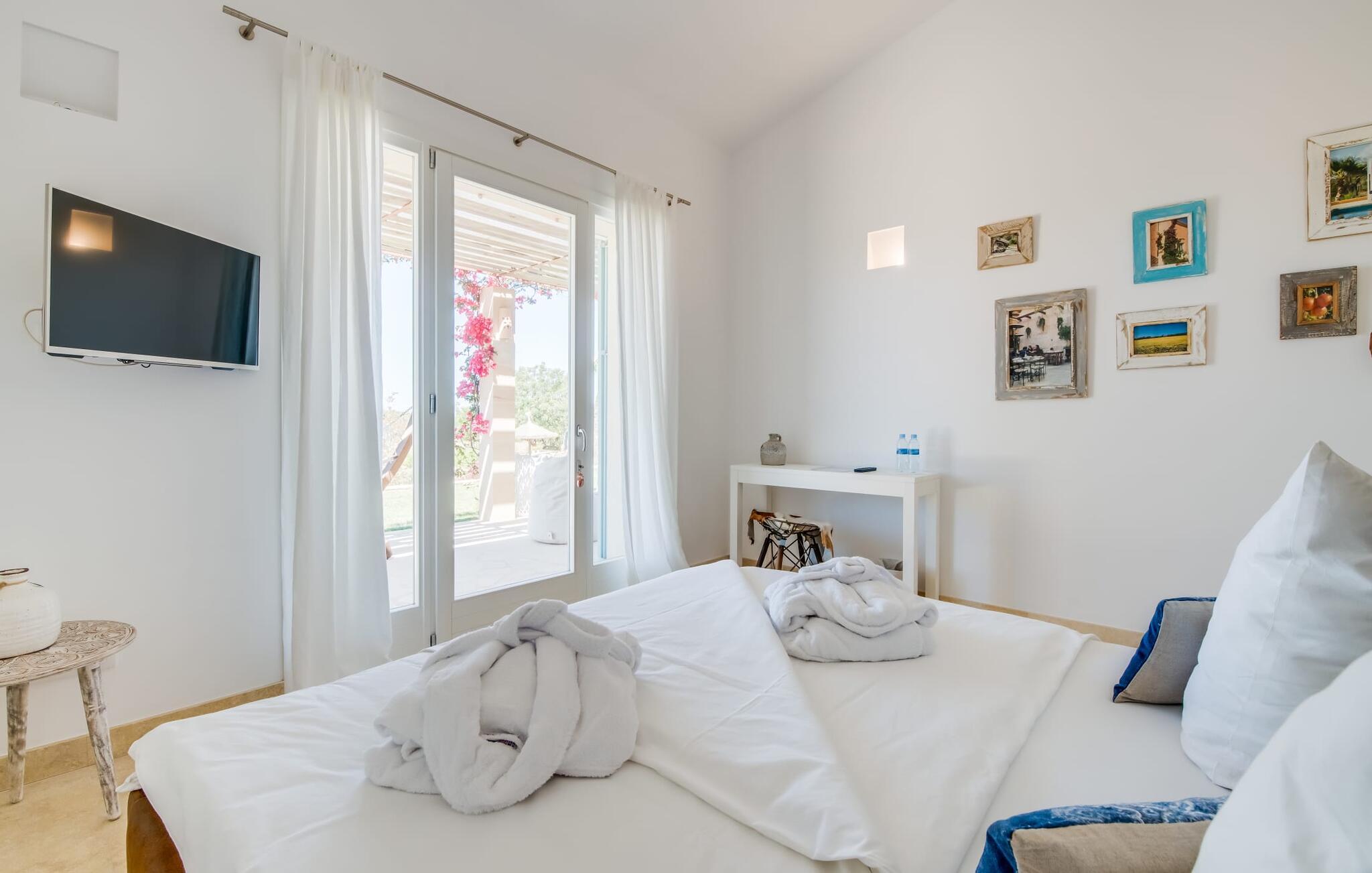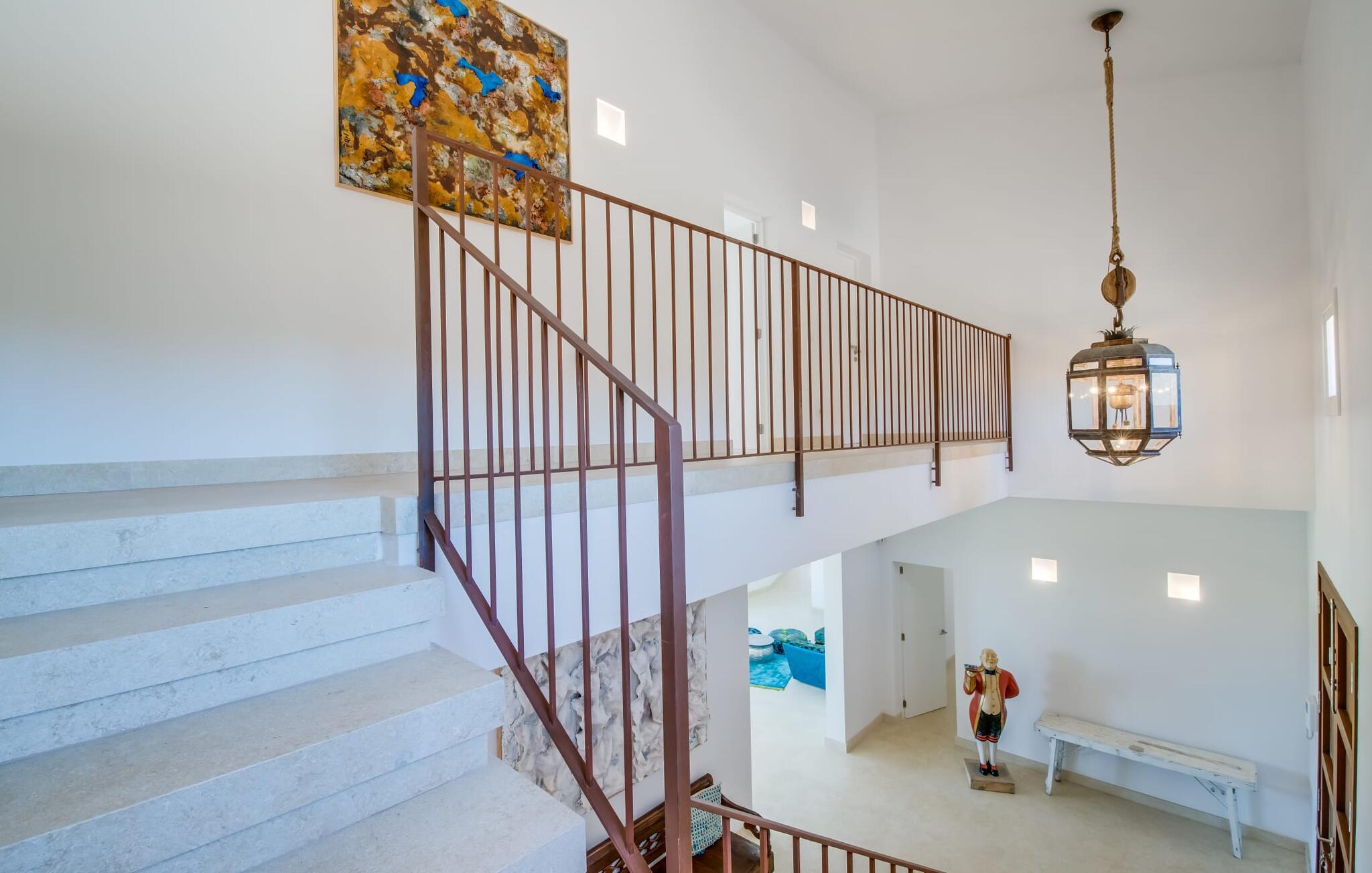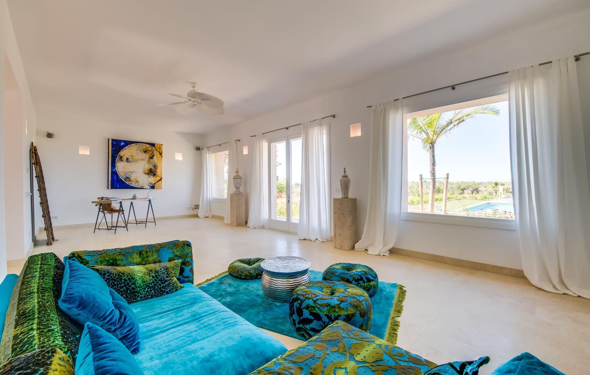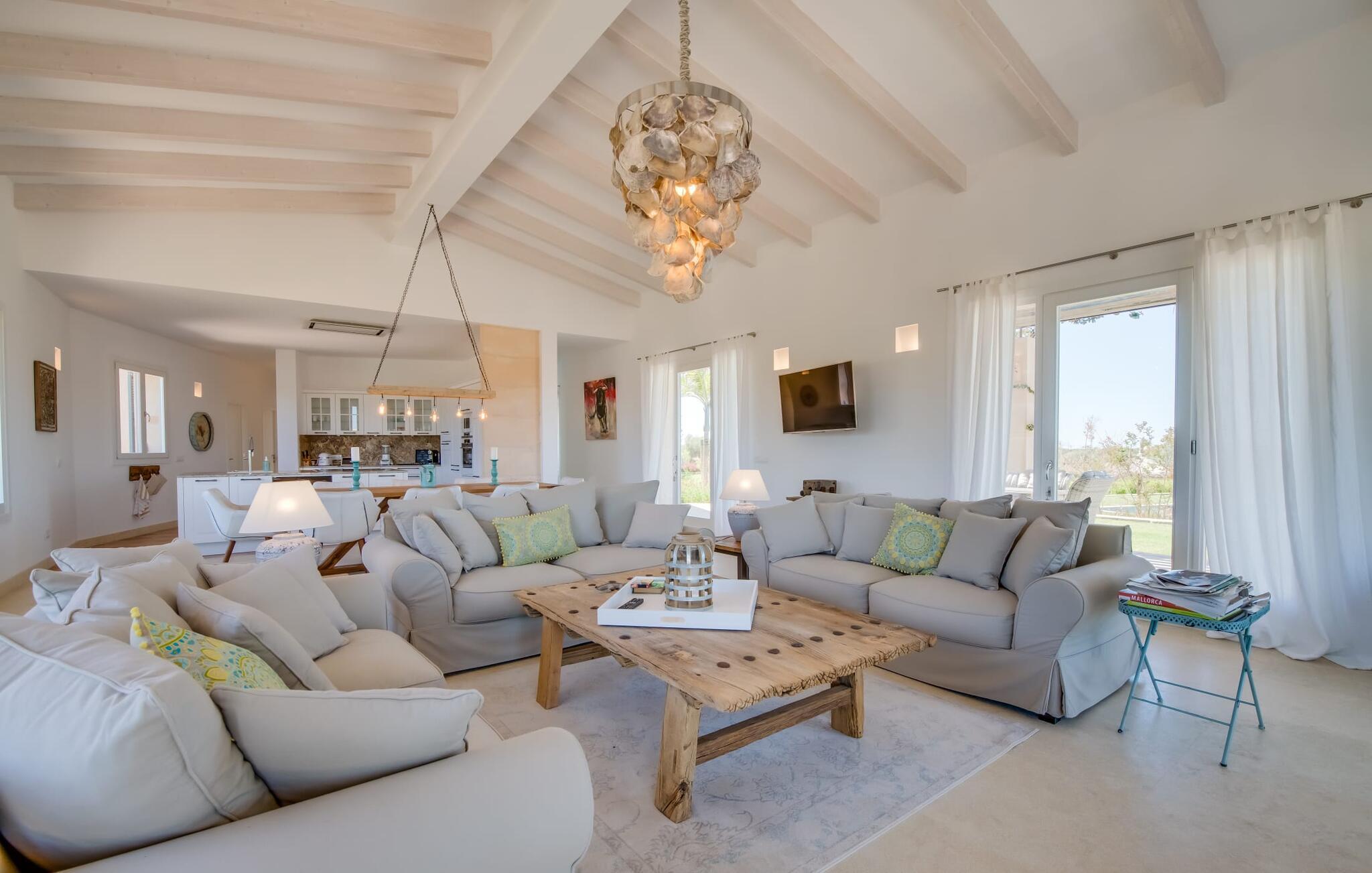 "El Idilio" sætter også indvendigt fokus på lys, luft og åbenhed! Med sin stilrene og elegante indretning, unikke møbler og raffinerede detaljer fungerer fincaen både som en eksklusiv ferieoase til at udforske det sydlige Mallorca og som det perfekte sted at genoplade krop og sind eller udvikle kreative idéer i et inspirerende miljø. I stueetagen ligger tre en-suite dobbeltværelser (senge: 1,80 x 2 m) med eget tv og direkte adgang til terrassen. Loftmonterede ventilatorer sørger her ved behov for en behagelig brise, ligesom både aircondition og gulvvarme er tilgængelig i hele huset og på alle værelser. Et gæstetoilet og vaskerum findes ligeledes i stueetagen, sammen med husets centrale, todelte opholdsrum: her en maritim lounge med sofaer, dér en elegant pejsestue med en åben, professionelt udstyret køkkenø. Talrige glaspartier kan åbnes mod haven og poolen, hvilket skaber en perfekt forbindelse mellem inde- og udeliv. På førstesalen – hvor den venlige tjener i livré gerne viser jer vejen – venter endnu et en-suite dobbeltværelse (også med aircondition) og byder fra tagterrassen på en betagende udsigt over havet og øen Cabrera. For den rette stemning ved solnedgang sørger et Sonus-musikanlæg, og en tablet står til jeres rådighed til at planlægge næste udflugt.