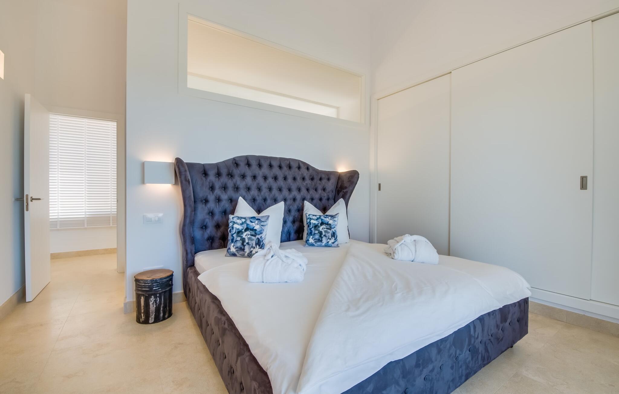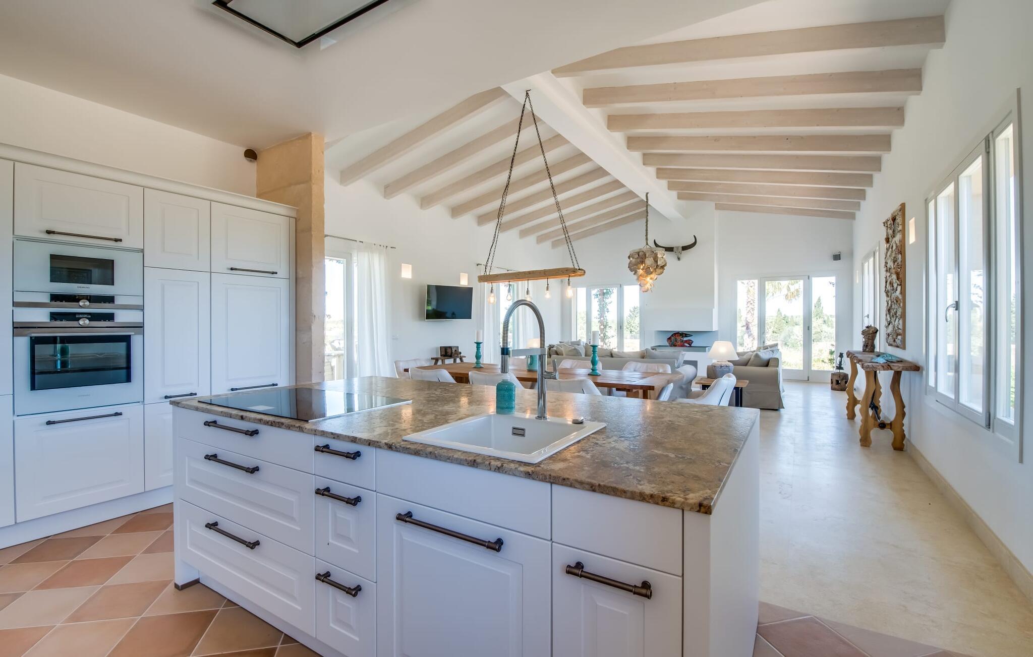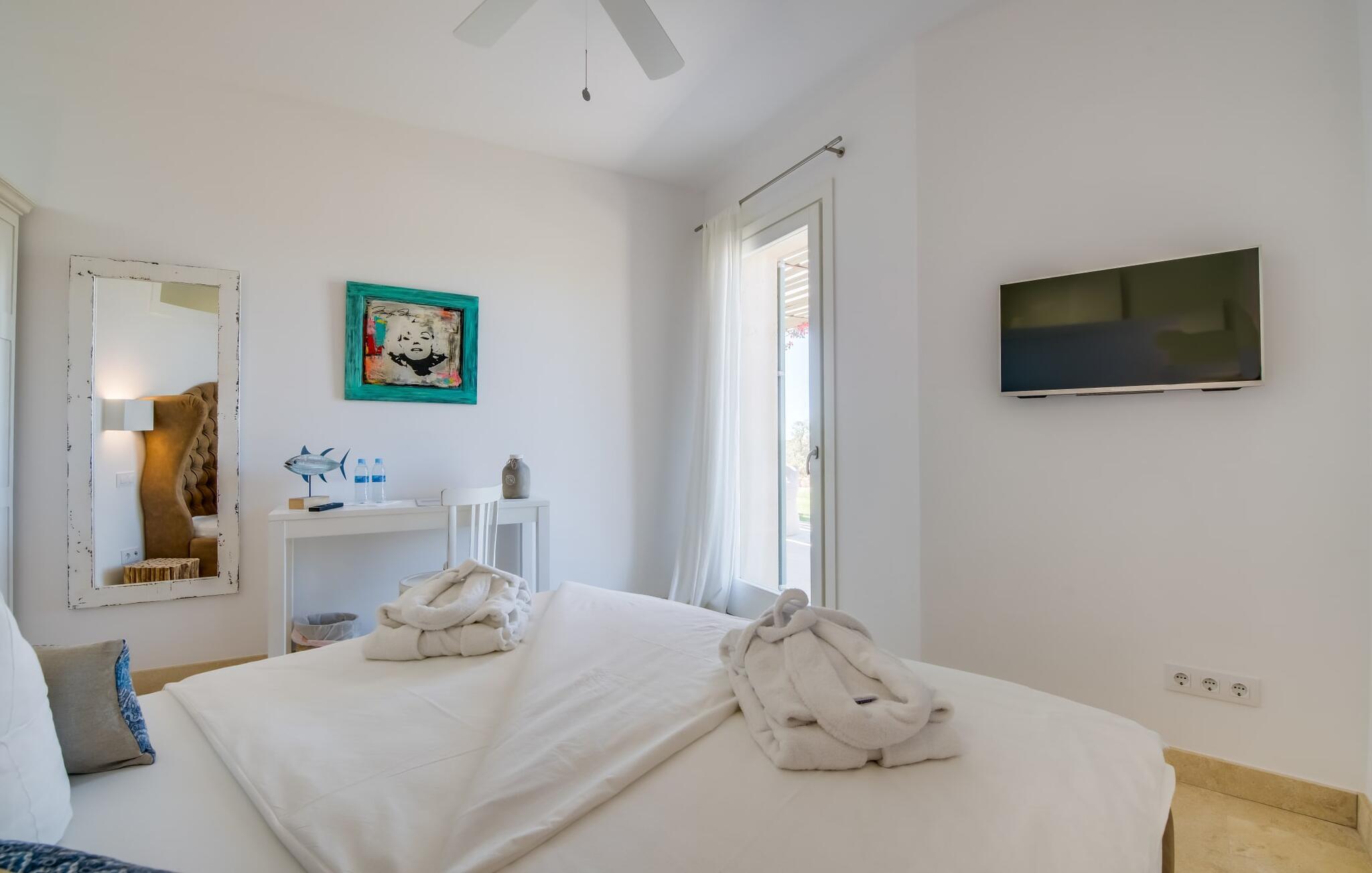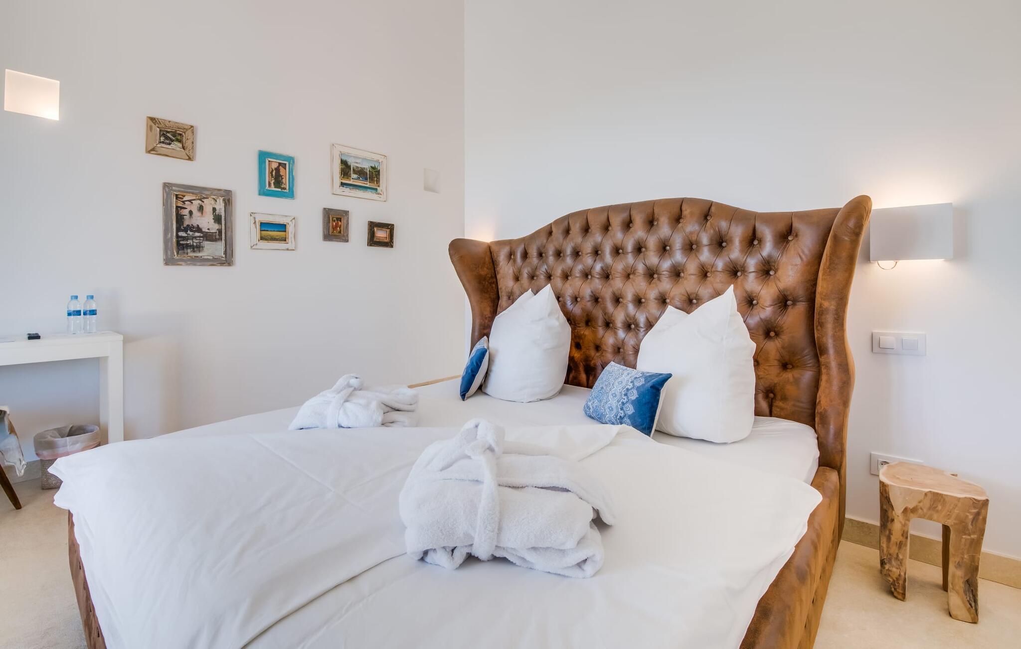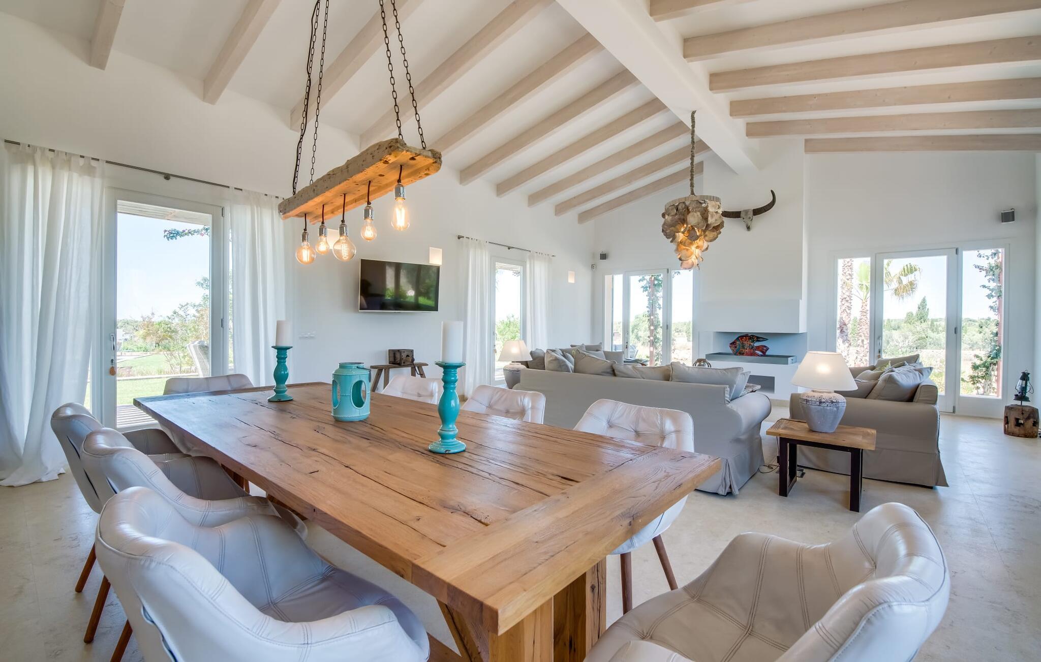 "El Idilio" sætter også indvendigt fokus på lys, luft og åbenhed! Med sin stilrene og elegante indretning, unikke møbler og raffinerede detaljer fungerer fincaen både som en eksklusiv ferieoase til at udforske det sydlige Mallorca og som det perfekte sted at genoplade krop og sind eller udvikle kreative idéer i et inspirerende miljø. I stueetagen ligger tre en-suite dobbeltværelser (senge: 1,80 x 2 m) med eget tv og direkte adgang til terrassen. Loftmonterede ventilatorer sørger her ved behov for en behagelig brise, ligesom både aircondition og gulvvarme er tilgængelig i hele huset og på alle værelser. Et gæstetoilet og vaskerum findes ligeledes i stueetagen, sammen med husets centrale, todelte opholdsrum: her en maritim lounge med sofaer, dér en elegant pejsestue med en åben, professionelt udstyret køkkenø. Talrige glaspartier kan åbnes mod haven og poolen, hvilket skaber en perfekt forbindelse mellem inde- og udeliv. På førstesalen – hvor den venlige tjener i livré gerne viser jer vejen – venter endnu et en-suite dobbeltværelse (også med aircondition) og byder fra tagterrassen på en betagende udsigt over havet og øen Cabrera. For den rette stemning ved solnedgang sørger et Sonus-musikanlæg, og en tablet står til jeres rådighed til at planlægge næste udflugt.