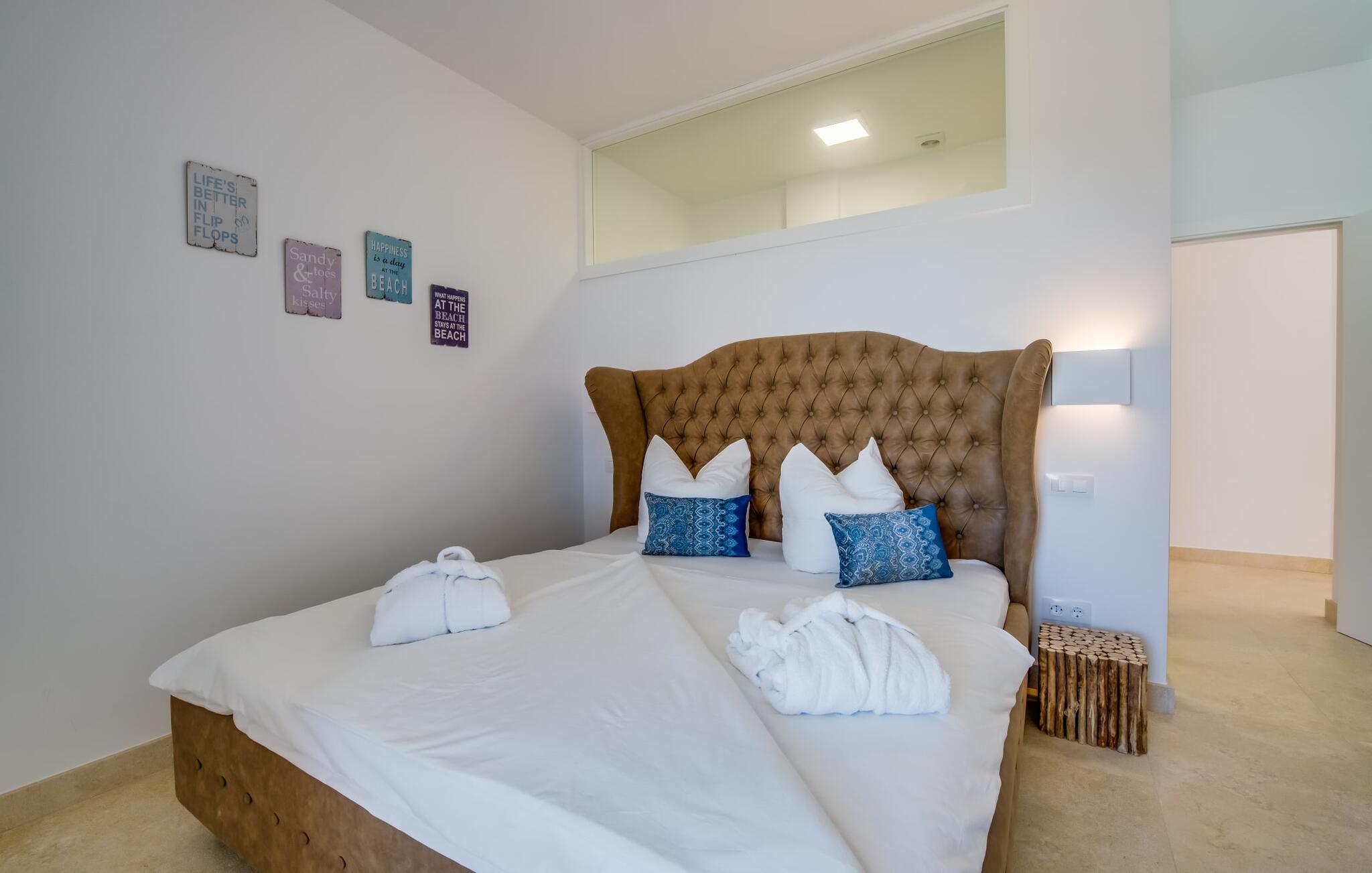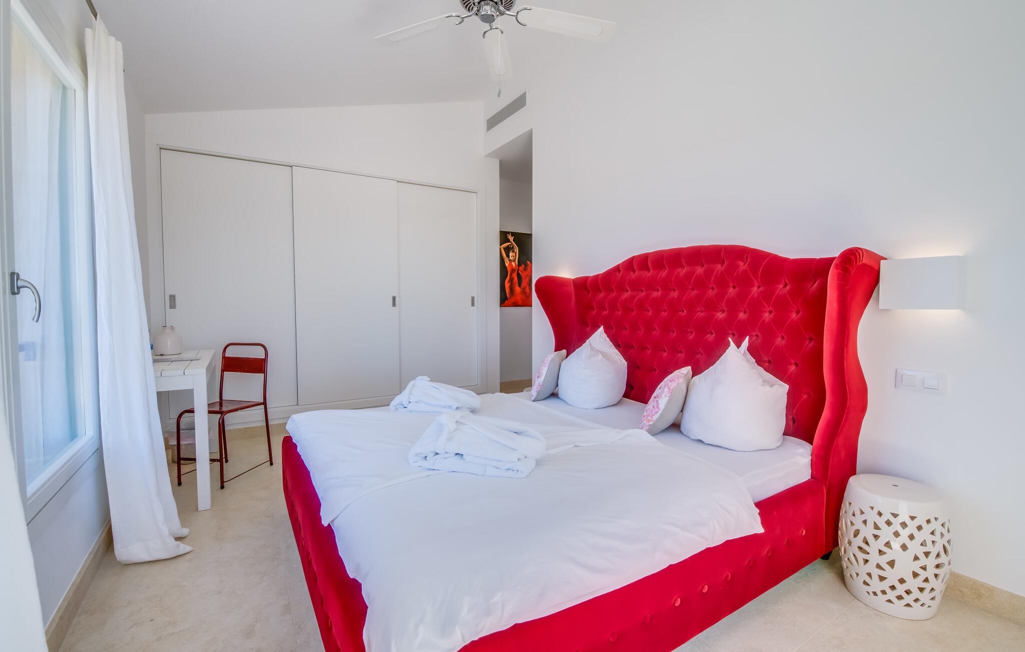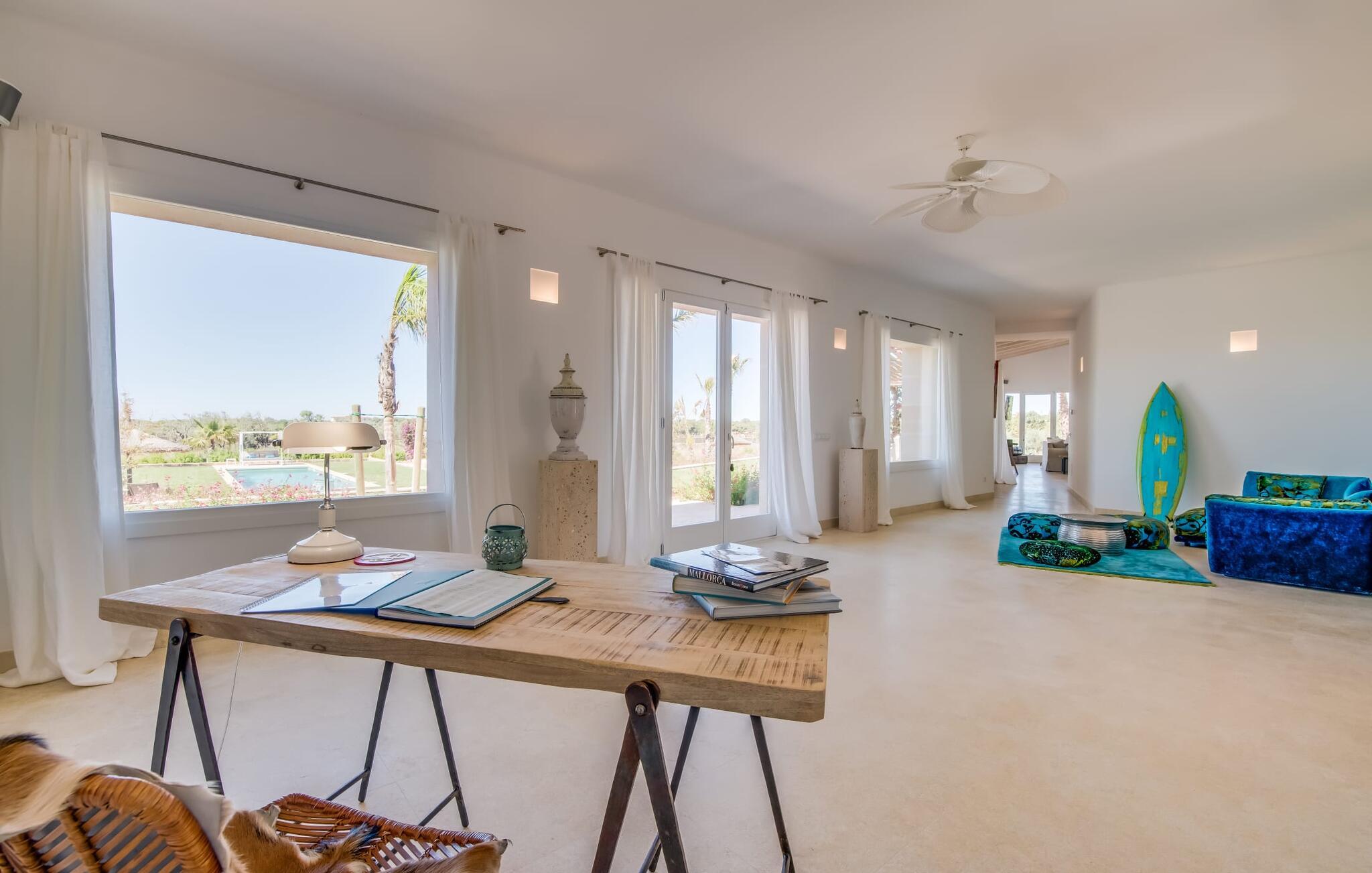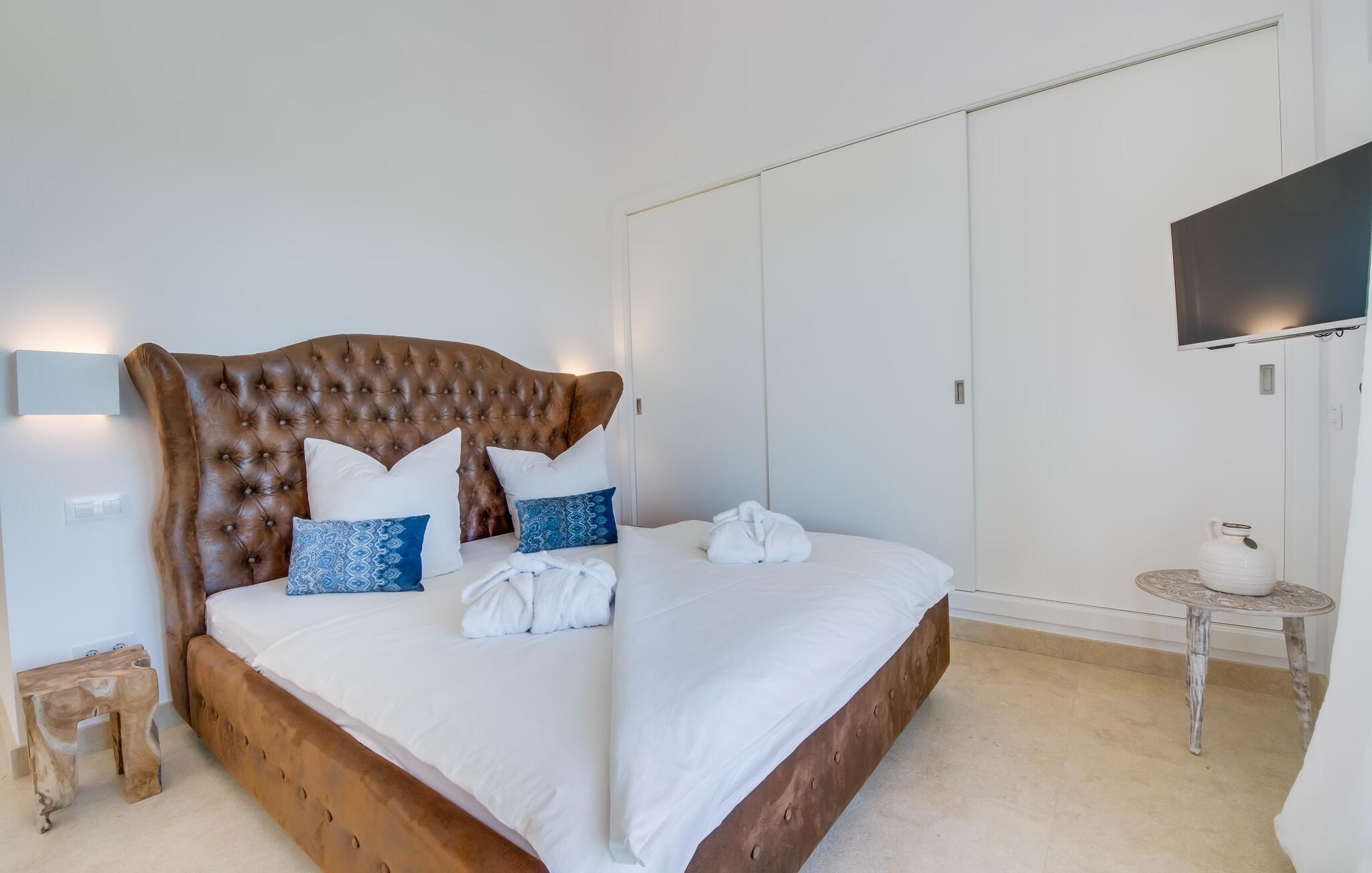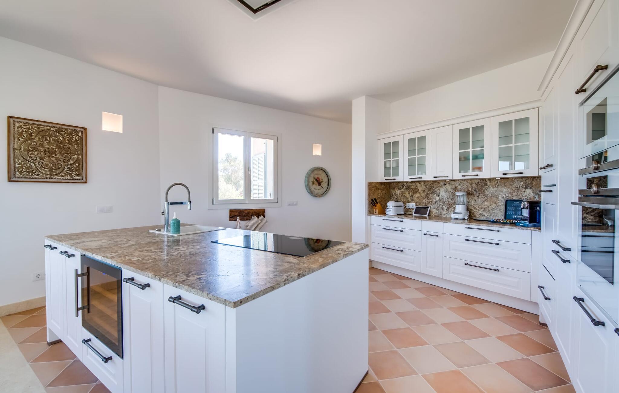 "El Idilio" sætter også indvendigt fokus på lys, luft og åbenhed! Med sin stilrene og elegante indretning, unikke møbler og raffinerede detaljer fungerer fincaen både som en eksklusiv ferieoase til at udforske det sydlige Mallorca og som det perfekte sted at genoplade krop og sind eller udvikle kreative idéer i et inspirerende miljø. I stueetagen ligger tre en-suite dobbeltværelser (senge: 1,80 x 2 m) med eget tv og direkte adgang til terrassen. Loftmonterede ventilatorer sørger her ved behov for en behagelig brise, ligesom både aircondition og gulvvarme er tilgængelig i hele huset og på alle værelser. Et gæstetoilet og vaskerum findes ligeledes i stueetagen, sammen med husets centrale, todelte opholdsrum: her en maritim lounge med sofaer, dér en elegant pejsestue med en åben, professionelt udstyret køkkenø. Talrige glaspartier kan åbnes mod haven og poolen, hvilket skaber en perfekt forbindelse mellem inde- og udeliv. På førstesalen – hvor den venlige tjener i livré gerne viser jer vejen – venter endnu et en-suite dobbeltværelse (også med aircondition) og byder fra tagterrassen på en betagende udsigt over havet og øen Cabrera. For den rette stemning ved solnedgang sørger et Sonus-musikanlæg, og en tablet står til jeres rådighed til at planlægge næste udflugt.