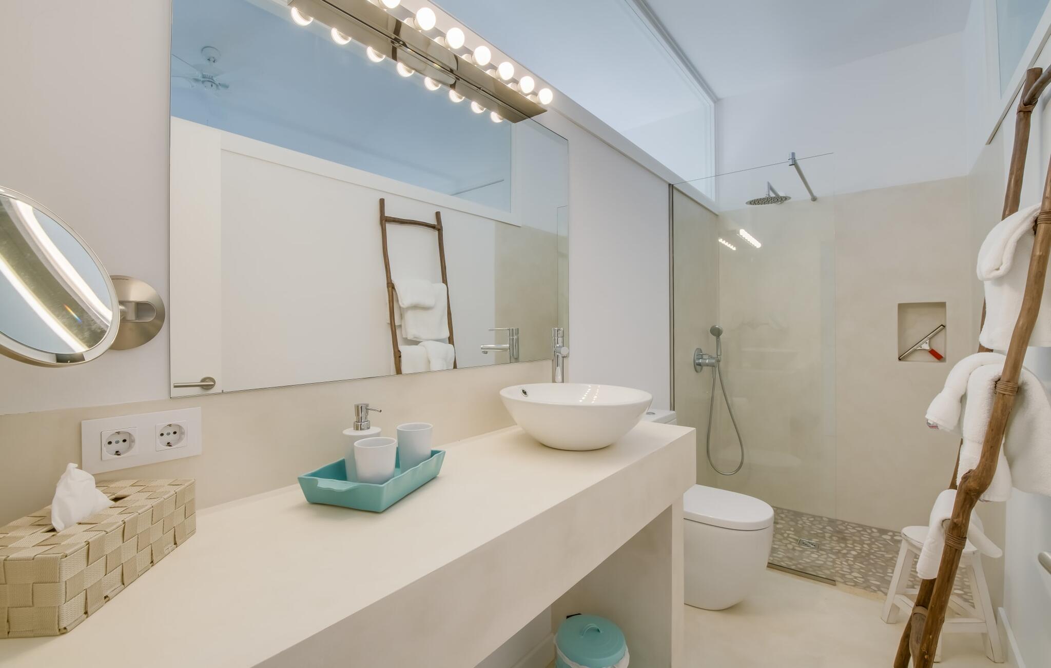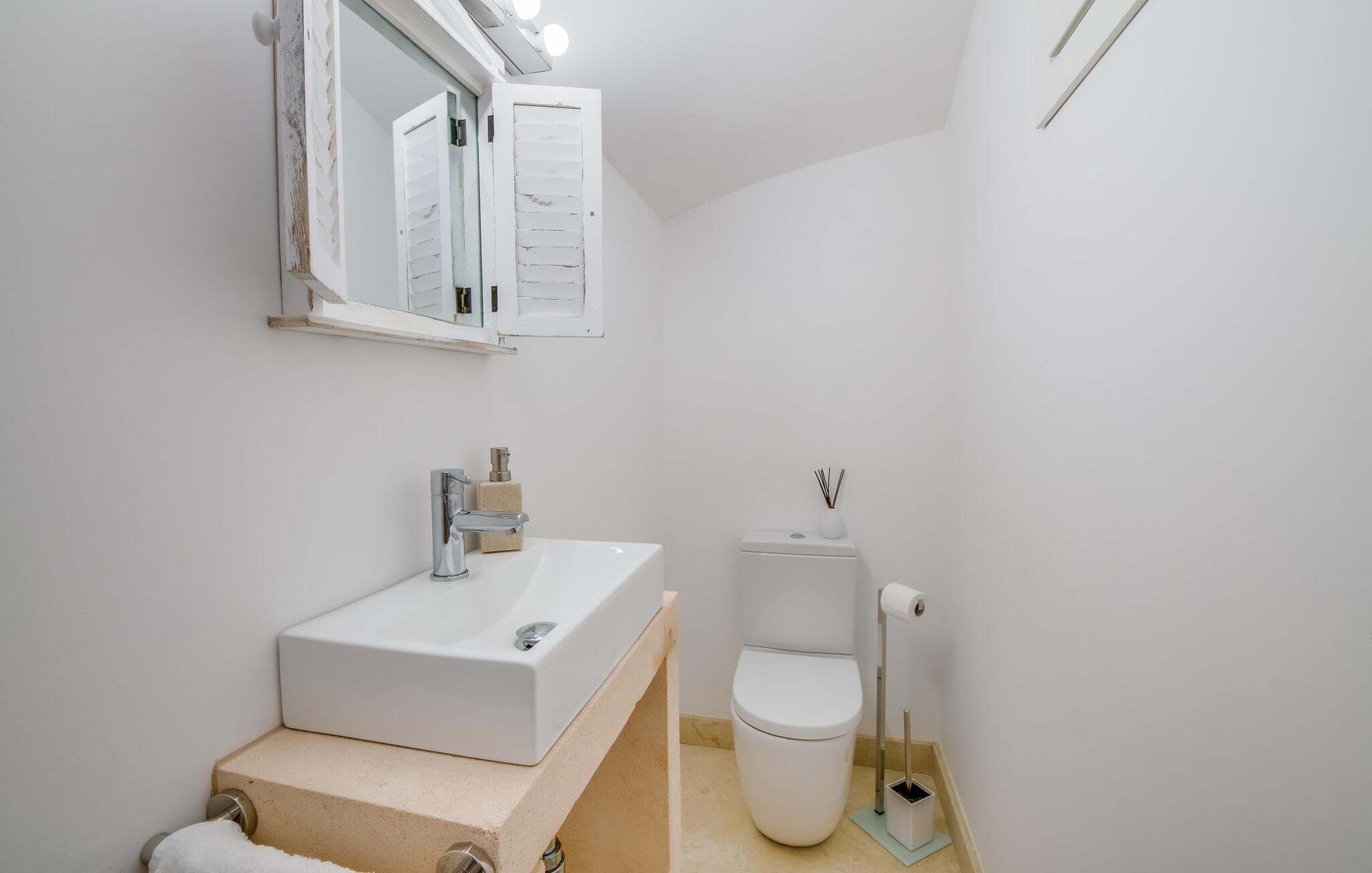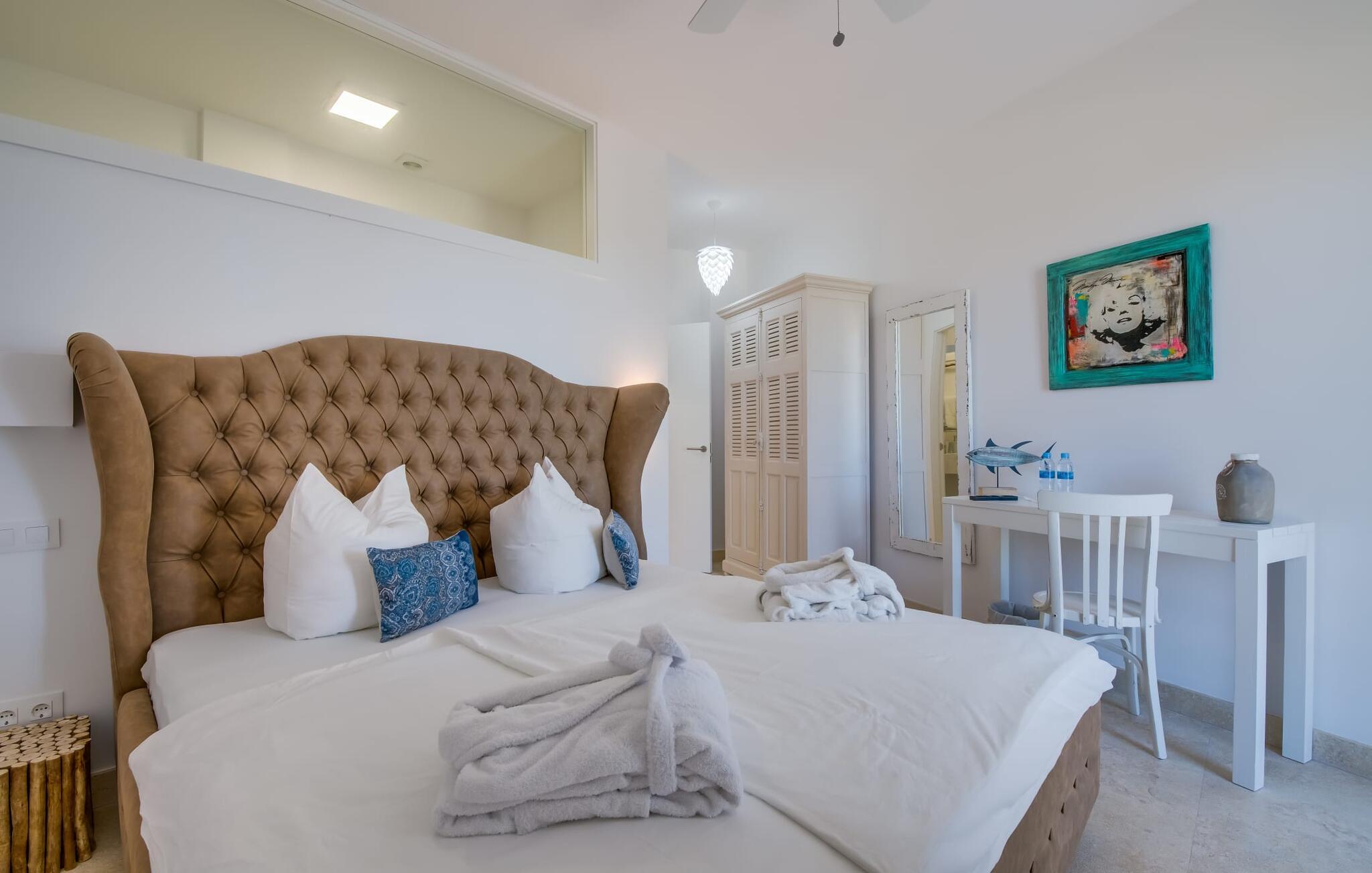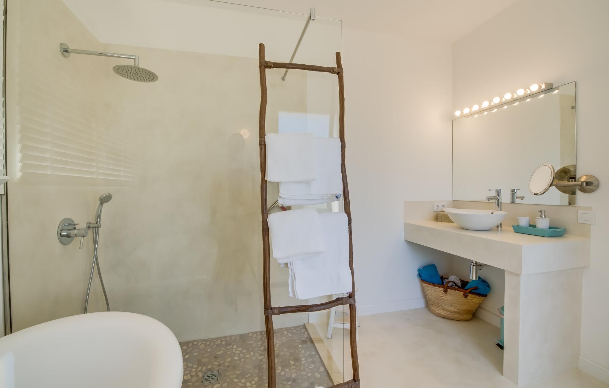 "El Idilio" sætter også indvendigt fokus på lys, luft og åbenhed! Med sin stilrene og elegante indretning, unikke møbler og raffinerede detaljer fungerer fincaen både som en eksklusiv ferieoase til at udforske det sydlige Mallorca og som det perfekte sted at genoplade krop og sind eller udvikle kreative idéer i et inspirerende miljø. I stueetagen ligger tre en-suite dobbeltværelser (senge: 1,80 x 2 m) med eget tv og direkte adgang til terrassen. Loftmonterede ventilatorer sørger her ved behov for en behagelig brise, ligesom både aircondition og gulvvarme er tilgængelig i hele huset og på alle værelser. Et gæstetoilet og vaskerum findes ligeledes i stueetagen, sammen med husets centrale, todelte opholdsrum: her en maritim lounge med sofaer, dér en elegant pejsestue med en åben, professionelt udstyret køkkenø. Talrige glaspartier kan åbnes mod haven og poolen, hvilket skaber en perfekt forbindelse mellem inde- og udeliv. På førstesalen – hvor den venlige tjener i livré gerne viser jer vejen – venter endnu et en-suite dobbeltværelse (også med aircondition) og byder fra tagterrassen på en betagende udsigt over havet og øen Cabrera. For den rette stemning ved solnedgang sørger et Sonus-musikanlæg, og en tablet står til jeres rådighed til at planlægge næste udflugt.