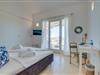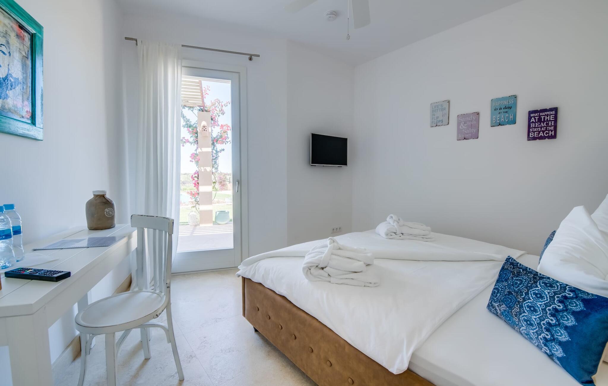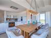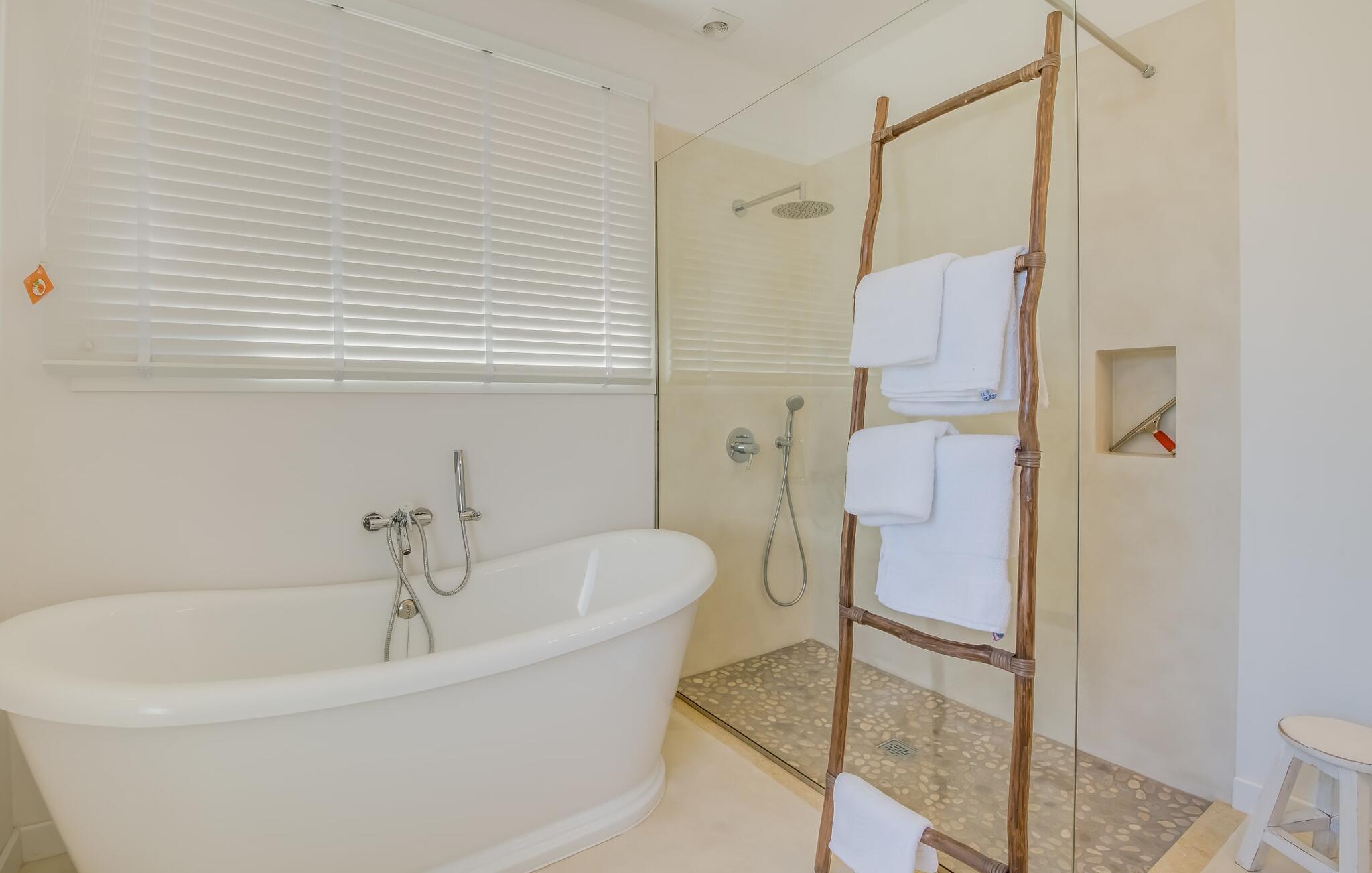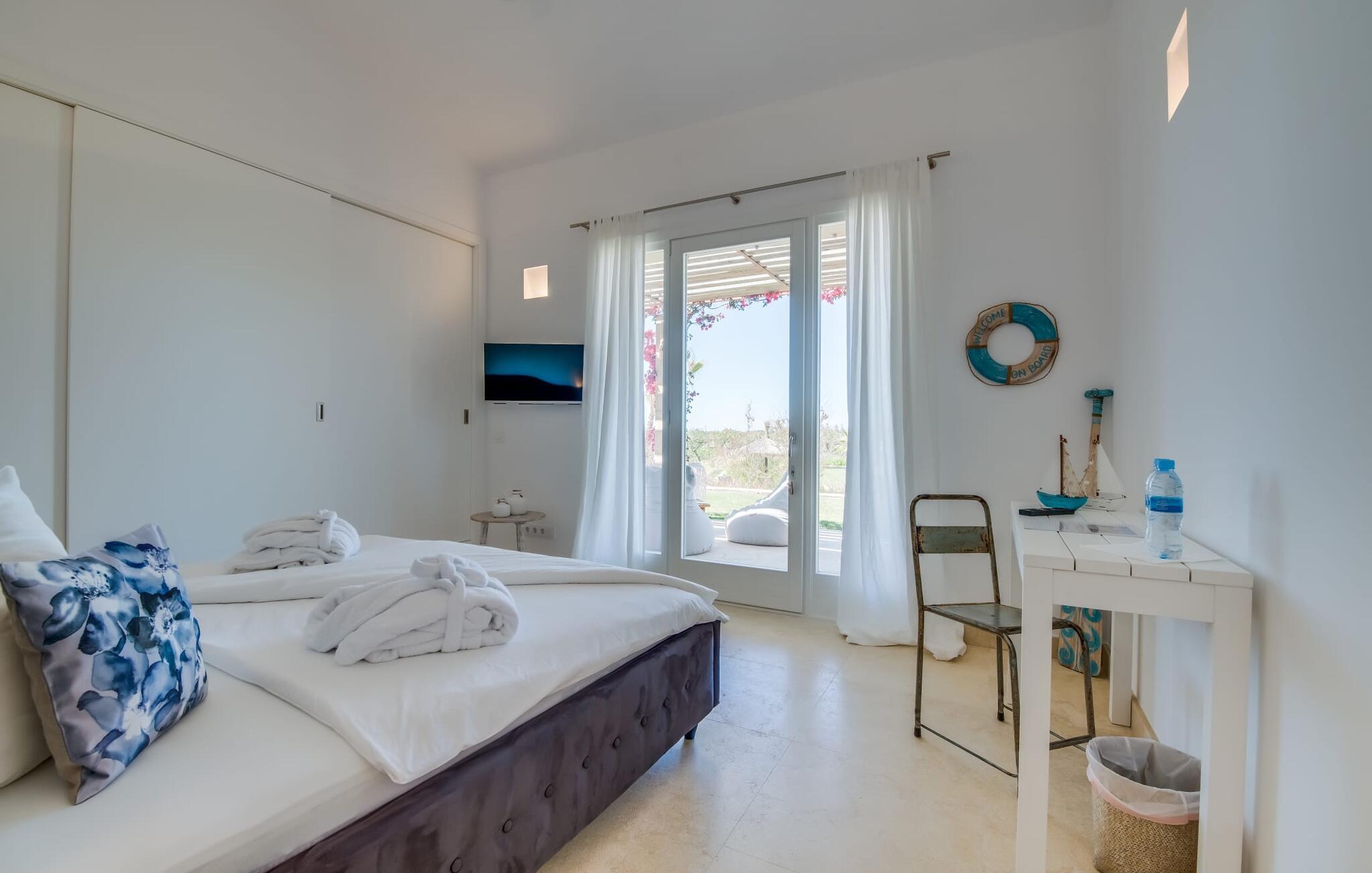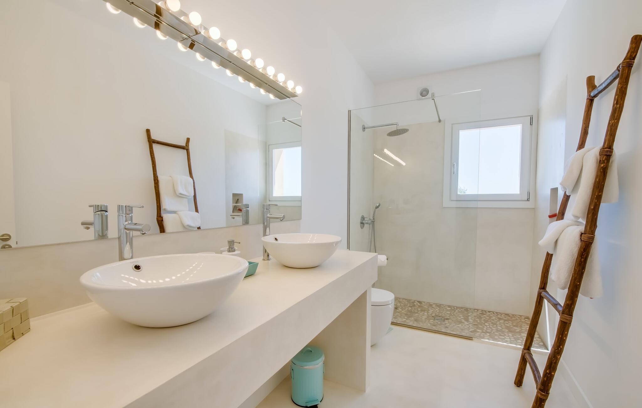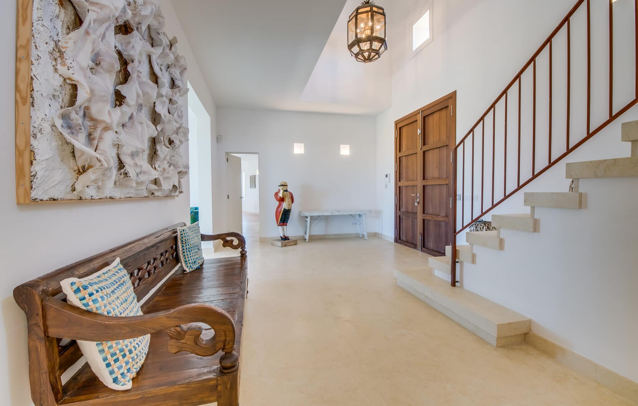 "El Idilio" sætter også indvendigt fokus på lys, luft og åbenhed! Med sin stilrene og elegante indretning, unikke møbler og raffinerede detaljer fungerer fincaen både som en eksklusiv ferieoase til at udforske det sydlige Mallorca og som det perfekte sted at genoplade krop og sind eller udvikle kreative idéer i et inspirerende miljø. I stueetagen ligger tre en-suite dobbeltværelser (senge: 1,80 x 2 m) med eget tv og direkte adgang til terrassen. Loftmonterede ventilatorer sørger her ved behov for en behagelig brise, ligesom både aircondition og gulvvarme er tilgængelig i hele huset og på alle værelser. Et gæstetoilet og vaskerum findes ligeledes i stueetagen, sammen med husets centrale, todelte opholdsrum: her en maritim lounge med sofaer, dér en elegant pejsestue med en åben, professionelt udstyret køkkenø. Talrige glaspartier kan åbnes mod haven og poolen, hvilket skaber en perfekt forbindelse mellem inde- og udeliv. På førstesalen – hvor den venlige tjener i livré gerne viser jer vejen – venter endnu et en-suite dobbeltværelse (også med aircondition) og byder fra tagterrassen på en betagende udsigt over havet og øen Cabrera. For den rette stemning ved solnedgang sørger et Sonus-musikanlæg, og en tablet står til jeres rådighed til at planlægge næste udflugt.