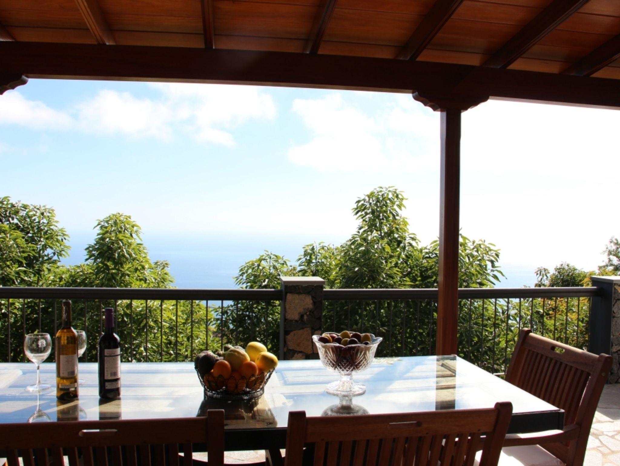 Highlight ist die große überdachte Terasse mit einem langgezogenen Holztisch mit Glasplatte - ein schöner Ort zum Beisammensein und um den Blick auf die Westküste bis zum Meer zu genießen.