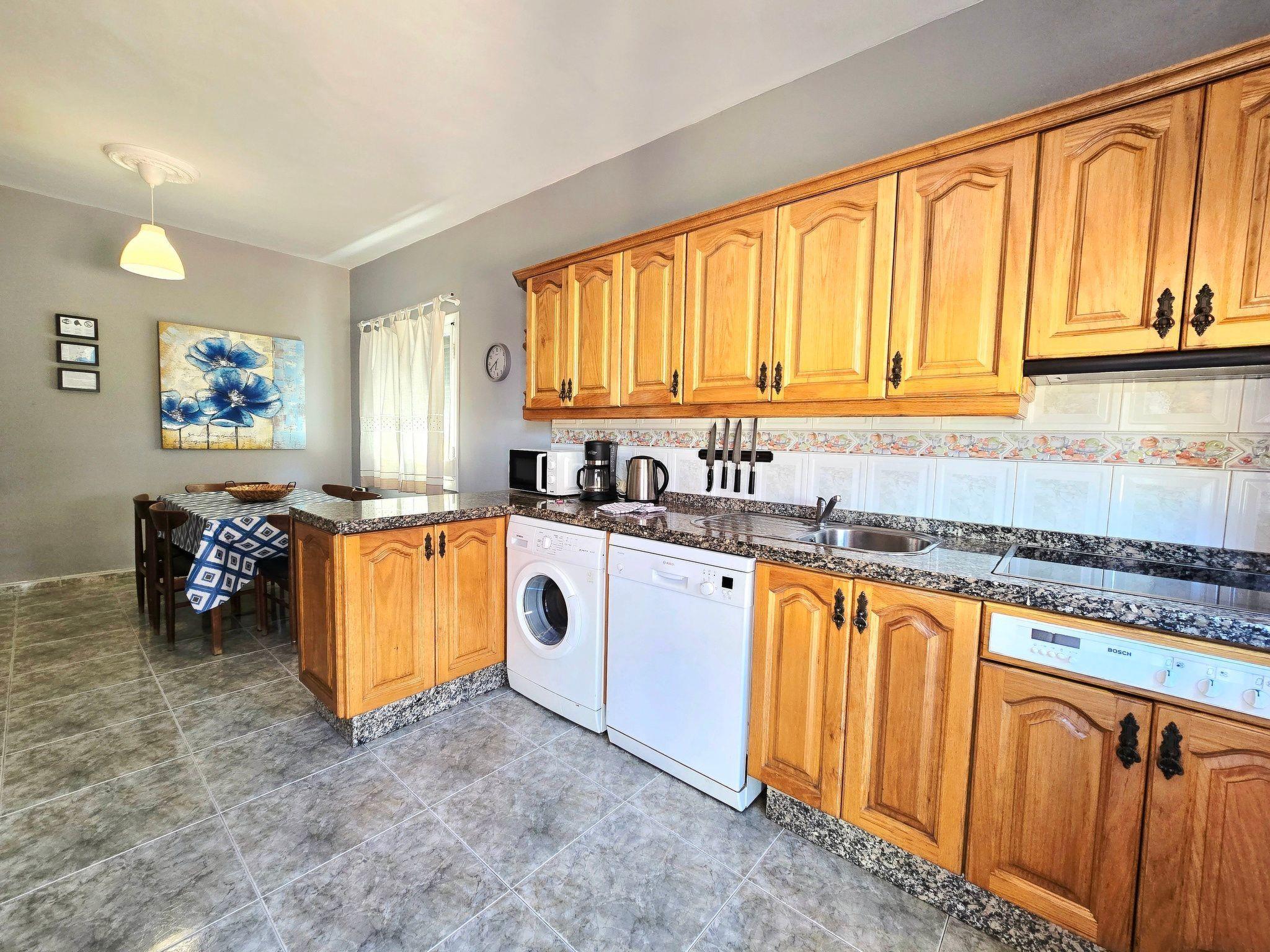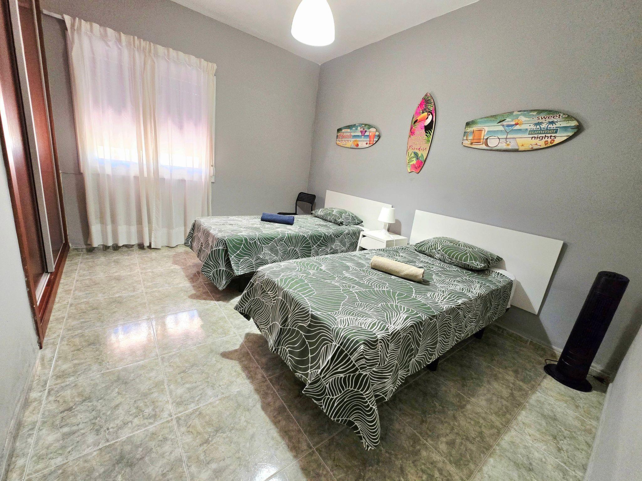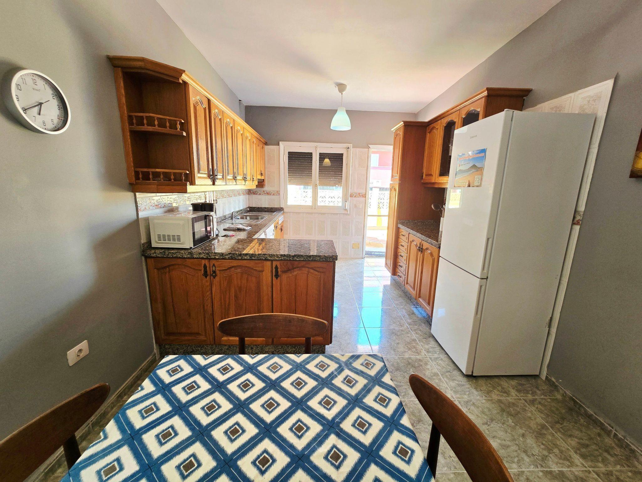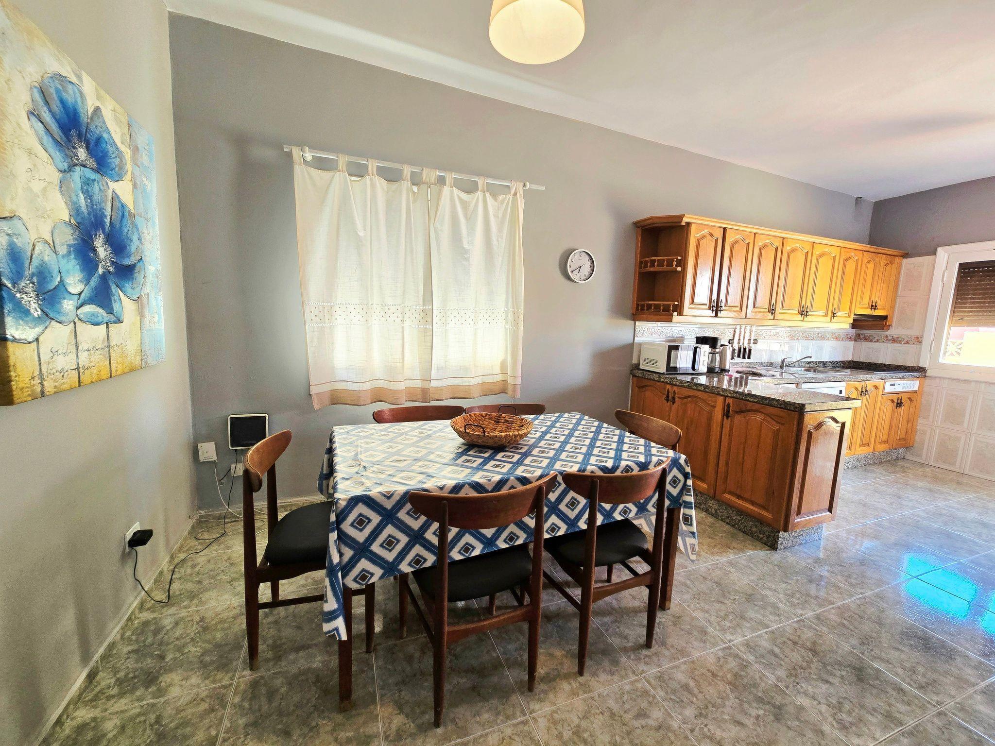 It has a spacious living room with sea views, TV and free Wi-Fi, a large dining room and a fully equipped kitchen with microwave, dishwasher, washing machine, fridge and all the necessary utensils for a comfortable stay. The bathroom has a shower, and the 70 m² terrace offers an ideal space to relax, equipped with a pergola, table, chairs and four sun loungers, from where you can enjoy spectacular views of the entire beach of El Médano, located literally just 2 metres away.