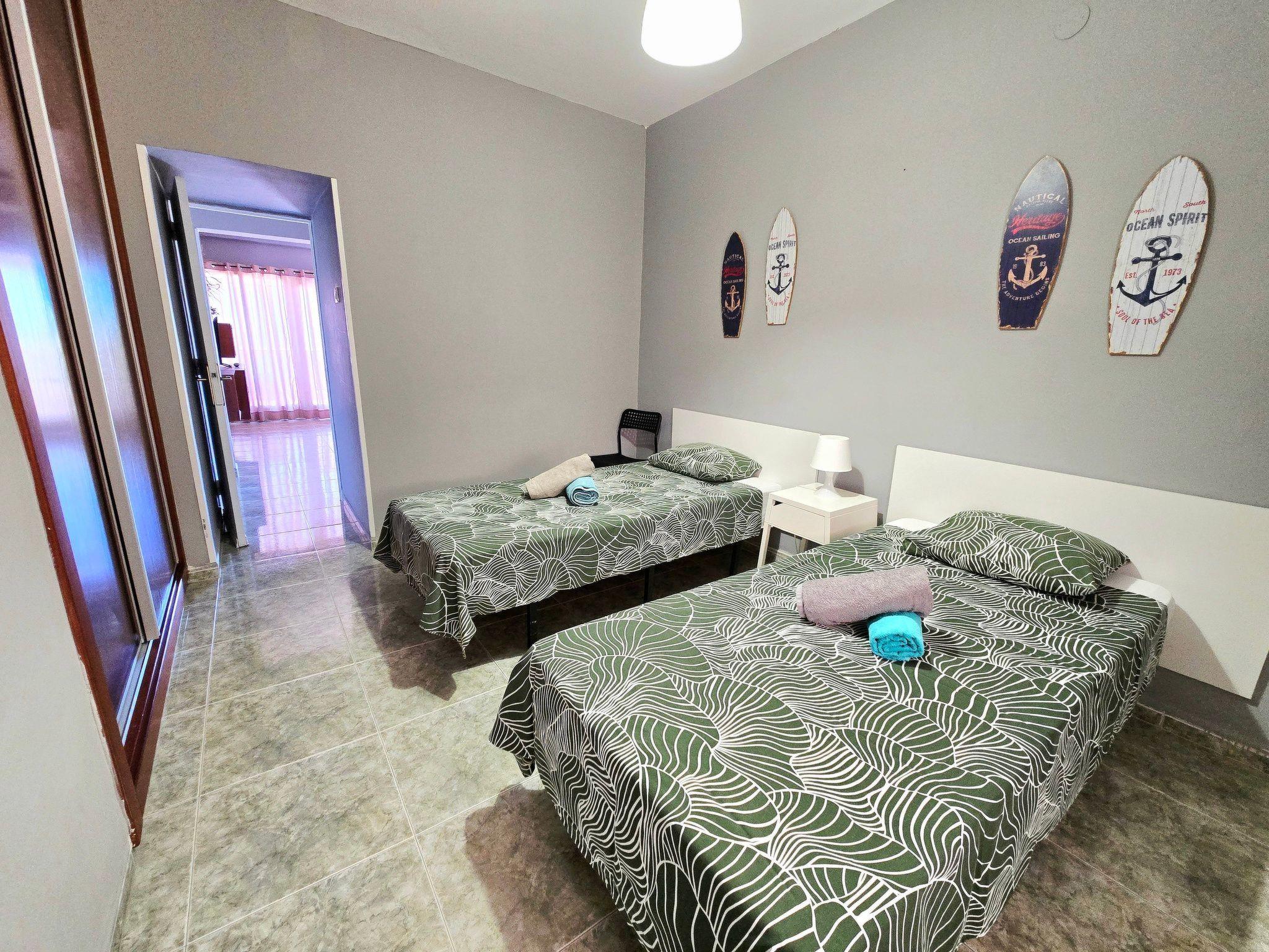 Two bedrooms with two single beds each.