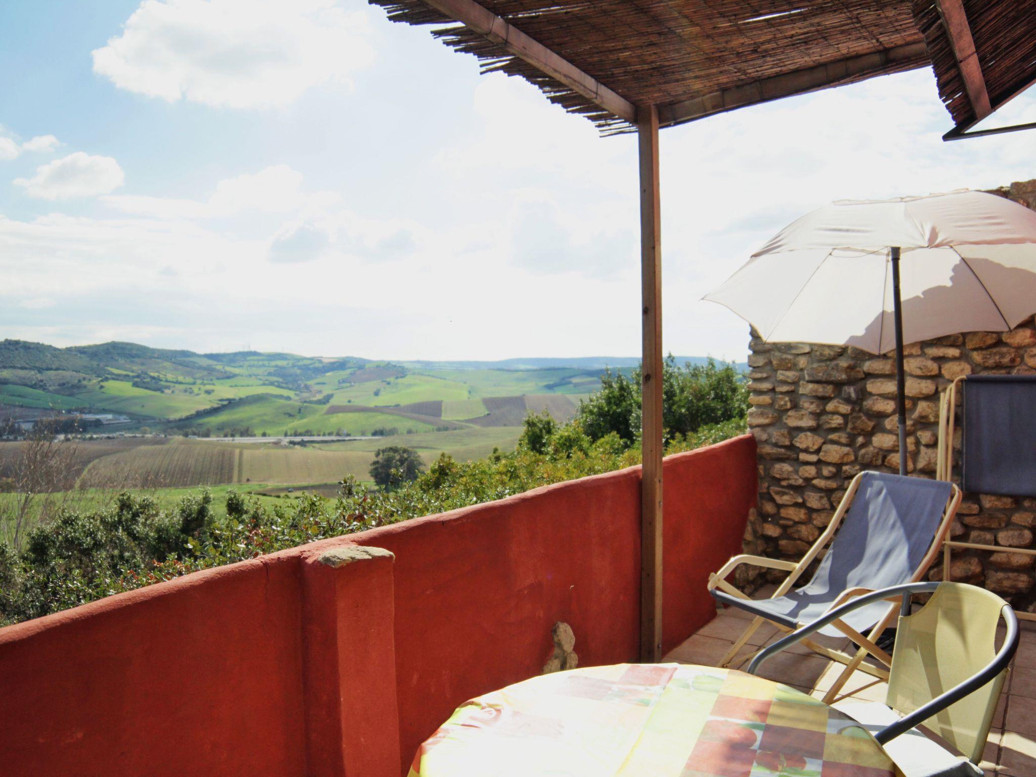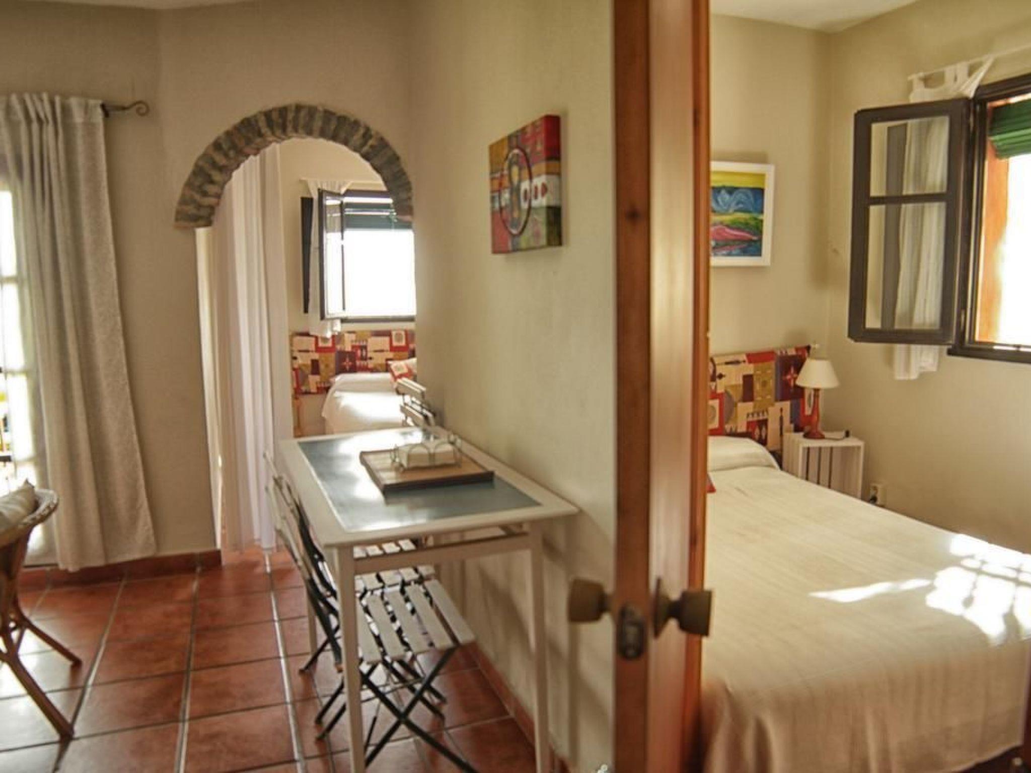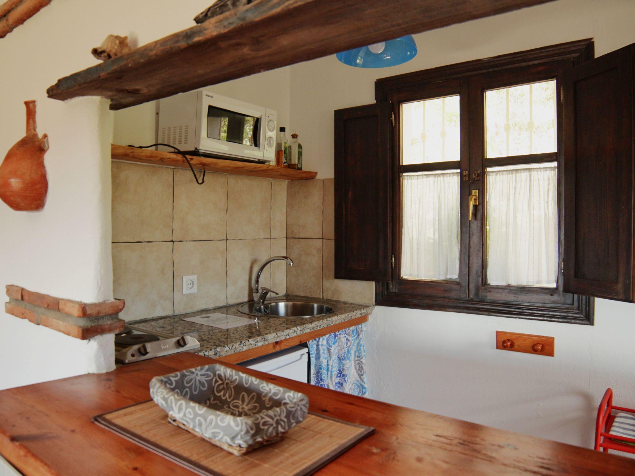 Double room with sitting area, TV, satellite, music, heating or fan. Two beds with natural latex mattresses and pure cotton sheets. Kitchenette with two-ring electric hob, toaster, blender, fridge and cooking utensils. Bathroom with shower, toilet and washbasin. Terrace with table, armchairs, sun loungers and barbecue.