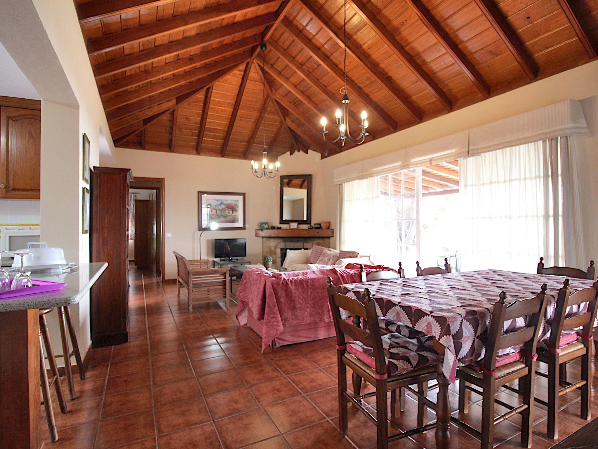 Im großzügigen Wohnraum mit kanarischem Holzgiebeldach befindet sich ein Kamin. 2 Sofas laden zu einem gemütlichen Abend vor dem Fernseher oder am Kamin ein. Auch eine kleine Leseecke wurde eingerichtet.