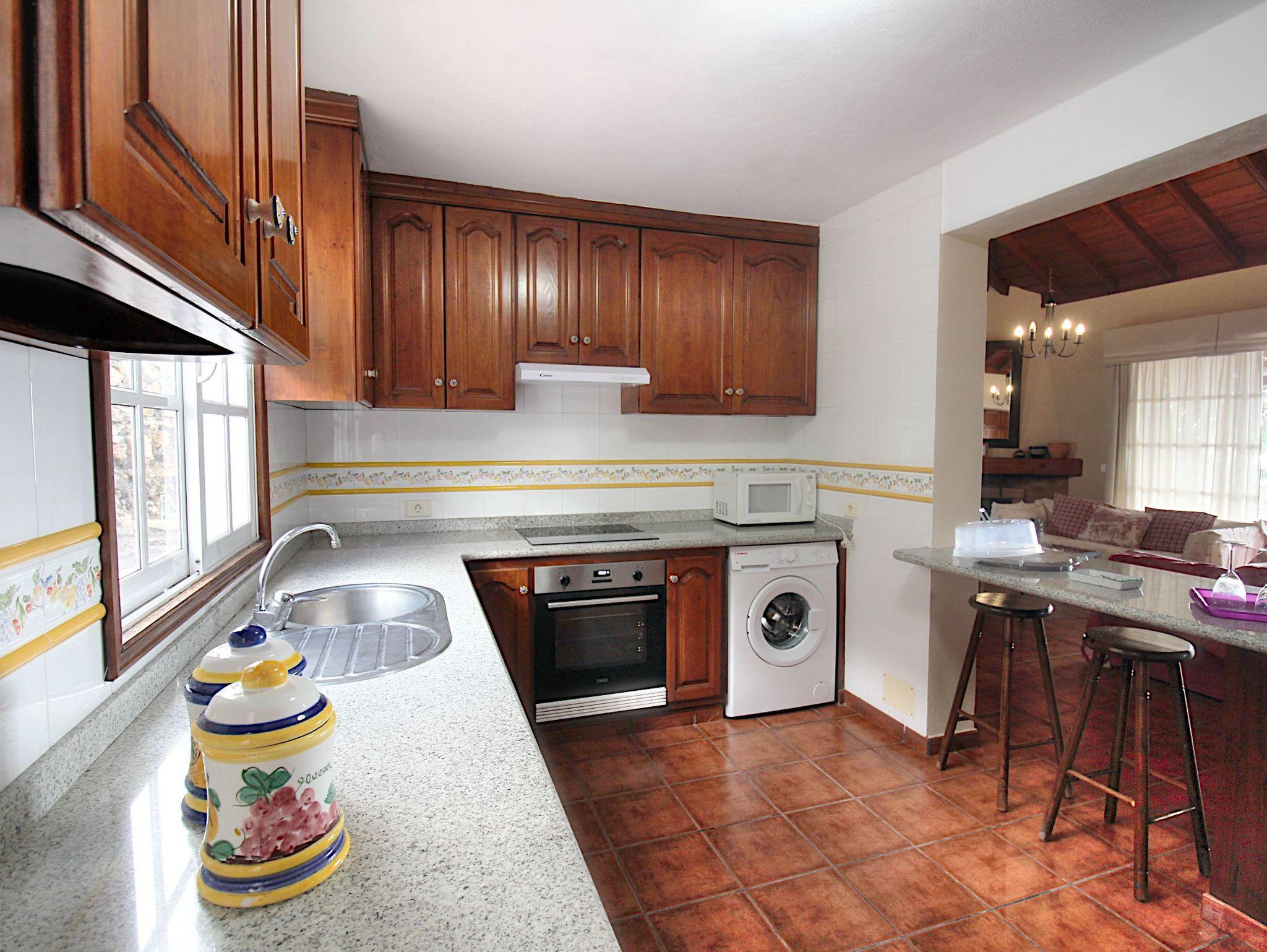 Die Küche schließt direkt an den Wohnbereich an. Von der Küche gelangt man durch eine Tür zur hinteren Terasse, wo sich auch eine Grillmöglichkeit befindet.