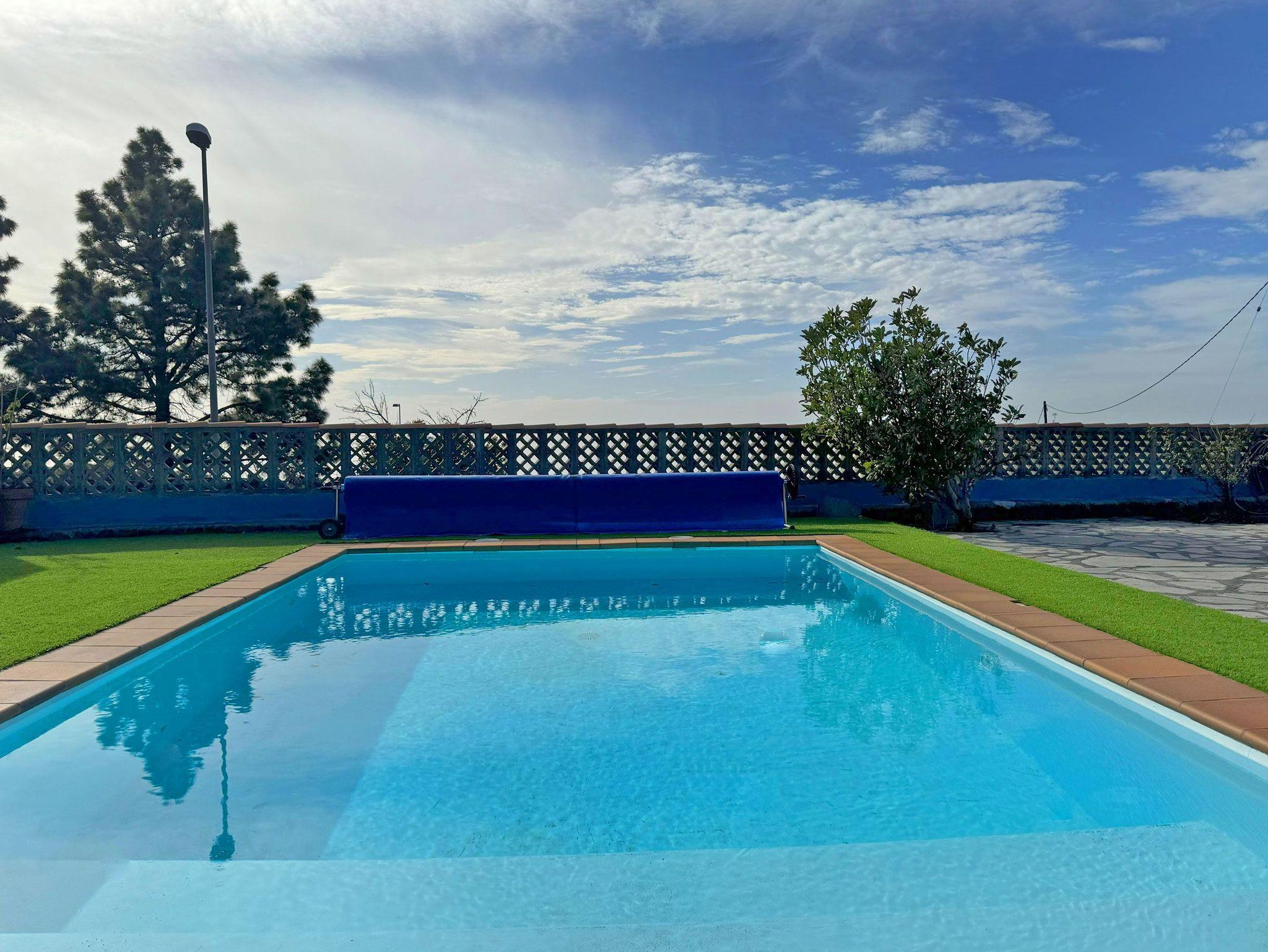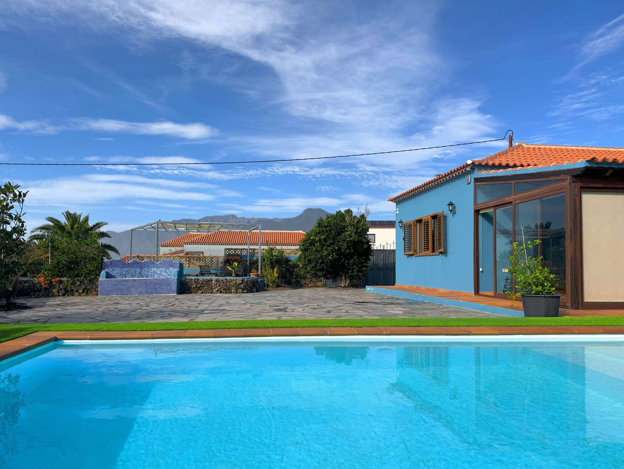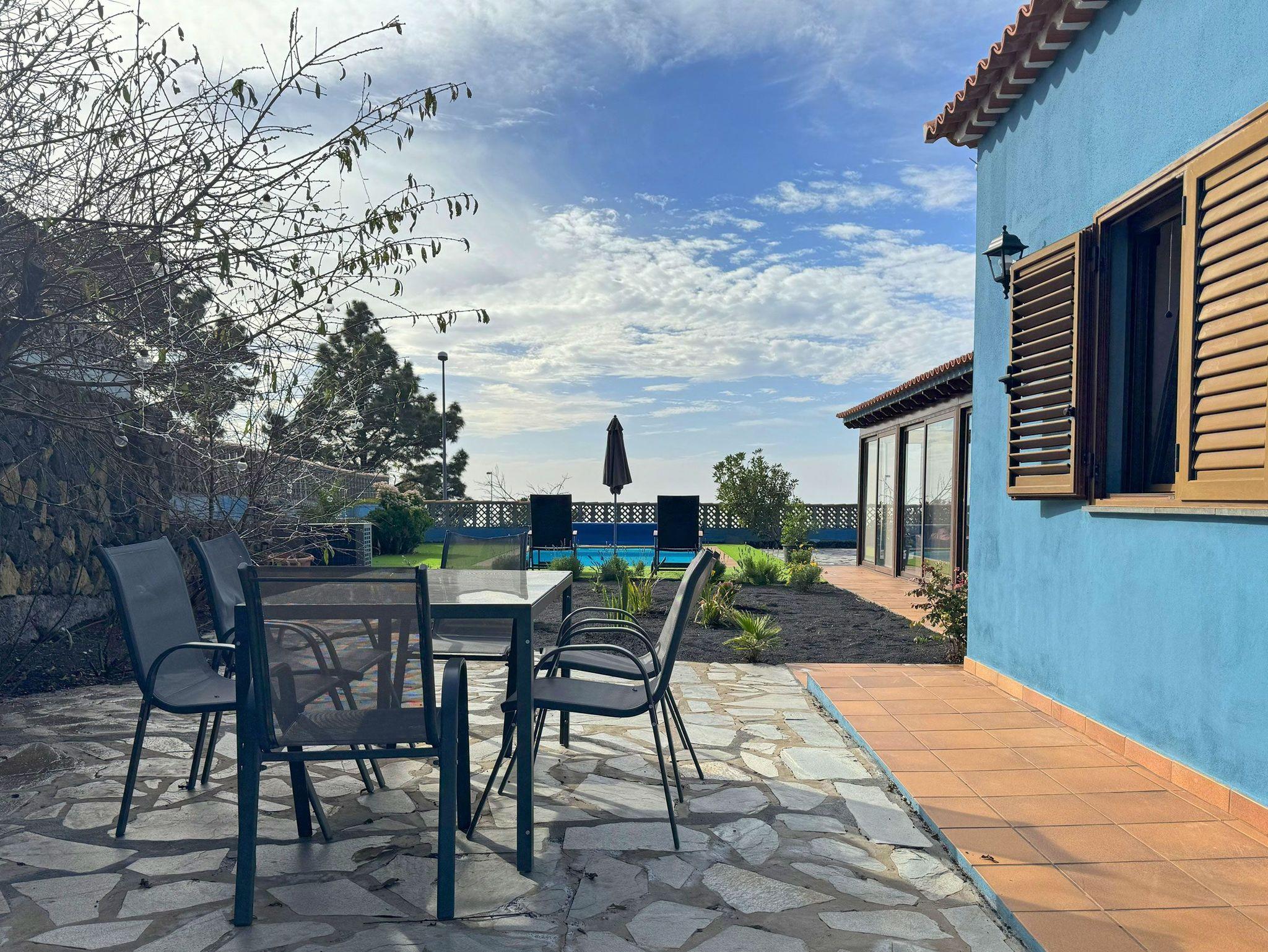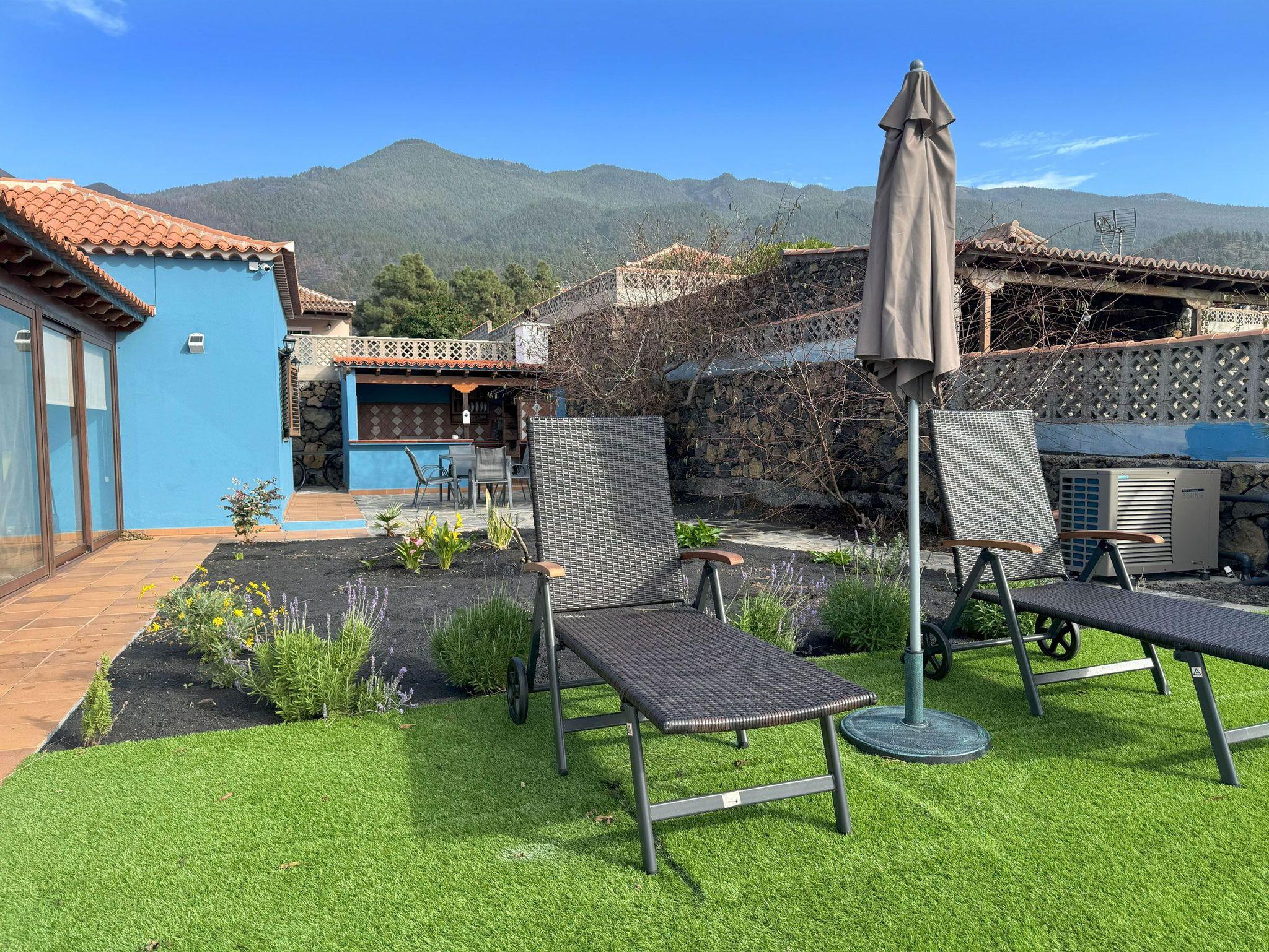 Ein echtes Highlight ist der Außenbereich der Casa Mirador Azul. Das 1000 Quadratmeter große Grundstück ist von einer Mauer umgeben und bietet viel Privatsphäre. Ein beheizbarer Pool mit Abdeckung lädt zum erfrischenden Schwimmen ein, eine Liegefläche mit 2 Sonnenliegen und Sonnenschirm zum Entspannen.