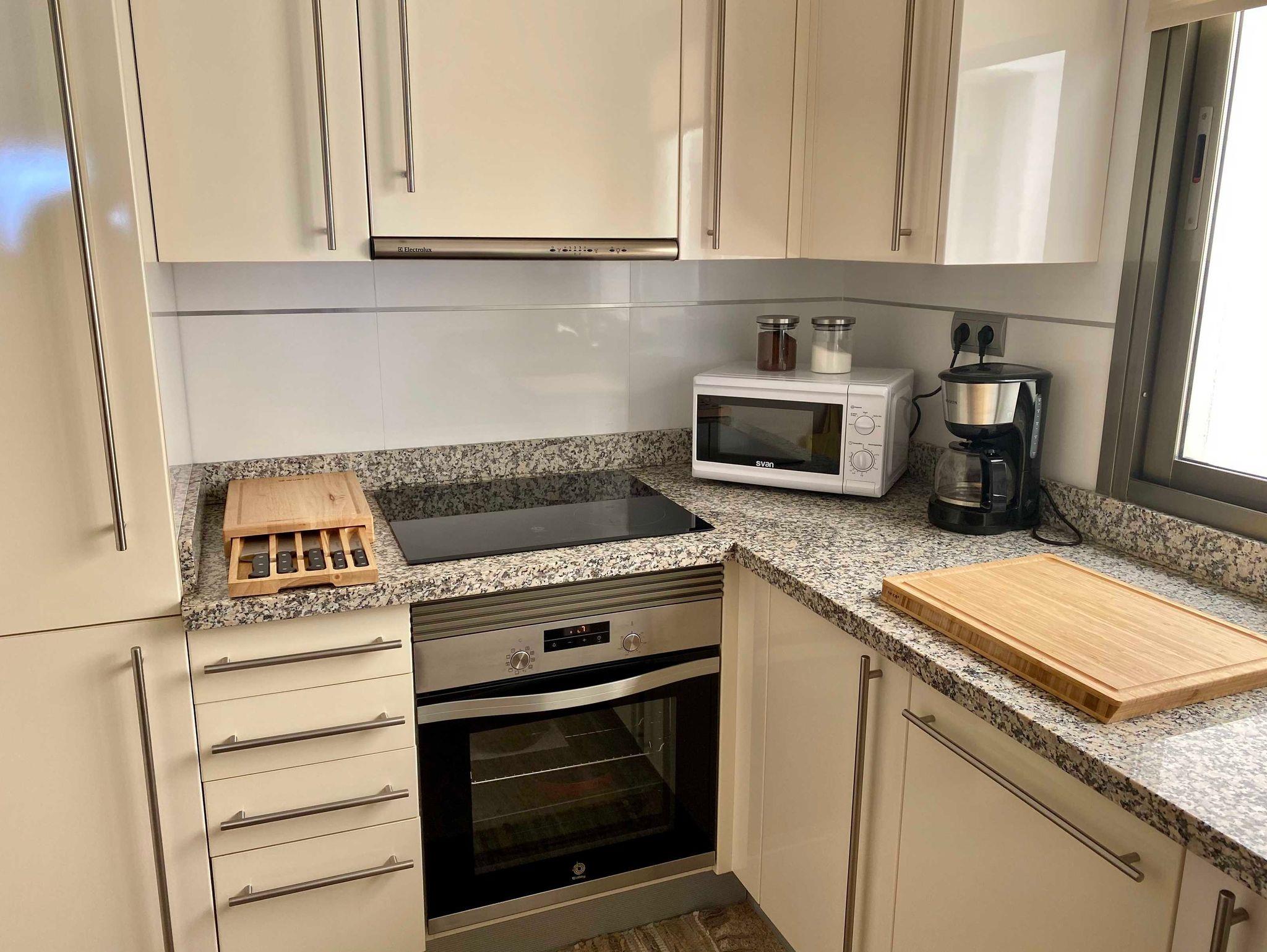 • Küchenzeile mit Ceranfeld (3 Platten), Backofen, Dunstabzug, Mikrowelle, Kühl-/Gefrierkombination, Cafetera, Kaffeemaschine, Spülmaschine, Toaster, Wasserkocher