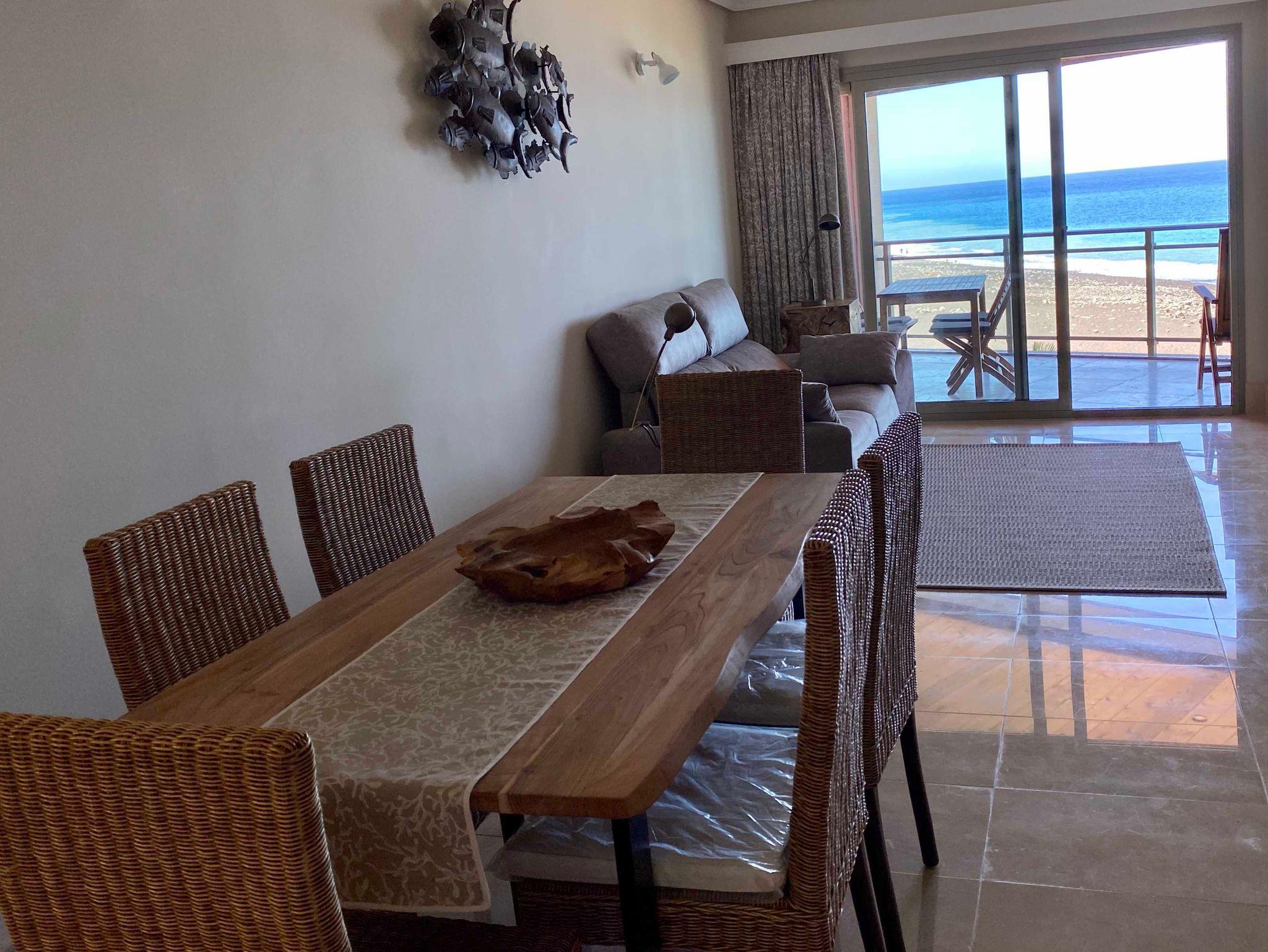 Man betritt das Apartment und hat bereits vom Eingang aus Blick durch den Wohnraum auf das Meer.