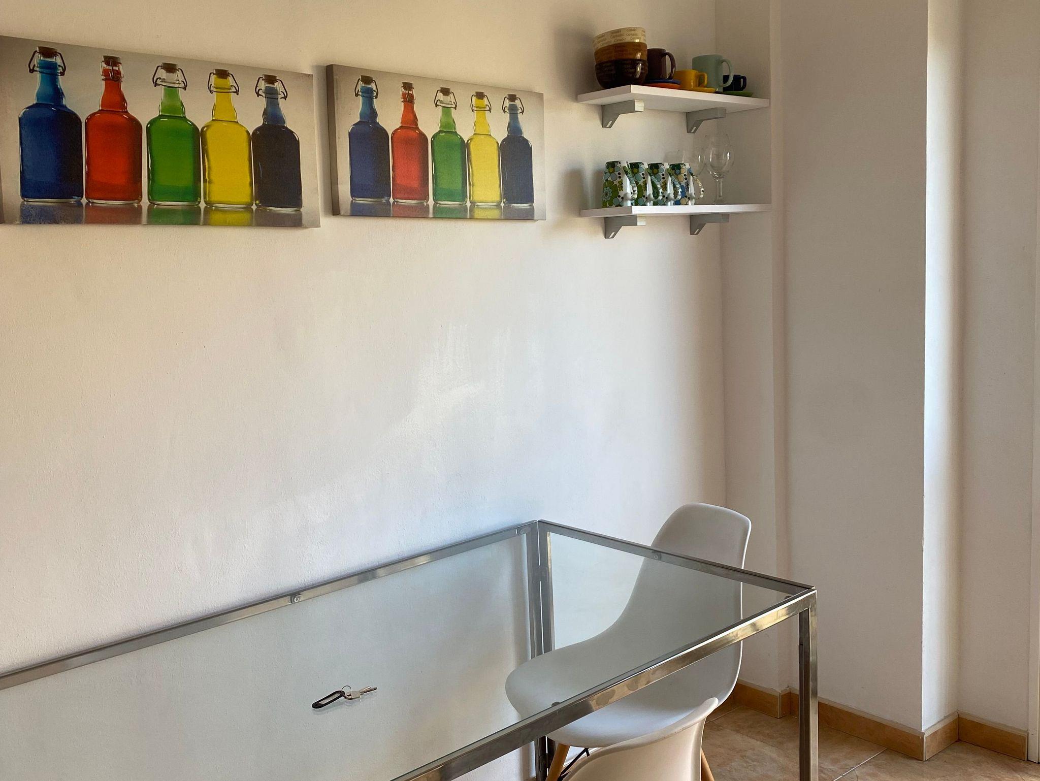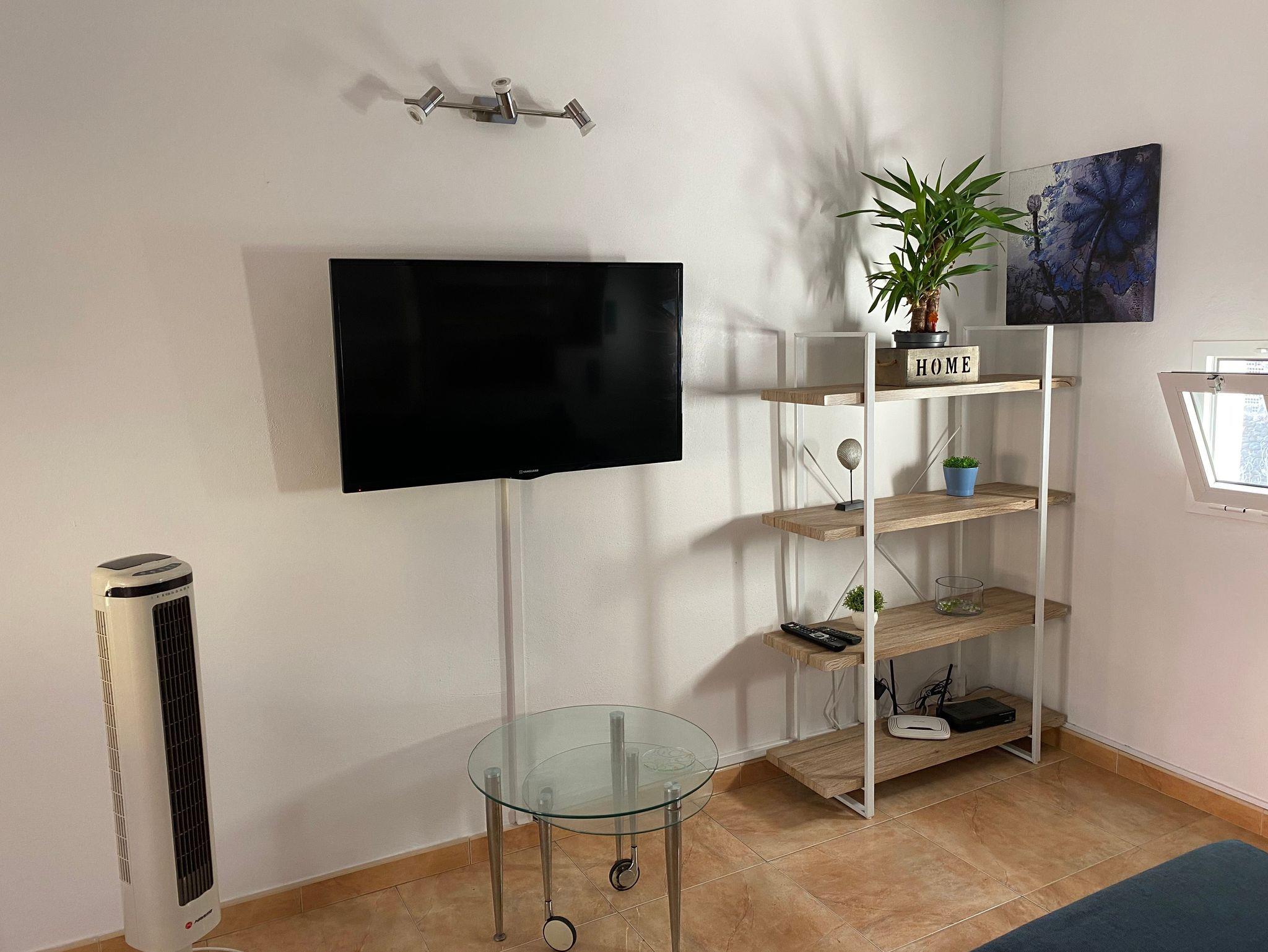 Im unteren Teil des Apartments befindet sich die neue, moderne und gut ausgestattete Küchenzeile mit einem großen Glas-Esstisch und Spülmaschine. Der kleine Wohnbereich fügt sich optimal in den Platz unter der Treppe ein und ist mit einem Sofa und einem großen Flachbildschirm mit Internetanschluss ausgestattet.