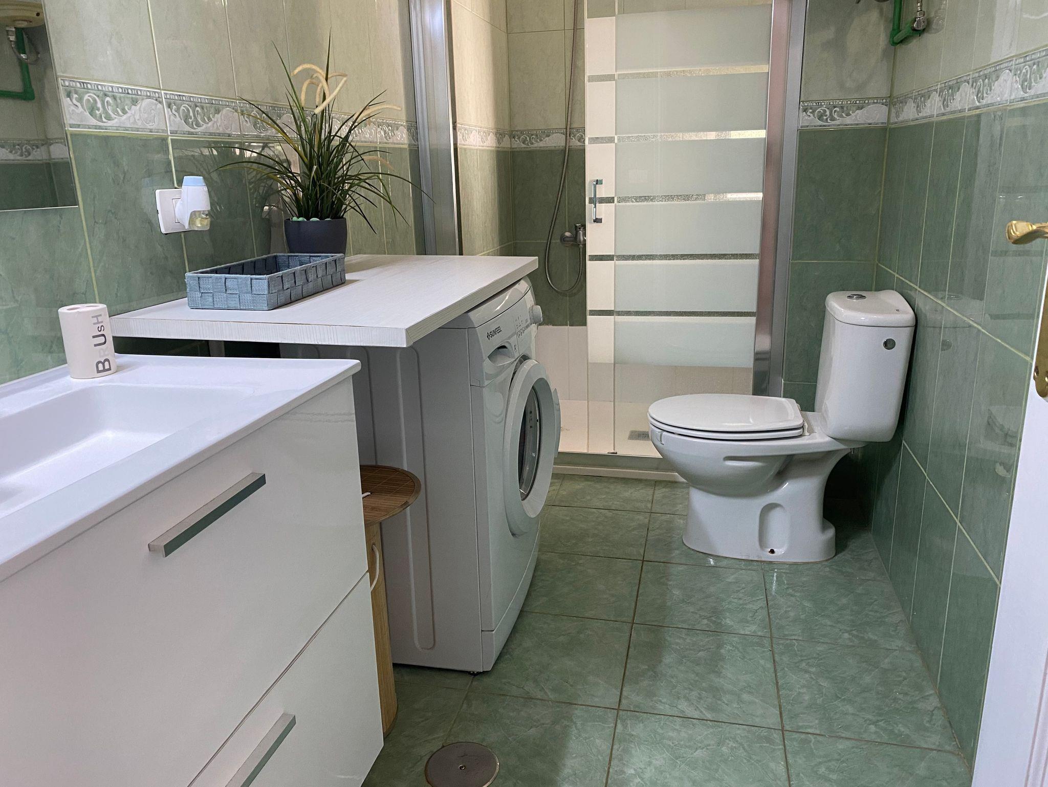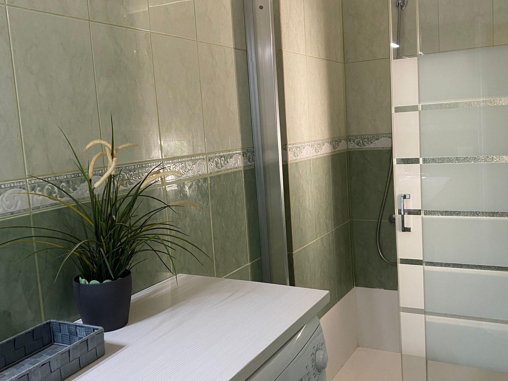 In dem Bad mit großer Duschplattform und WC wurde unter dem Waschbecken viel Stauraum geschaffen, auch eine Waschmaschine findet dort Ihren Platz.