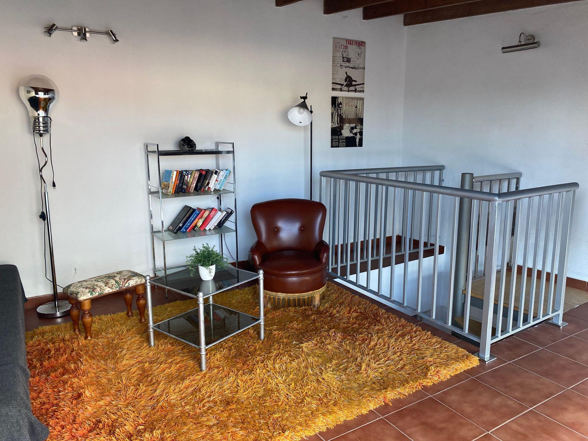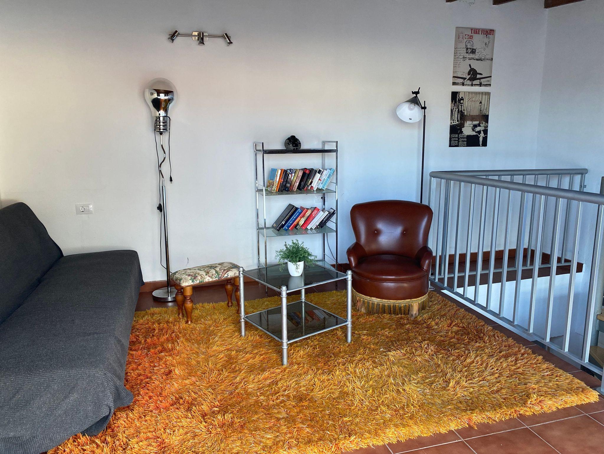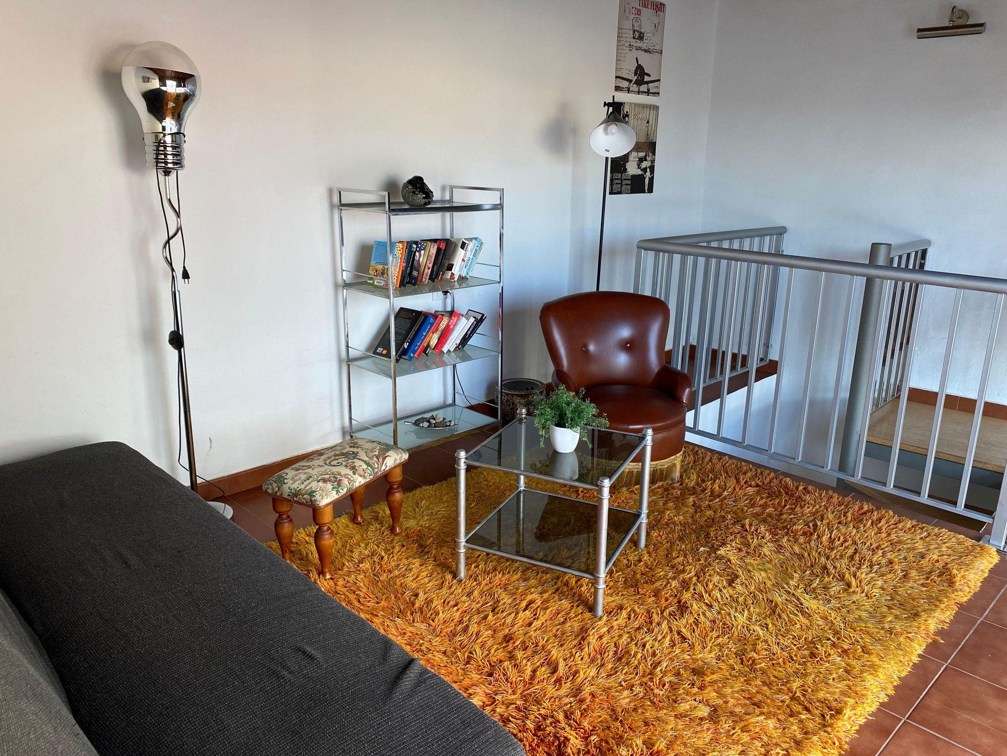 Die Wohnung verteilt sich auf zwei Etagen: im oberen Teil befindet sich ein kleines gemütliches Wohn- und Lesezimmer mit Schlafcouch und direktem Zugang zur großen, möblierten Sonnenterrasse.
