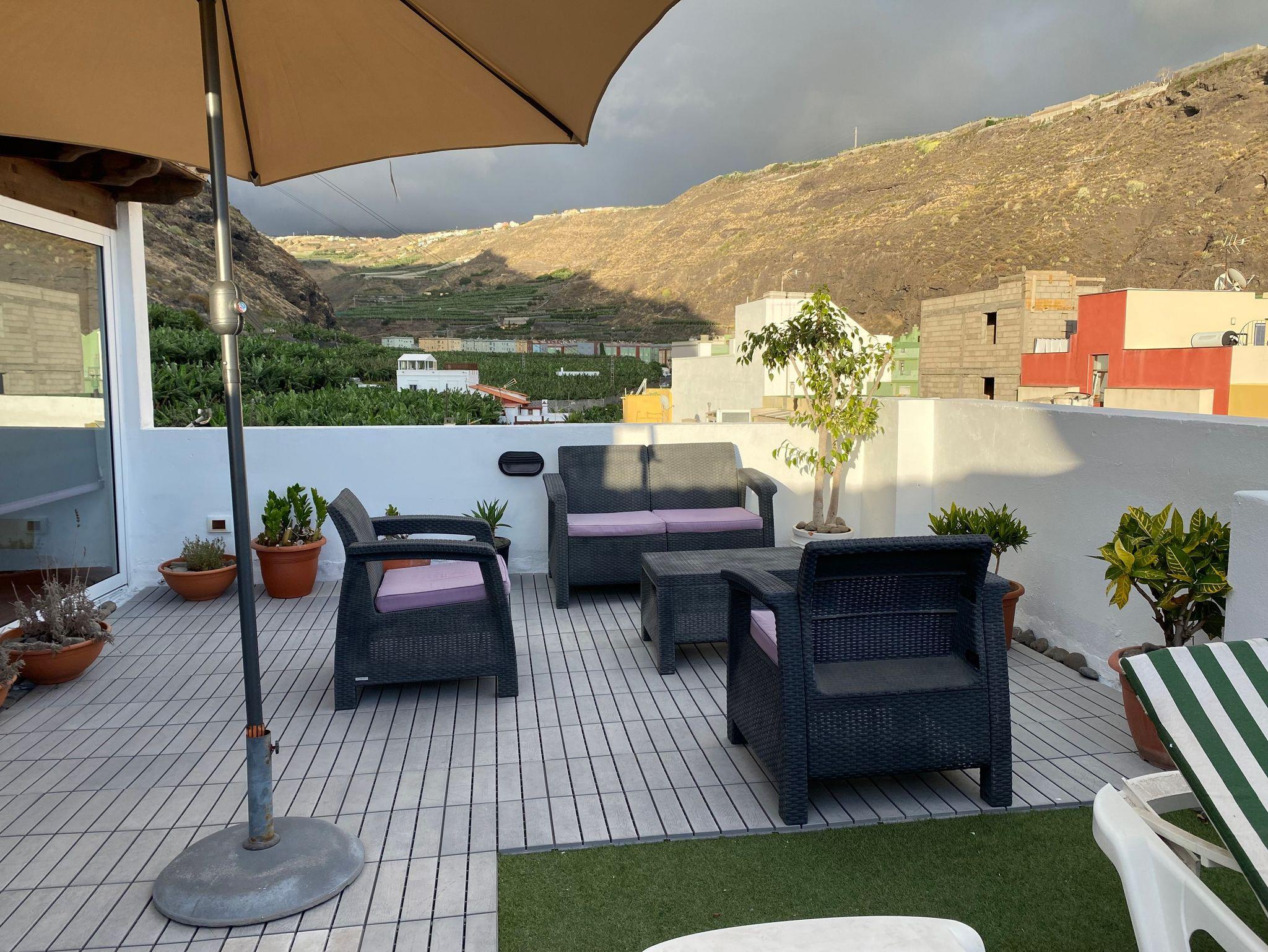 Von der privaten Terrasse hat man einen wunderschönen Blick auf den dahinterliegenden Bergrücken, den Barranco de las Angustias sowie die Gassen der Altstadt von Puerto de Tazacorte.