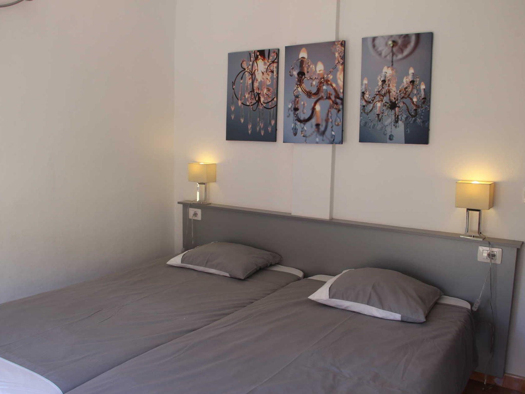 Das Schlafzimmer verfügt über einen großen Einbauschrank und zwei zusammengestellte Einzelbetten mit Leselampen direkt am Bett.
