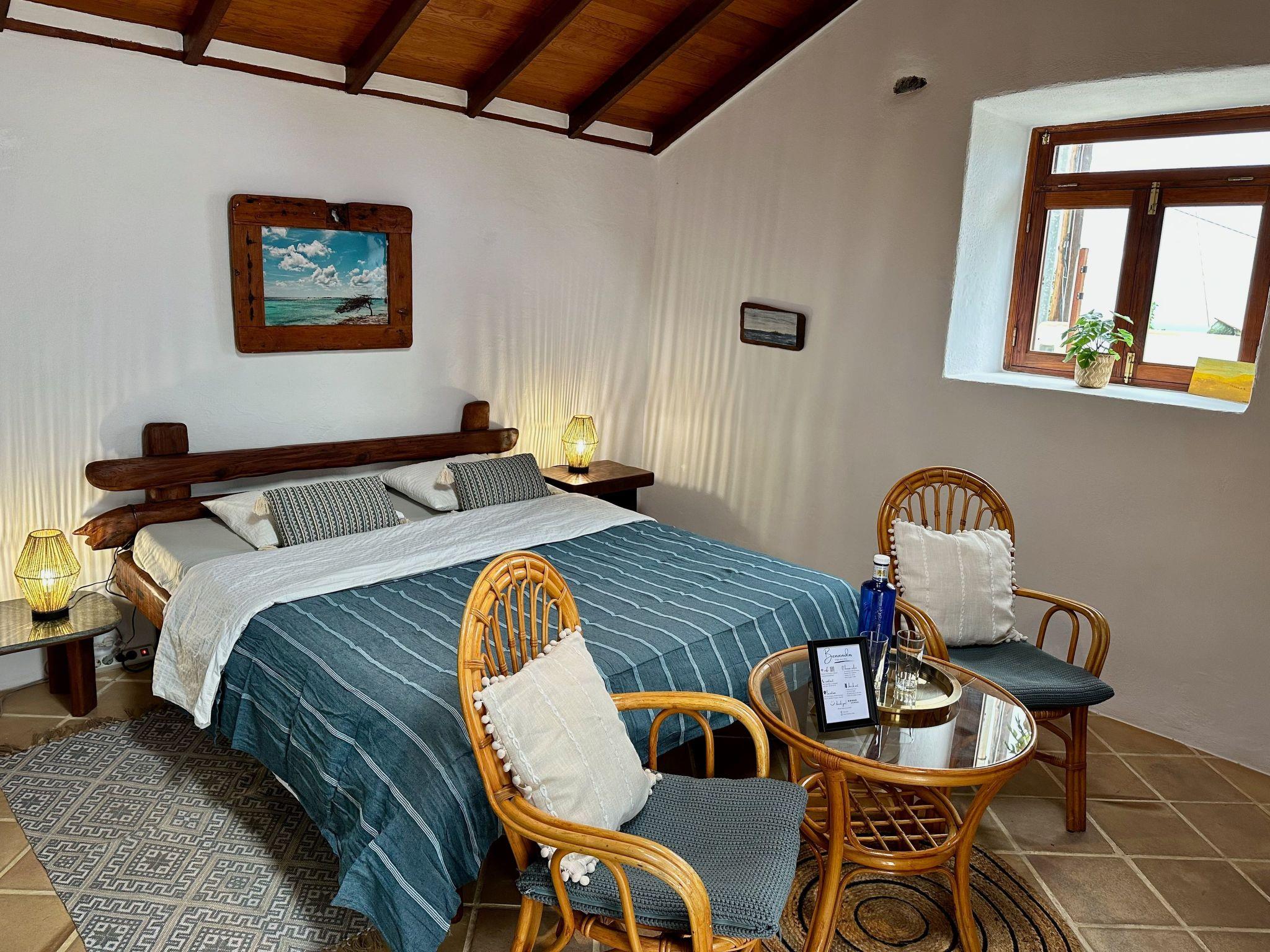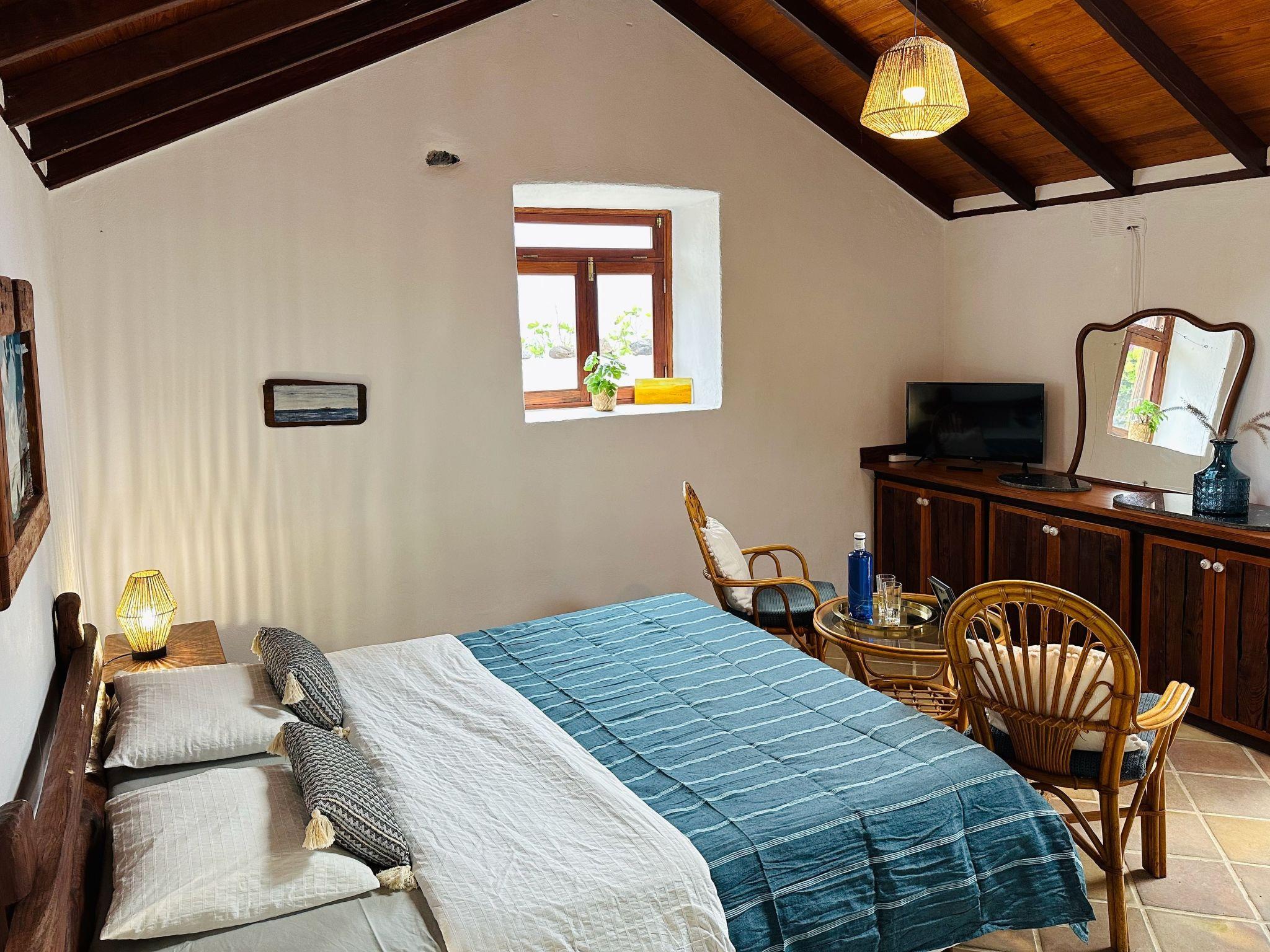 The finca consists of 3 houses and can accommodate up to 6 people. The two-storey main house offers a four-poster bed with sea views on the upper floor. An open staircase leads to the living/sleeping area on the lower floor with two further single beds. Adjacent is a newly renovated bathroom with WC and shower as well as a typical Canarian-style kitchen with a fireplace that heats the whole house on cooler evenings.