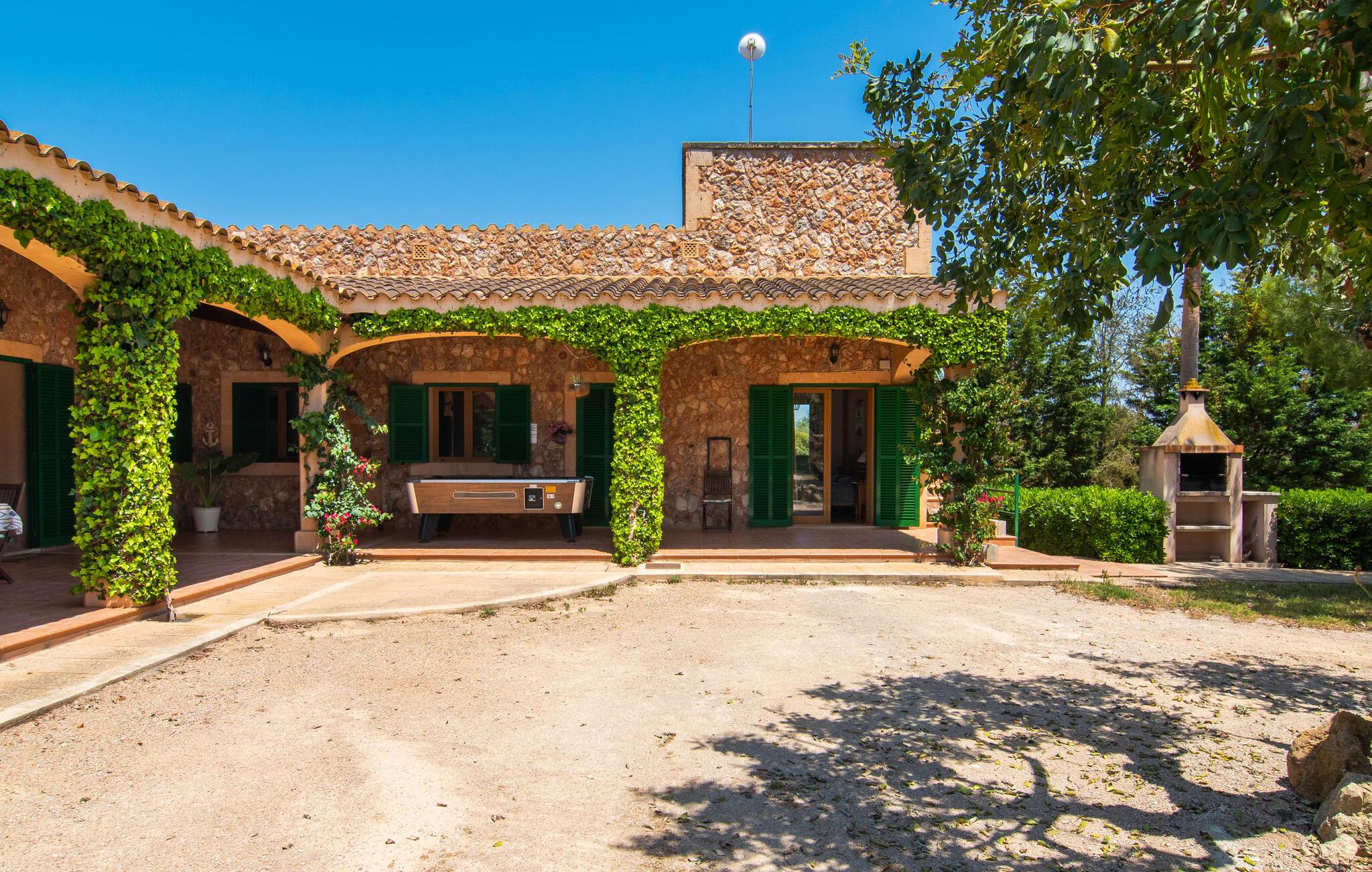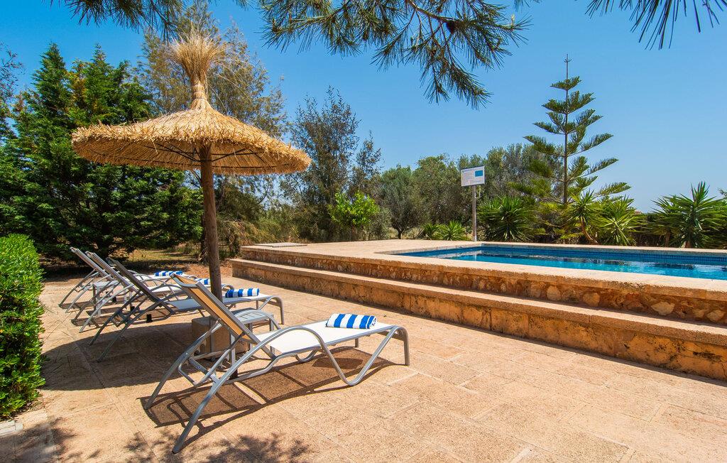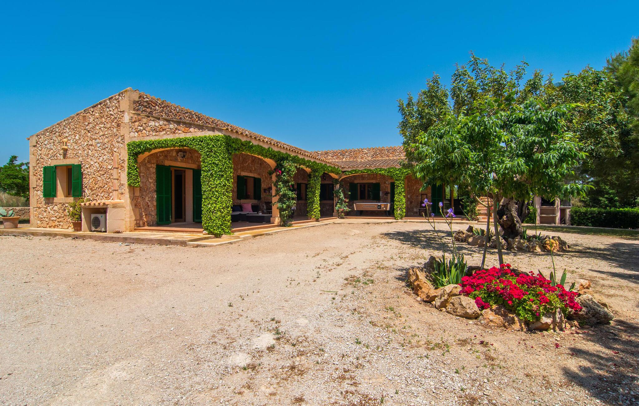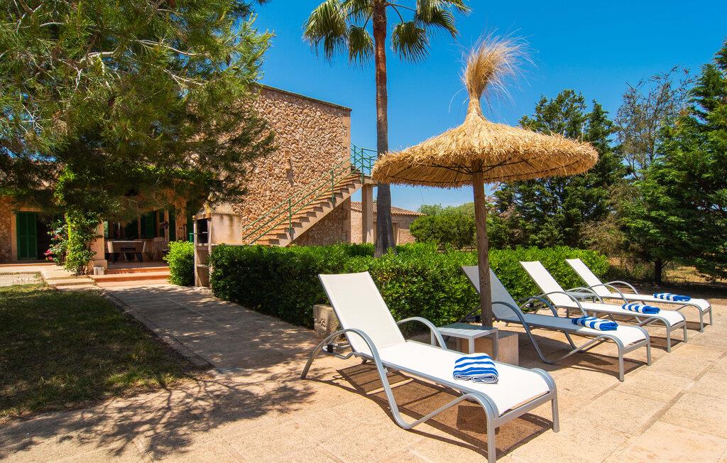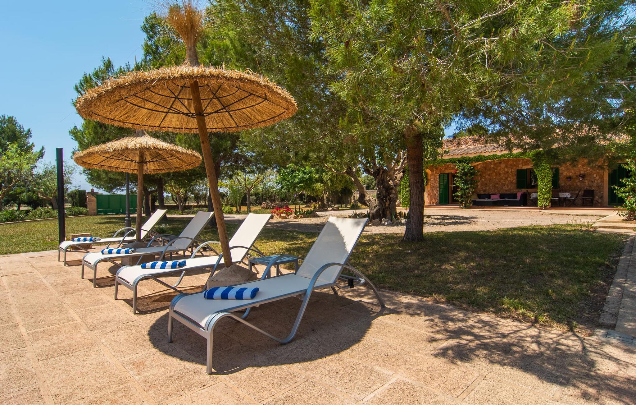 Den familievenlige villa "Els Girasols" er et roligt beliggende landsted, der imponerer med en meget vellykket blanding af mallorcansk arkitektur og moderne indretning. Det er beklædt med natursten typisk for øen og byder på rummelighed og variation både inde og ude. Det 10.000 m² store udendørsareal har forskellige græsplæner, kærligt anlagte middelhavsplanter, små stier og søde hække. Dette skaber et behageligt afslappet helhedsbillede, hvori poolen, smagfuldt flisebelagt med blå mosaikfliser og med nem adgang til trappen foran, passer ind. Det er omgivet på to sider af en solterrasse, hvor I kan sole jer i solen eller under en af de tilgængelige parasoller. I alt otte komfortable liggestole er tilgængelige. Huset har en rummelig overdækket terrasse, som fremstår vidunderlig hjemlig takket være sine søjler, hvoraf nogle er beklædt med vinstokke. En afslappet loungesofa og et stort spisebord indbyder til at blive hængende og slappe af med udsigt til haven - på dejlige dage kan I blot bruge tiden udenfor og nyde det. Et højdepunkt i det overdækkede terrasseområde er formentlig bordfodboldsættet, hvor I kan spille som I vil. Når man træder ind i villaens indre fra terrassen, bliver man mødt af en stor, meget rustik stue, som ikke kun tilbyder gæsten komplet udstyr inklusiv elkedel, filterkaffemaskine og espressomaskine, men også en meget komfortabel opholdsstue/ spiseplads. Pejsen er bekvemt installeret her, og fjernsynet finder også sin plads i dette rustikke hjørne af huset. Det lange træbord kan komfortabelt rumme mindst otte personer. En lille stenbænk ved pejsen tilbyder opbevarings- eller siddemuligheder, det samme gør den komfortable sofa. En attraktiv skænk giver ikke kun opbevaringsplads, men er også et smukt blikfang. De fire rummelige soveværelser er komfortable og hyggelige med masser af træelementer og subtile farver. De indeholder hver to 0,9 x 2 m senge, så I har plads nok til en afslappende feriesøvn selv om natten. Det lyse væg- og loftdesign samt de matchende gulvfliser sikrer et rent, behageligt klima i disse rum. Der er fire smagfulde dagslysbadeværelser til rådighed, hvoraf to er bekvemt en-suite. I kan nemt lade jeres hårtørrer blive hjemme. Hvis I vil besøge smukke strande, er Villa "Els Girasols" et godt valg for jer. De smukkeste strande på den sydøstlige kyst - som den familievenlige Es Trenc strand med dens lavvandede indgang - ligger mindre end 10 km væk og kan hurtigt nås med en lejebil. Efter en smuk dag med udflugter vender I tilbage til jeres smukke ferievilla "Els Girasols", hvor I kan afslutte aftenen. Villaen "Els Girasols" er et smukt naturstenshus på den sydlige del af øen med et smukt designet, rummeligt udendørsområde. Den fantastiske sandstrand Es Trenc ligger kun 8 km væk. Herfra kan I også nemt nå den gamle bydel i øens hovedstad Palma, som er værd at se.