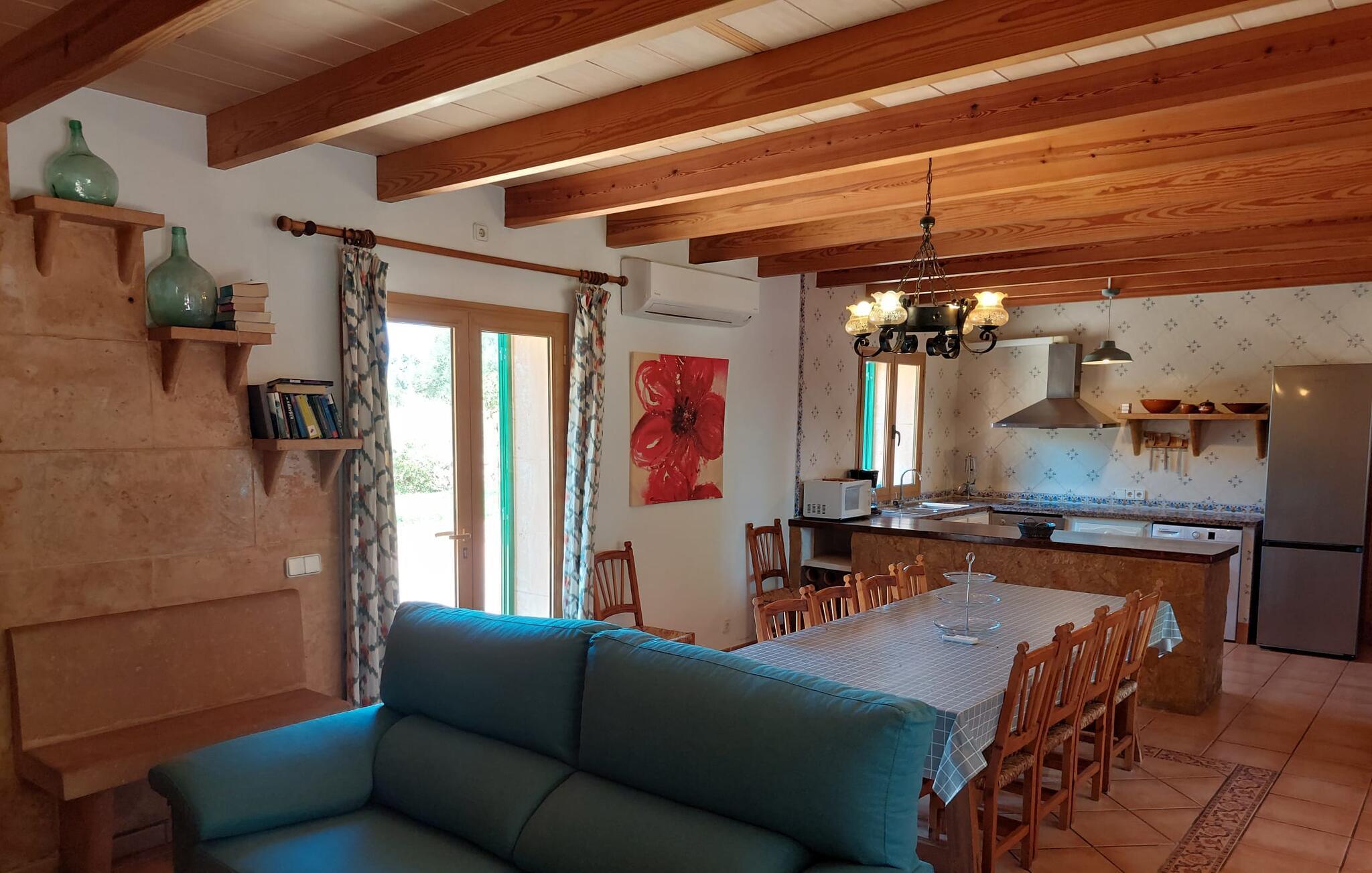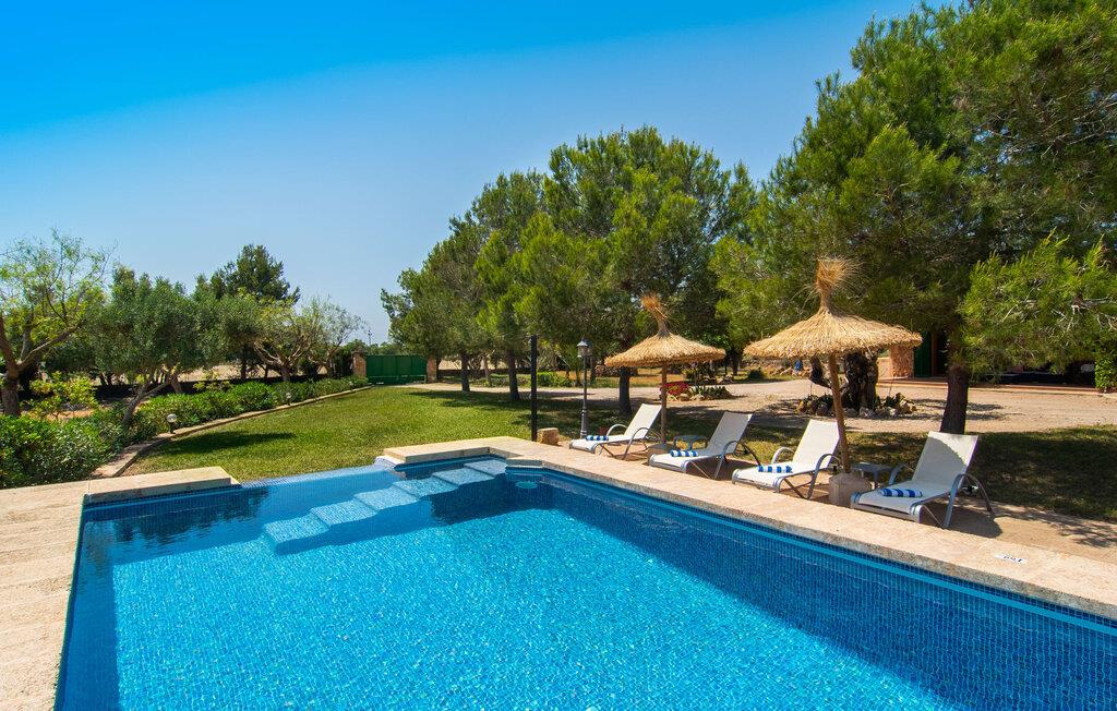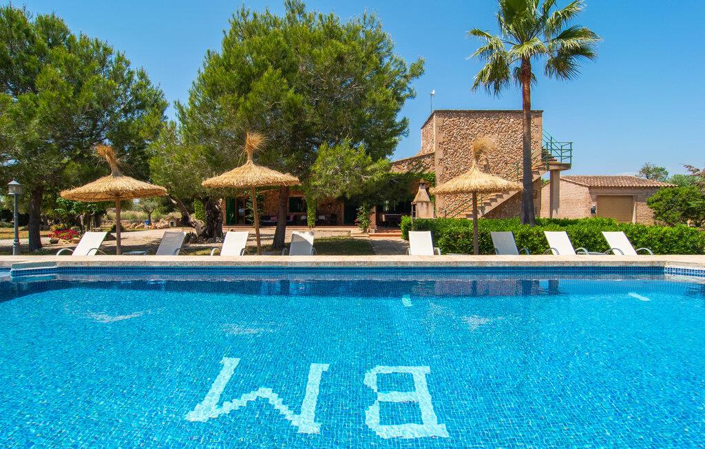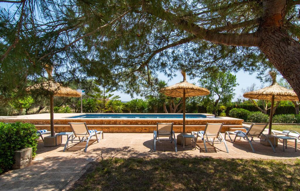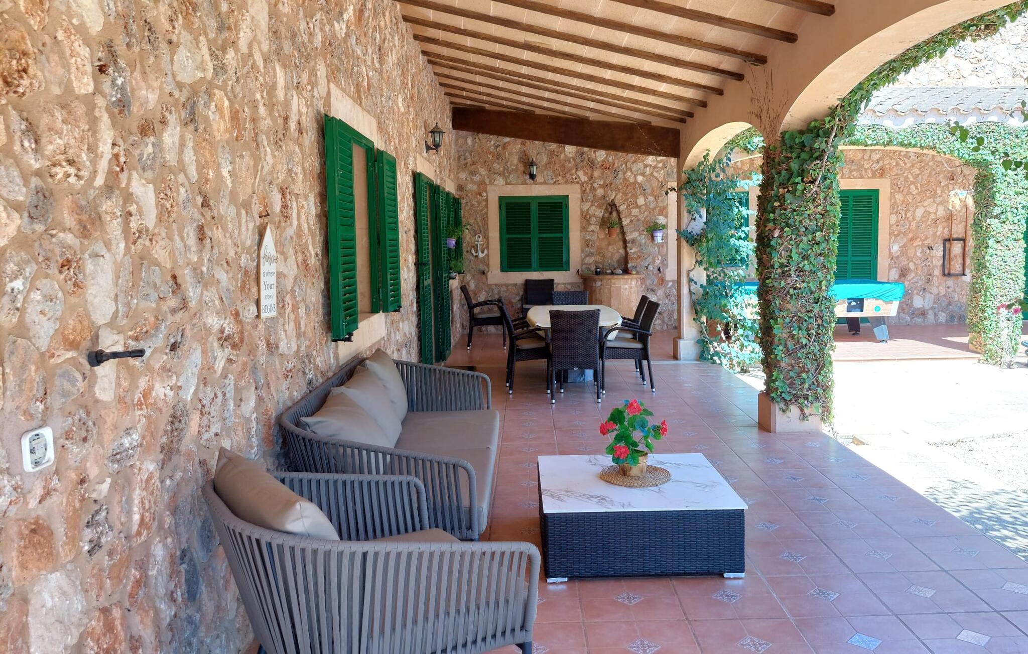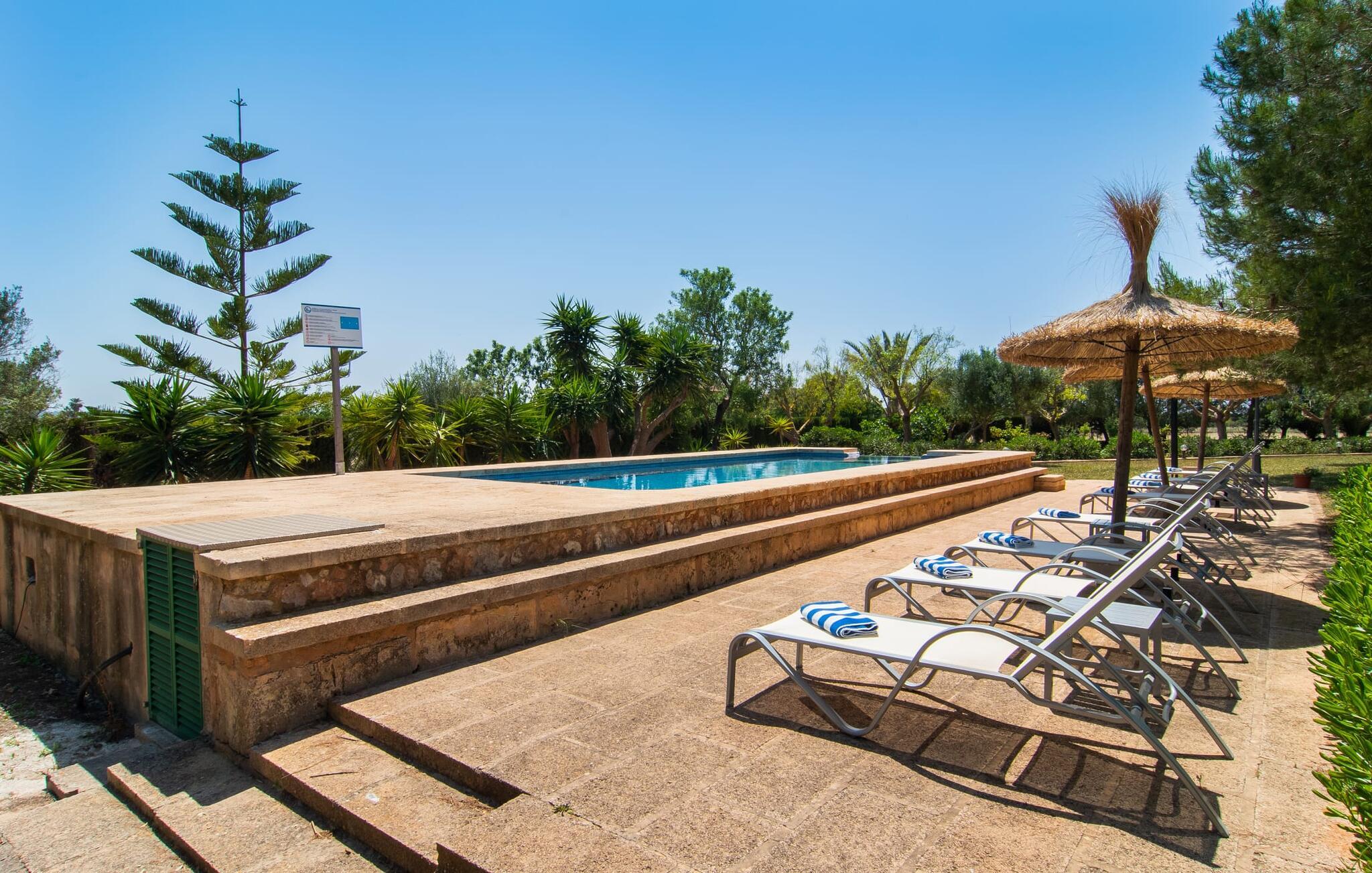Den familievenlige villa "Els Girasols" er et roligt beliggende landsted, der imponerer med en meget vellykket blanding af mallorcansk arkitektur og moderne indretning. Det er beklædt med natursten typisk for øen og byder på rummelighed og variation både inde og ude. Det 10.000 m² store udendørsareal har forskellige græsplæner, kærligt anlagte middelhavsplanter, små stier og søde hække. Dette skaber et behageligt afslappet helhedsbillede, hvori poolen, smagfuldt flisebelagt med blå mosaikfliser og med nem adgang til trappen foran, passer ind. Det er omgivet på to sider af en solterrasse, hvor I kan sole jer i solen eller under en af de tilgængelige parasoller. I alt otte komfortable liggestole er tilgængelige. Huset har en rummelig overdækket terrasse, som fremstår vidunderlig hjemlig takket være sine søjler, hvoraf nogle er beklædt med vinstokke. En afslappet loungesofa og et stort spisebord indbyder til at blive hængende og slappe af med udsigt til haven - på dejlige dage kan I blot bruge tiden udenfor og nyde det. Et højdepunkt i det overdækkede terrasseområde er formentlig bordfodboldsættet, hvor I kan spille som I vil. Når man træder ind i villaens indre fra terrassen, bliver man mødt af en stor, meget rustik stue, som ikke kun tilbyder gæsten komplet udstyr inklusiv elkedel, filterkaffemaskine og espressomaskine, men også en meget komfortabel opholdsstue/ spiseplads. Pejsen er bekvemt installeret her, og fjernsynet finder også sin plads i dette rustikke hjørne af huset. Det lange træbord kan komfortabelt rumme mindst otte personer. En lille stenbænk ved pejsen tilbyder opbevarings- eller siddemuligheder, det samme gør den komfortable sofa. En attraktiv skænk giver ikke kun opbevaringsplads, men er også et smukt blikfang. De fire rummelige soveværelser er komfortable og hyggelige med masser af træelementer og subtile farver. De indeholder hver to 0,9 x 2 m senge, så I har plads nok til en afslappende feriesøvn selv om natten. Det lyse væg- og loftdesign samt de matchende gulvfliser sikrer et rent, behageligt klima i disse rum. Der er fire smagfulde dagslysbadeværelser til rådighed, hvoraf to er bekvemt en-suite. I kan nemt lade jeres hårtørrer blive hjemme. Hvis I vil besøge smukke strande, er Villa "Els Girasols" et godt valg for jer. De smukkeste strande på den sydøstlige kyst - som den familievenlige Es Trenc strand med dens lavvandede indgang - ligger mindre end 10 km væk og kan hurtigt nås med en lejebil. Efter en smuk dag med udflugter vender I tilbage til jeres smukke ferievilla "Els Girasols", hvor I kan afslutte aftenen. Villaen "Els Girasols" er et smukt naturstenshus på den sydlige del af øen med et smukt designet, rummeligt udendørsområde. Den fantastiske sandstrand Es Trenc ligger kun 8 km væk. Herfra kan I også nemt nå den gamle bydel i øens hovedstad Palma, som er værd at se.