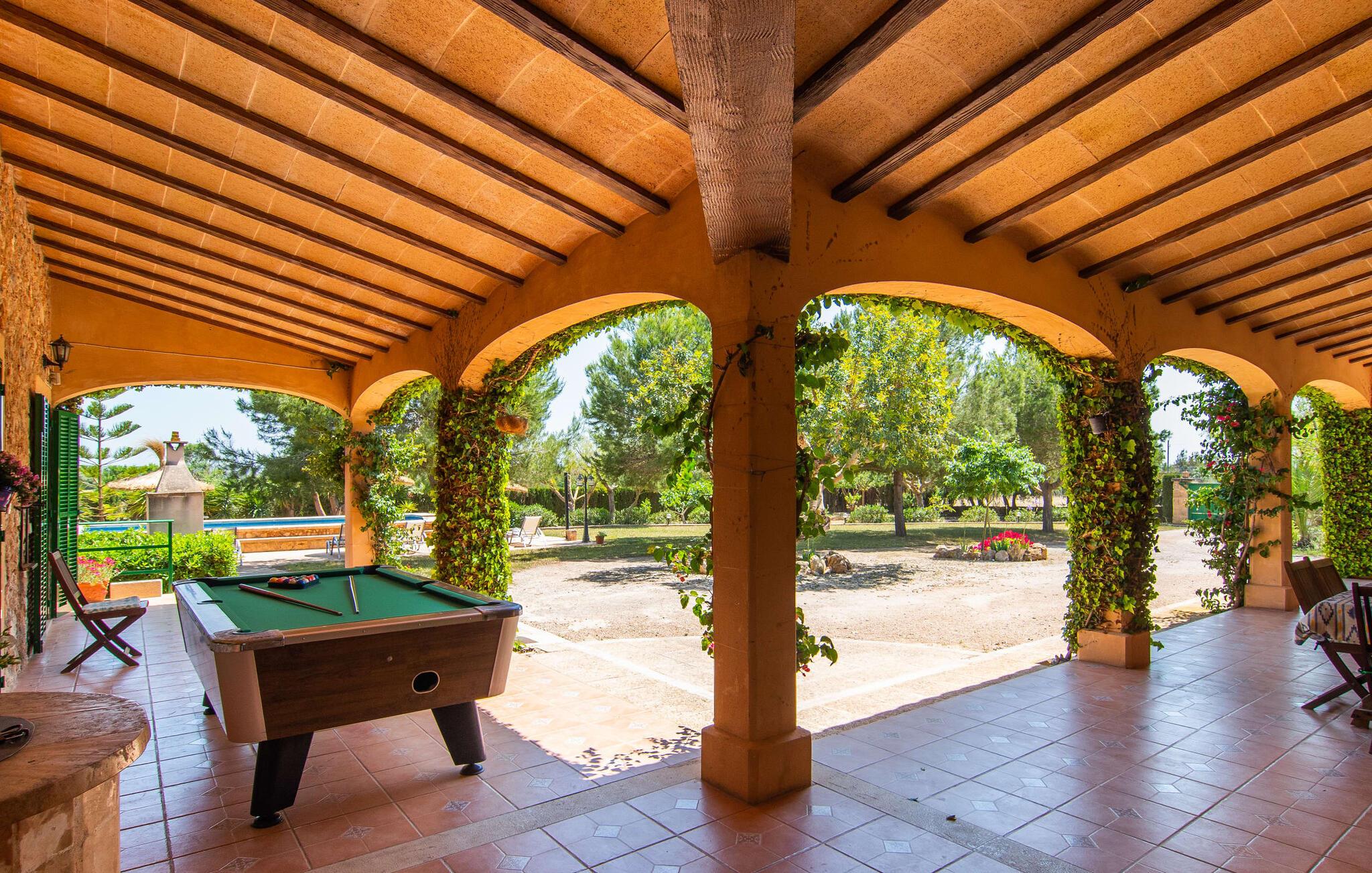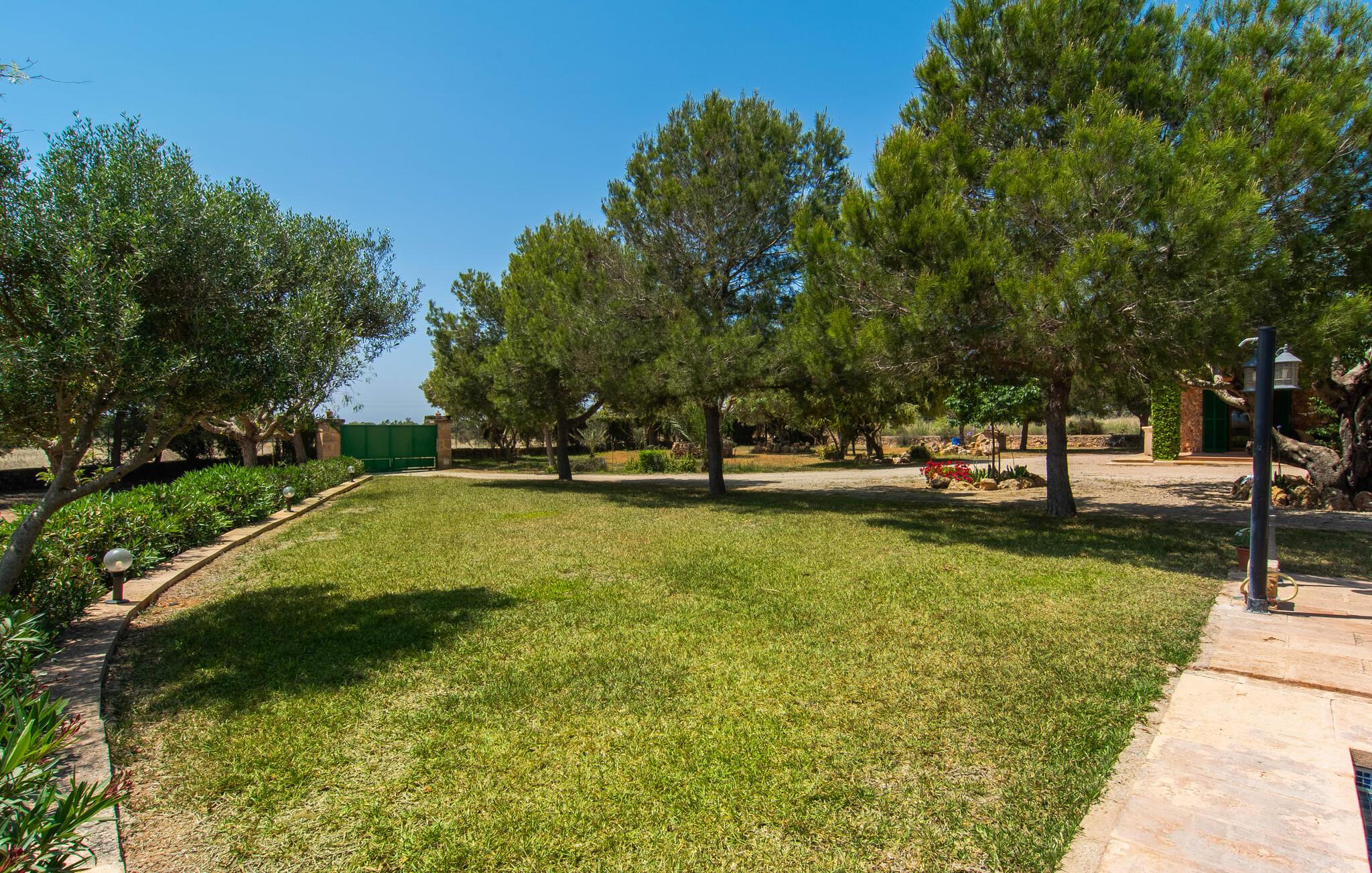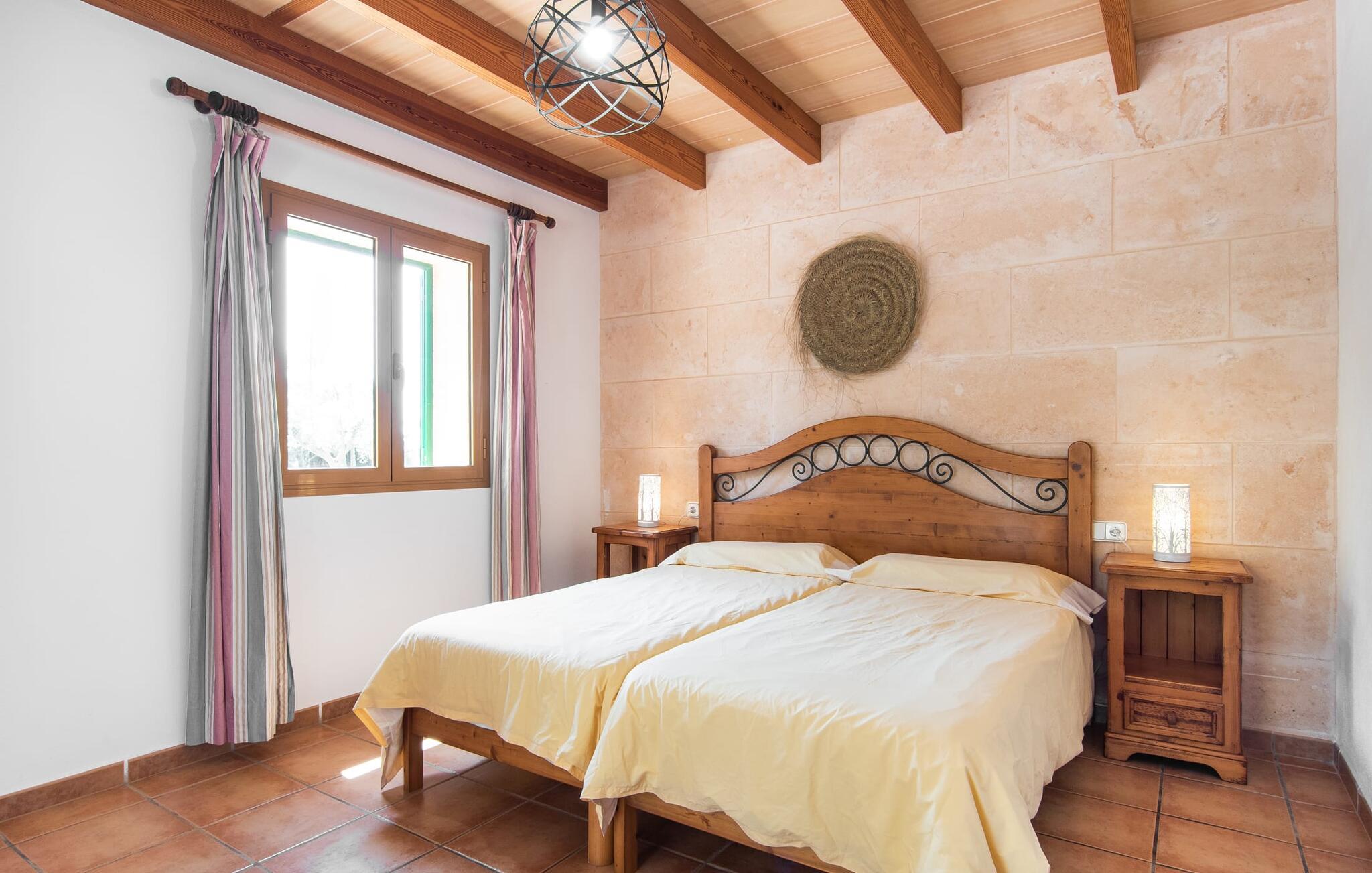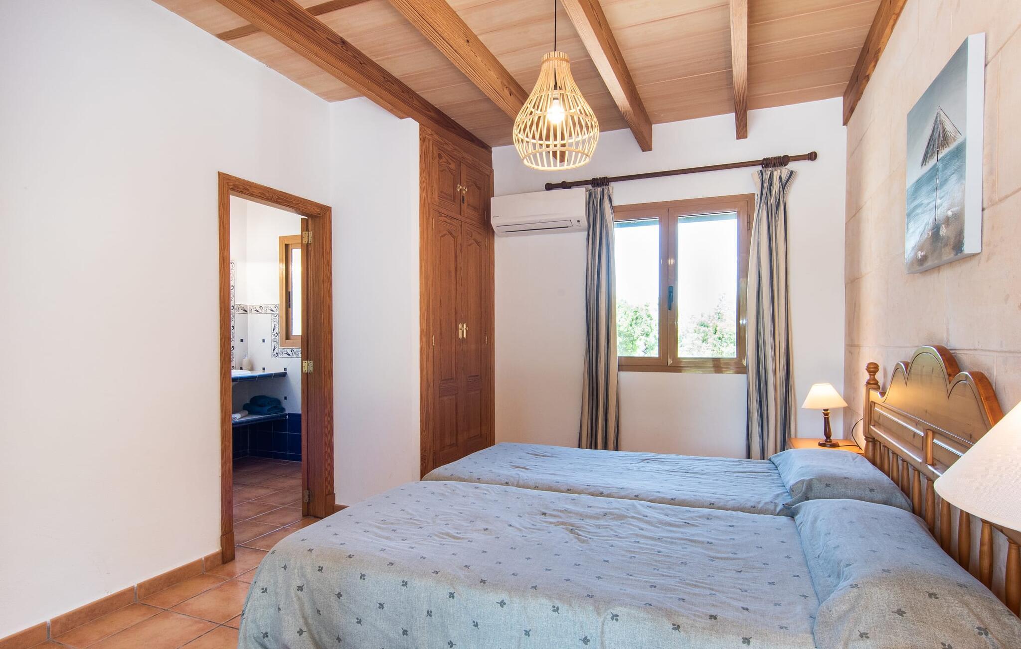 Den familievenlige villa "Els Girasols" er et roligt beliggende landsted, der imponerer med en meget vellykket blanding af mallorcansk arkitektur og moderne indretning. Det er beklædt med natursten typisk for øen og byder på rummelighed og variation både inde og ude. Det 10.000 m² store udendørsareal har forskellige græsplæner, kærligt anlagte middelhavsplanter, små stier og søde hække. Dette skaber et behageligt afslappet helhedsbillede, hvori poolen, smagfuldt flisebelagt med blå mosaikfliser og med nem adgang til trappen foran, passer ind. Det er omgivet på to sider af en solterrasse, hvor I kan sole jer i solen eller under en af de tilgængelige parasoller. I alt otte komfortable liggestole er tilgængelige. Huset har en rummelig overdækket terrasse, som fremstår vidunderlig hjemlig takket være sine søjler, hvoraf nogle er beklædt med vinstokke. En afslappet loungesofa og et stort spisebord indbyder til at blive hængende og slappe af med udsigt til haven - på dejlige dage kan I blot bruge tiden udenfor og nyde det. Et højdepunkt i det overdækkede terrasseområde er formentlig bordfodboldsættet, hvor I kan spille som I vil. Når man træder ind i villaens indre fra terrassen, bliver man mødt af en stor, meget rustik stue, som ikke kun tilbyder gæsten komplet udstyr inklusiv elkedel, filterkaffemaskine og espressomaskine, men også en meget komfortabel opholdsstue/ spiseplads. Pejsen er bekvemt installeret her, og fjernsynet finder også sin plads i dette rustikke hjørne af huset. Det lange træbord kan komfortabelt rumme mindst otte personer. En lille stenbænk ved pejsen tilbyder opbevarings- eller siddemuligheder, det samme gør den komfortable sofa. En attraktiv skænk giver ikke kun opbevaringsplads, men er også et smukt blikfang. De fire rummelige soveværelser er komfortable og hyggelige med masser af træelementer og subtile farver. De indeholder hver to 0,9 x 2 m senge, så I har plads nok til en afslappende feriesøvn selv om natten. Det lyse væg- og loftdesign samt de matchende gulvfliser sikrer et rent, behageligt klima i disse rum. Der er fire smagfulde dagslysbadeværelser til rådighed, hvoraf to er bekvemt en-suite. I kan nemt lade jeres hårtørrer blive hjemme. Hvis I vil besøge smukke strande, er Villa "Els Girasols" et godt valg for jer. De smukkeste strande på den sydøstlige kyst - som den familievenlige Es Trenc strand med dens lavvandede indgang - ligger mindre end 10 km væk og kan hurtigt nås med en lejebil. Efter en smuk dag med udflugter vender I tilbage til jeres smukke ferievilla "Els Girasols", hvor I kan afslutte aftenen. Villaen "Els Girasols" er et smukt naturstenshus på den sydlige del af øen med et smukt designet, rummeligt udendørsområde. Den fantastiske sandstrand Es Trenc ligger kun 8 km væk. Herfra kan I også nemt nå den gamle bydel i øens hovedstad Palma, som er værd at se.