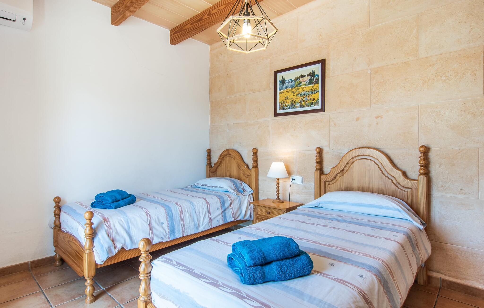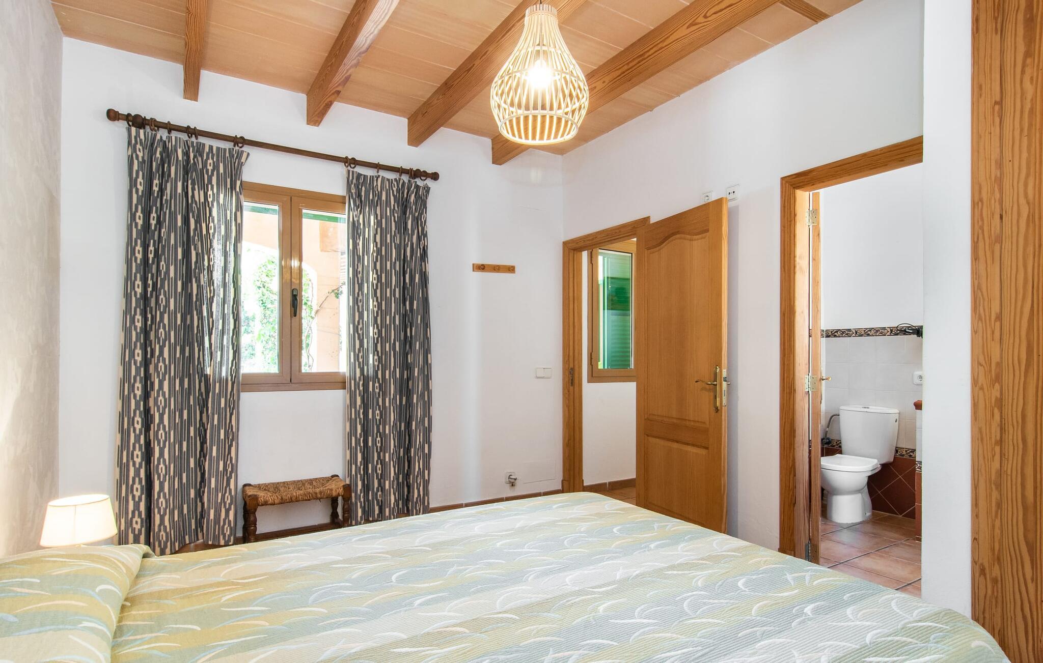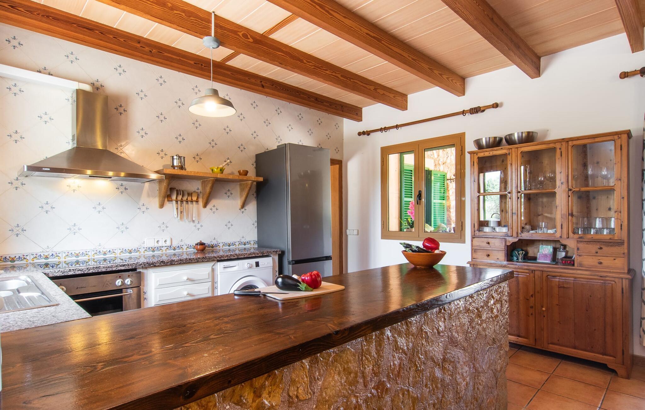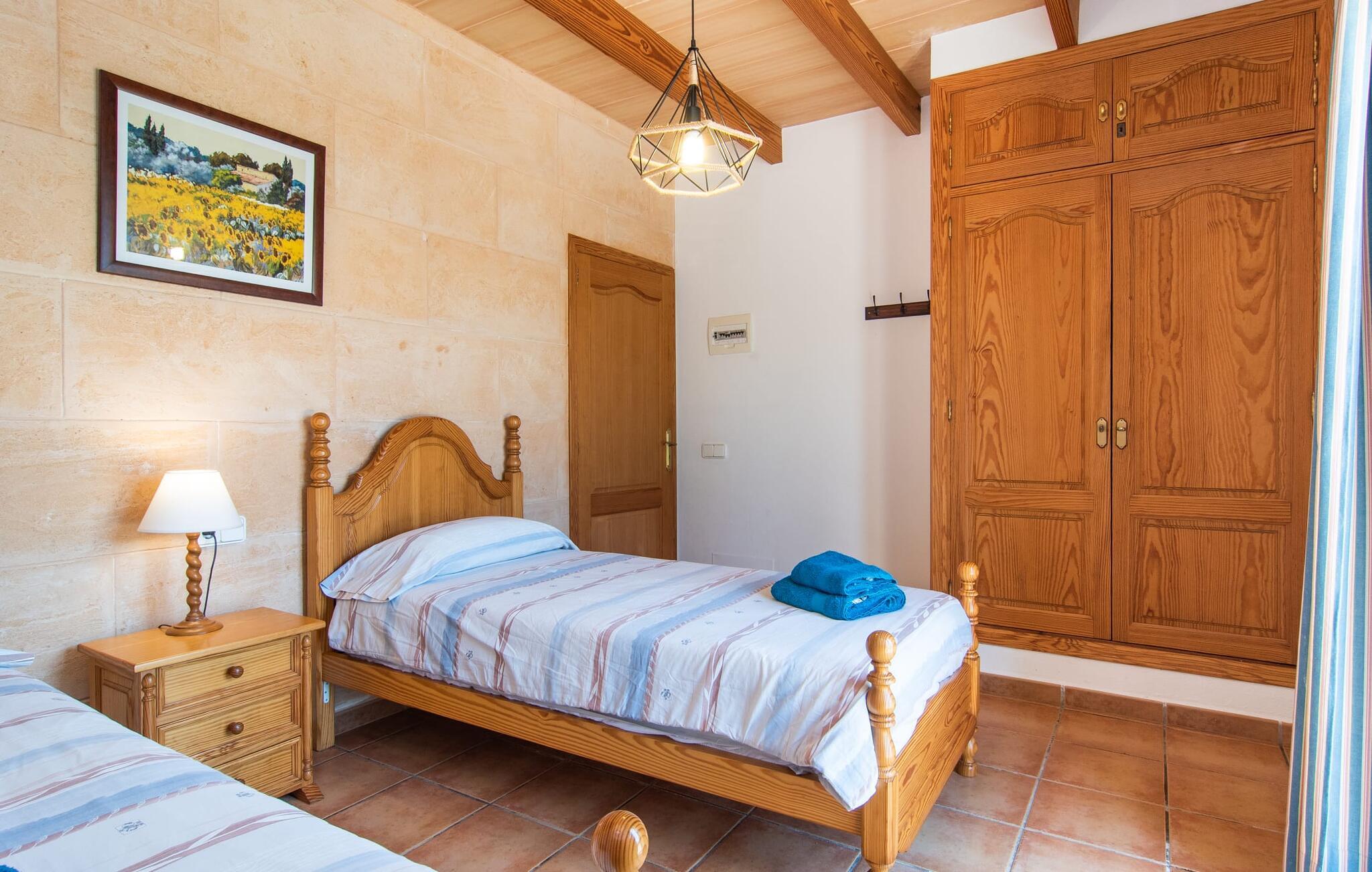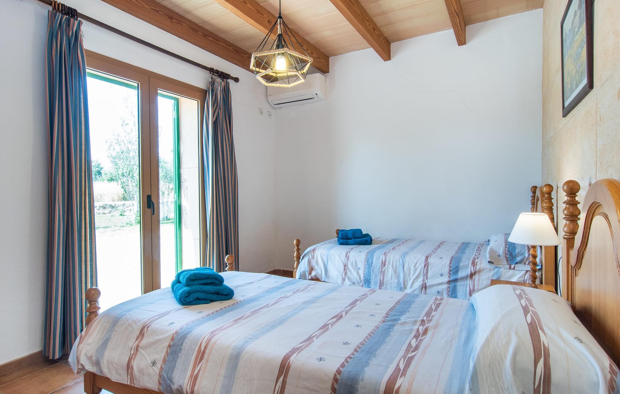 Den familievenlige villa "Els Girasols" er et roligt beliggende landsted, der imponerer med en meget vellykket blanding af mallorcansk arkitektur og moderne indretning. Det er beklædt med natursten typisk for øen og byder på rummelighed og variation både inde og ude. Det 10.000 m² store udendørsareal har forskellige græsplæner, kærligt anlagte middelhavsplanter, små stier og søde hække. Dette skaber et behageligt afslappet helhedsbillede, hvori poolen, smagfuldt flisebelagt med blå mosaikfliser og med nem adgang til trappen foran, passer ind. Det er omgivet på to sider af en solterrasse, hvor I kan sole jer i solen eller under en af de tilgængelige parasoller. I alt otte komfortable liggestole er tilgængelige. Huset har en rummelig overdækket terrasse, som fremstår vidunderlig hjemlig takket være sine søjler, hvoraf nogle er beklædt med vinstokke. En afslappet loungesofa og et stort spisebord indbyder til at blive hængende og slappe af med udsigt til haven - på dejlige dage kan I blot bruge tiden udenfor og nyde det. Et højdepunkt i det overdækkede terrasseområde er formentlig bordfodboldsættet, hvor I kan spille som I vil. Når man træder ind i villaens indre fra terrassen, bliver man mødt af en stor, meget rustik stue, som ikke kun tilbyder gæsten komplet udstyr inklusiv elkedel, filterkaffemaskine og espressomaskine, men også en meget komfortabel opholdsstue/ spiseplads. Pejsen er bekvemt installeret her, og fjernsynet finder også sin plads i dette rustikke hjørne af huset. Det lange træbord kan komfortabelt rumme mindst otte personer. En lille stenbænk ved pejsen tilbyder opbevarings- eller siddemuligheder, det samme gør den komfortable sofa. En attraktiv skænk giver ikke kun opbevaringsplads, men er også et smukt blikfang. De fire rummelige soveværelser er komfortable og hyggelige med masser af træelementer og subtile farver. De indeholder hver to 0,9 x 2 m senge, så I har plads nok til en afslappende feriesøvn selv om natten. Det lyse væg- og loftdesign samt de matchende gulvfliser sikrer et rent, behageligt klima i disse rum. Der er fire smagfulde dagslysbadeværelser til rådighed, hvoraf to er bekvemt en-suite. I kan nemt lade jeres hårtørrer blive hjemme. Hvis I vil besøge smukke strande, er Villa "Els Girasols" et godt valg for jer. De smukkeste strande på den sydøstlige kyst - som den familievenlige Es Trenc strand med dens lavvandede indgang - ligger mindre end 10 km væk og kan hurtigt nås med en lejebil. Efter en smuk dag med udflugter vender I tilbage til jeres smukke ferievilla "Els Girasols", hvor I kan afslutte aftenen. Villaen "Els Girasols" er et smukt naturstenshus på den sydlige del af øen med et smukt designet, rummeligt udendørsområde. Den fantastiske sandstrand Es Trenc ligger kun 8 km væk. Herfra kan I også nemt nå den gamle bydel i øens hovedstad Palma, som er værd at se.