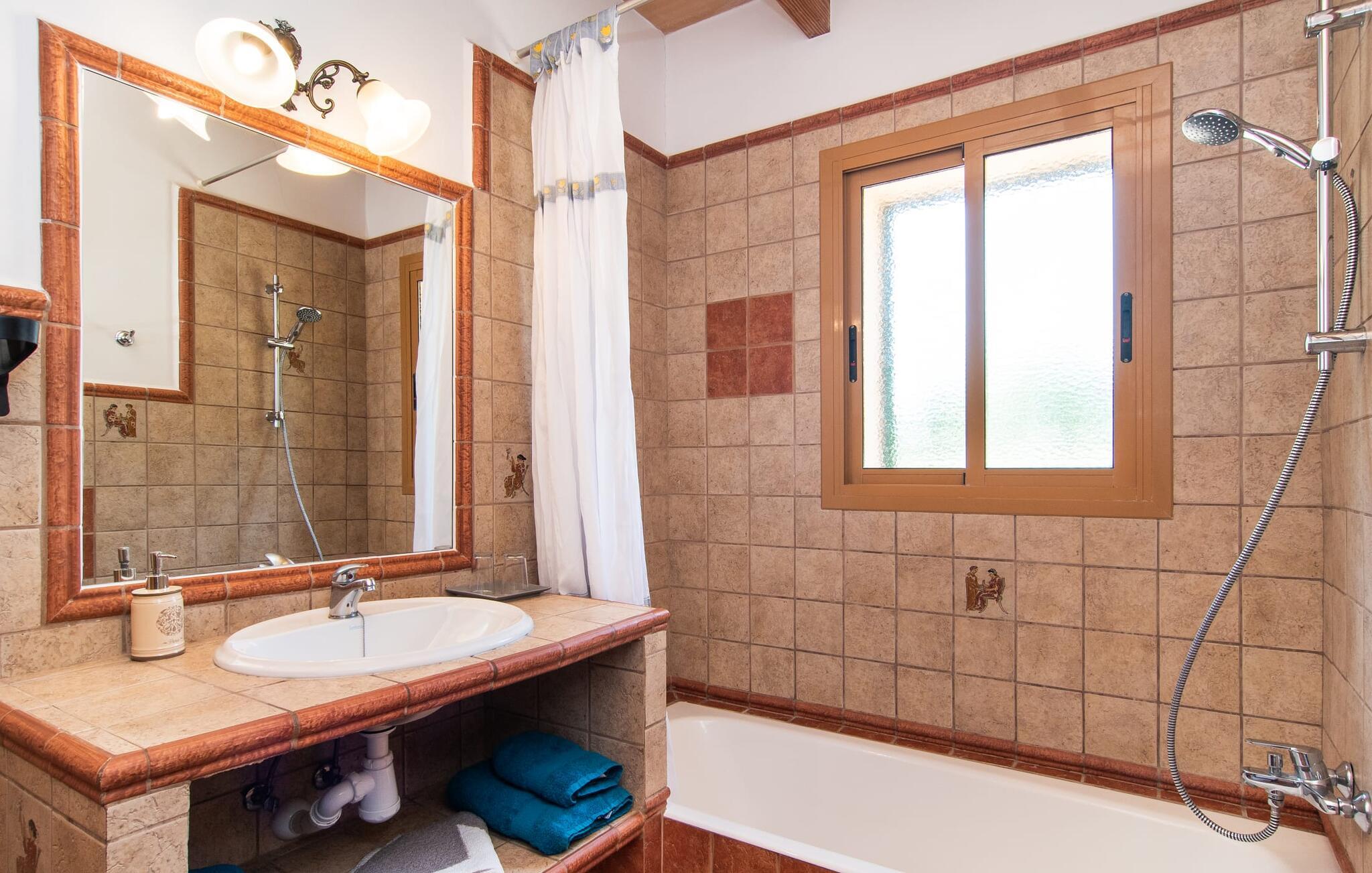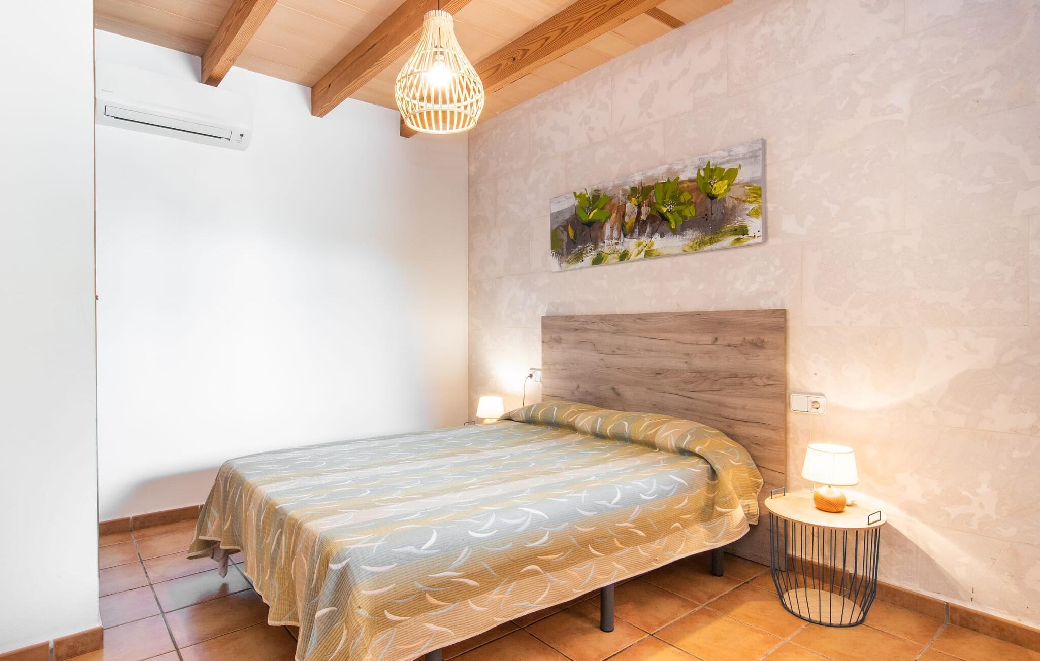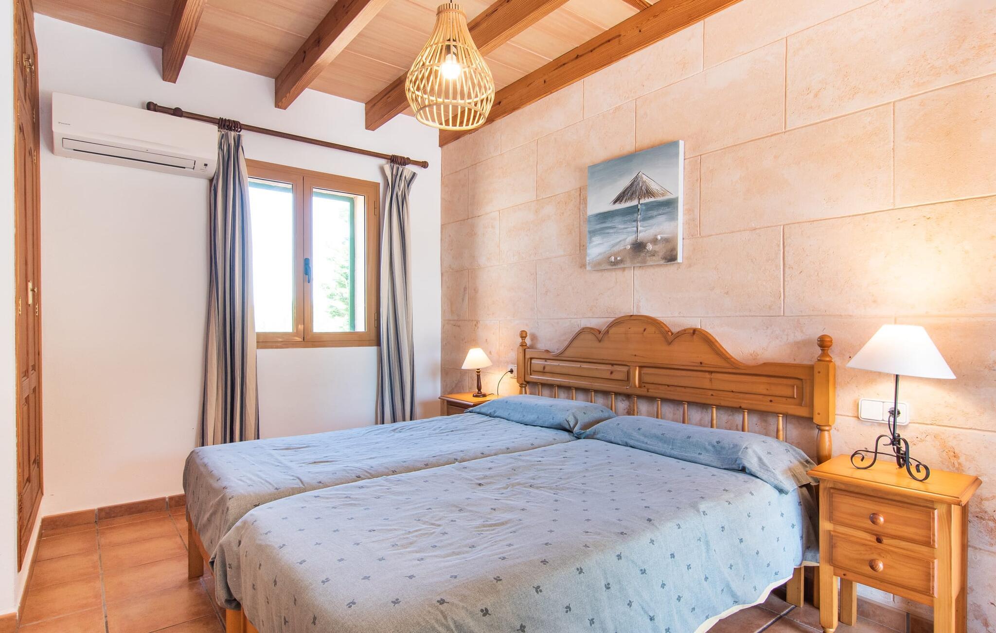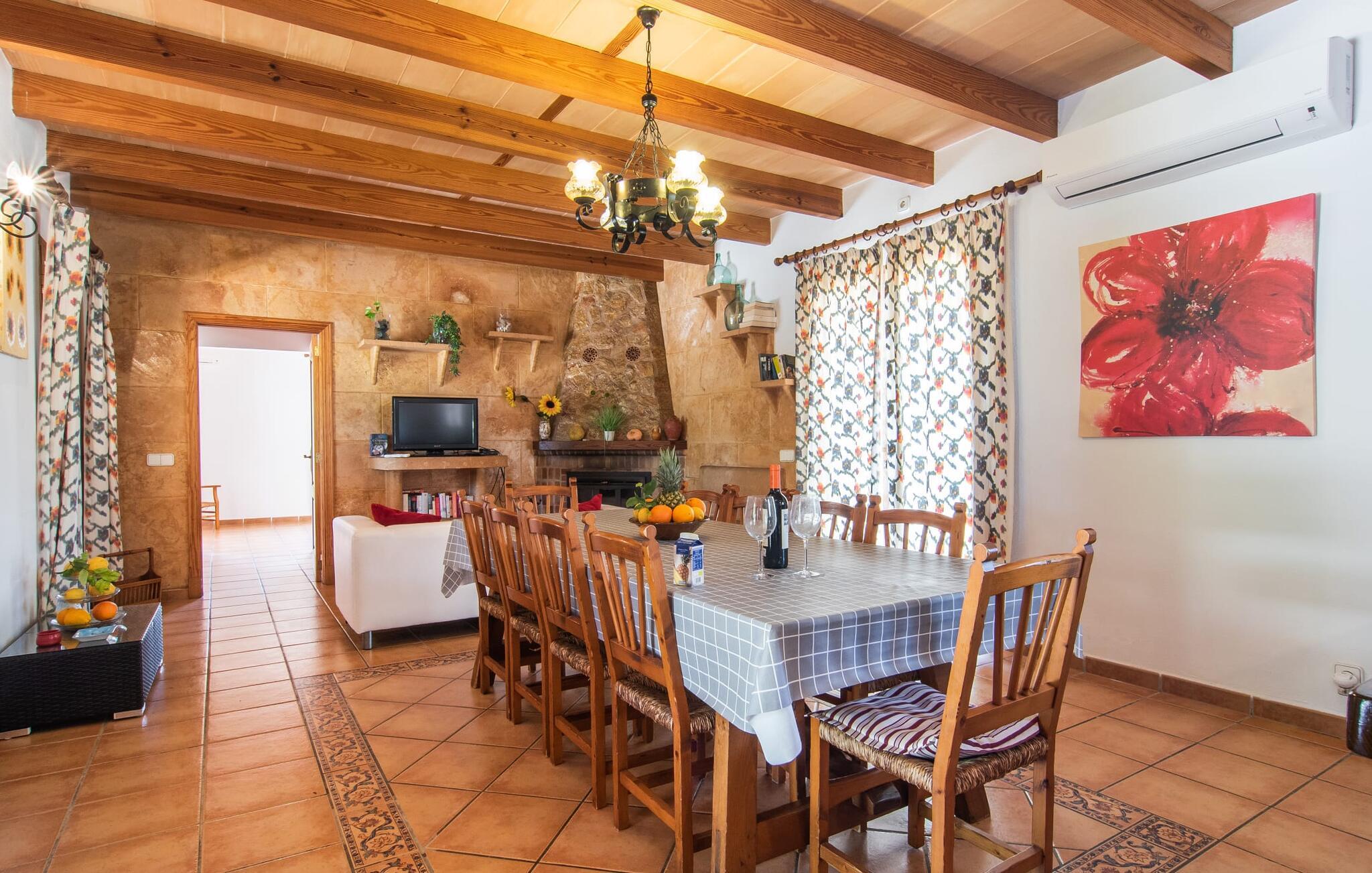 Den familievenlige villa "Els Girasols" er et roligt beliggende landsted, der imponerer med en meget vellykket blanding af mallorcansk arkitektur og moderne indretning. Det er beklædt med natursten typisk for øen og byder på rummelighed og variation både inde og ude. Det 10.000 m² store udendørsareal har forskellige græsplæner, kærligt anlagte middelhavsplanter, små stier og søde hække. Dette skaber et behageligt afslappet helhedsbillede, hvori poolen, smagfuldt flisebelagt med blå mosaikfliser og med nem adgang til trappen foran, passer ind. Det er omgivet på to sider af en solterrasse, hvor I kan sole jer i solen eller under en af de tilgængelige parasoller. I alt otte komfortable liggestole er tilgængelige. Huset har en rummelig overdækket terrasse, som fremstår vidunderlig hjemlig takket være sine søjler, hvoraf nogle er beklædt med vinstokke. En afslappet loungesofa og et stort spisebord indbyder til at blive hængende og slappe af med udsigt til haven - på dejlige dage kan I blot bruge tiden udenfor og nyde det. Et højdepunkt i det overdækkede terrasseområde er formentlig bordfodboldsættet, hvor I kan spille som I vil. Når man træder ind i villaens indre fra terrassen, bliver man mødt af en stor, meget rustik stue, som ikke kun tilbyder gæsten komplet udstyr inklusiv elkedel, filterkaffemaskine og espressomaskine, men også en meget komfortabel opholdsstue/ spiseplads. Pejsen er bekvemt installeret her, og fjernsynet finder også sin plads i dette rustikke hjørne af huset. Det lange træbord kan komfortabelt rumme mindst otte personer. En lille stenbænk ved pejsen tilbyder opbevarings- eller siddemuligheder, det samme gør den komfortable sofa. En attraktiv skænk giver ikke kun opbevaringsplads, men er også et smukt blikfang. De fire rummelige soveværelser er komfortable og hyggelige med masser af træelementer og subtile farver. De indeholder hver to 0,9 x 2 m senge, så I har plads nok til en afslappende feriesøvn selv om natten. Det lyse væg- og loftdesign samt de matchende gulvfliser sikrer et rent, behageligt klima i disse rum. Der er fire smagfulde dagslysbadeværelser til rådighed, hvoraf to er bekvemt en-suite. I kan nemt lade jeres hårtørrer blive hjemme. Hvis I vil besøge smukke strande, er Villa "Els Girasols" et godt valg for jer. De smukkeste strande på den sydøstlige kyst - som den familievenlige Es Trenc strand med dens lavvandede indgang - ligger mindre end 10 km væk og kan hurtigt nås med en lejebil. Efter en smuk dag med udflugter vender I tilbage til jeres smukke ferievilla "Els Girasols", hvor I kan afslutte aftenen. Villaen "Els Girasols" er et smukt naturstenshus på den sydlige del af øen med et smukt designet, rummeligt udendørsområde. Den fantastiske sandstrand Es Trenc ligger kun 8 km væk. Herfra kan I også nemt nå den gamle bydel i øens hovedstad Palma, som er værd at se.