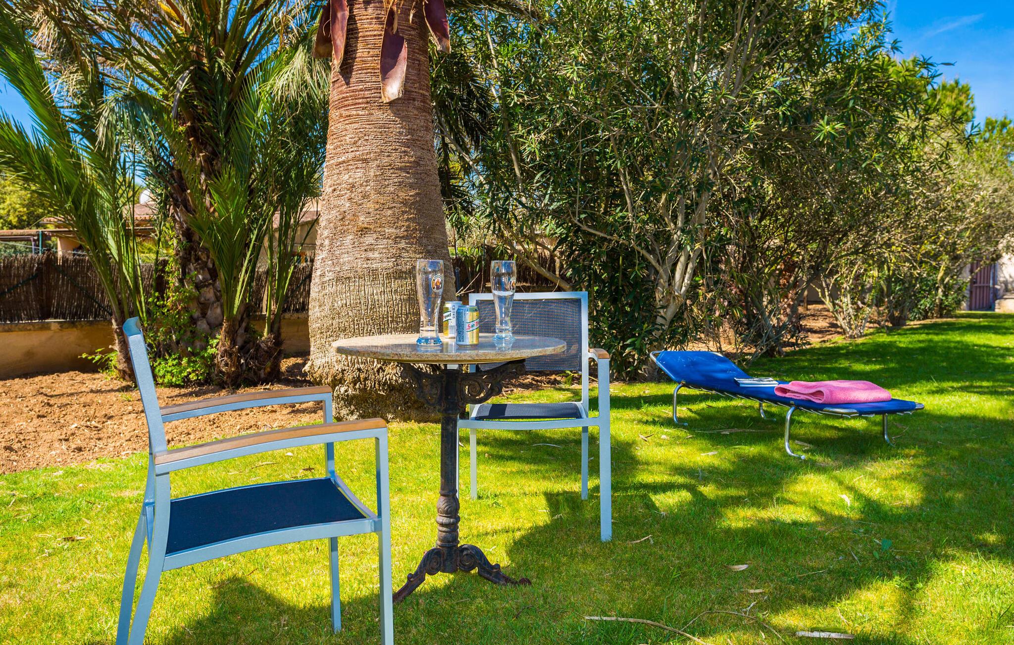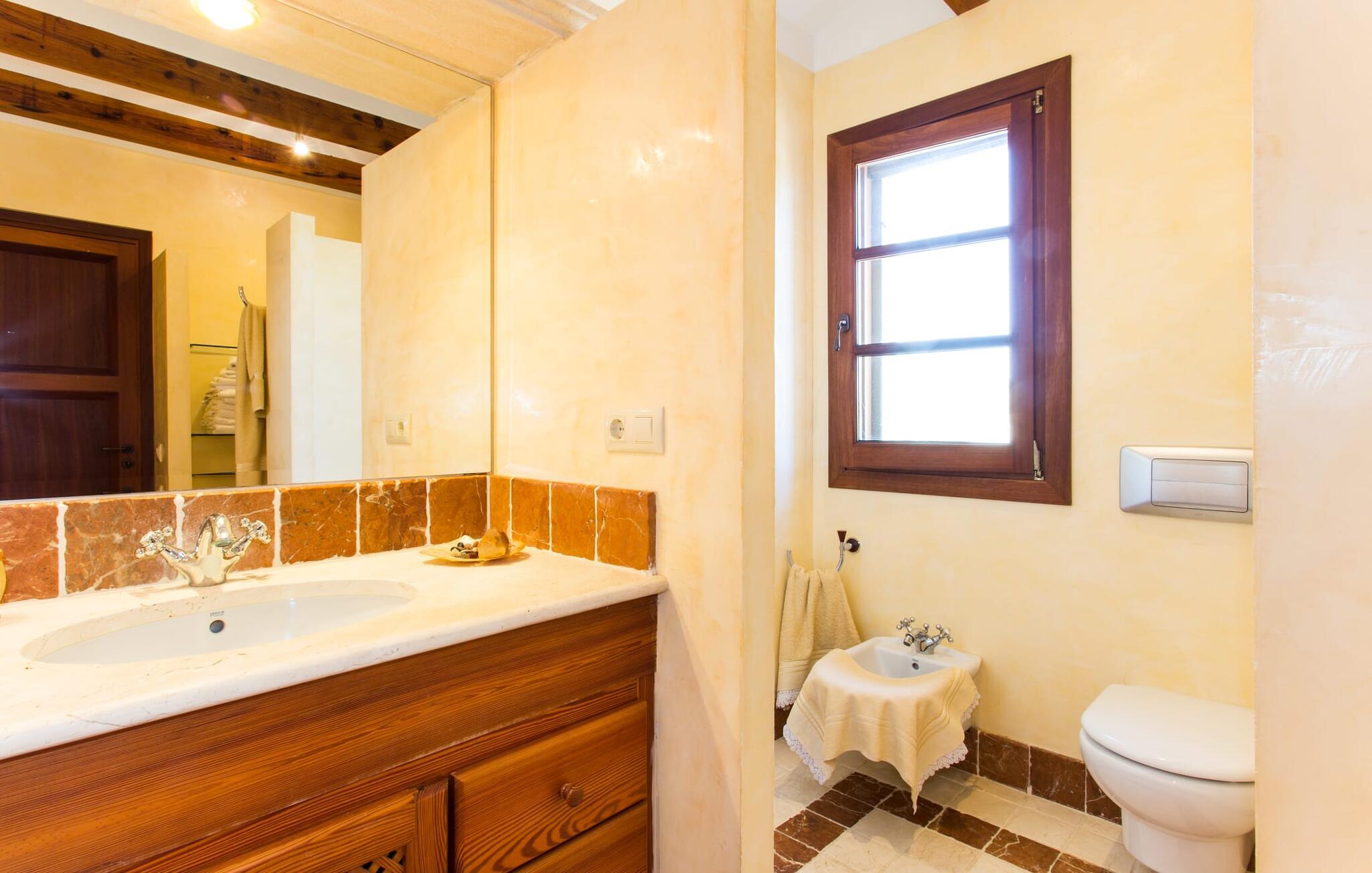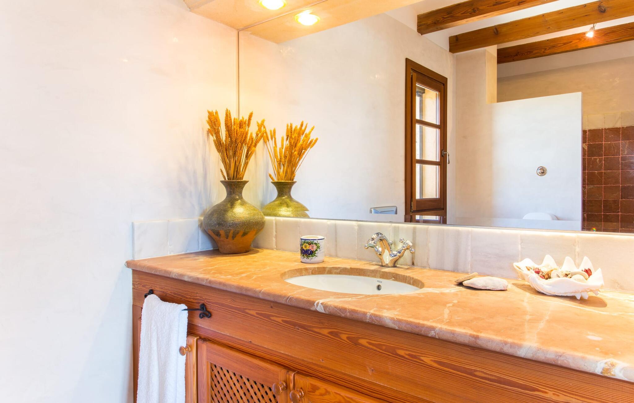 Når I nærmer jer fincaen "Els Mitjans", vil I straks bemærke de høje palmer, der giver de rolige omgivelser et tropisk præg. Den velholdte have har en stor græsplæne, der fører til den elegante, afrundede pool. Det er omgivet af en stor solterrasse med liggestole og tilbyder et perfekt sted at slappe af, svømme eller se børnene plaske rundt. Nyd en betagende udsigt over det bølgende landskab fra poolområdet og fordyb jer i den fredelige landlige atmosfære. Den store terrasse, der strækker sig over to sider af villaen, har to sofagrupper, to spiseborde og masser af plads til udendørs sjov med legetøj til børnene, en trampolin og et bordtennisbord. Til udendørs madlavning er der et skyggefuldt grillområde til rådighed for grillning af lokale råvarer. Til øjeblikke af afslapning er der parasoller og et glasoverdækket område med udtrækkelige parasoller. Indvendigt åbner stuen direkte ud til haven, med smagfuld indretning og pejs til hyggelige aftener. De mallorcanske træbjælker og rustikke fliser skaber en varm, indbydende atmosfære. Det moderne køkken er veludstyret, og spisebordet er kun få skridt væk. Tre soveværelser, herunder et på nederste etage med eget badeværelse, tilbyder komfort og moderne badeværelser. Soveværelserne ovenpå har adgang til tagterrassen med en vidunderlig udsigt. Villaen "Els Mitjans" ligger afsondret på en ejendom på den østlige del af øen, cirka en kilometer fra Artà, hvor et landmandsmarked finder sted om tirsdagen. Strande og byer i den østlige del af øen er nemme at nå herfra. Der er ikke langt til Cala Ratjada, og den velkendte, smukke bugt Cala Torta ligger kun 5 km væk.