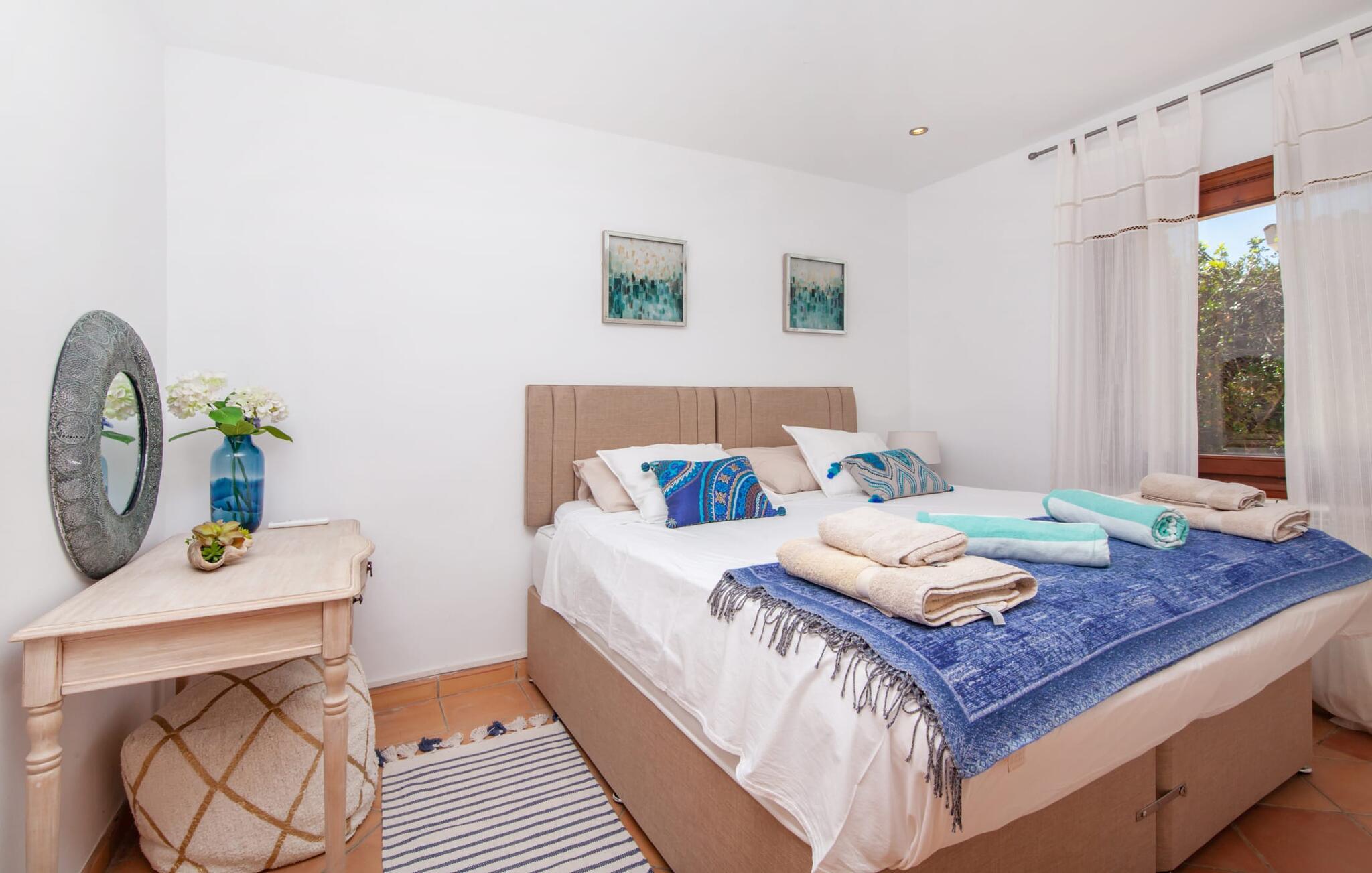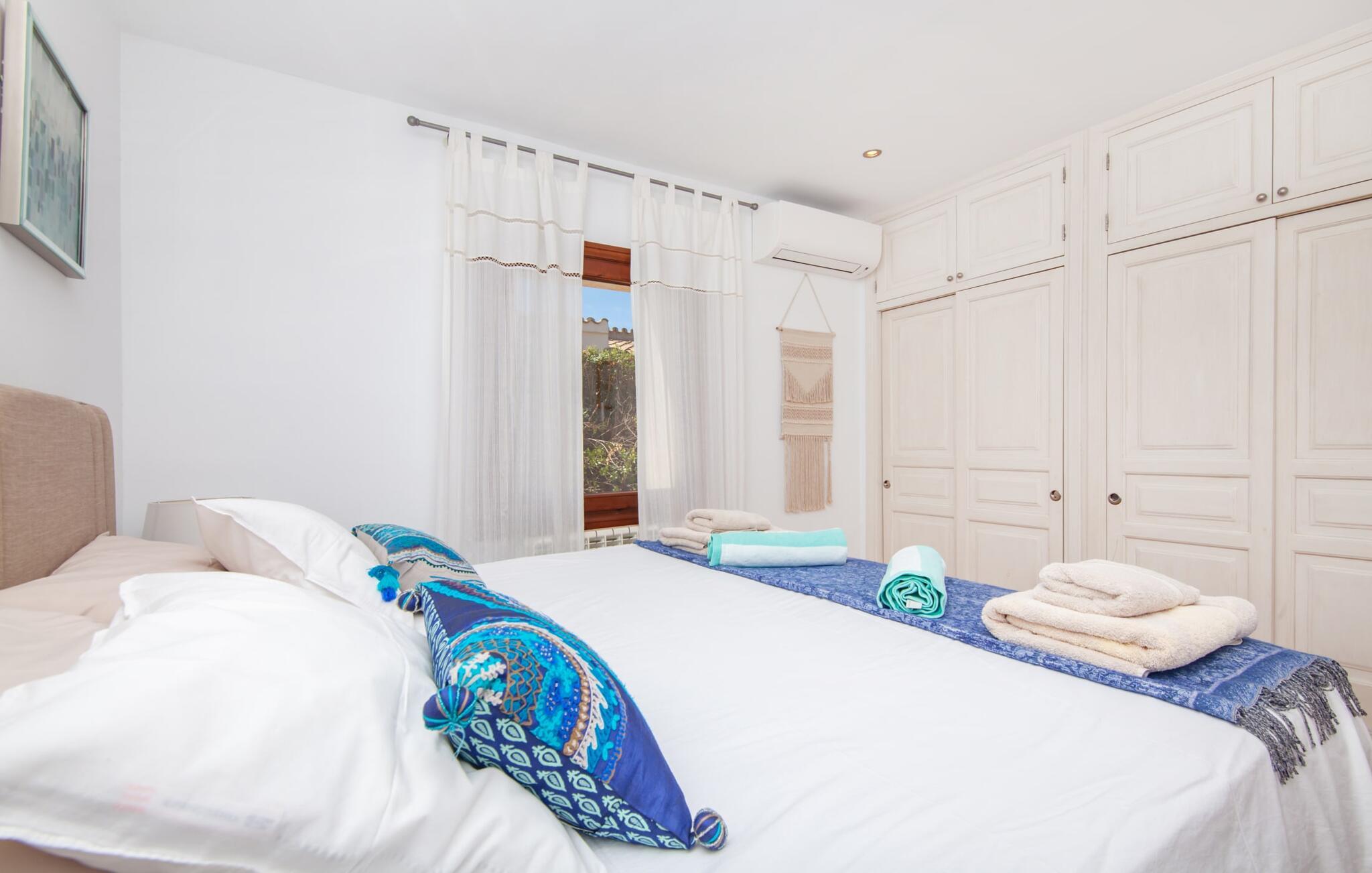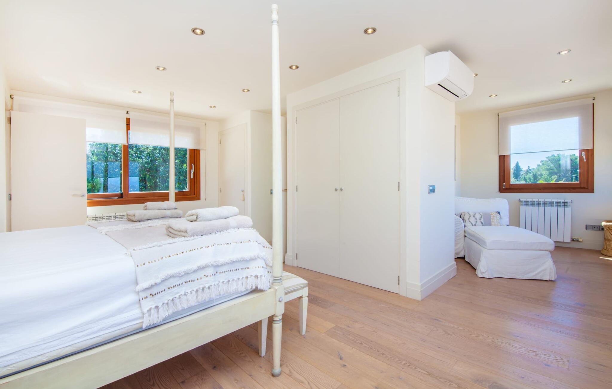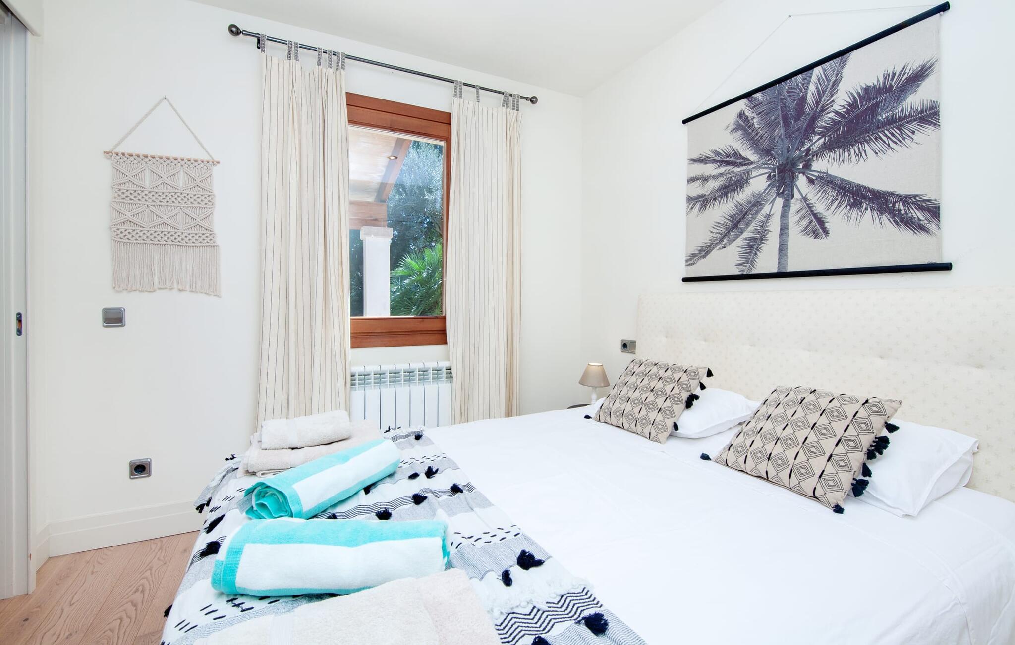 Afslapning blev opfundet i villaen "Elvissa" af høj kvalitet. Den privilegerede beliggenhed i Cielo de Bonaire, der betragtes som en fornem forstad til Alcúdia, bidrager bestemt til følelsen af paradis. Det vidunderligt smukke feriehus, beliggende på næsset mellem bugterne Pollença og Alcúdia, skinner med sin nærhed til den populære badeby. Samtidig grænser den utroligt smukke ejendom op til Cap de Pinars naturlige landskab. Dette er særligt attraktivt, men ikke kun for golfspillere, vandrere og havelskere. Bagefter kan I slappe af i den smukt anlagte have med pool og græsplæne. Denne ekstremt private, grønne oase afspejler den frodige Middelhavsflora, som Mallorca har at byde på. Ud over solrige og naturligt skyggefulde, kølige, møblerede steder at slappe af, forstærker udekøkkenet med grill og barfølelse den afslappede feriefølelse. To overdækkede terrasser med en chill-out lounge og udendørs spiseplads fuldender ensemblet. Kompleksiteten af denne førsteklasses ferieejendom er også tydelig i det perfekt designede interiør. Den succesrige blanding af moderne landstedskomfort og innovativ pragmatisme er overbevisende. “Elvissa”-villaen skærper jeres sanser og forkæler jer, fordi der er så mange små og omhyggeligt placerede indretningsdetaljer at opdage, som i sidste ende skaber et komplet billede af harmoni. Dette er allerede tydeligt i den rummelige spisestue. Mares-sten af høj kvalitet indrammer pejseområdet integreret her. Det moderne køkken med et bryggers bagved tilbyder den tekniske komfort, I ønsker, og ikke kun i feriesæsonen. Den lyse stue med udgang til terrassen ligger i en forskudt del. De rummelige værelser med aircondition er også placeret lidt fra hinanden - ideelle til at rejse med to familier eller vennepar. I vil også finde sans for detaljer i indretningen af afslapningsrummene og de fire rummelige badeværelser. Villaens individualitet forbliver altid reserveret og har et uhøjtideligt, puristisk udseende. "Elvissa" opfylder ubesværet kravet om, at gæster føler sig hjemme året rundt og vil helt sikkert glæde jer lige så meget som vi gør. Den moderne villa "Elvissa" imponerer med en smuk, ugeneret have med pool, udekøkken, overdækket terrasse og bord Ejendommen er beliggende i den værdige urbanisering Cielo de Bonaire og ligger på næsset mellem bugterne ved Pollença og Alcúdia. Shopping og alligevel direkte på stranden Lev i naturens puls Der er adskillige strande at vælge imellem, som kan nås inden for 10 minutter i bil.