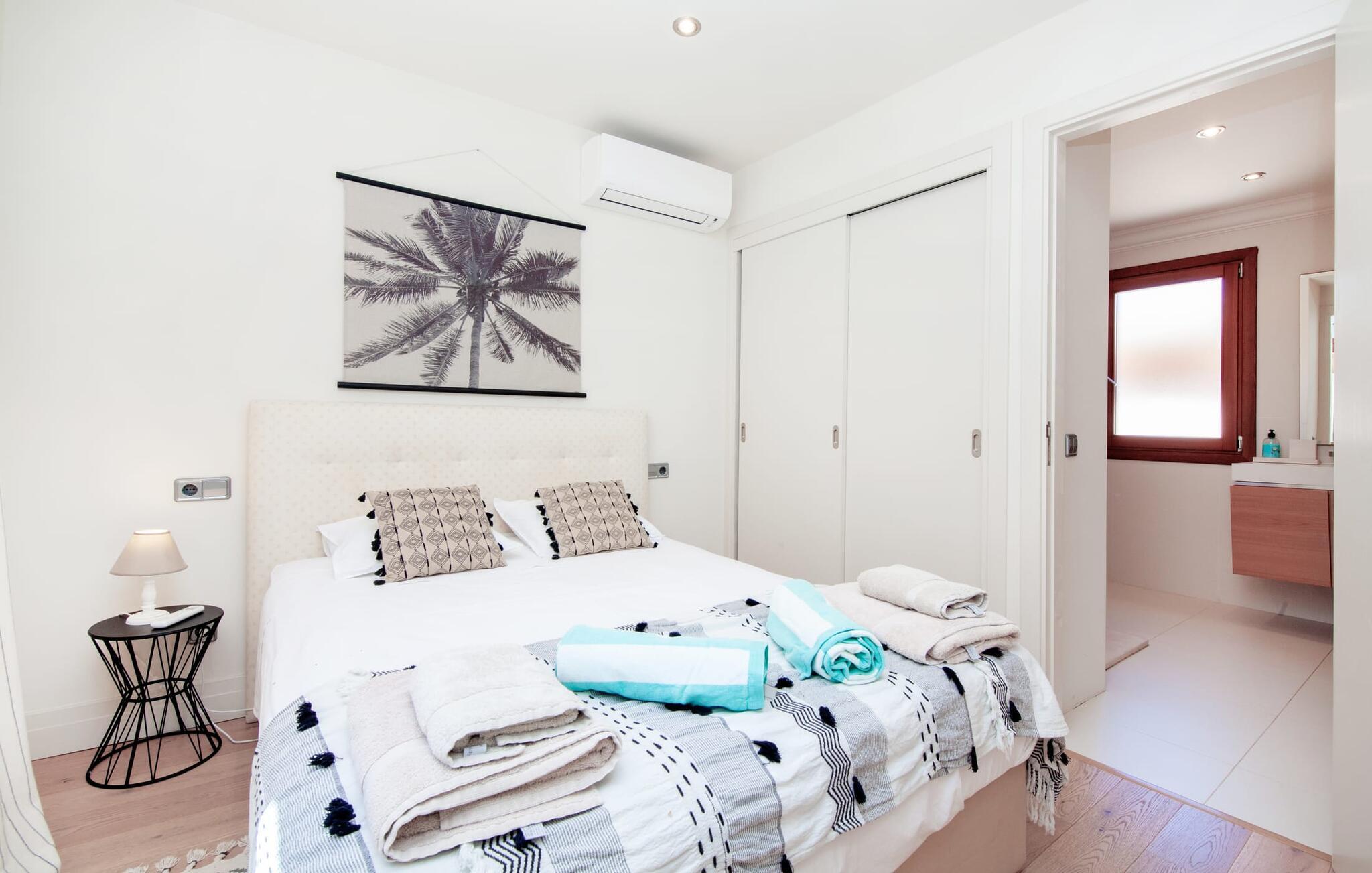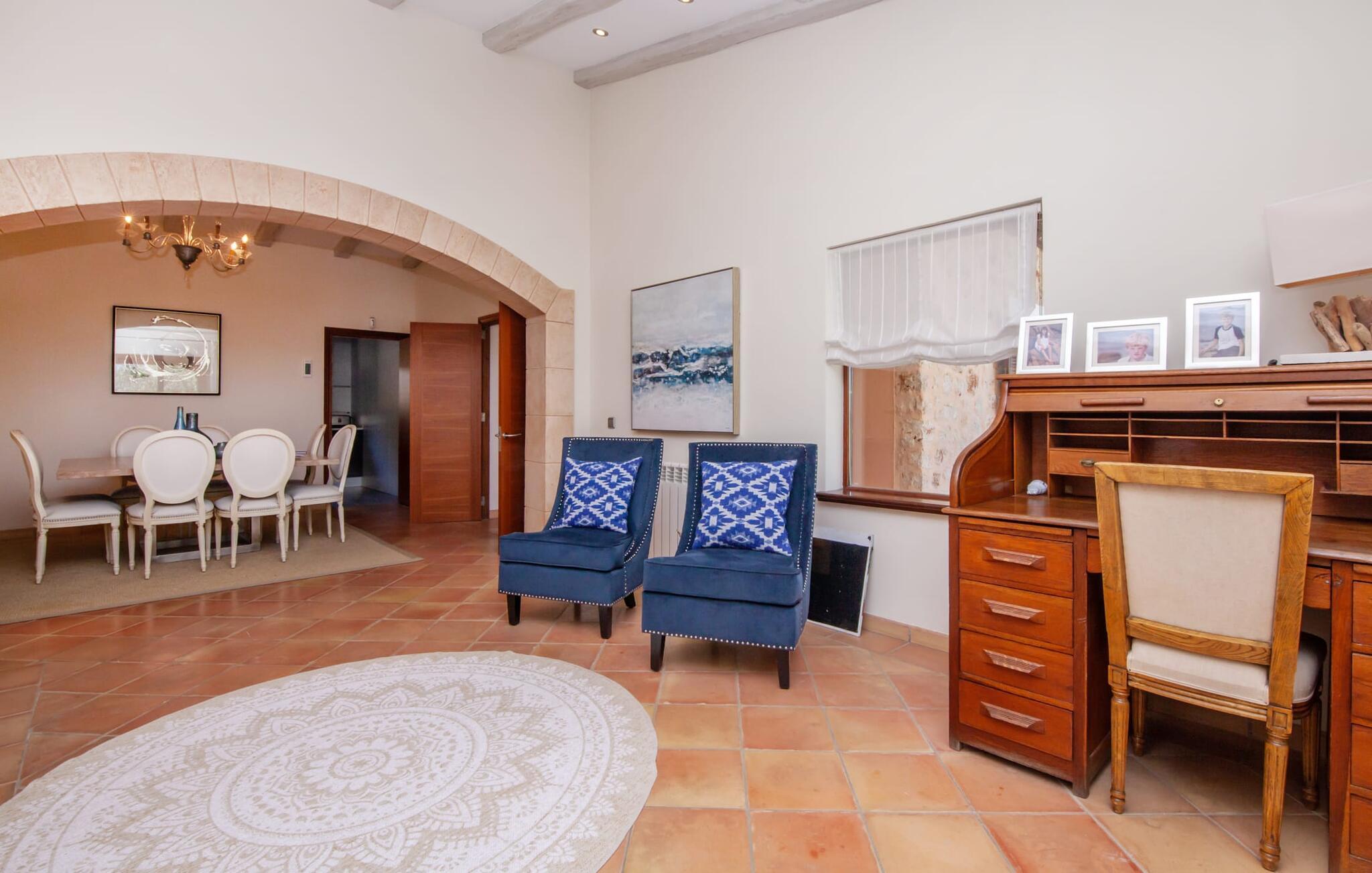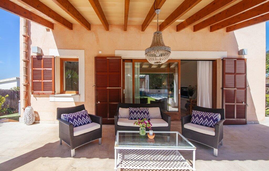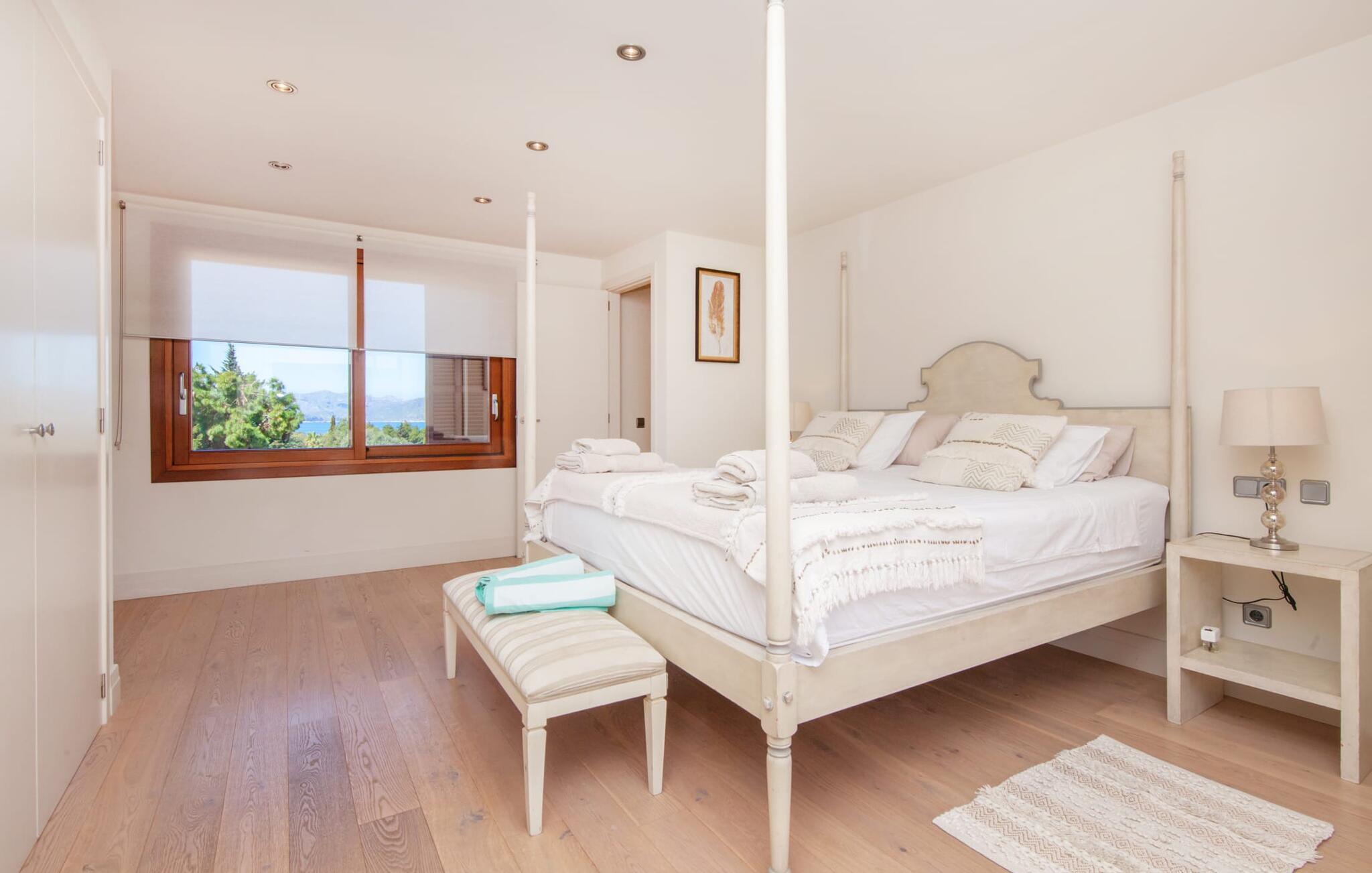 Afslapning blev opfundet i villaen "Elvissa" af høj kvalitet. Den privilegerede beliggenhed i Cielo de Bonaire, der betragtes som en fornem forstad til Alcúdia, bidrager bestemt til følelsen af paradis. Det vidunderligt smukke feriehus, beliggende på næsset mellem bugterne Pollença og Alcúdia, skinner med sin nærhed til den populære badeby. Samtidig grænser den utroligt smukke ejendom op til Cap de Pinars naturlige landskab. Dette er særligt attraktivt, men ikke kun for golfspillere, vandrere og havelskere. Bagefter kan I slappe af i den smukt anlagte have med pool og græsplæne. Denne ekstremt private, grønne oase afspejler den frodige Middelhavsflora, som Mallorca har at byde på. Ud over solrige og naturligt skyggefulde, kølige, møblerede steder at slappe af, forstærker udekøkkenet med grill og barfølelse den afslappede feriefølelse. To overdækkede terrasser med en chill-out lounge og udendørs spiseplads fuldender ensemblet. Kompleksiteten af denne førsteklasses ferieejendom er også tydelig i det perfekt designede interiør. Den succesrige blanding af moderne landstedskomfort og innovativ pragmatisme er overbevisende. “Elvissa”-villaen skærper jeres sanser og forkæler jer, fordi der er så mange små og omhyggeligt placerede indretningsdetaljer at opdage, som i sidste ende skaber et komplet billede af harmoni. Dette er allerede tydeligt i den rummelige spisestue. Mares-sten af høj kvalitet indrammer pejseområdet integreret her. Det moderne køkken med et bryggers bagved tilbyder den tekniske komfort, I ønsker, og ikke kun i feriesæsonen. Den lyse stue med udgang til terrassen ligger i en forskudt del. De rummelige værelser med aircondition er også placeret lidt fra hinanden - ideelle til at rejse med to familier eller vennepar. I vil også finde sans for detaljer i indretningen af afslapningsrummene og de fire rummelige badeværelser. Villaens individualitet forbliver altid reserveret og har et uhøjtideligt, puristisk udseende. "Elvissa" opfylder ubesværet kravet om, at gæster føler sig hjemme året rundt og vil helt sikkert glæde jer lige så meget som vi gør. Den moderne villa "Elvissa" imponerer med en smuk, ugeneret have med pool, udekøkken, overdækket terrasse og bord Ejendommen er beliggende i den værdige urbanisering Cielo de Bonaire og ligger på næsset mellem bugterne ved Pollença og Alcúdia. Shopping og alligevel direkte på stranden Lev i naturens puls Der er adskillige strande at vælge imellem, som kan nås inden for 10 minutter i bil.