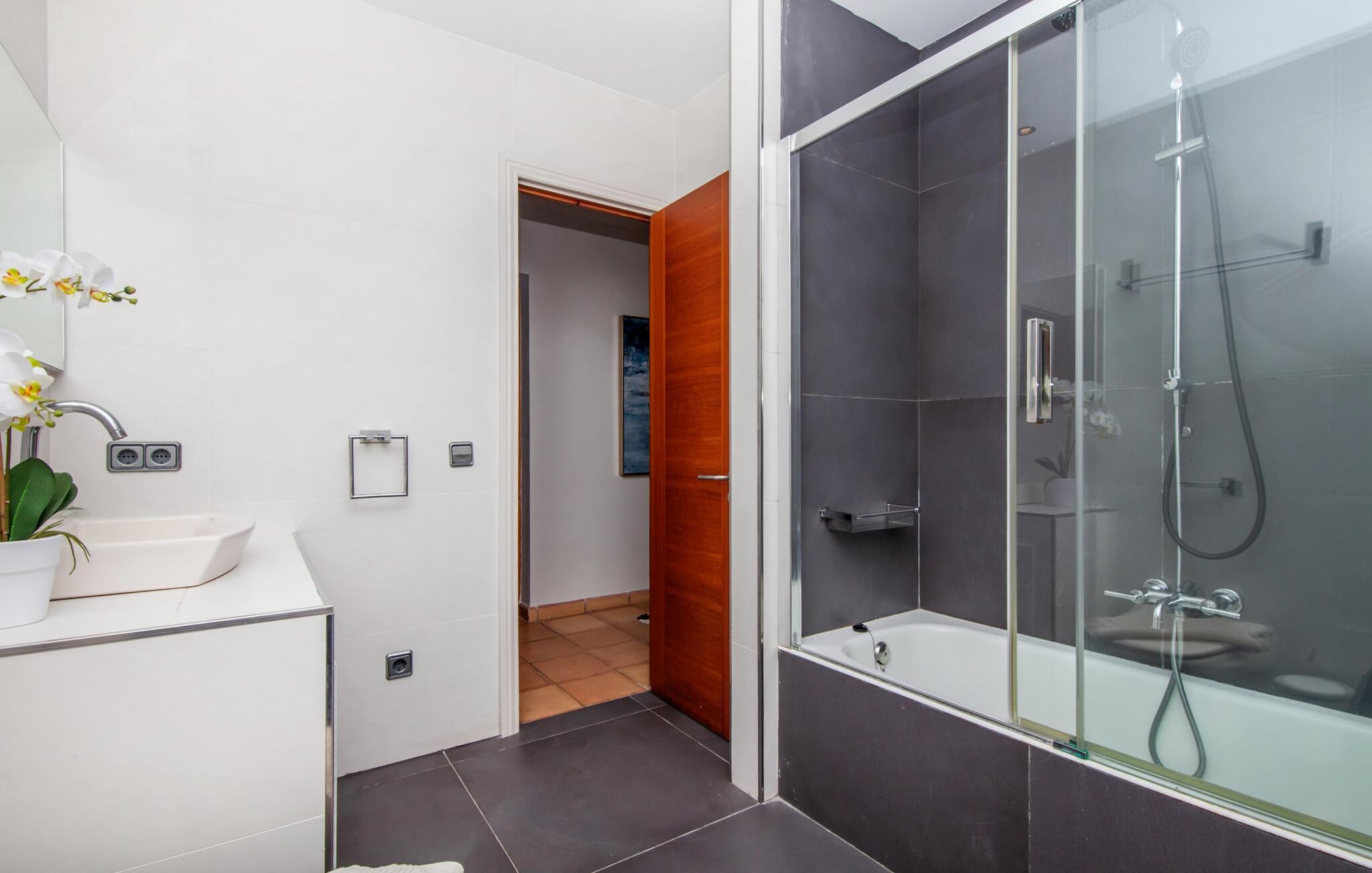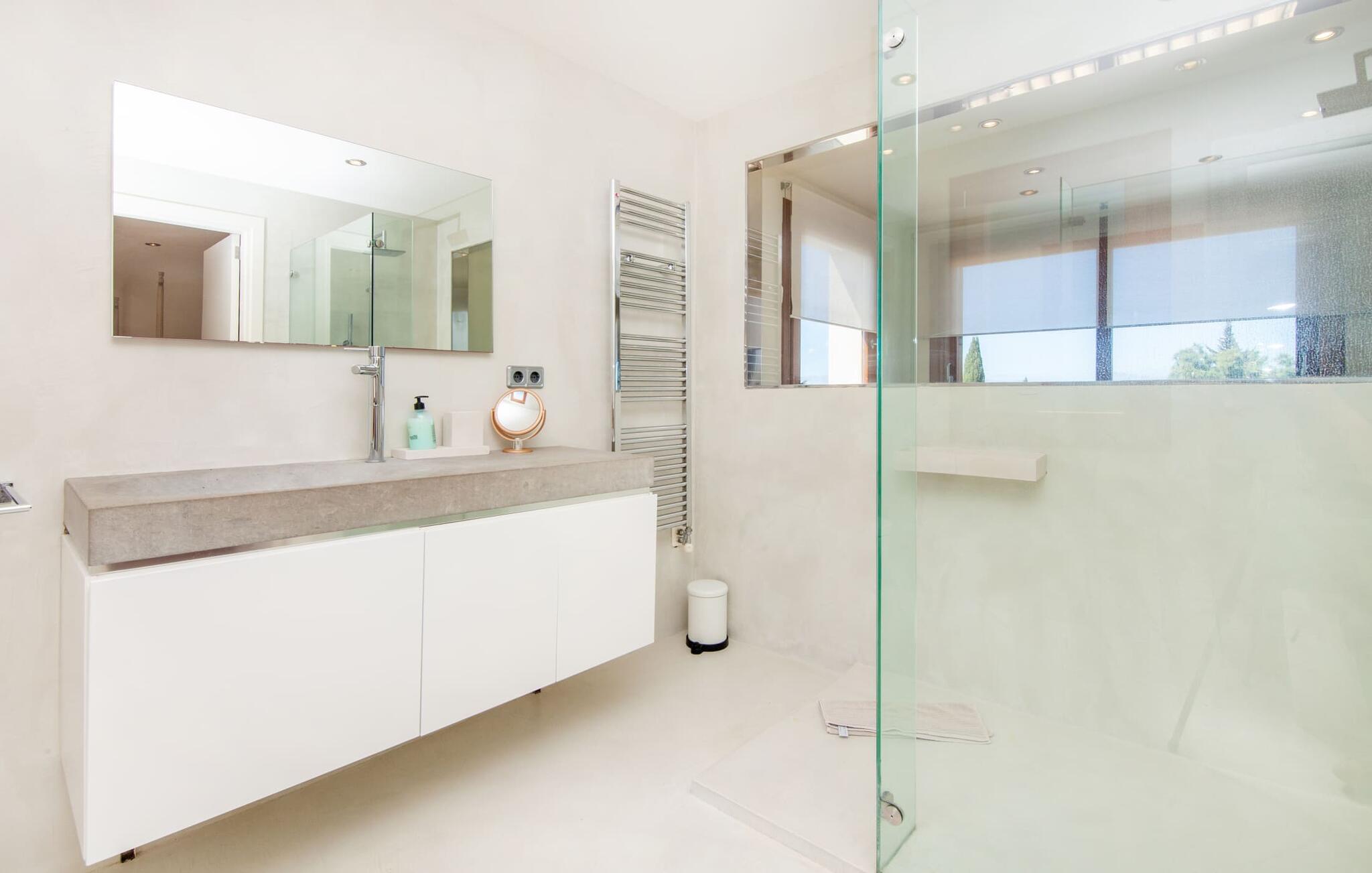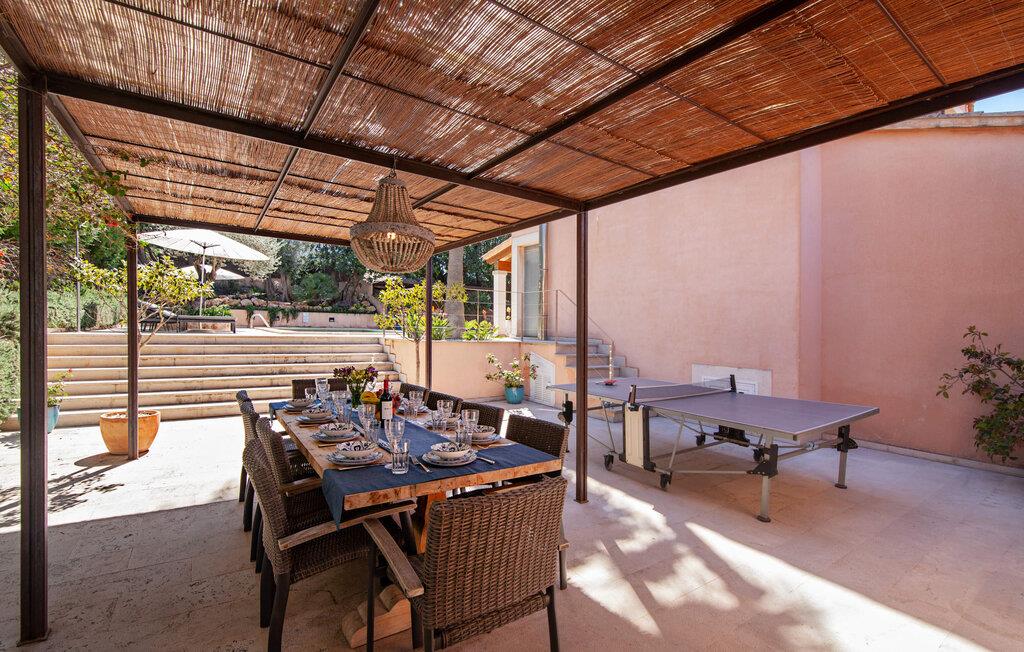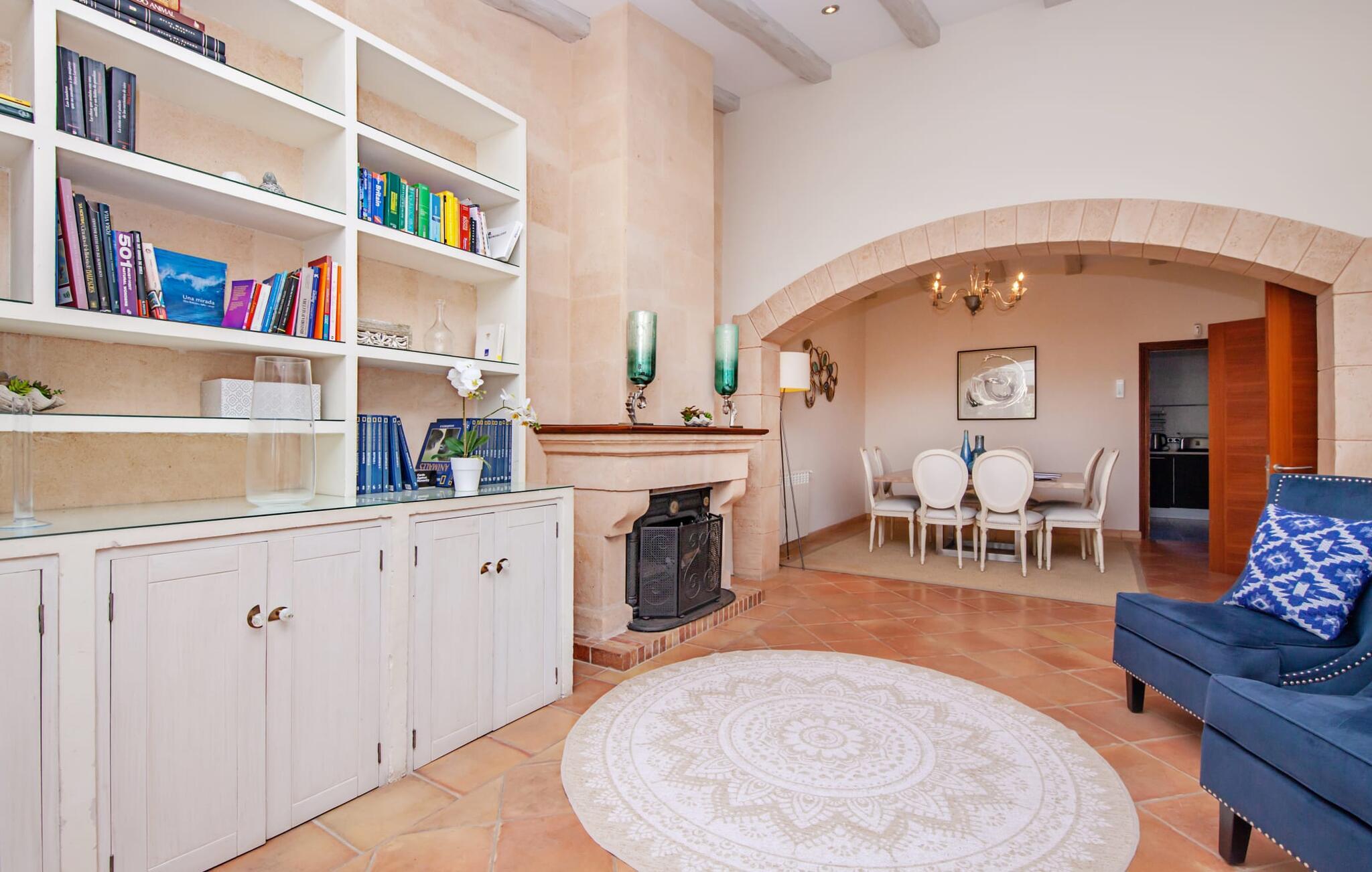 Afslapning blev opfundet i villaen "Elvissa" af høj kvalitet. Den privilegerede beliggenhed i Cielo de Bonaire, der betragtes som en fornem forstad til Alcúdia, bidrager bestemt til følelsen af paradis. Det vidunderligt smukke feriehus, beliggende på næsset mellem bugterne Pollença og Alcúdia, skinner med sin nærhed til den populære badeby. Samtidig grænser den utroligt smukke ejendom op til Cap de Pinars naturlige landskab. Dette er særligt attraktivt, men ikke kun for golfspillere, vandrere og havelskere. Bagefter kan I slappe af i den smukt anlagte have med pool og græsplæne. Denne ekstremt private, grønne oase afspejler den frodige Middelhavsflora, som Mallorca har at byde på. Ud over solrige og naturligt skyggefulde, kølige, møblerede steder at slappe af, forstærker udekøkkenet med grill og barfølelse den afslappede feriefølelse. To overdækkede terrasser med en chill-out lounge og udendørs spiseplads fuldender ensemblet. Kompleksiteten af denne førsteklasses ferieejendom er også tydelig i det perfekt designede interiør. Den succesrige blanding af moderne landstedskomfort og innovativ pragmatisme er overbevisende. “Elvissa”-villaen skærper jeres sanser og forkæler jer, fordi der er så mange små og omhyggeligt placerede indretningsdetaljer at opdage, som i sidste ende skaber et komplet billede af harmoni. Dette er allerede tydeligt i den rummelige spisestue. Mares-sten af høj kvalitet indrammer pejseområdet integreret her. Det moderne køkken med et bryggers bagved tilbyder den tekniske komfort, I ønsker, og ikke kun i feriesæsonen. Den lyse stue med udgang til terrassen ligger i en forskudt del. De rummelige værelser med aircondition er også placeret lidt fra hinanden - ideelle til at rejse med to familier eller vennepar. I vil også finde sans for detaljer i indretningen af afslapningsrummene og de fire rummelige badeværelser. Villaens individualitet forbliver altid reserveret og har et uhøjtideligt, puristisk udseende. "Elvissa" opfylder ubesværet kravet om, at gæster føler sig hjemme året rundt og vil helt sikkert glæde jer lige så meget som vi gør. Den moderne villa "Elvissa" imponerer med en smuk, ugeneret have med pool, udekøkken, overdækket terrasse og bord Ejendommen er beliggende i den værdige urbanisering Cielo de Bonaire og ligger på næsset mellem bugterne ved Pollença og Alcúdia. Shopping og alligevel direkte på stranden Lev i naturens puls Der er adskillige strande at vælge imellem, som kan nås inden for 10 minutter i bil.