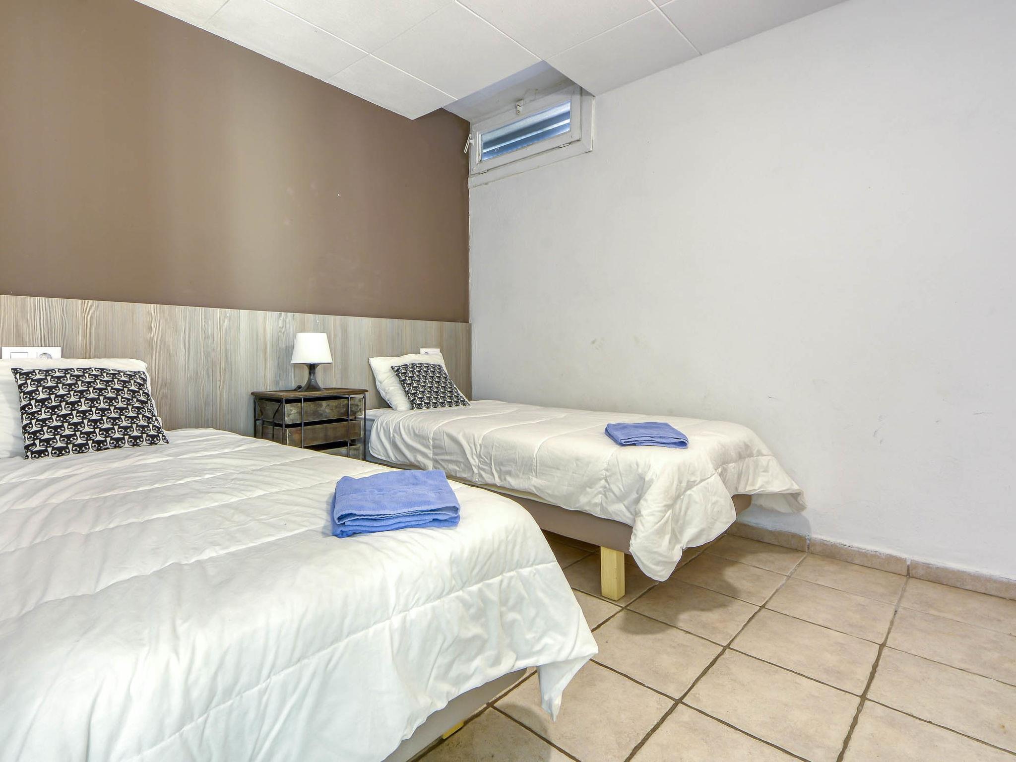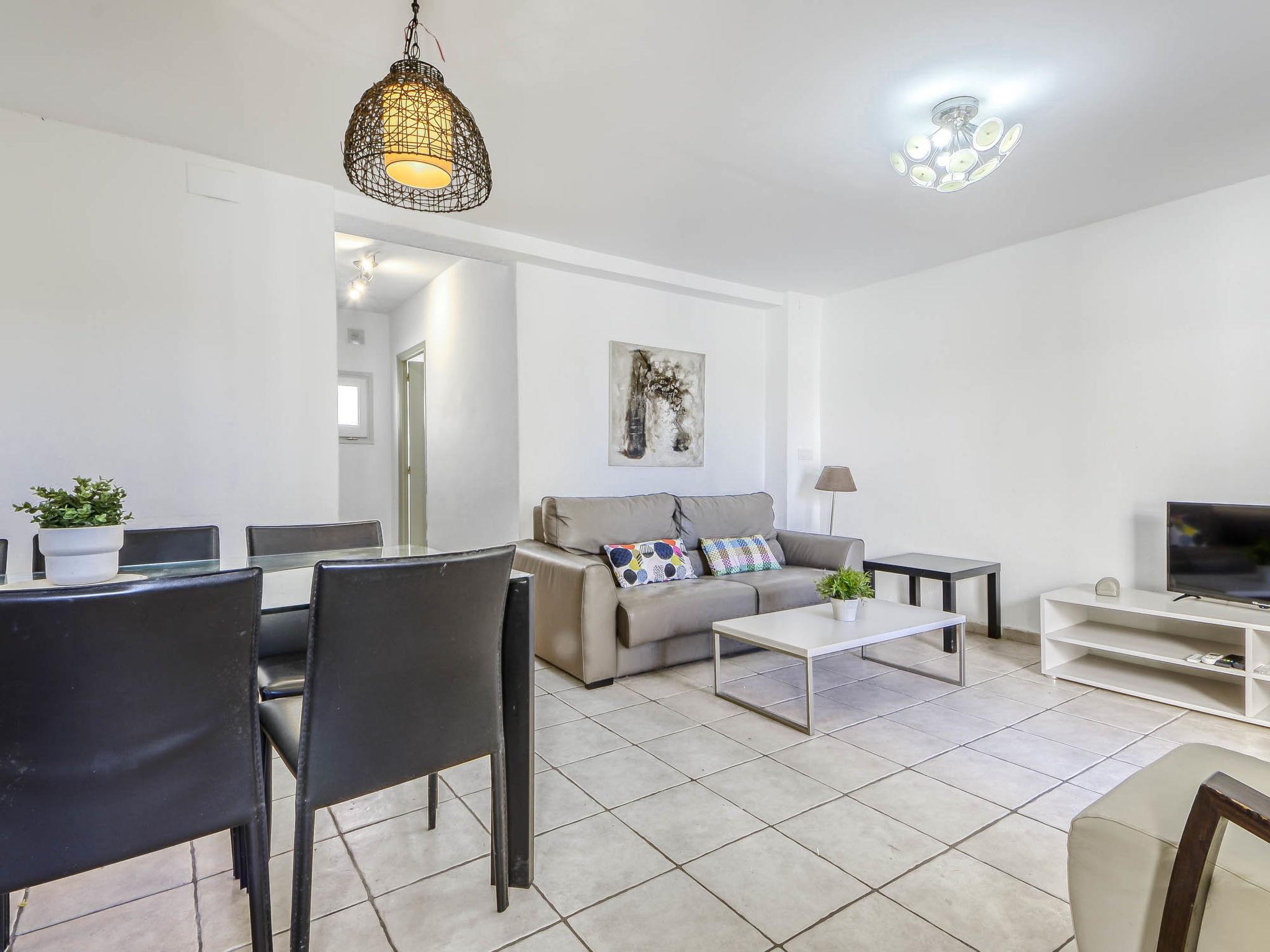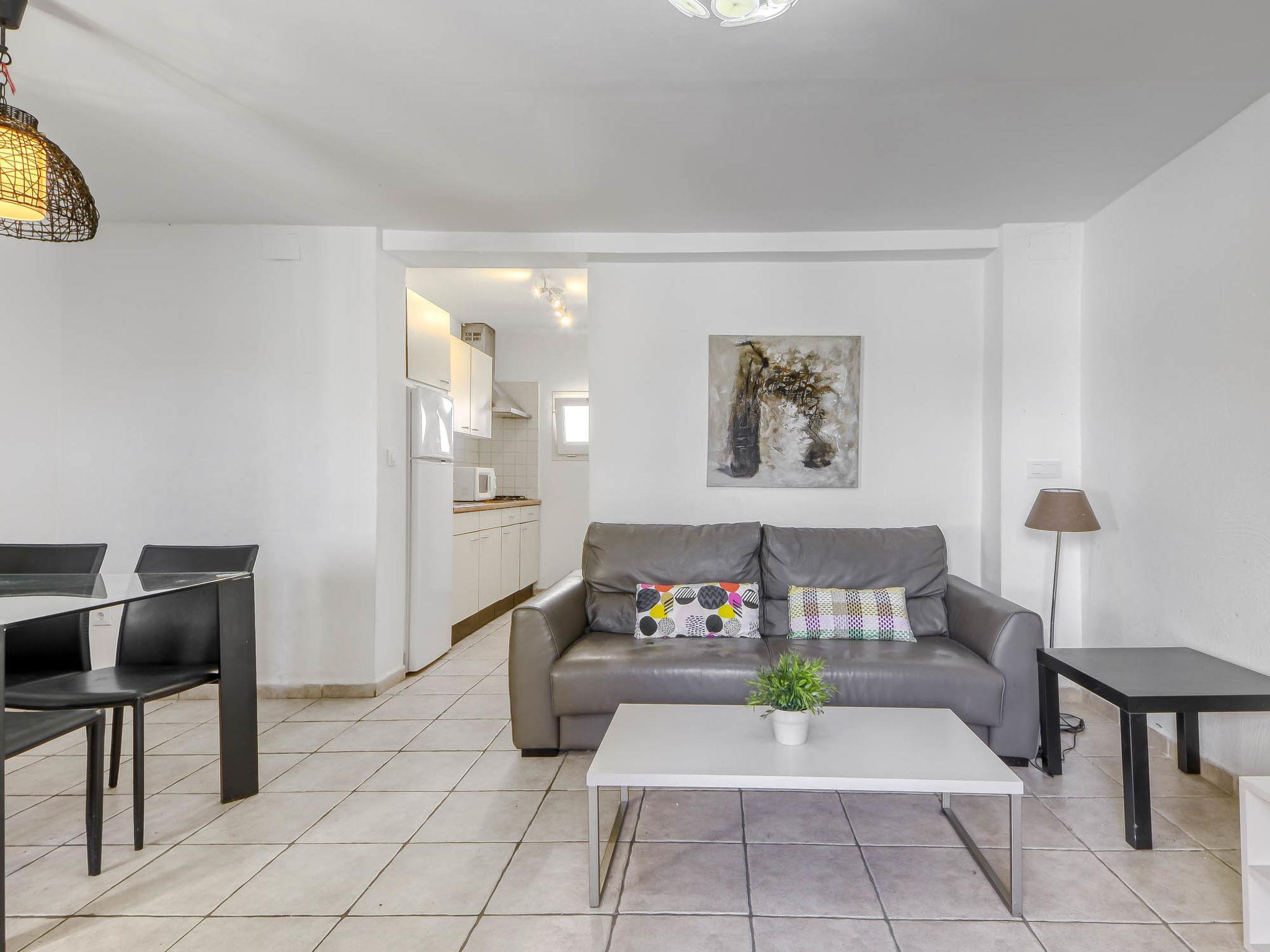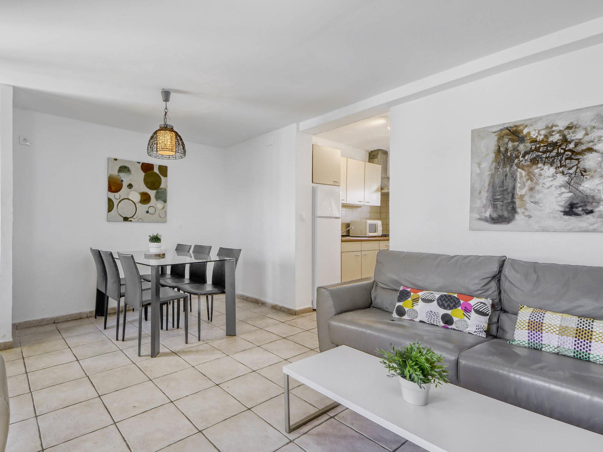 3-room apartment 51 m2, lower ground floor. Practical furnishings: living/dining room with 1 sofabed, dining table, satellite TV, air conditioning and forced-air heating. Exit to the terrace. 1 room, without window with 2 beds (90 cm, length 190 cm), fan. 1 room with 1 french bed (150 cm, length 190 cm), fan. Open kitchen (4 gas rings, toaster, kettle, microwave, freezer, electric coffee machine). Shower/WC. Terrace 6 m2. Terrace furniture. View of the swimming pool and the garden. Facilities: washing machine, iron, hair dryer. Internet (WiFi, free). Please note: non-smokers only. HUTG-013987 // Reg. Nr.: ESFCTU00001702000007769700000000000000000HUTG-0139871