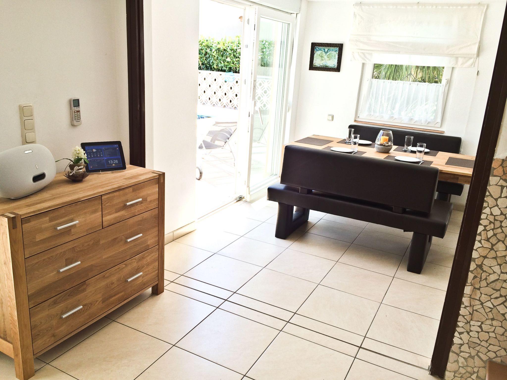 The outside area was renovated in 2023, in addition to new plastering and painting, our house has also been fitted with new sun protection. A barbecue area, a large fenced plot with 2 parking spaces, even for large cars, and plenty of space on the pool terrace round off the offer. If you want to enjoy the view in peace, you can make yourself comfortable on our terraces above the roofs of Empuriabrava. An outdoor shower with hot and cold water and 6 new sun loungers await your visit.