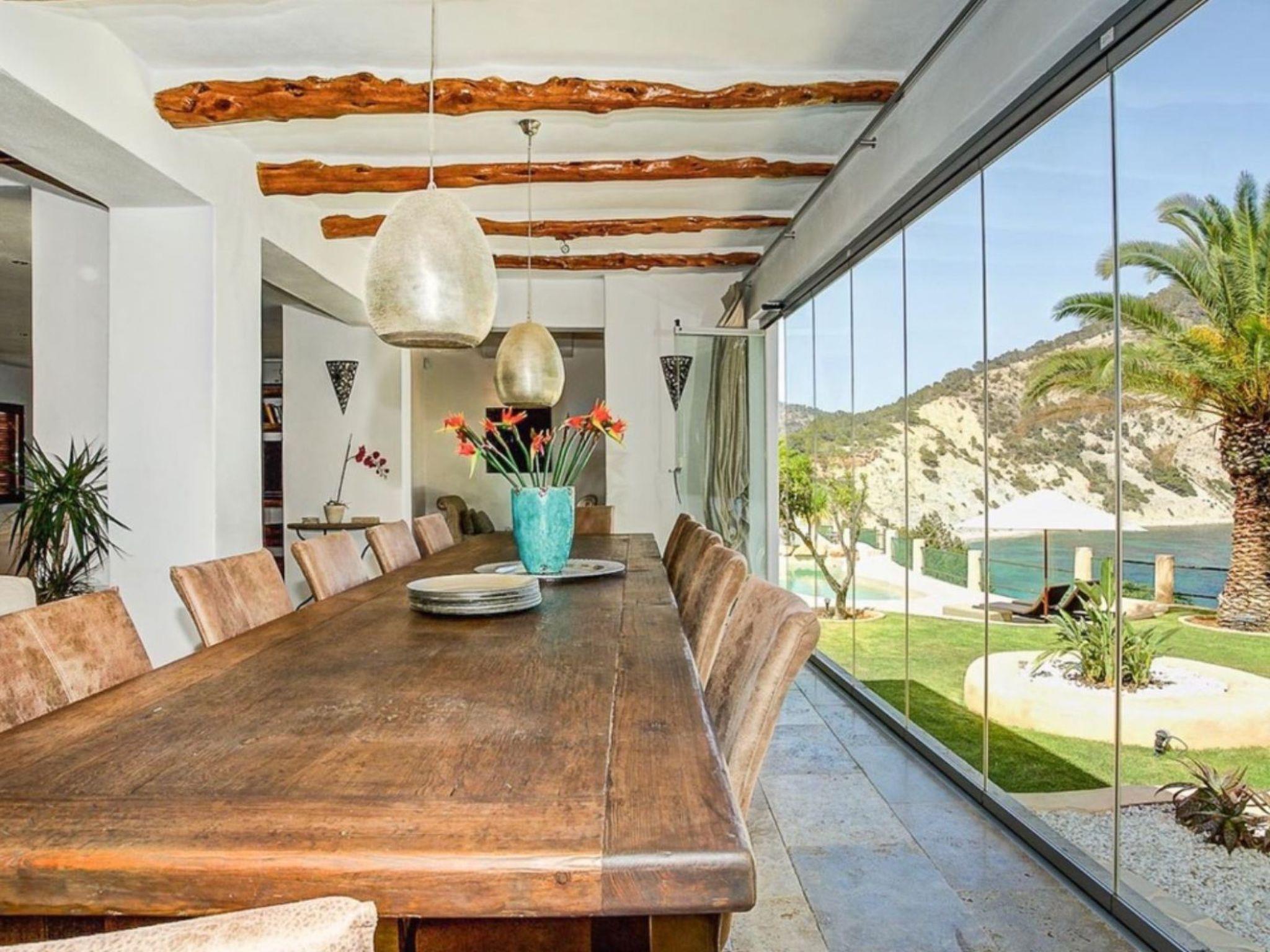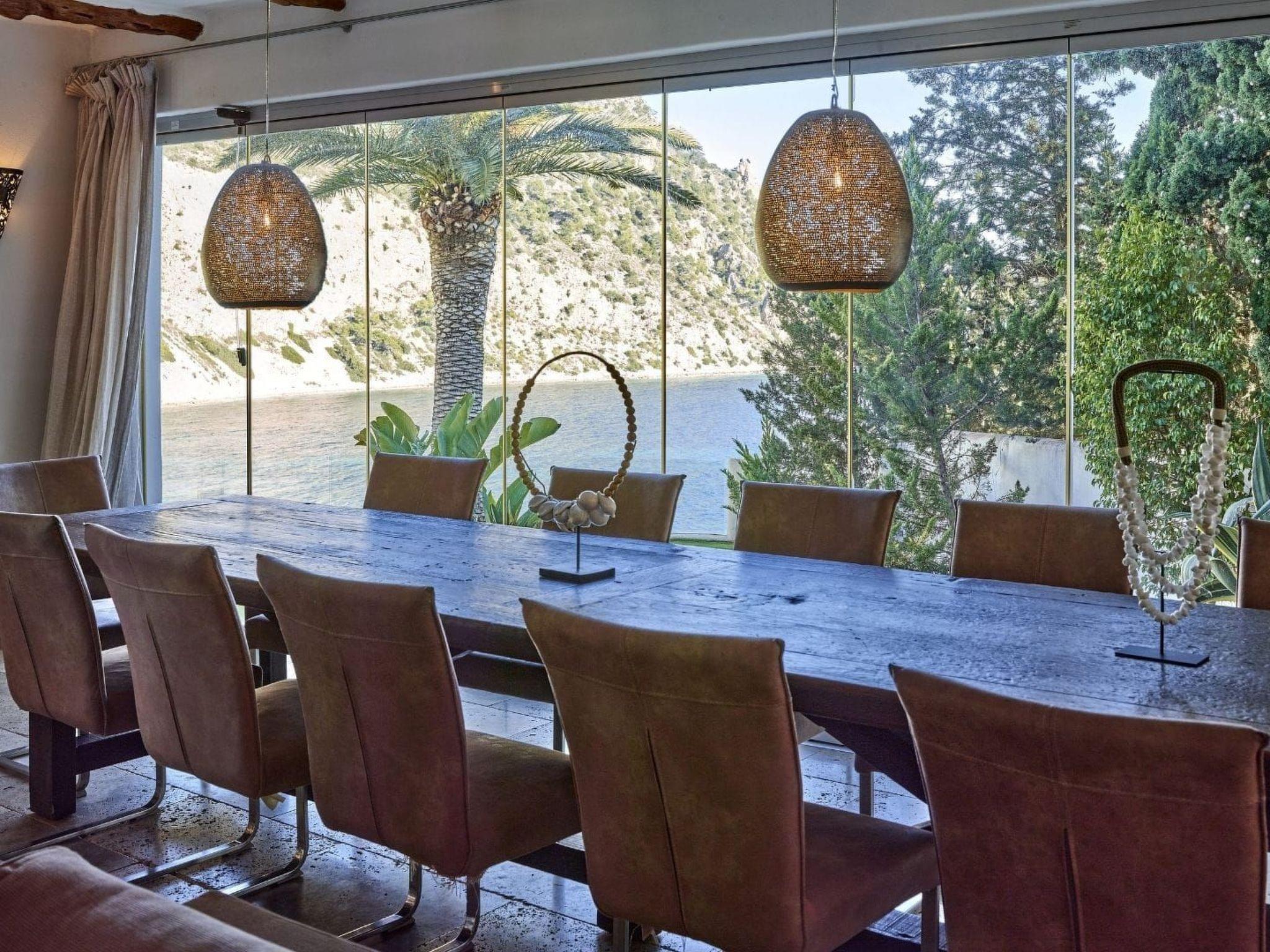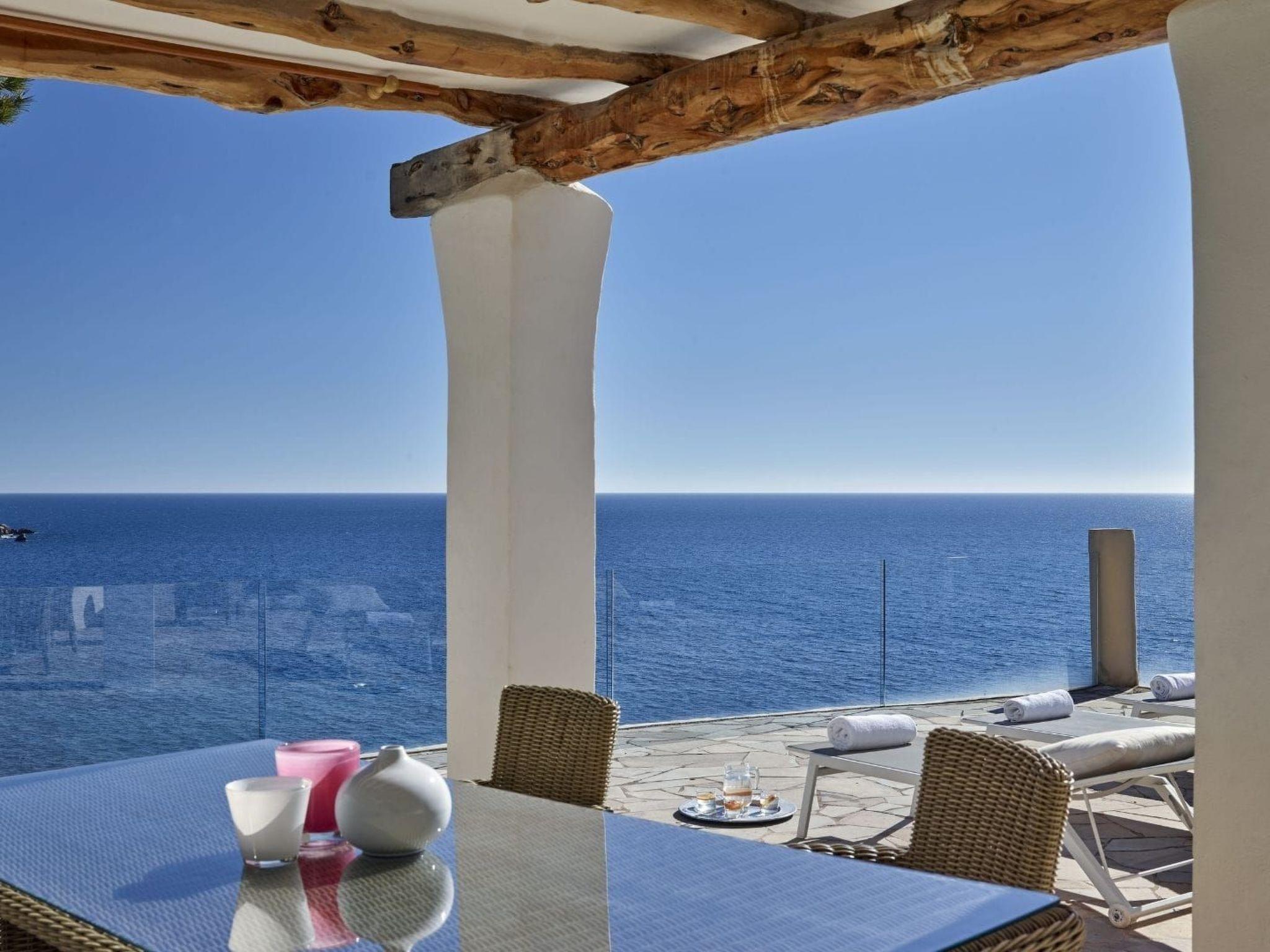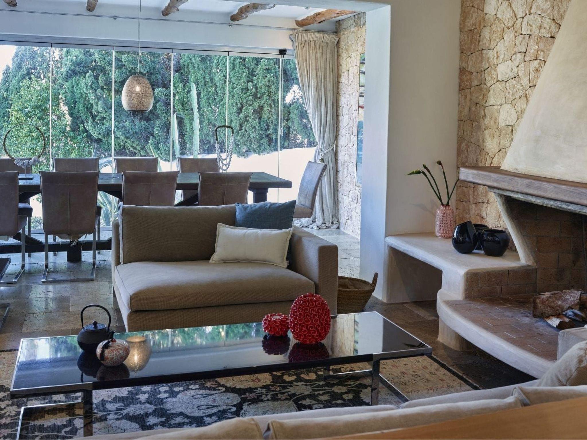The large living area consists of an open-plan living room, dining area and kitchen. The living room has two chill-out areas with sofas: one surrounding the charming fireplace, and the other adjacent to the dining area. From here, the entire windowed wall allows you to enjoy an incredible panoramic view of the coast and the sea.