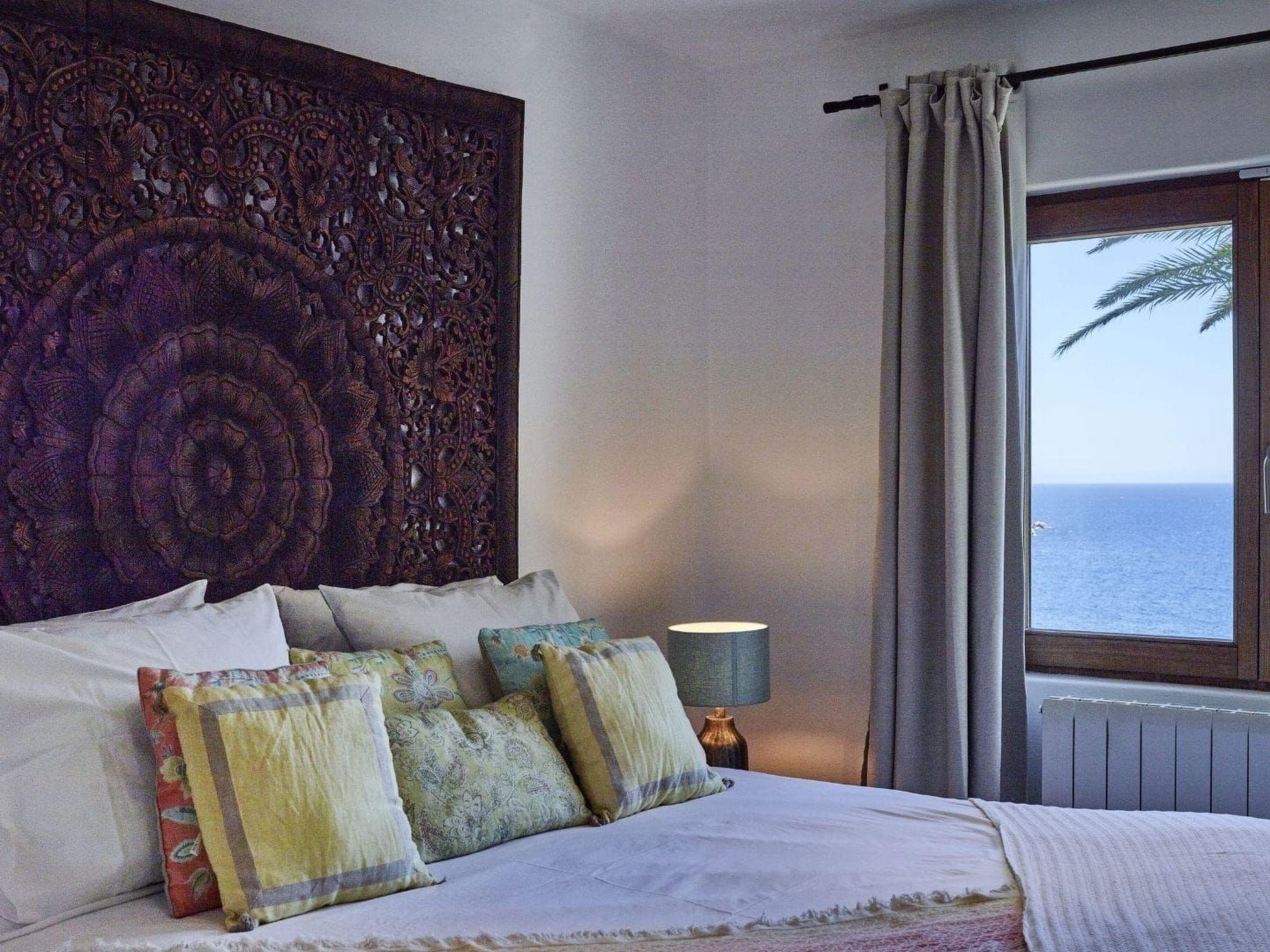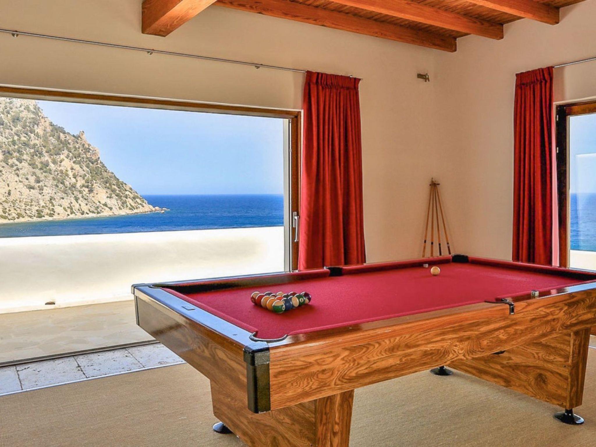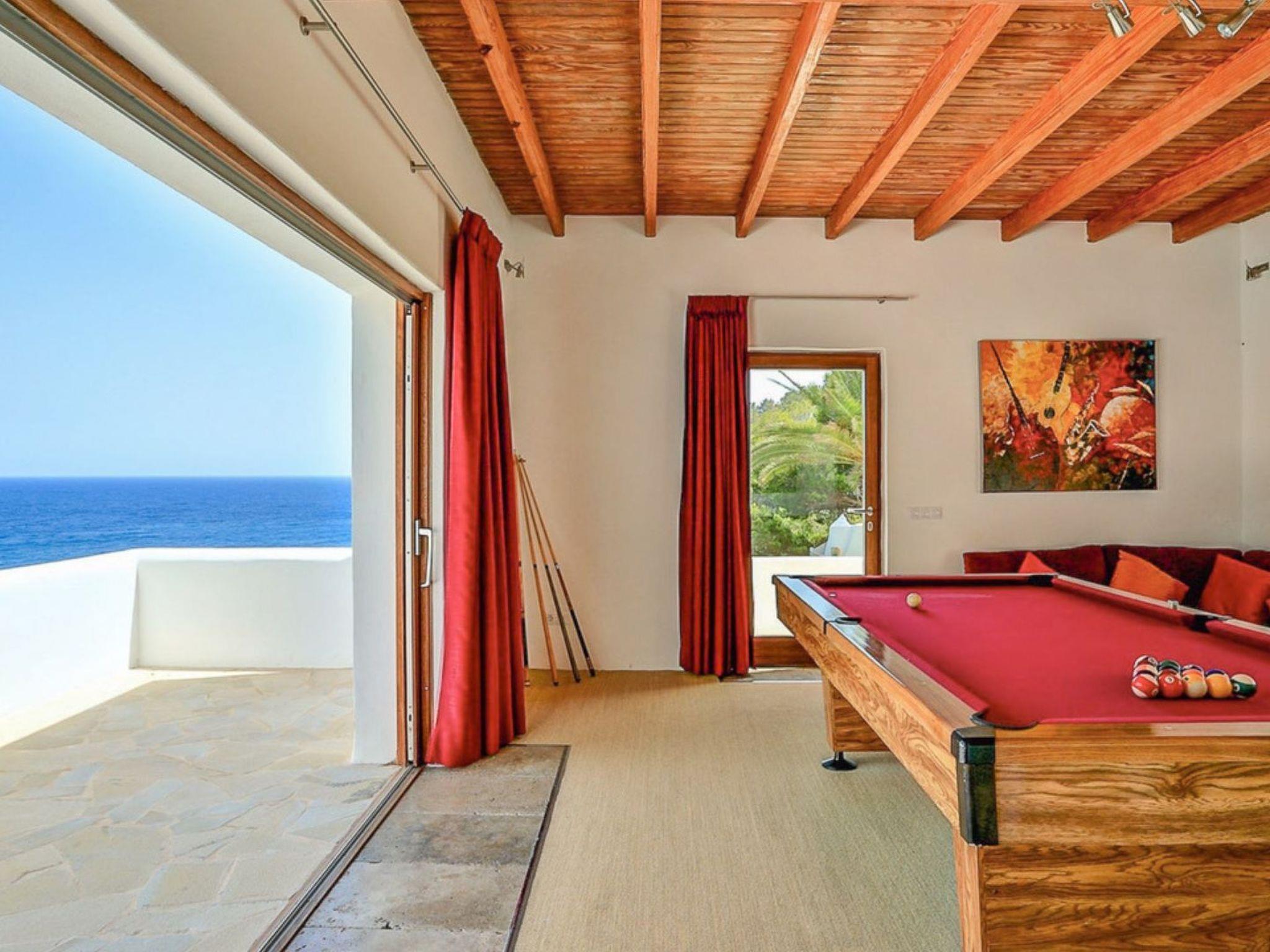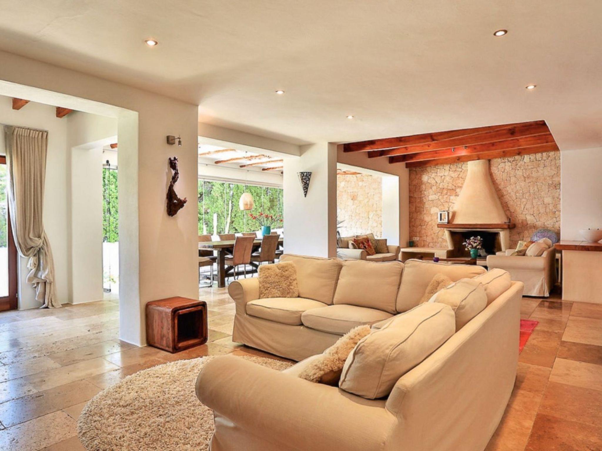 The large living area consists of an open-plan living room, dining area and kitchen. The living room has two chill-out areas with sofas: one surrounding the charming fireplace, and the other adjacent to the dining area. From here, the entire windowed wall allows you to enjoy an incredible panoramic view of the coast and the sea.
