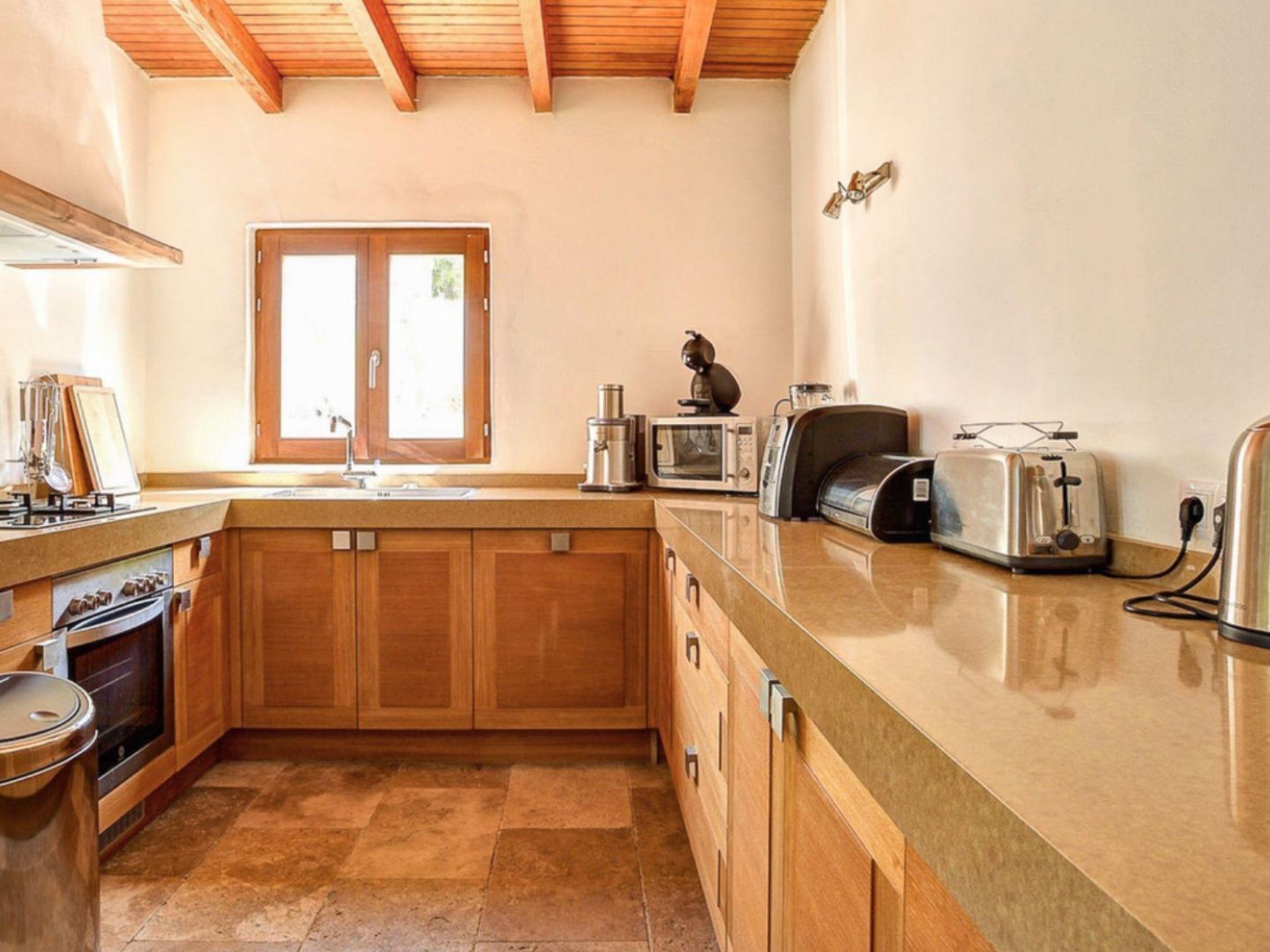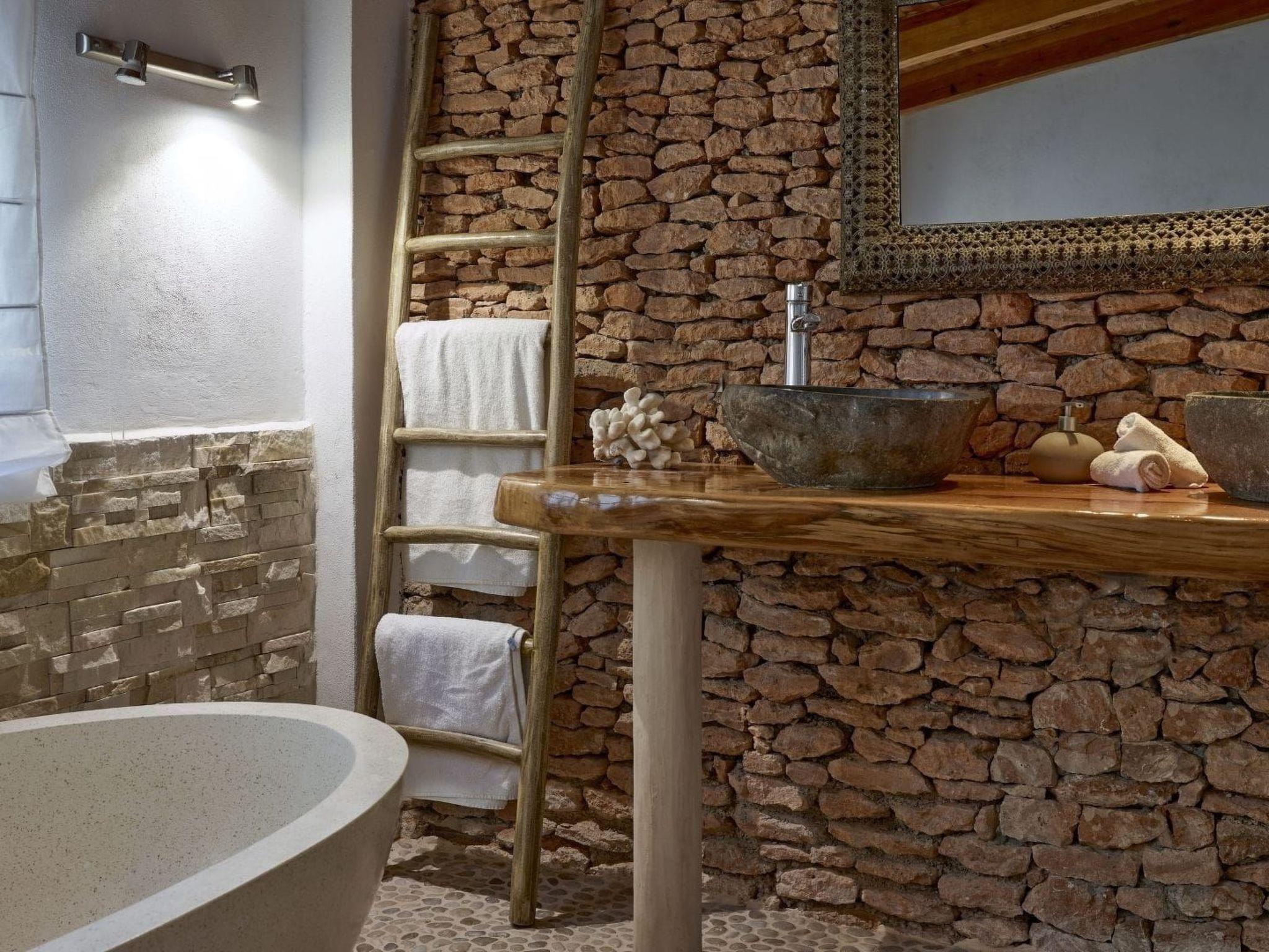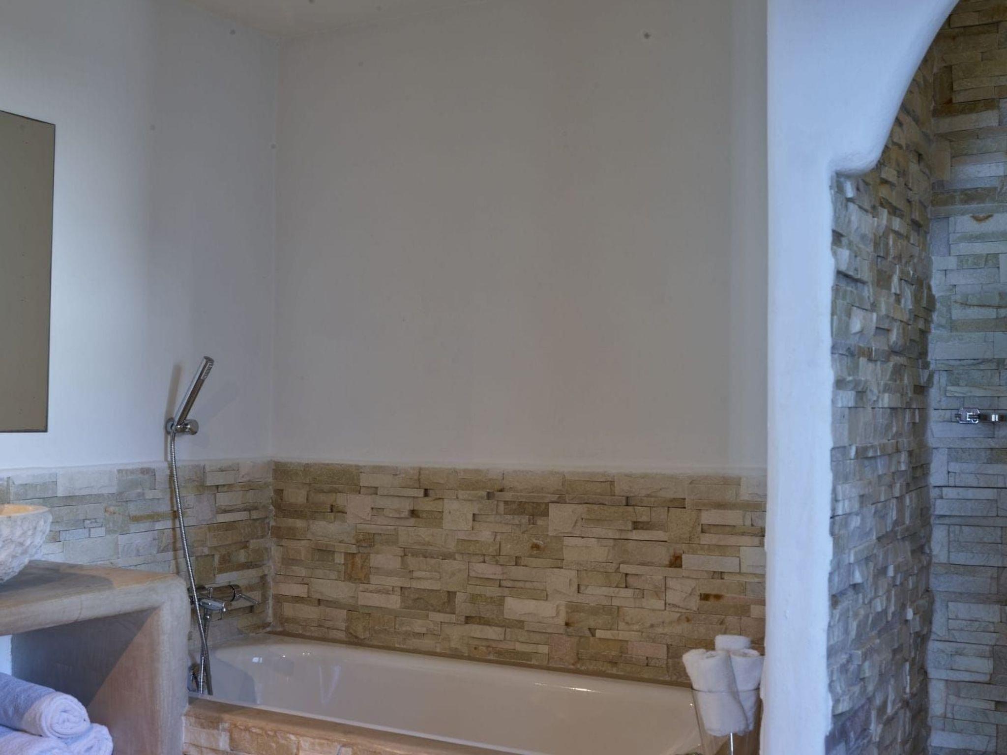 The outdoor area is a veritable dream: a pergola with exposed wooden beams houses a cosy outdoor dining area and a chill-out zone, while further on the swimming pool surrounded by sun beds and the landscape seems to be merged with the sea in the background. This alone would be enough to make it the perfect location for your holiday in the company of friends or family, to enjoy an aperitif at sunset with the sound of the sea in the background or a dinner in the lunar shade of the pergola. A daydream!