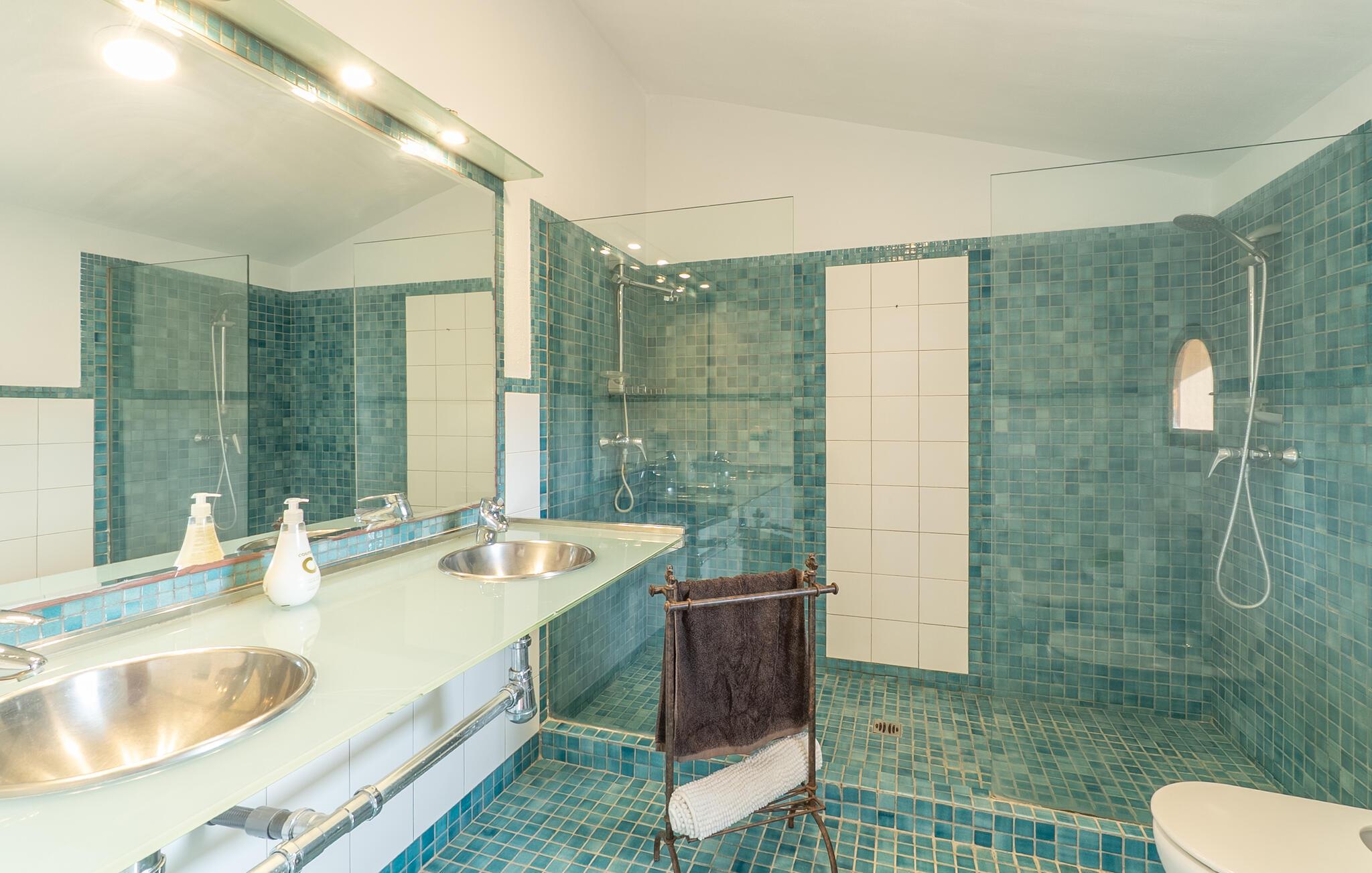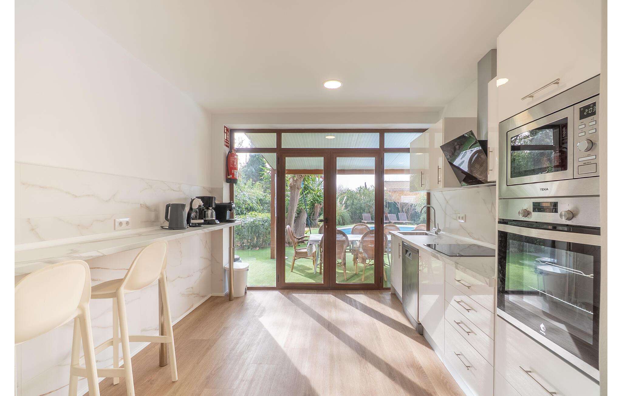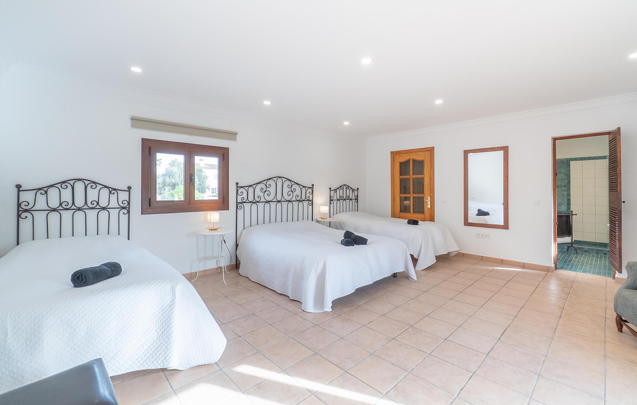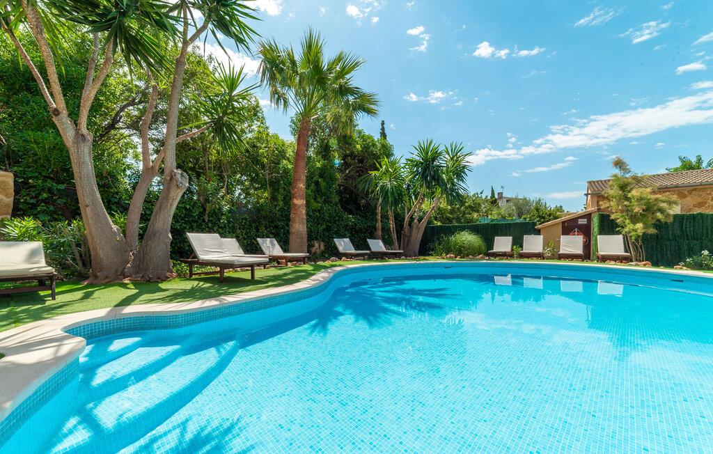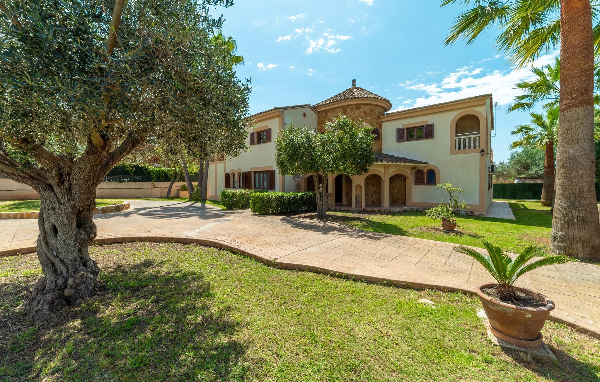 Det er kun en kort køretur fra lufthavnen og jeres drømmeferie i villaen "Es Castellet" kan begynde. At vælge denne ejendom i en urbanisering lige uden for Palma garanterer jer en fantastisk beliggenhed til at nyde både strandafslapning og byliv. I dens smukt anlagte have med palmer, duftende blomstrende planter og grønne privatlivsskærme kan I nyde det frodige grønne område - gode legepladser til jeres børn og talrige attraktive siddepladser. Fordyb jer i en god bog under den balinesiske pavillon i et hyggeligt hjørne af haven eller nyd et solbad på de komfortable liggestole, der venter jer omkring det organisk formede poolbassin. Begynd at drømme i verandagyngen, forfrisk jer selv med en kølig drink i chill-out loungen lavet af trendy rattan eller tilbered lækre lækkerier på den indbyggede grill og tag plads i et af spiseområderne for at nyde dem. Hvis I vil holde jer i form og aktiv, kan I spille bordtennis udendørs eller spille billard på snookertaget. Nyd jeres ferie udenfor ved poolen i skyggen af det smukke landskab i denne arkitektonisk sofistikerede tårnvilla med en elegance, der minder om et lille slot, eller gå indenfor og oplev over 360 m² boligareal. Når I træder ind i villaen, åbner den lyse stue sig op foran jer og inviterer jer til at tage plads på de store, lyse sofaer, gøre jer godt tilpas på sofaen til en afslappende nat og nyde det store fladskærms-tv. Tucco-dekorerede lofter og indirekte belysning skaber en meget afslappet atmosfære i hele stuen, som er sømløst forbundet med spisestuen gennem en halvmåneformet vægåbning. Det hvide køkken er adskilt fra stue og spisestue med en rund gang. Den byder på alt hvad I behøver: et komfur, en stor ovn, en opvaskemaskine, en kaffe- og espressomaskine, en mikrobølgeovn og meget mere. I stueetagen er der to af de fem soveværelser, som deler et af husets fire komfortable badeværelser. Derudover er stueplan udstyret med et lille gæstetoilet. Vindeltrappen i indgangsområdet fører jer til øverste etage i denne sofistikerede villa og til de tre ekstra soveværelser. Alle værelser har dobbeltseng og aircondition. Soveværelserne ovenpå har alle en-suite badeværelser af meget høj standard med moderne fliser og fine keramiske håndvaske. Hvert soveværelse ovenpå har en privat terrasse eller balkon. Det rummelige familieværelse tilbyder plads nok til, at alle medlemmer kan tilbringe tid sammen og lader intet tilbage at ønske. Forældre har plads nok med et stort badeværelse og et påklædningsværelse - de to ekstra enkeltsenge, der kan bruges til børn og er ikke inkluderet i antallet af personer i beskrivelsen og er ekstra. Derudover er der to babysenge til rådighed i dette hus, så alle kan få en god nats søvn. Villaen er beliggende i en urbanisering lige uden for Palma de Mallorca. Da byen kun ligger få kilometer væk, er den et must-see under jeres ophold her. Udforsk den smukke katedral eller gå en tur langs havnen og nyd lidt shopping. På grund af sin beliggenhed i en urbanisering kan der lejlighedsvis være trafikstøj, men selve villaen ligger på en blind vej uden gennemkørende trafik. Trods den private beliggenhed er der naboer i umiddelbar nærhed. Vi beder jer derfor om at være respektfuld, så alle kan nyde en afslappende ferie. Placeringen af denne villa giver jer mulighed for at tage på fantastiske ture i det omkringliggende område, til strandene og bjergene i Tramuntana, med besøg i de charmerende landsbyer Valldemossa eller Déià. Alle her på Fincallorca ønsker jer, jeres familie og jeres venner en vidunderlig og uforglemmelig ferie. Den indbydende villa "Es Castellet" er beliggende i en urbanisering kaldet Son Ametller, lige ved siden af hovedstaden Palma. Oase-lignende have med talrige afslapnings- og siddeområder og en organisk formet klorvandpool til ren afslapning. Shopping kan gøres i L'Hostalot eller direkte i Palma. Palma kan nås inden for 15 minutters kørsel. Sandstrandene på sydkysten, herunder Ciudad Jardin eller El Arenal, kan også nås hurtigt.