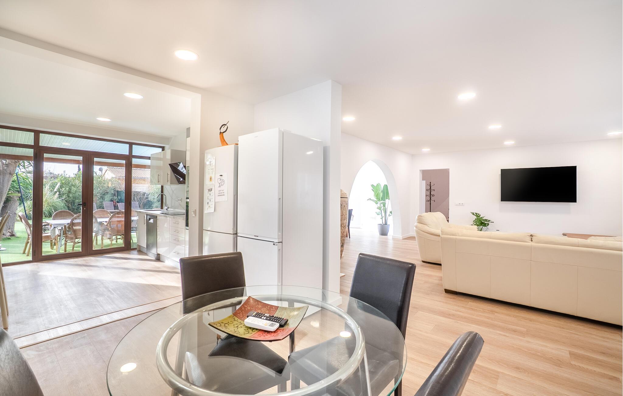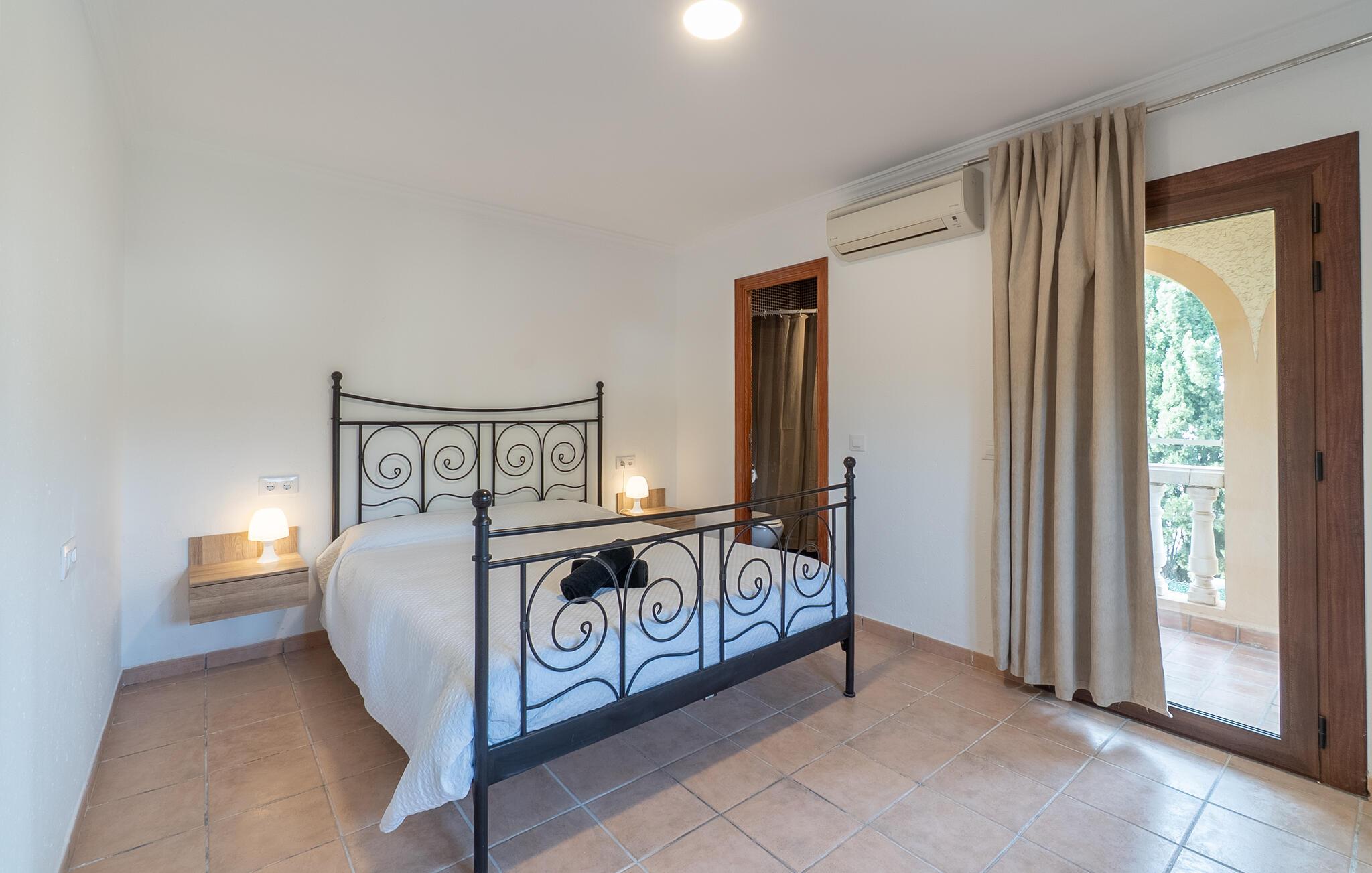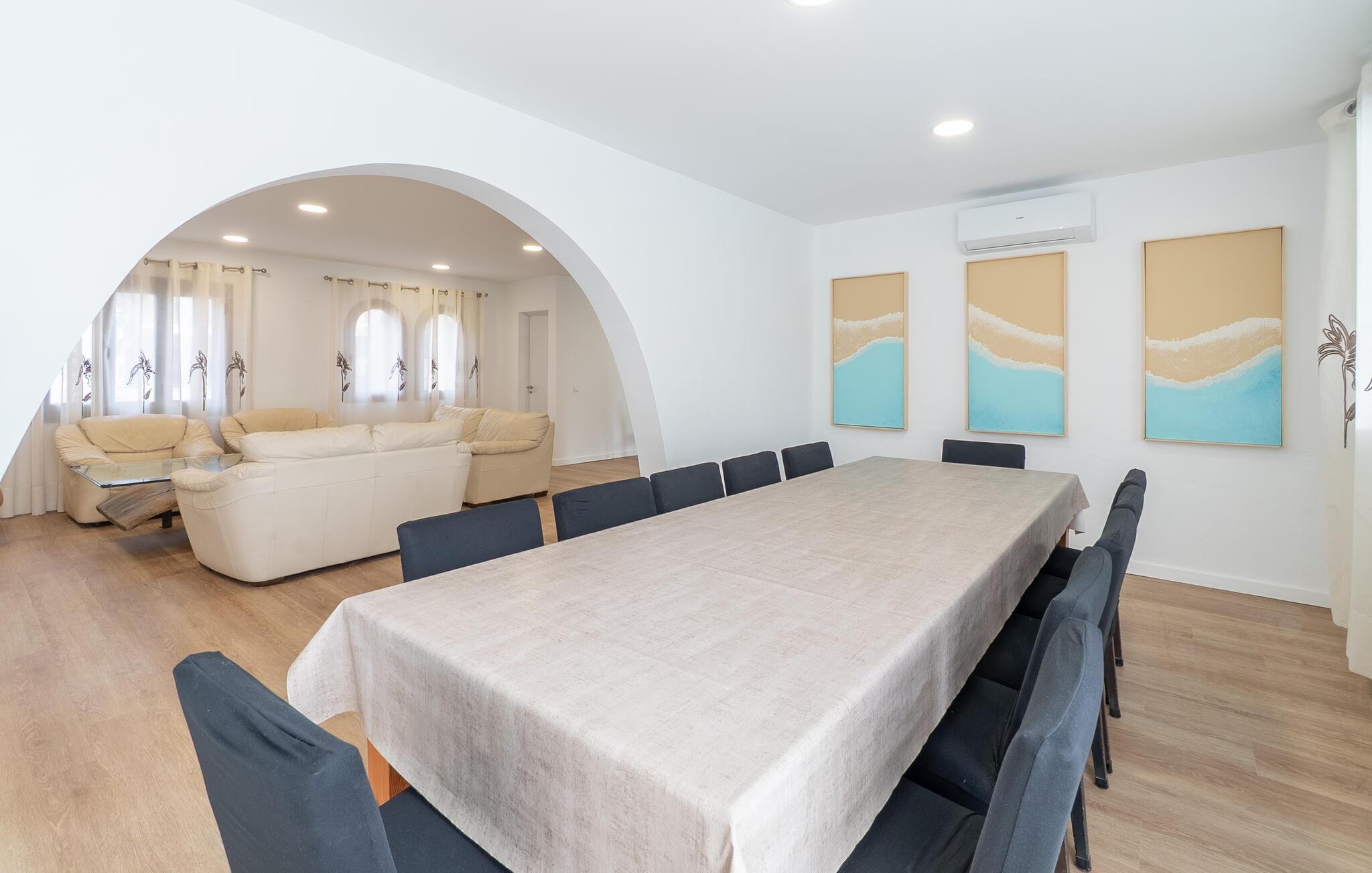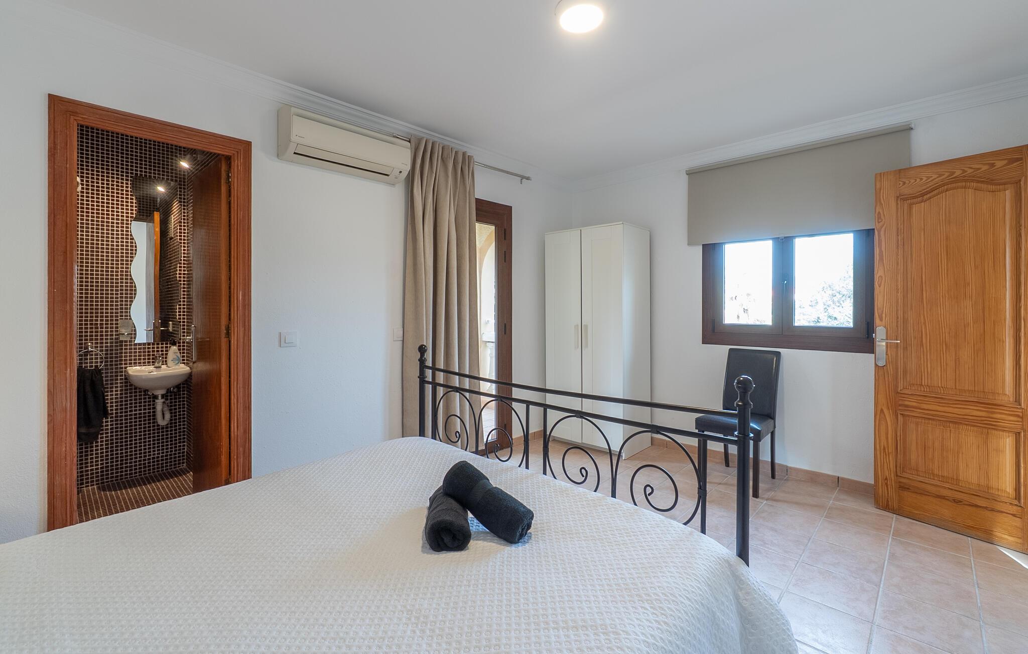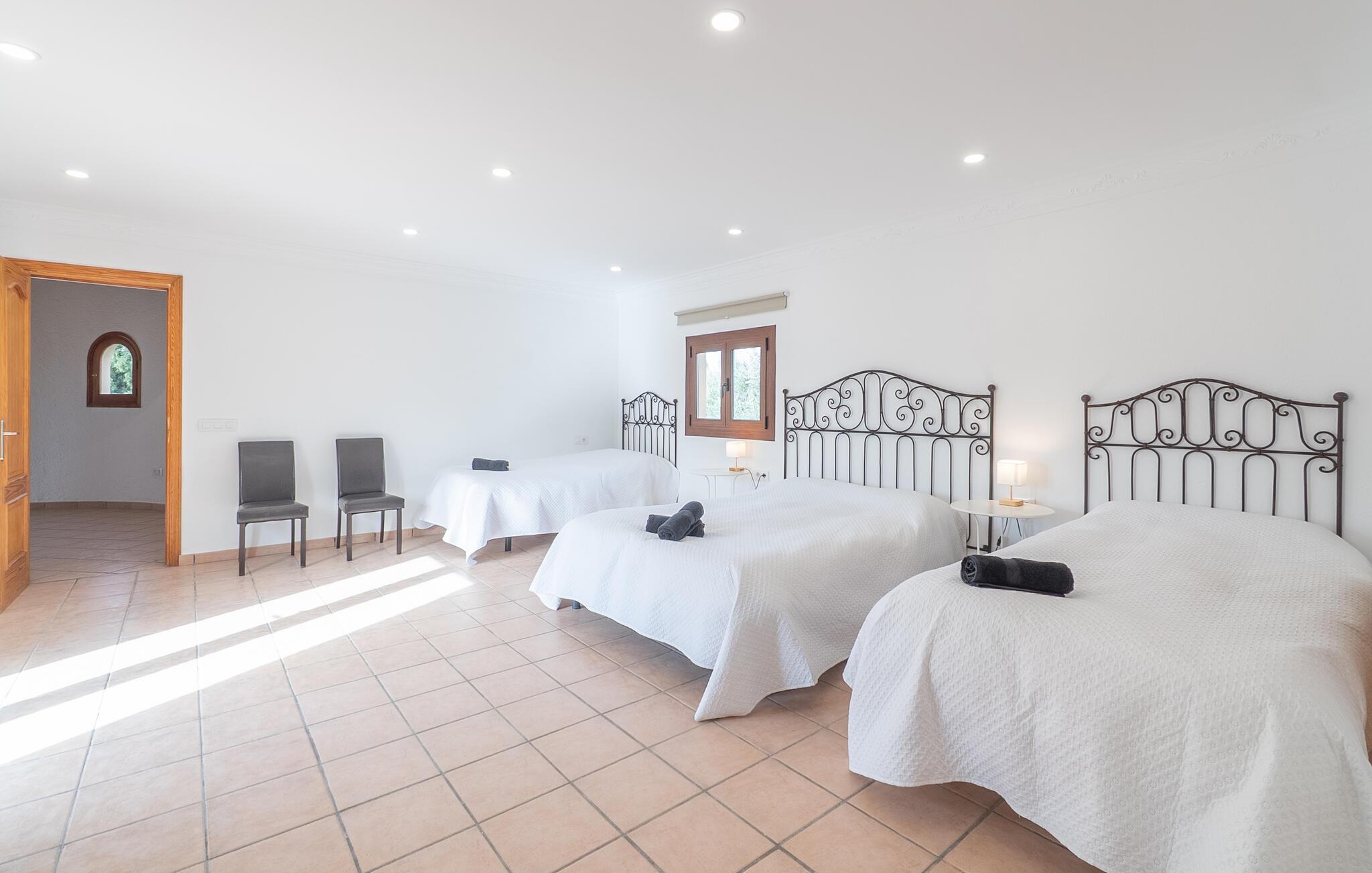 Det er kun en kort køretur fra lufthavnen og jeres drømmeferie i villaen "Es Castellet" kan begynde. At vælge denne ejendom i en urbanisering lige uden for Palma garanterer jer en fantastisk beliggenhed til at nyde både strandafslapning og byliv. I dens smukt anlagte have med palmer, duftende blomstrende planter og grønne privatlivsskærme kan I nyde det frodige grønne område - gode legepladser til jeres børn og talrige attraktive siddepladser. Fordyb jer i en god bog under den balinesiske pavillon i et hyggeligt hjørne af haven eller nyd et solbad på de komfortable liggestole, der venter jer omkring det organisk formede poolbassin. Begynd at drømme i verandagyngen, forfrisk jer selv med en kølig drink i chill-out loungen lavet af trendy rattan eller tilbered lækre lækkerier på den indbyggede grill og tag plads i et af spiseområderne for at nyde dem. Hvis I vil holde jer i form og aktiv, kan I spille bordtennis udendørs eller spille billard på snookertaget. Nyd jeres ferie udenfor ved poolen i skyggen af det smukke landskab i denne arkitektonisk sofistikerede tårnvilla med en elegance, der minder om et lille slot, eller gå indenfor og oplev over 360 m² boligareal. Når I træder ind i villaen, åbner den lyse stue sig op foran jer og inviterer jer til at tage plads på de store, lyse sofaer, gøre jer godt tilpas på sofaen til en afslappende nat og nyde det store fladskærms-tv. Tucco-dekorerede lofter og indirekte belysning skaber en meget afslappet atmosfære i hele stuen, som er sømløst forbundet med spisestuen gennem en halvmåneformet vægåbning. Det hvide køkken er adskilt fra stue og spisestue med en rund gang. Den byder på alt hvad I behøver: et komfur, en stor ovn, en opvaskemaskine, en kaffe- og espressomaskine, en mikrobølgeovn og meget mere. I stueetagen er der to af de fem soveværelser, som deler et af husets fire komfortable badeværelser. Derudover er stueplan udstyret med et lille gæstetoilet. Vindeltrappen i indgangsområdet fører jer til øverste etage i denne sofistikerede villa og til de tre ekstra soveværelser. Alle værelser har dobbeltseng og aircondition. Soveværelserne ovenpå har alle en-suite badeværelser af meget høj standard med moderne fliser og fine keramiske håndvaske. Hvert soveværelse ovenpå har en privat terrasse eller balkon. Det rummelige familieværelse tilbyder plads nok til, at alle medlemmer kan tilbringe tid sammen og lader intet tilbage at ønske. Forældre har plads nok med et stort badeværelse og et påklædningsværelse - de to ekstra enkeltsenge, der kan bruges til børn og er ikke inkluderet i antallet af personer i beskrivelsen og er ekstra. Derudover er der to babysenge til rådighed i dette hus, så alle kan få en god nats søvn. Villaen er beliggende i en urbanisering lige uden for Palma de Mallorca. Da byen kun ligger få kilometer væk, er den et must-see under jeres ophold her. Udforsk den smukke katedral eller gå en tur langs havnen og nyd lidt shopping. På grund af sin beliggenhed i en urbanisering kan der lejlighedsvis være trafikstøj, men selve villaen ligger på en blind vej uden gennemkørende trafik. Trods den private beliggenhed er der naboer i umiddelbar nærhed. Vi beder jer derfor om at være respektfuld, så alle kan nyde en afslappende ferie. Placeringen af denne villa giver jer mulighed for at tage på fantastiske ture i det omkringliggende område, til strandene og bjergene i Tramuntana, med besøg i de charmerende landsbyer Valldemossa eller Déià. Alle her på Fincallorca ønsker jer, jeres familie og jeres venner en vidunderlig og uforglemmelig ferie. Den indbydende villa "Es Castellet" er beliggende i en urbanisering kaldet Son Ametller, lige ved siden af hovedstaden Palma. Oase-lignende have med talrige afslapnings- og siddeområder og en organisk formet klorvandpool til ren afslapning. Shopping kan gøres i L'Hostalot eller direkte i Palma. Palma kan nås inden for 15 minutters kørsel. Sandstrandene på sydkysten, herunder Ciudad Jardin eller El Arenal, kan også nås hurtigt.