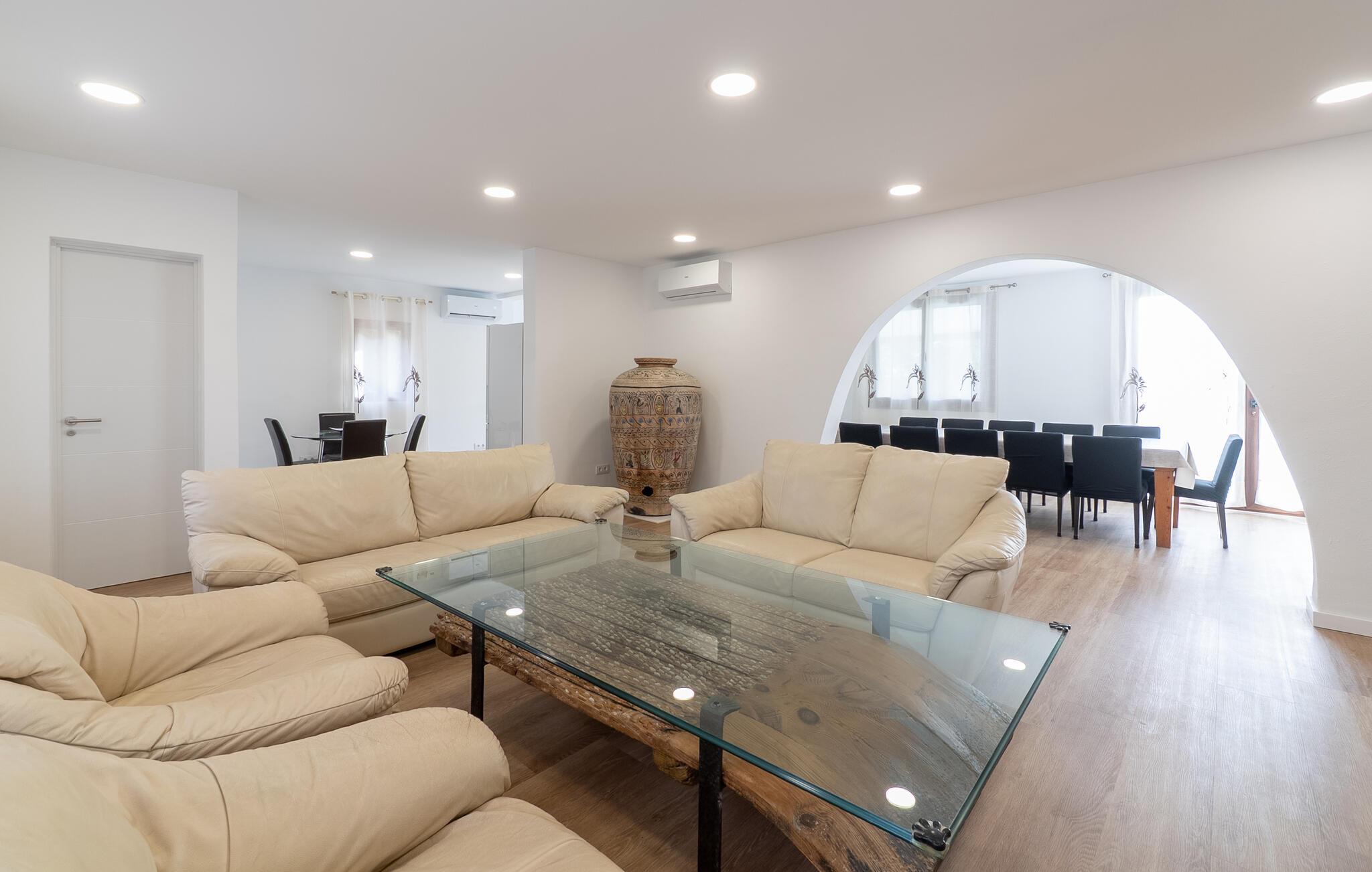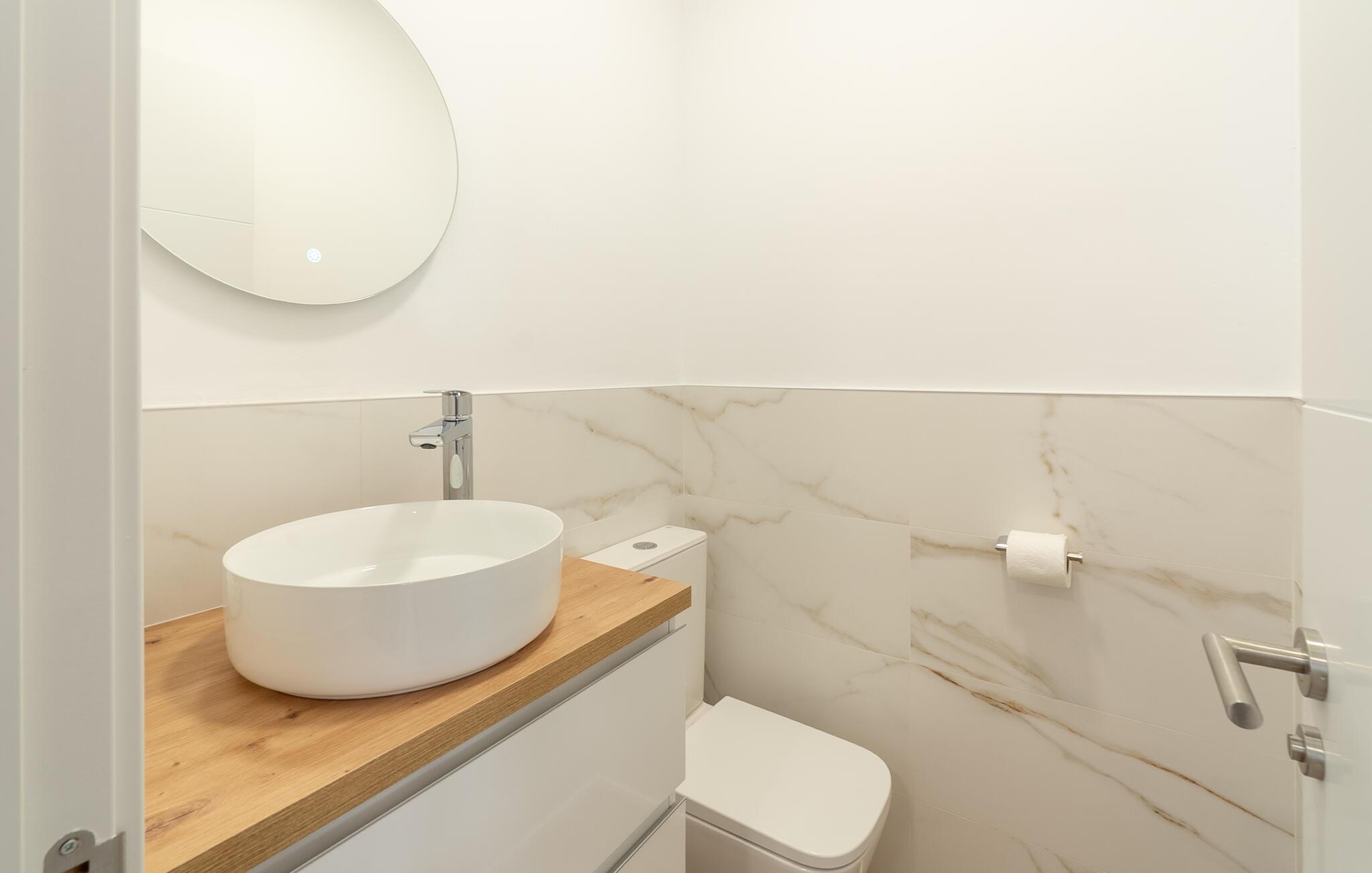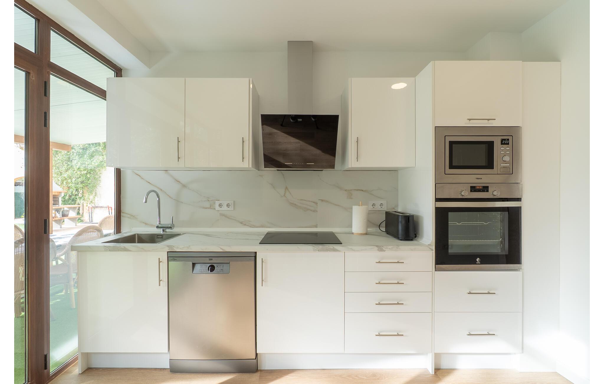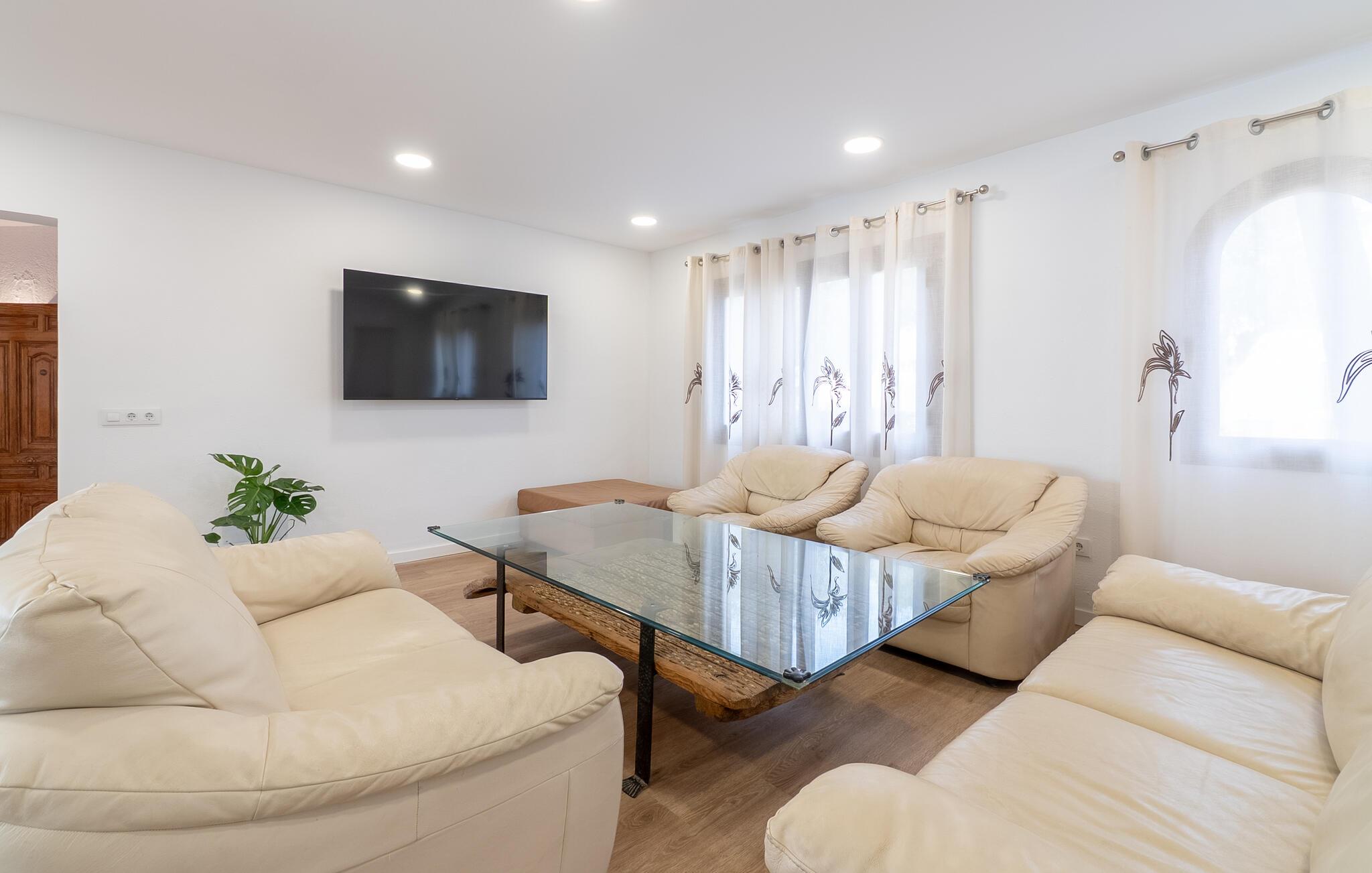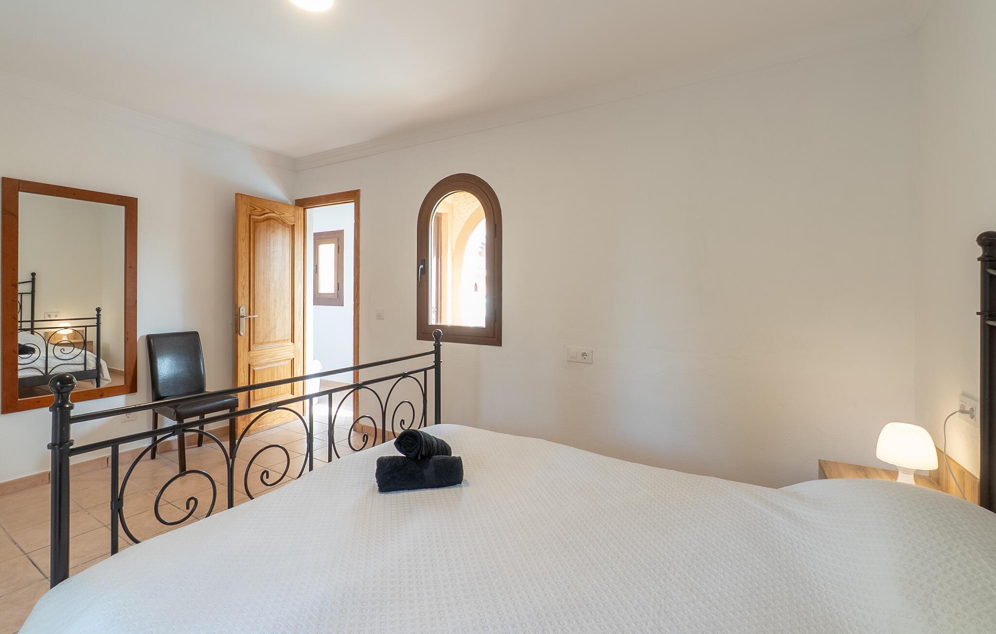 Det er kun en kort køretur fra lufthavnen og jeres drømmeferie i villaen "Es Castellet" kan begynde. At vælge denne ejendom i en urbanisering lige uden for Palma garanterer jer en fantastisk beliggenhed til at nyde både strandafslapning og byliv. I dens smukt anlagte have med palmer, duftende blomstrende planter og grønne privatlivsskærme kan I nyde det frodige grønne område - gode legepladser til jeres børn og talrige attraktive siddepladser. Fordyb jer i en god bog under den balinesiske pavillon i et hyggeligt hjørne af haven eller nyd et solbad på de komfortable liggestole, der venter jer omkring det organisk formede poolbassin. Begynd at drømme i verandagyngen, forfrisk jer selv med en kølig drink i chill-out loungen lavet af trendy rattan eller tilbered lækre lækkerier på den indbyggede grill og tag plads i et af spiseområderne for at nyde dem. Hvis I vil holde jer i form og aktiv, kan I spille bordtennis udendørs eller spille billard på snookertaget. Nyd jeres ferie udenfor ved poolen i skyggen af det smukke landskab i denne arkitektonisk sofistikerede tårnvilla med en elegance, der minder om et lille slot, eller gå indenfor og oplev over 360 m² boligareal. Når I træder ind i villaen, åbner den lyse stue sig op foran jer og inviterer jer til at tage plads på de store, lyse sofaer, gøre jer godt tilpas på sofaen til en afslappende nat og nyde det store fladskærms-tv. Tucco-dekorerede lofter og indirekte belysning skaber en meget afslappet atmosfære i hele stuen, som er sømløst forbundet med spisestuen gennem en halvmåneformet vægåbning. Det hvide køkken er adskilt fra stue og spisestue med en rund gang. Den byder på alt hvad I behøver: et komfur, en stor ovn, en opvaskemaskine, en kaffe- og espressomaskine, en mikrobølgeovn og meget mere. I stueetagen er der to af de fem soveværelser, som deler et af husets fire komfortable badeværelser. Derudover er stueplan udstyret med et lille gæstetoilet. Vindeltrappen i indgangsområdet fører jer til øverste etage i denne sofistikerede villa og til de tre ekstra soveværelser. Alle værelser har dobbeltseng og aircondition. Soveværelserne ovenpå har alle en-suite badeværelser af meget høj standard med moderne fliser og fine keramiske håndvaske. Hvert soveværelse ovenpå har en privat terrasse eller balkon. Det rummelige familieværelse tilbyder plads nok til, at alle medlemmer kan tilbringe tid sammen og lader intet tilbage at ønske. Forældre har plads nok med et stort badeværelse og et påklædningsværelse - de to ekstra enkeltsenge, der kan bruges til børn og er ikke inkluderet i antallet af personer i beskrivelsen og er ekstra. Derudover er der to babysenge til rådighed i dette hus, så alle kan få en god nats søvn. Villaen er beliggende i en urbanisering lige uden for Palma de Mallorca. Da byen kun ligger få kilometer væk, er den et must-see under jeres ophold her. Udforsk den smukke katedral eller gå en tur langs havnen og nyd lidt shopping. På grund af sin beliggenhed i en urbanisering kan der lejlighedsvis være trafikstøj, men selve villaen ligger på en blind vej uden gennemkørende trafik. Trods den private beliggenhed er der naboer i umiddelbar nærhed. Vi beder jer derfor om at være respektfuld, så alle kan nyde en afslappende ferie. Placeringen af denne villa giver jer mulighed for at tage på fantastiske ture i det omkringliggende område, til strandene og bjergene i Tramuntana, med besøg i de charmerende landsbyer Valldemossa eller Déià. Alle her på Fincallorca ønsker jer, jeres familie og jeres venner en vidunderlig og uforglemmelig ferie. Den indbydende villa "Es Castellet" er beliggende i en urbanisering kaldet Son Ametller, lige ved siden af hovedstaden Palma. Oase-lignende have med talrige afslapnings- og siddeområder og en organisk formet klorvandpool til ren afslapning. Shopping kan gøres i L'Hostalot eller direkte i Palma. Palma kan nås inden for 15 minutters kørsel. Sandstrandene på sydkysten, herunder Ciudad Jardin eller El Arenal, kan også nås hurtigt.